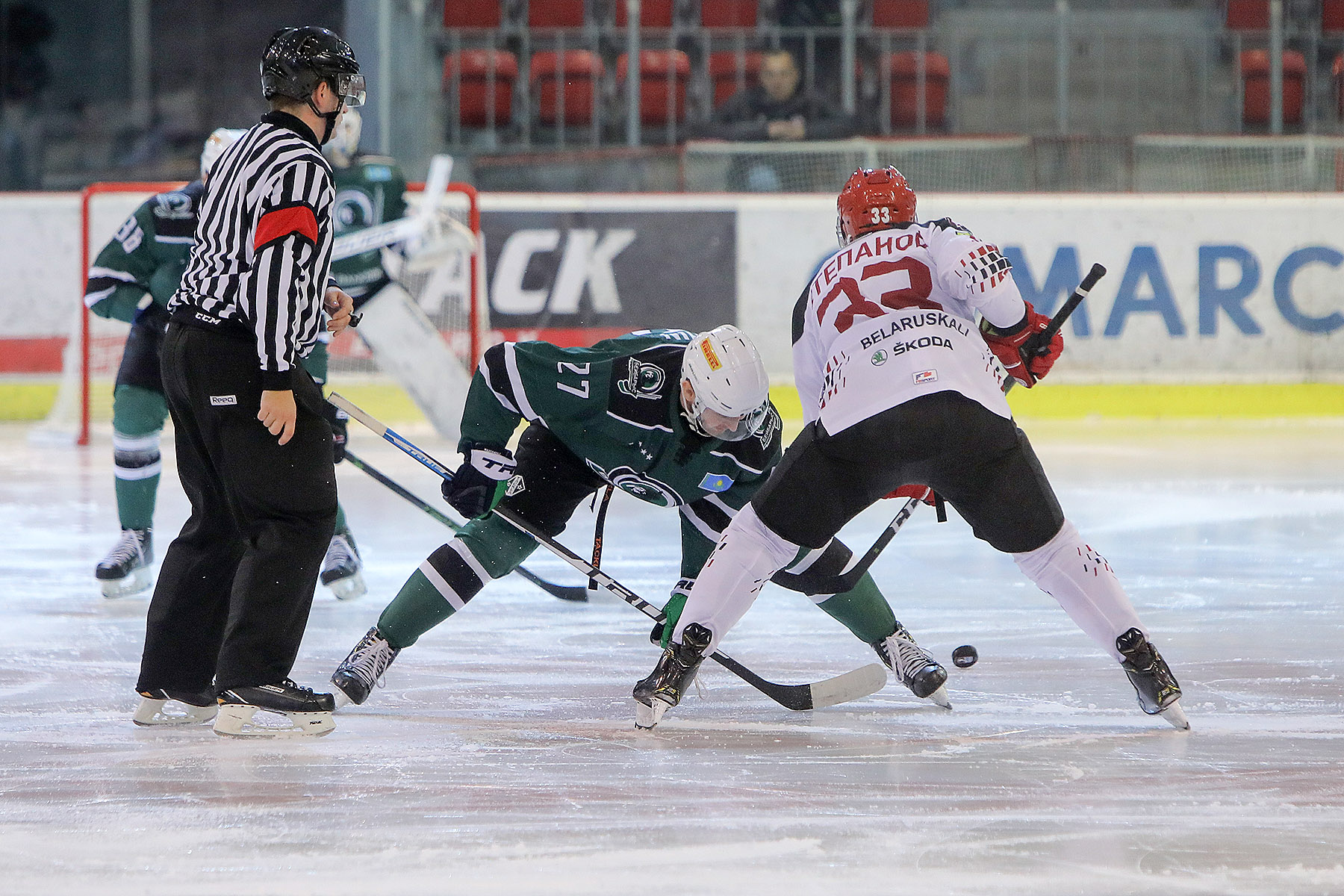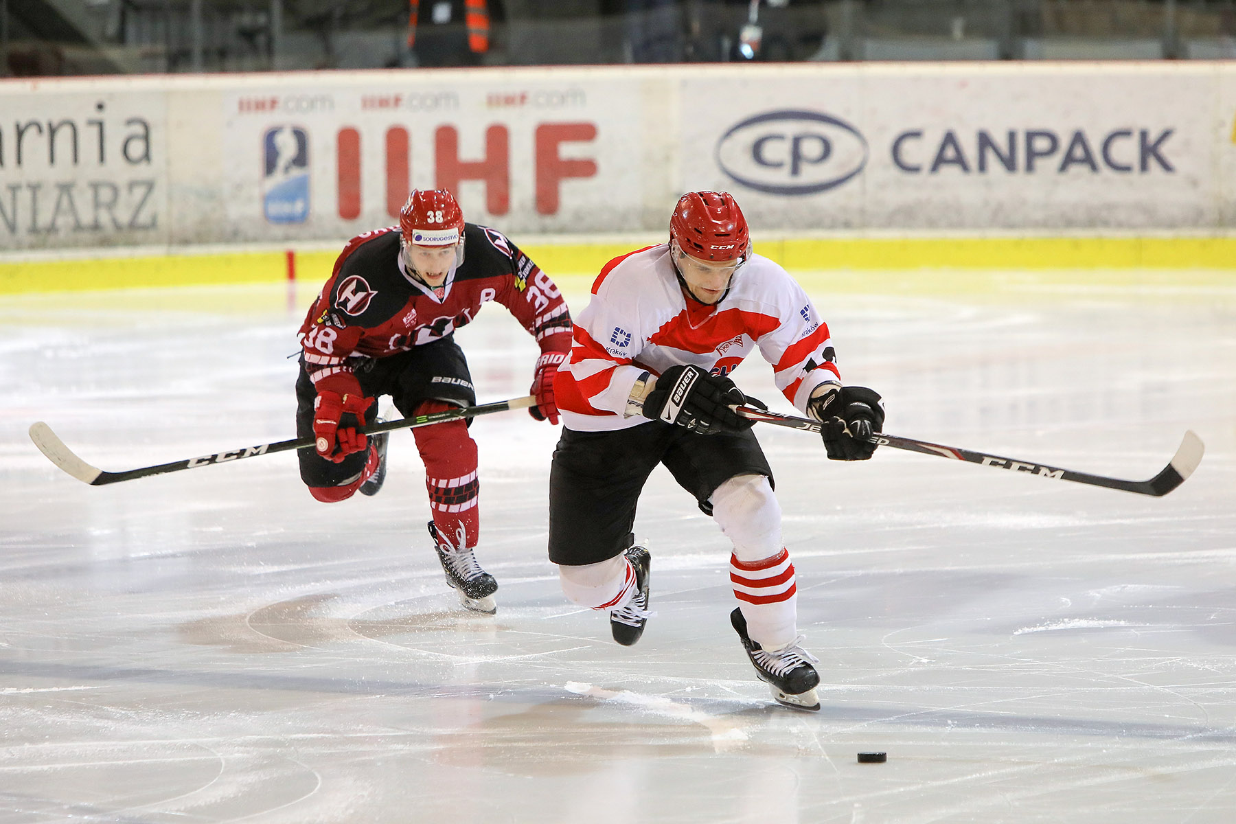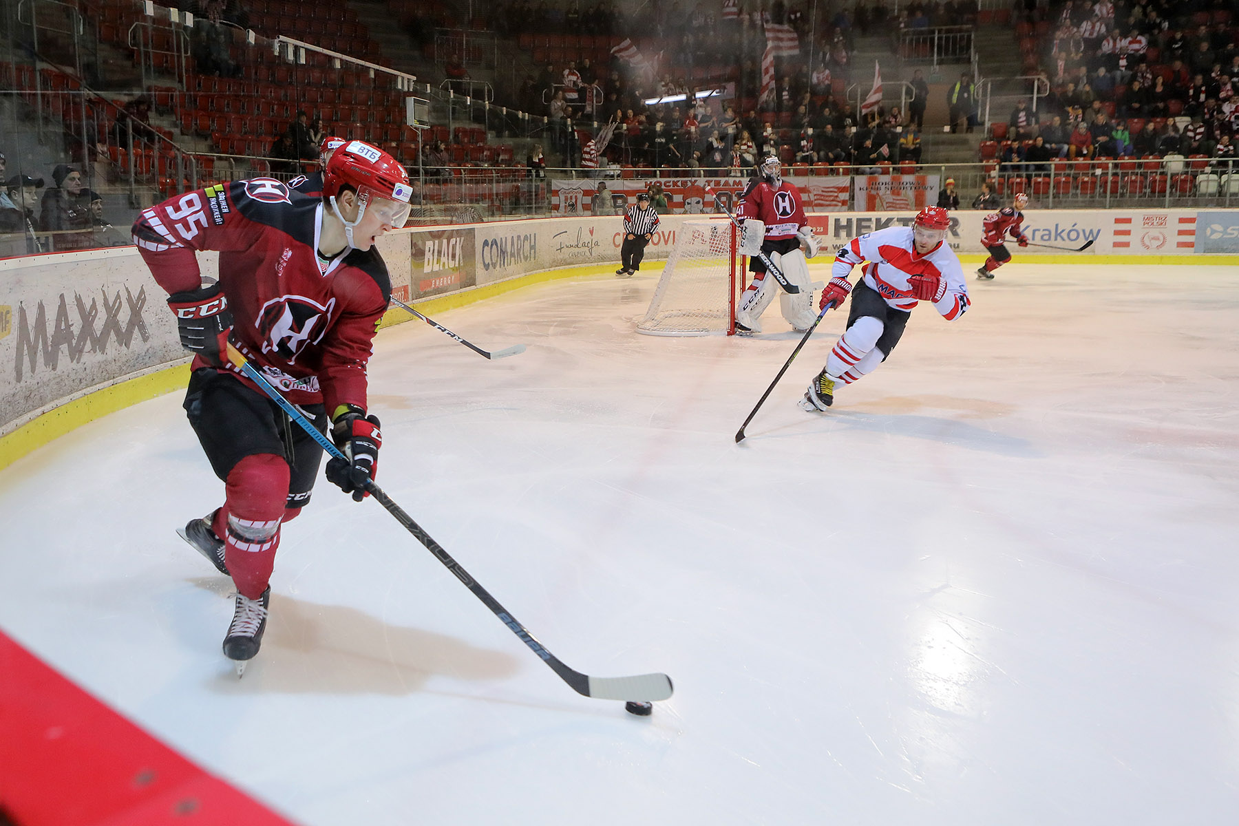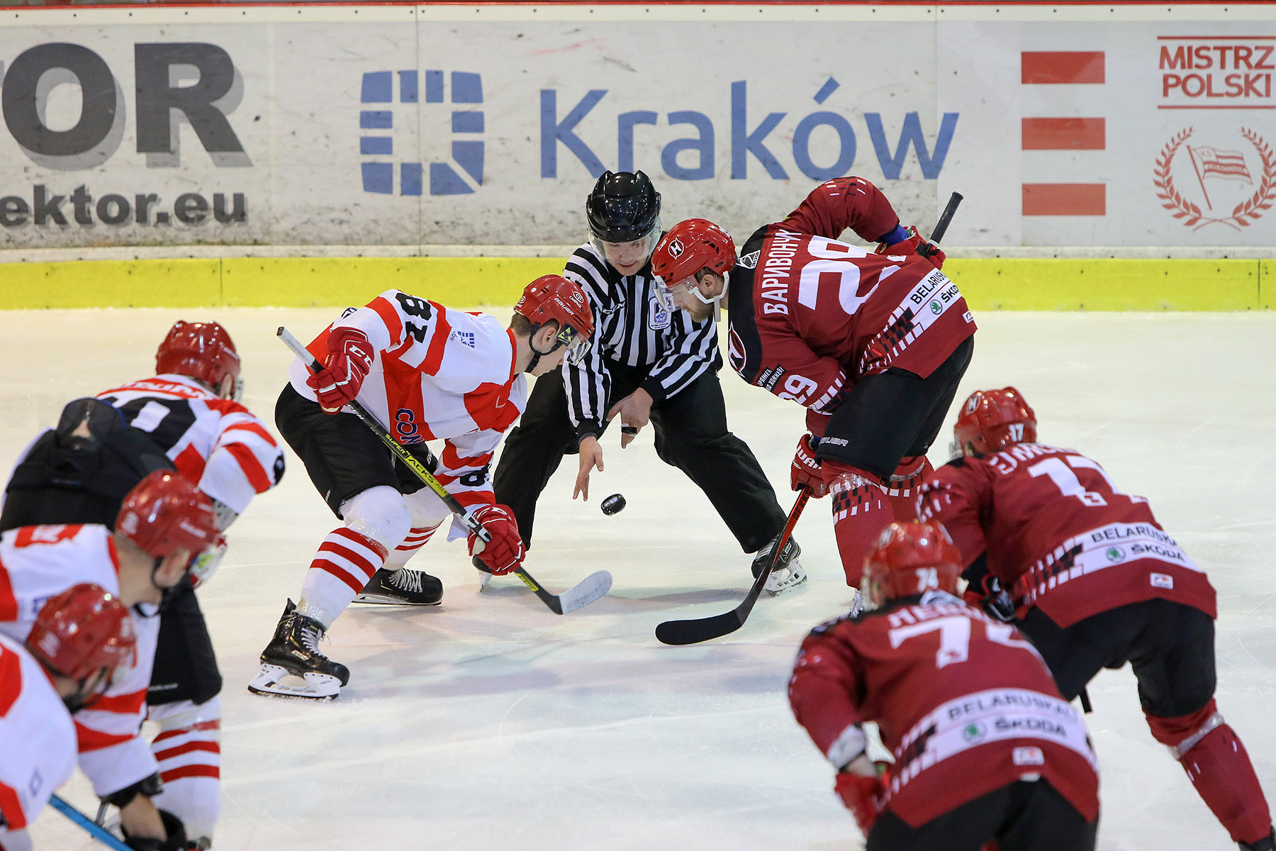 Neman Grodno forward Yegor Stepanov is one step faster than Cracovia Krakow’s Kasper Bryniczka but both teams qualified for the final round for the 2020 IIHF Continental Cup.