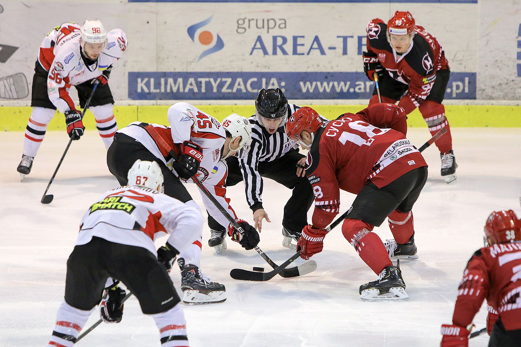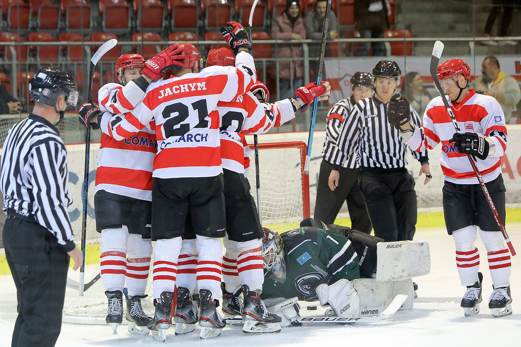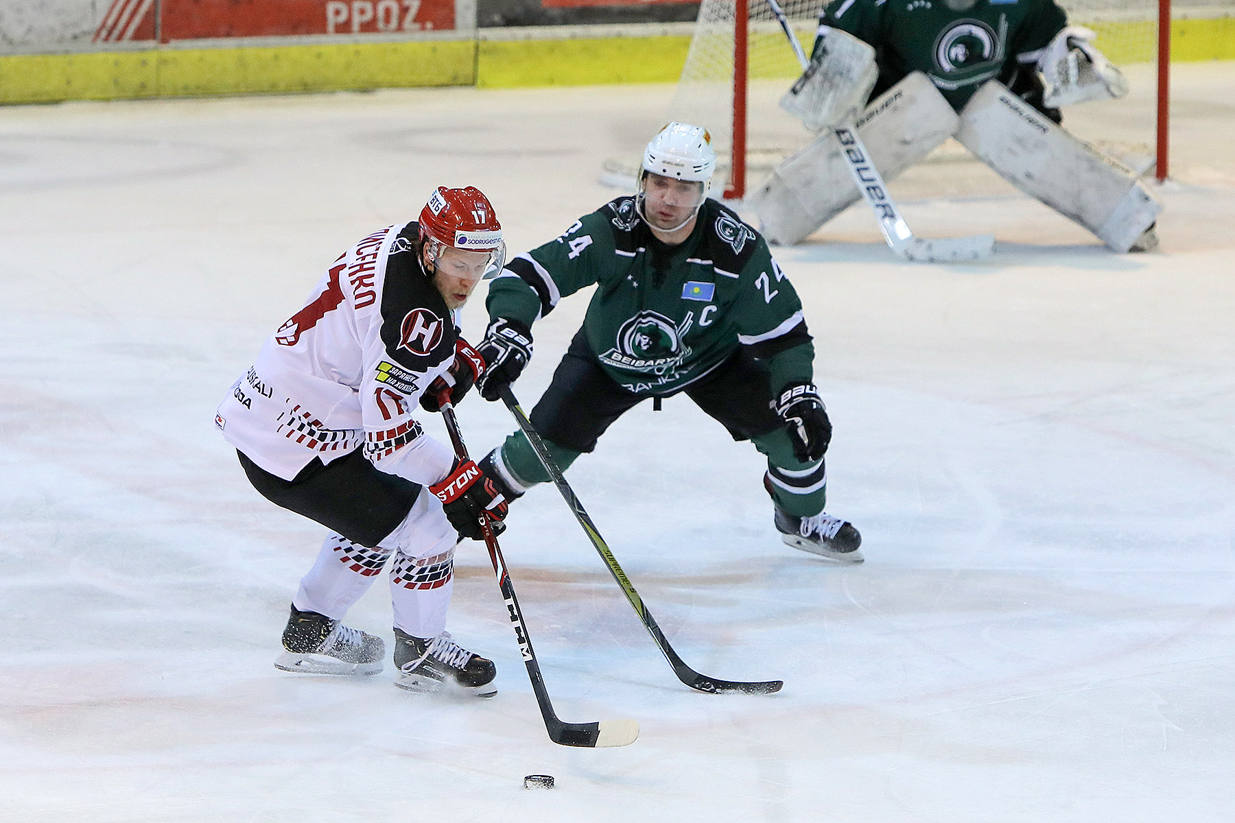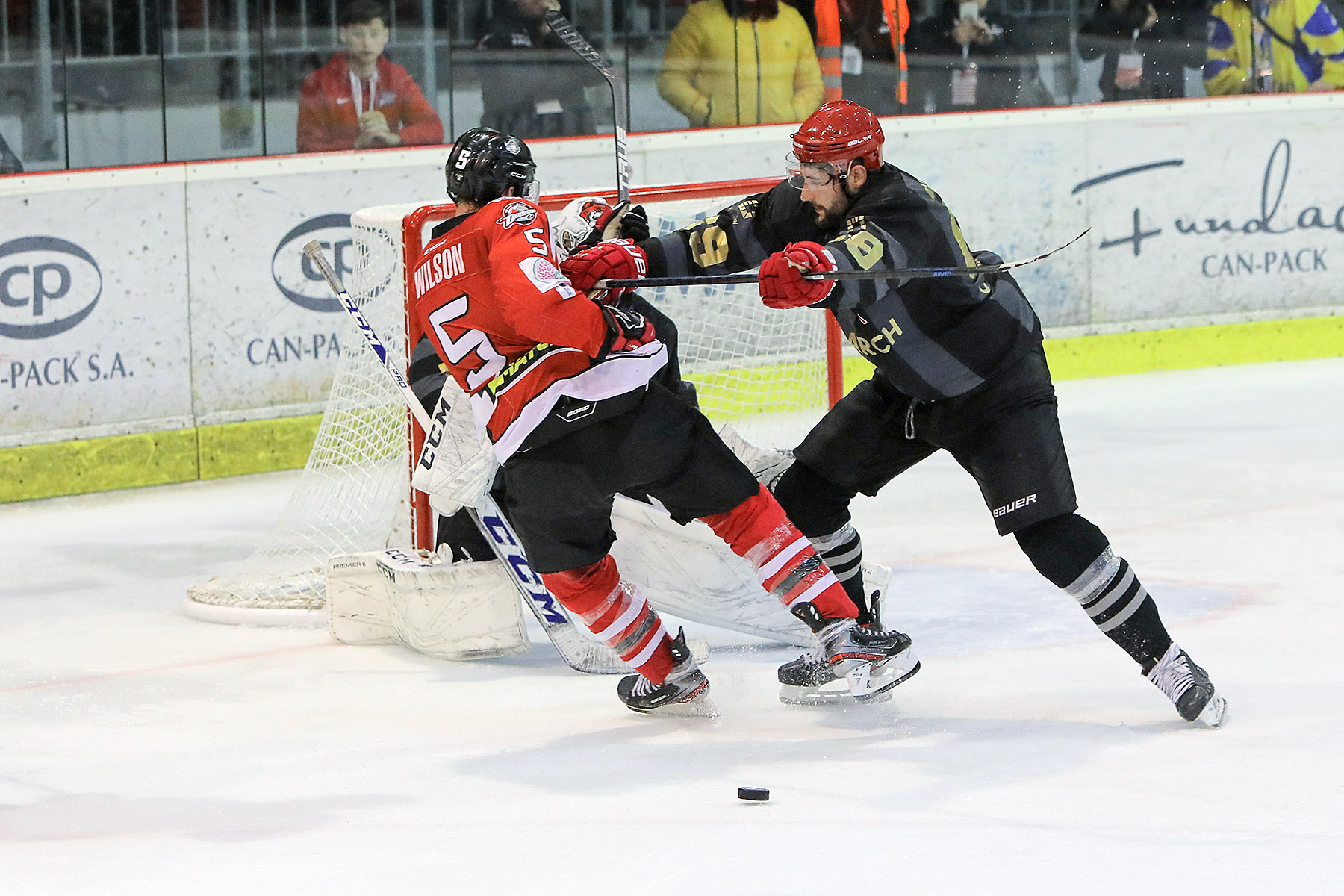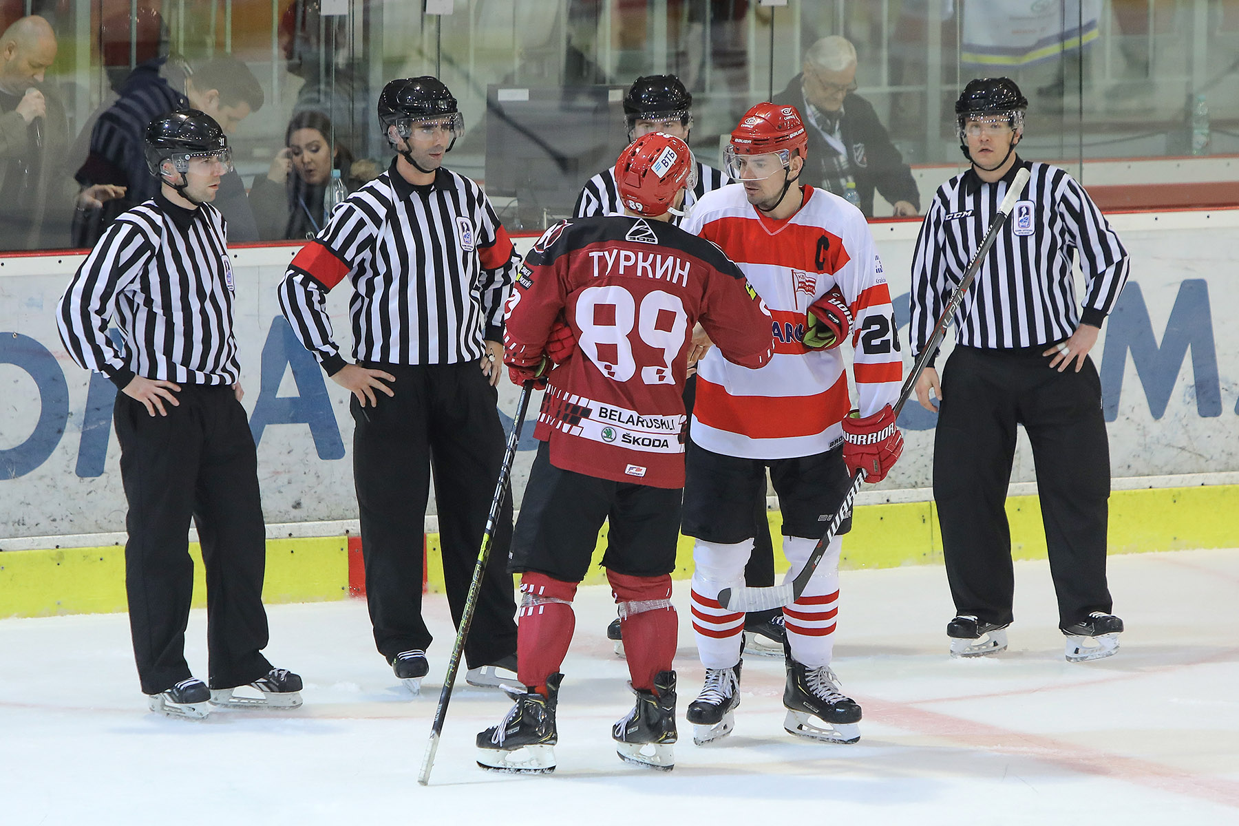 Neman Grodno forward Yegor Stepanov is one step faster than Cracovia Krakow’s Kasper Bryniczka but both teams qualified for the final round for the 2020 IIHF Continental Cup.