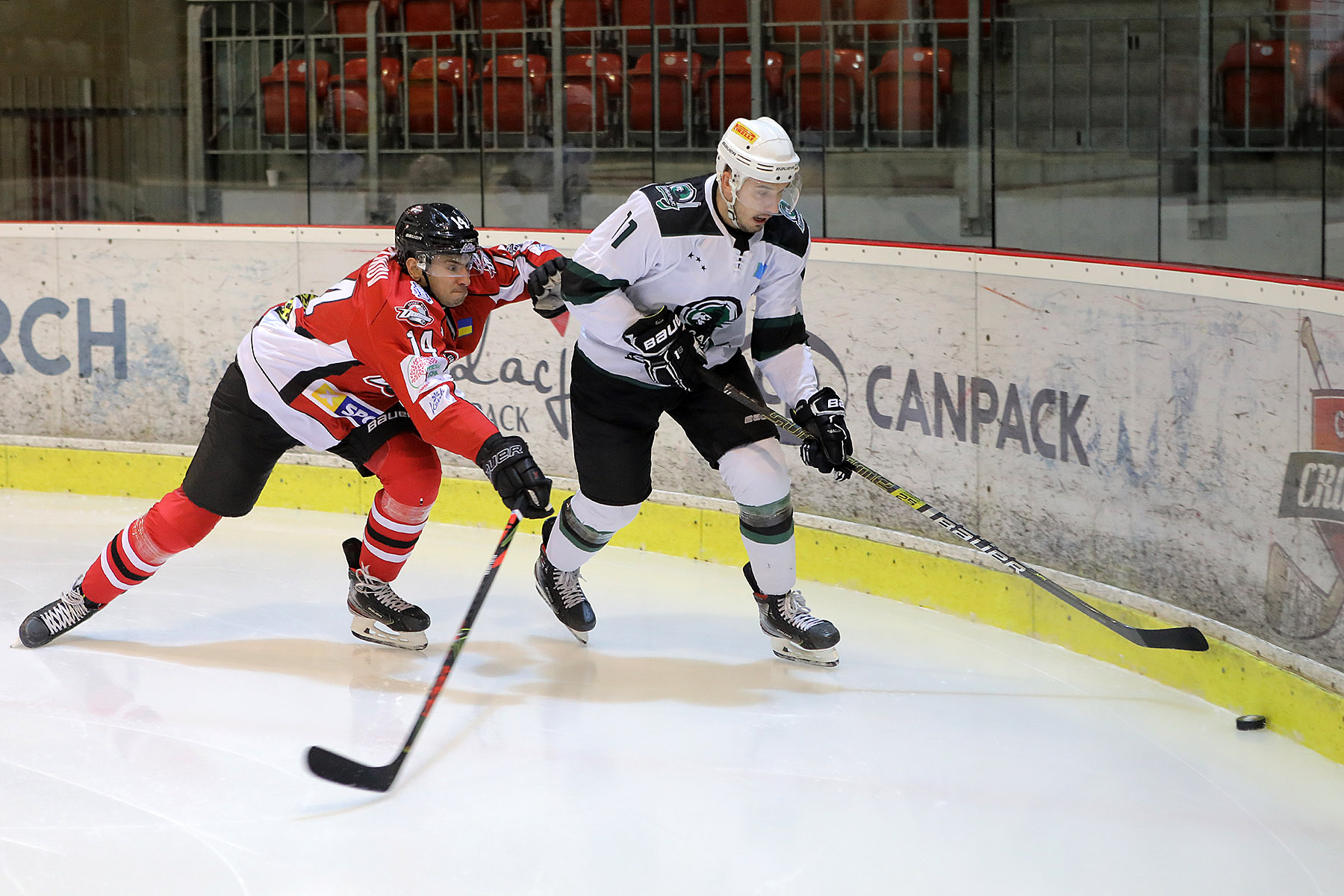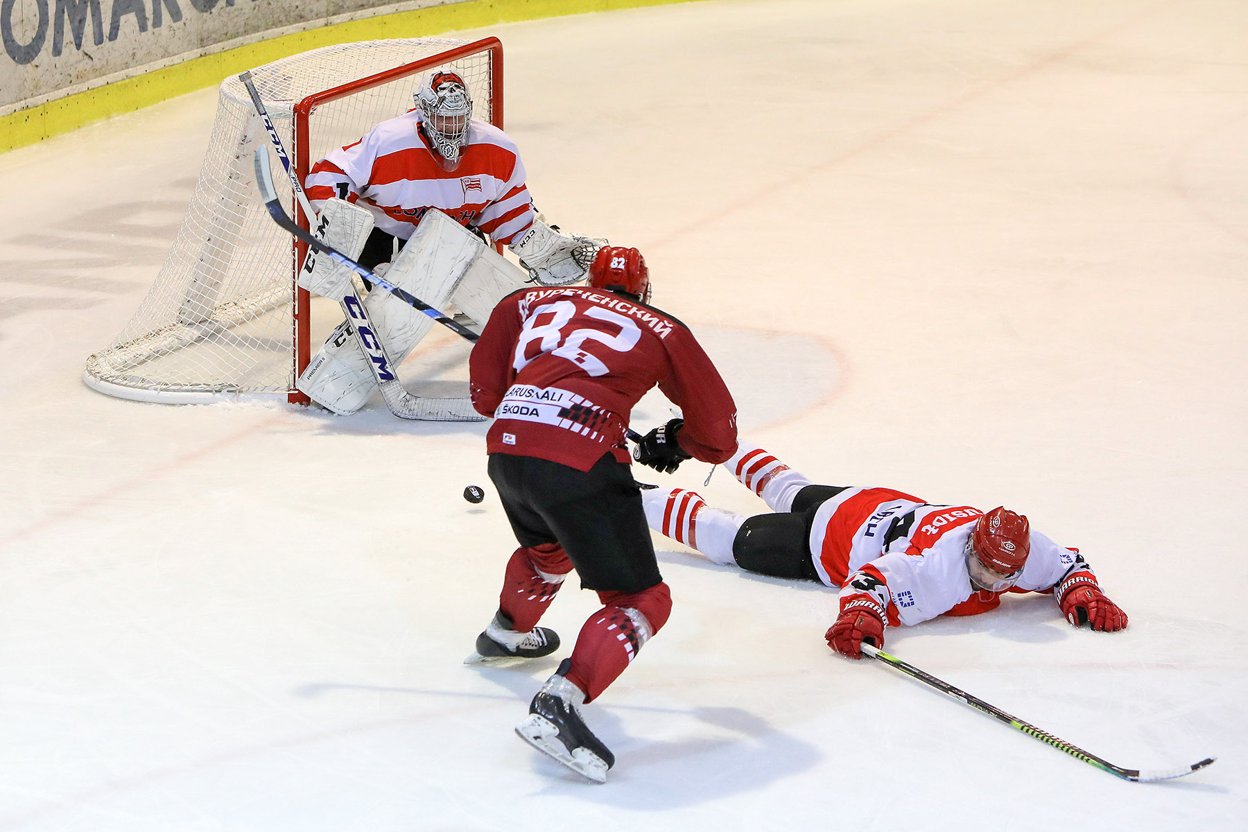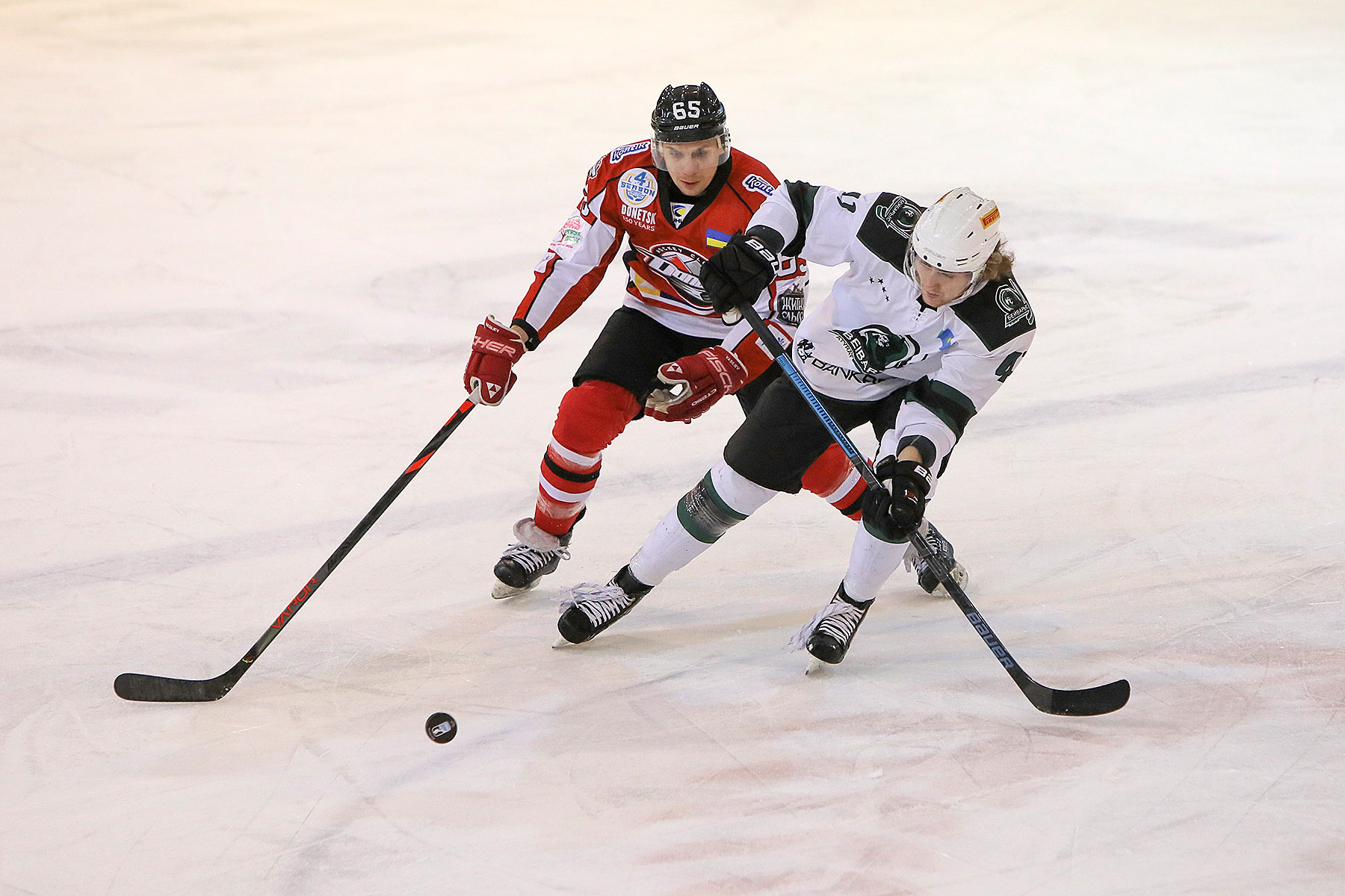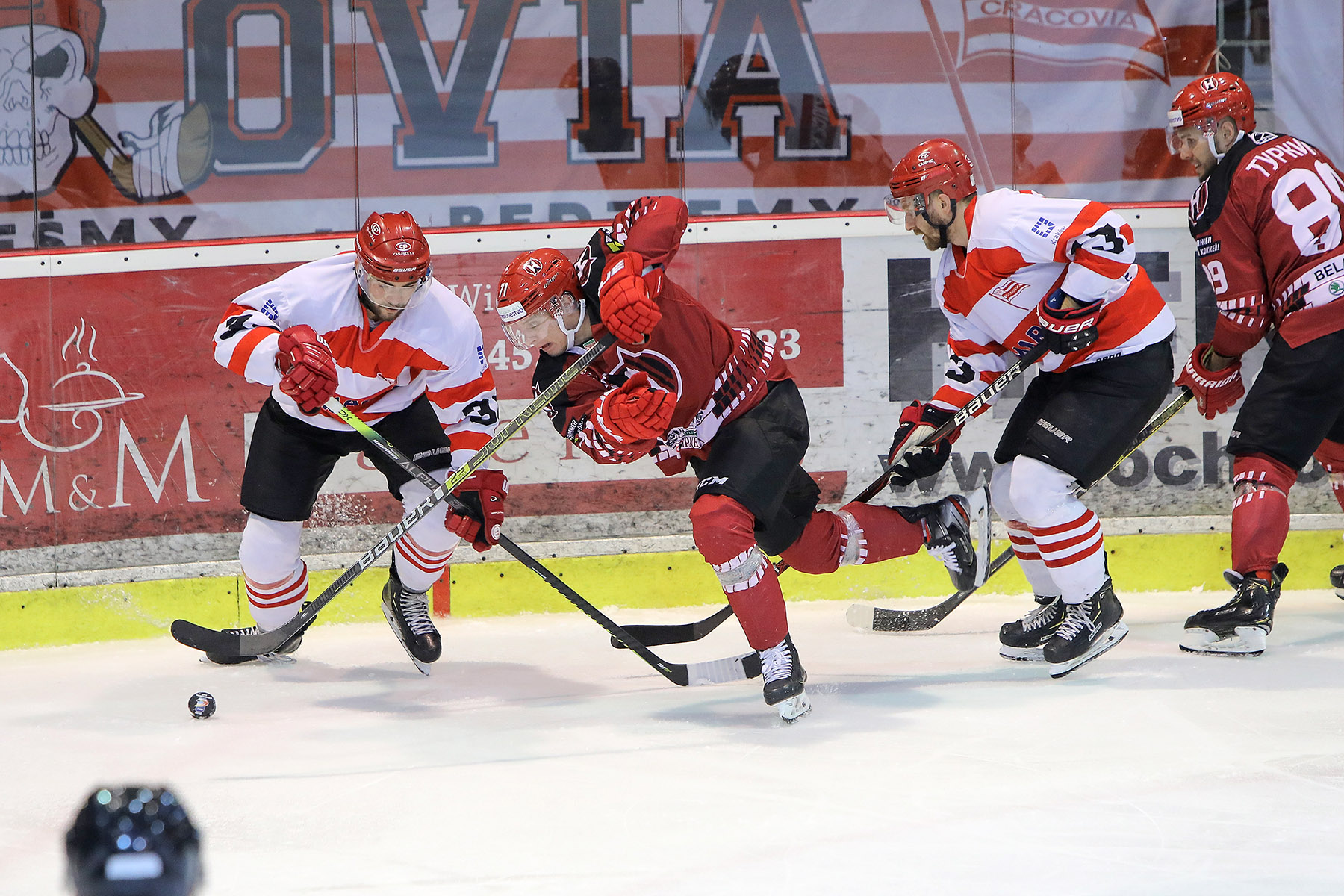 Neman Grodno forward Yegor Stepanov is one step faster than Cracovia Krakow’s Kasper Bryniczka but both teams qualified for the final round for the 2020 IIHF Continental Cup.