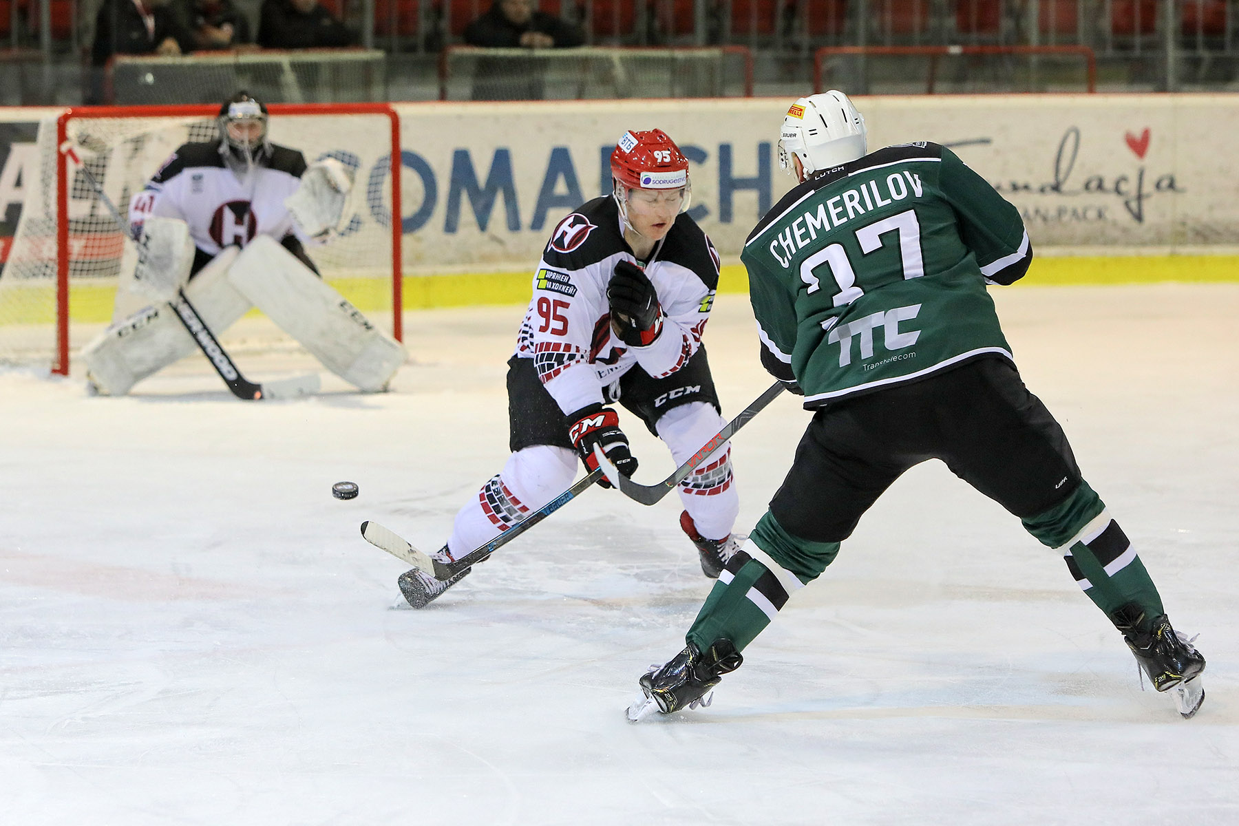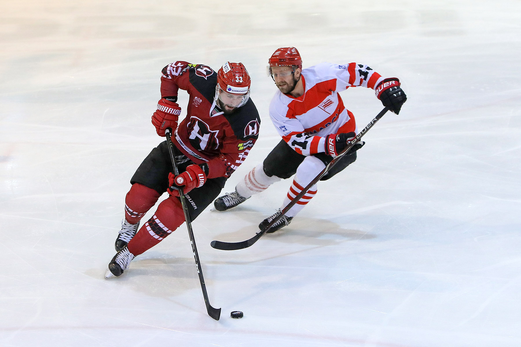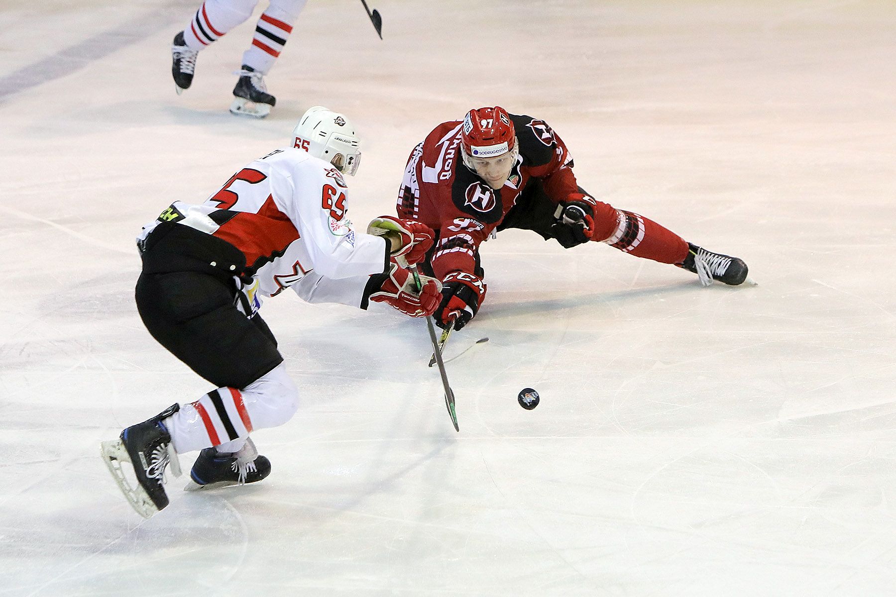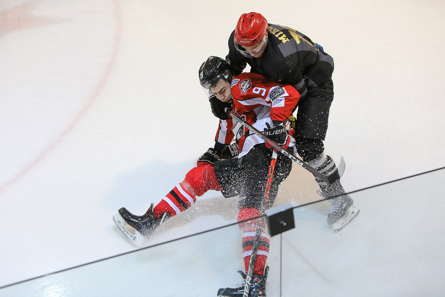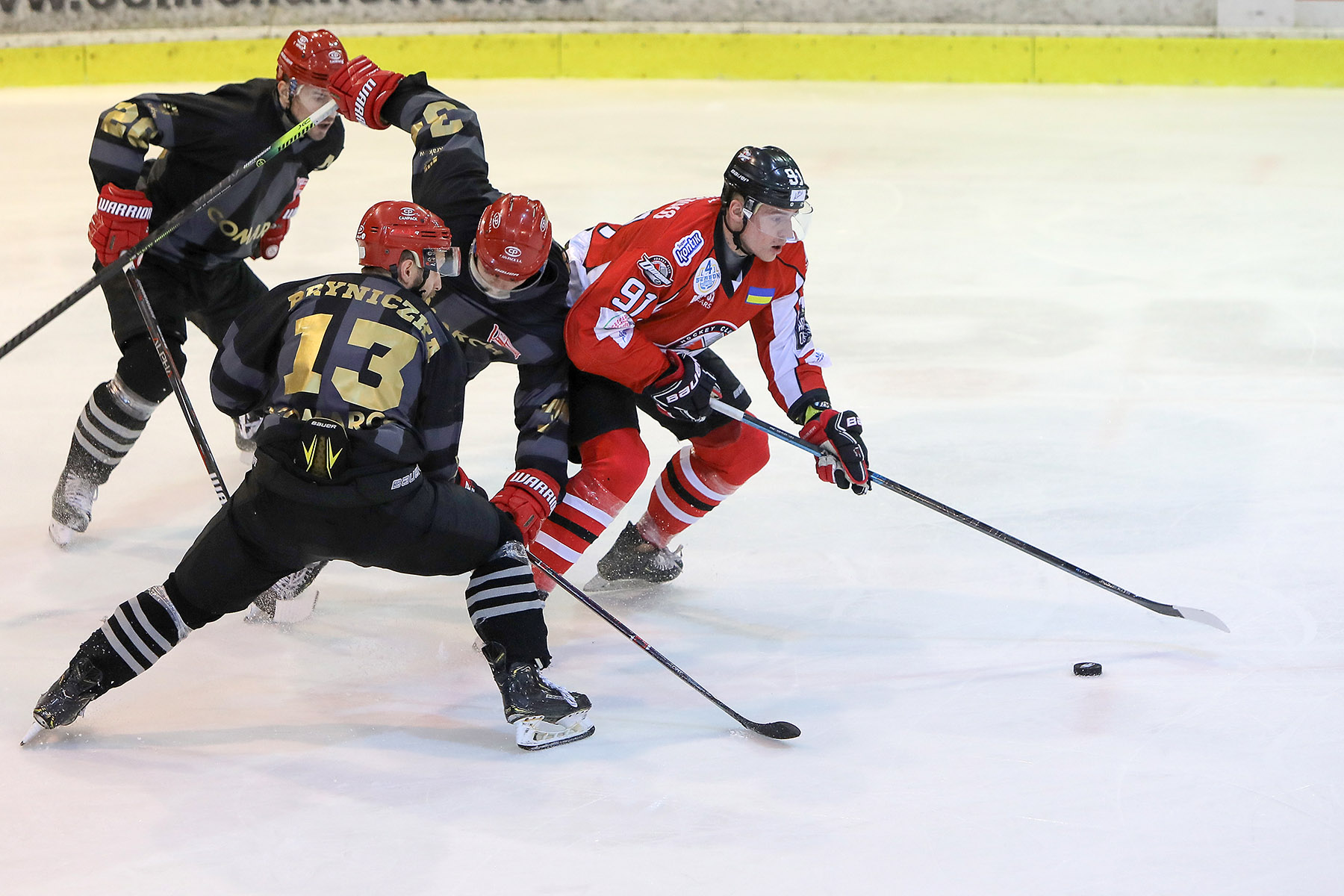 Neman Grodno forward Yegor Stepanov is one step faster than Cracovia Krakow’s Kasper Bryniczka but both teams qualified for the final round for the 2020 IIHF Continental Cup.
