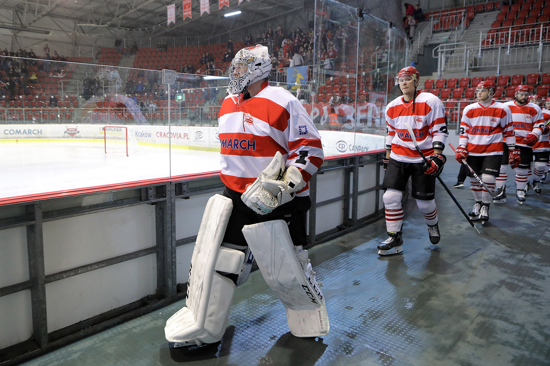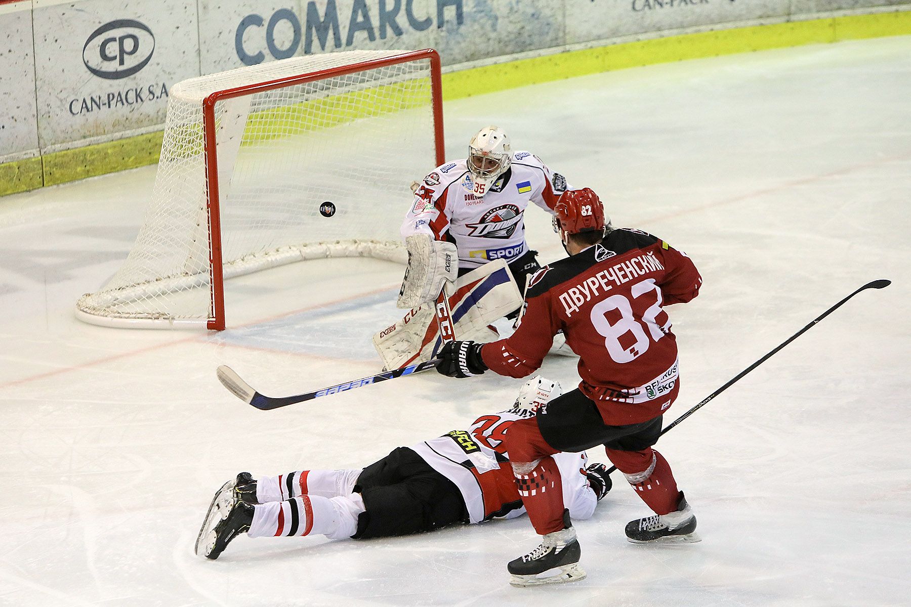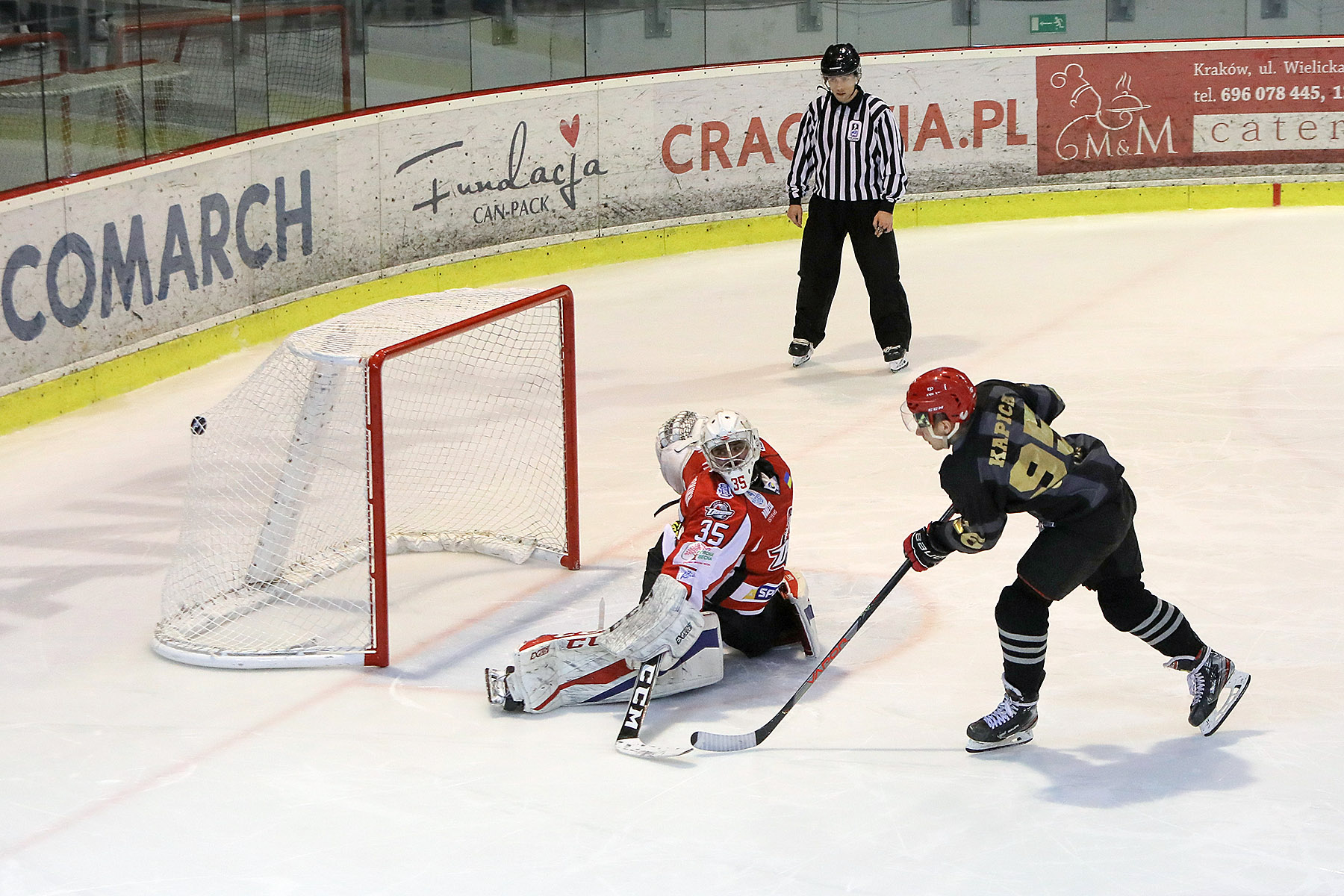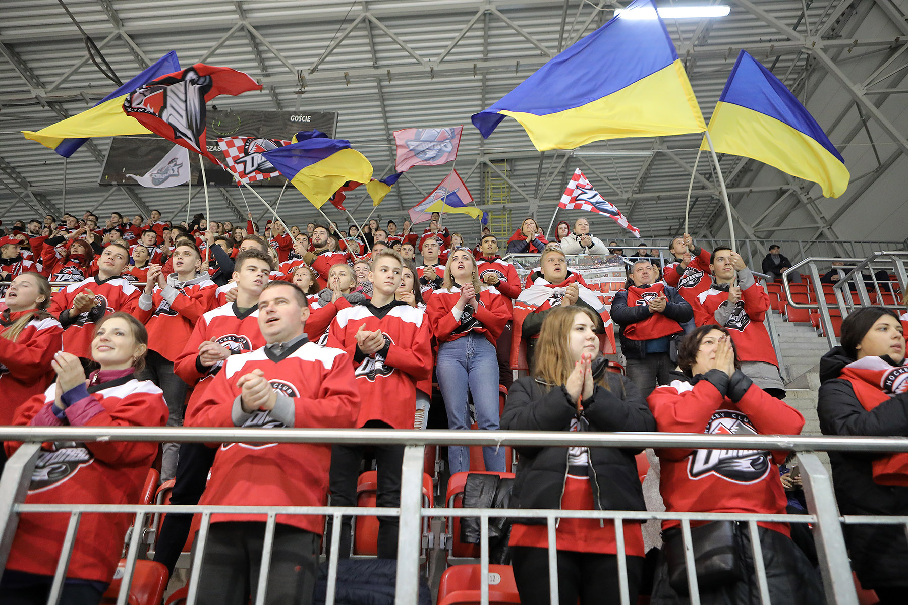 In the second period, the tension in the building built up as the tensions on the ice rose. Just past the game’s midpoint, Cracovia’s Kasper Bryniczka opened the scoring and opened the release valve for the home fans, who rejoiced. Then early in the third, on a delayed Cracovia penalty, Vitali Lyalka tied it on a great second effort, reaching as he was falling to put the puck past the outstretched pad of Kopriva and just inside the far post. That gave the Donbass fans at that end of the rink their biggest reason to celebrate on the evening. But that was the only puck to beat Kopriva all night, shootout included.