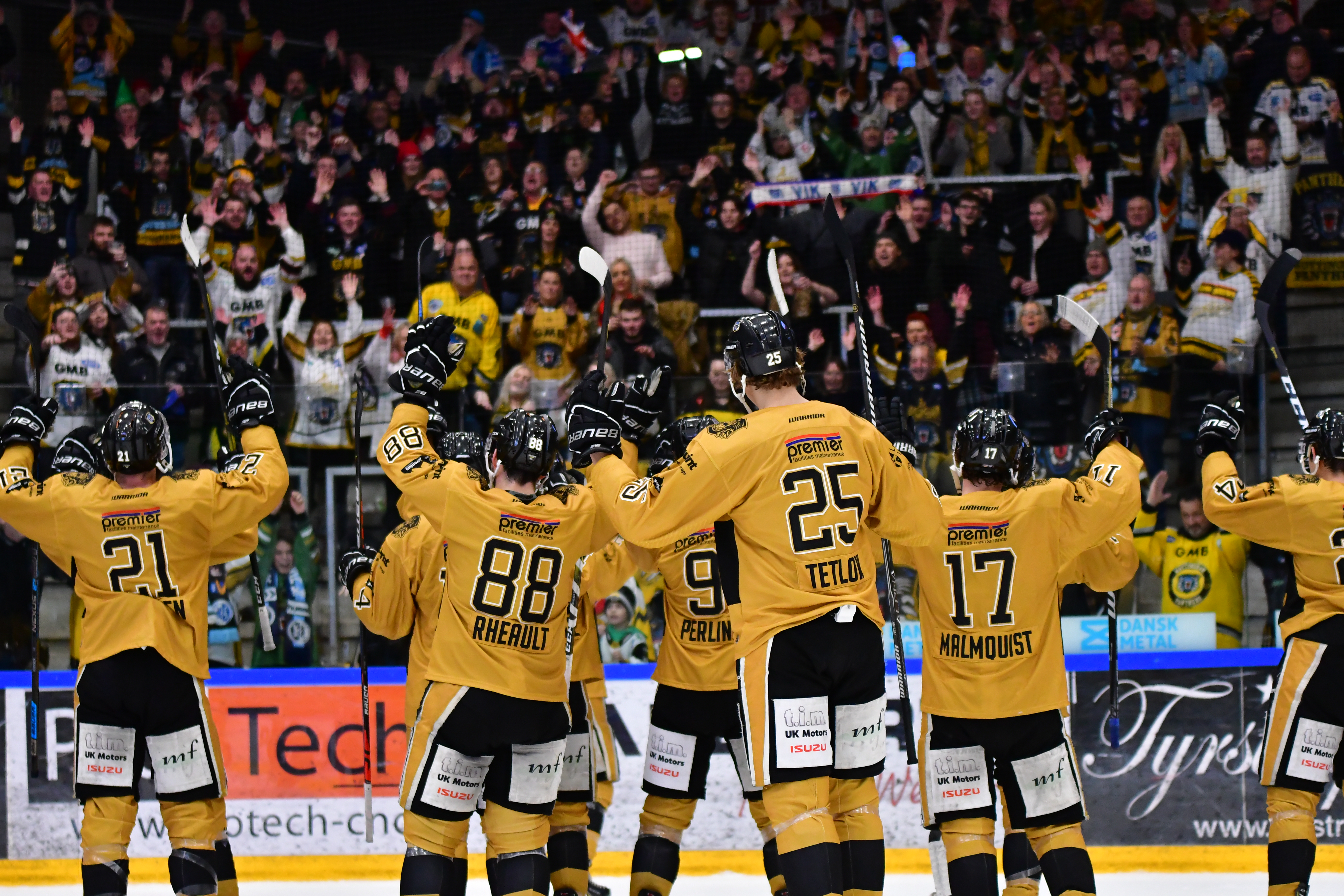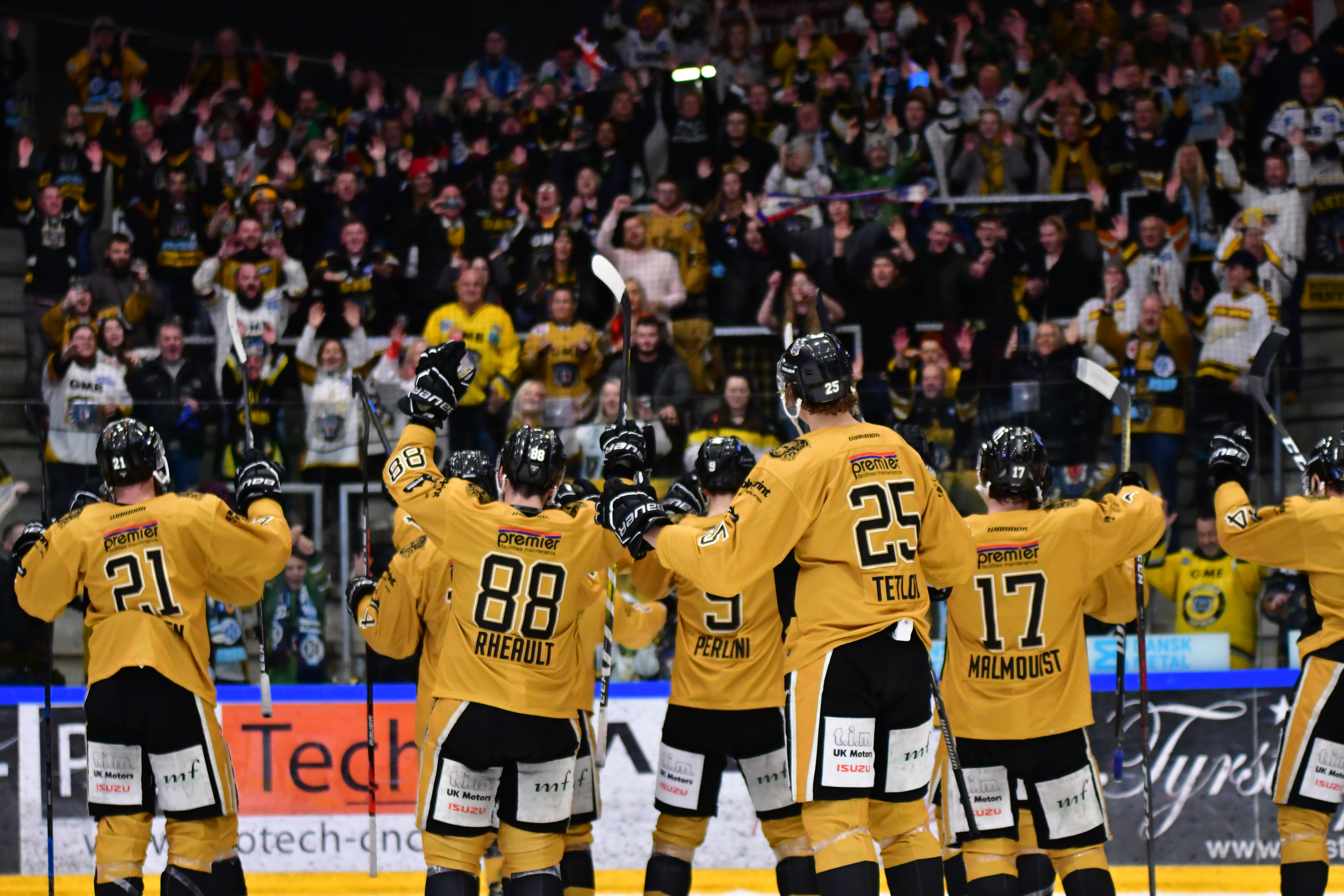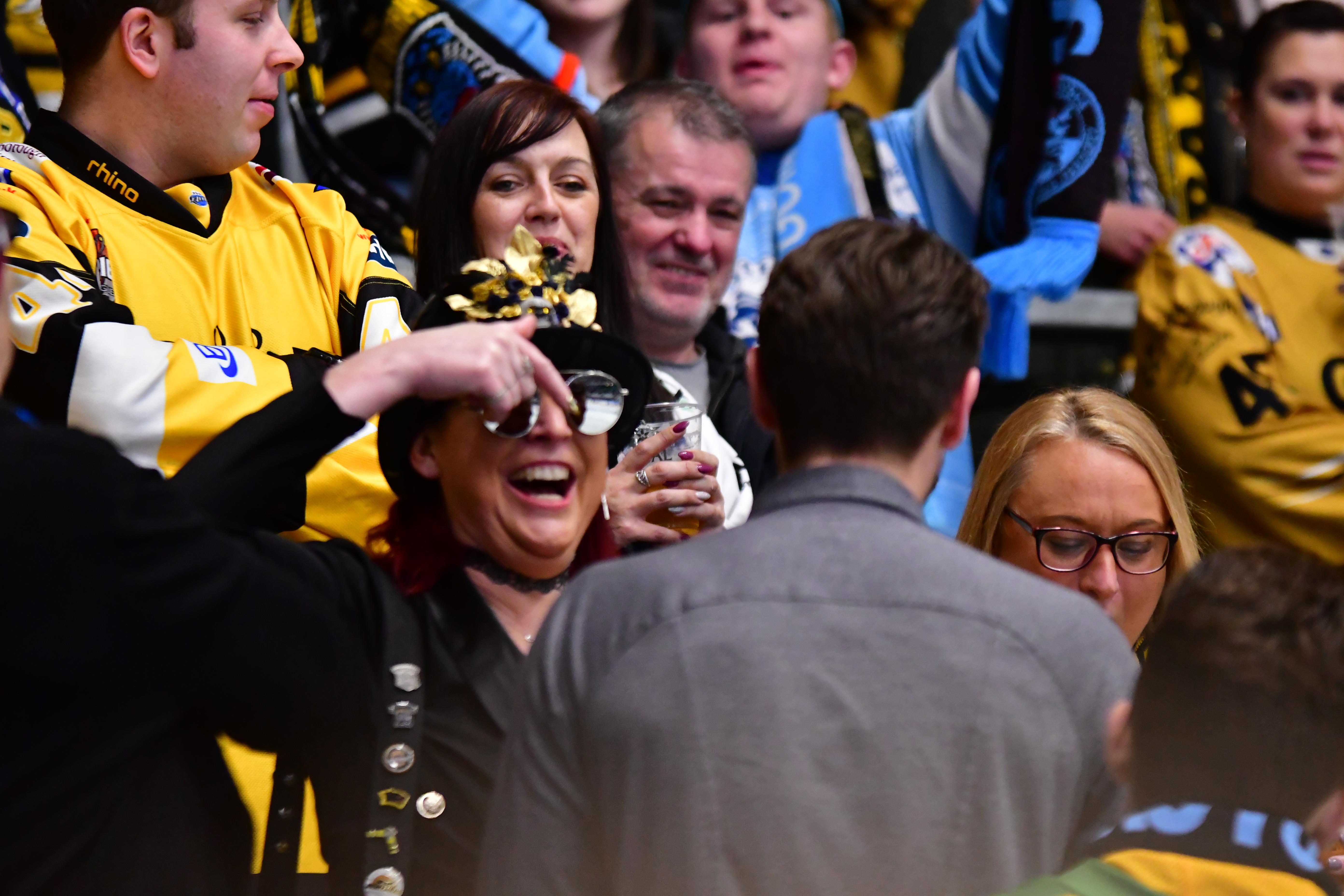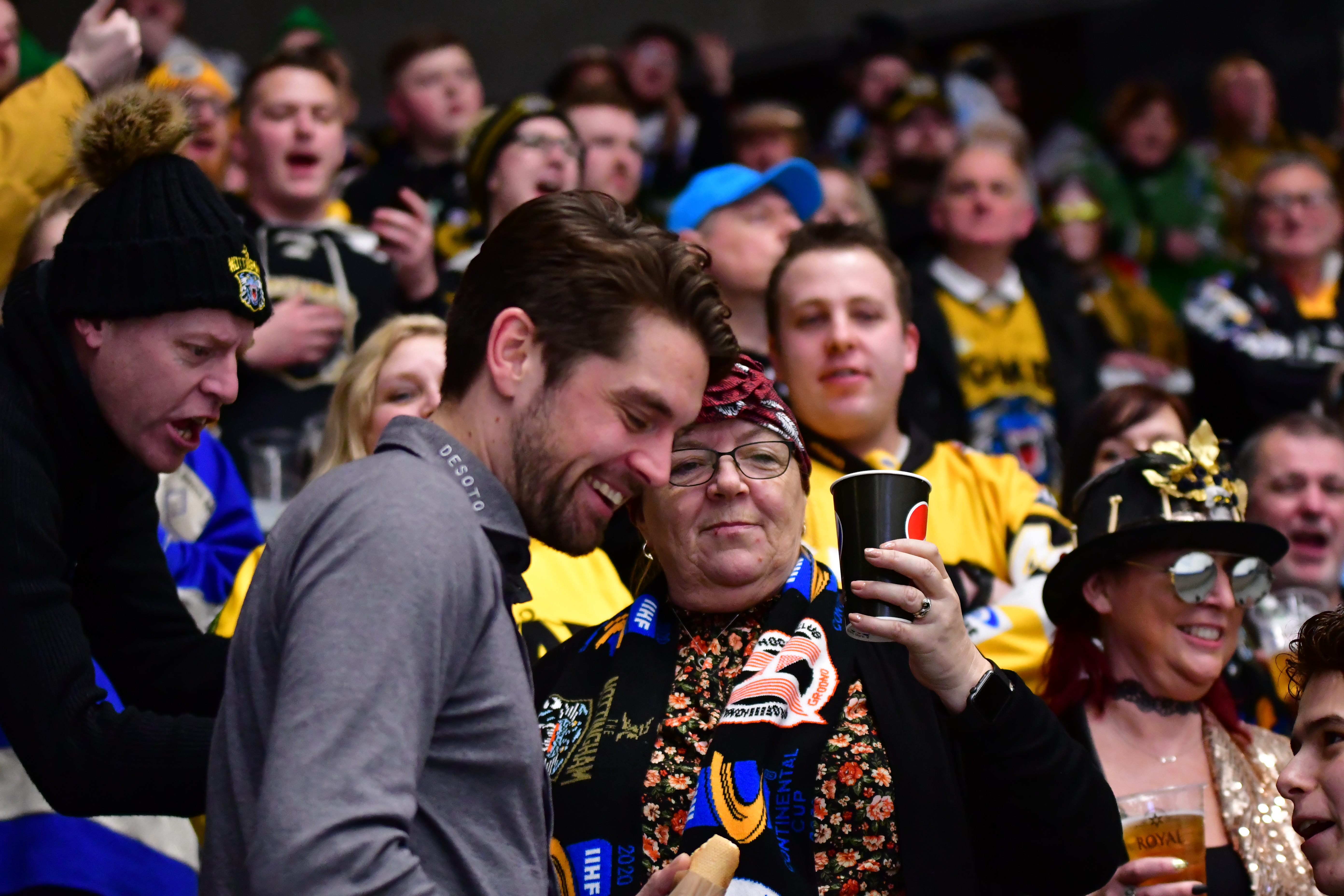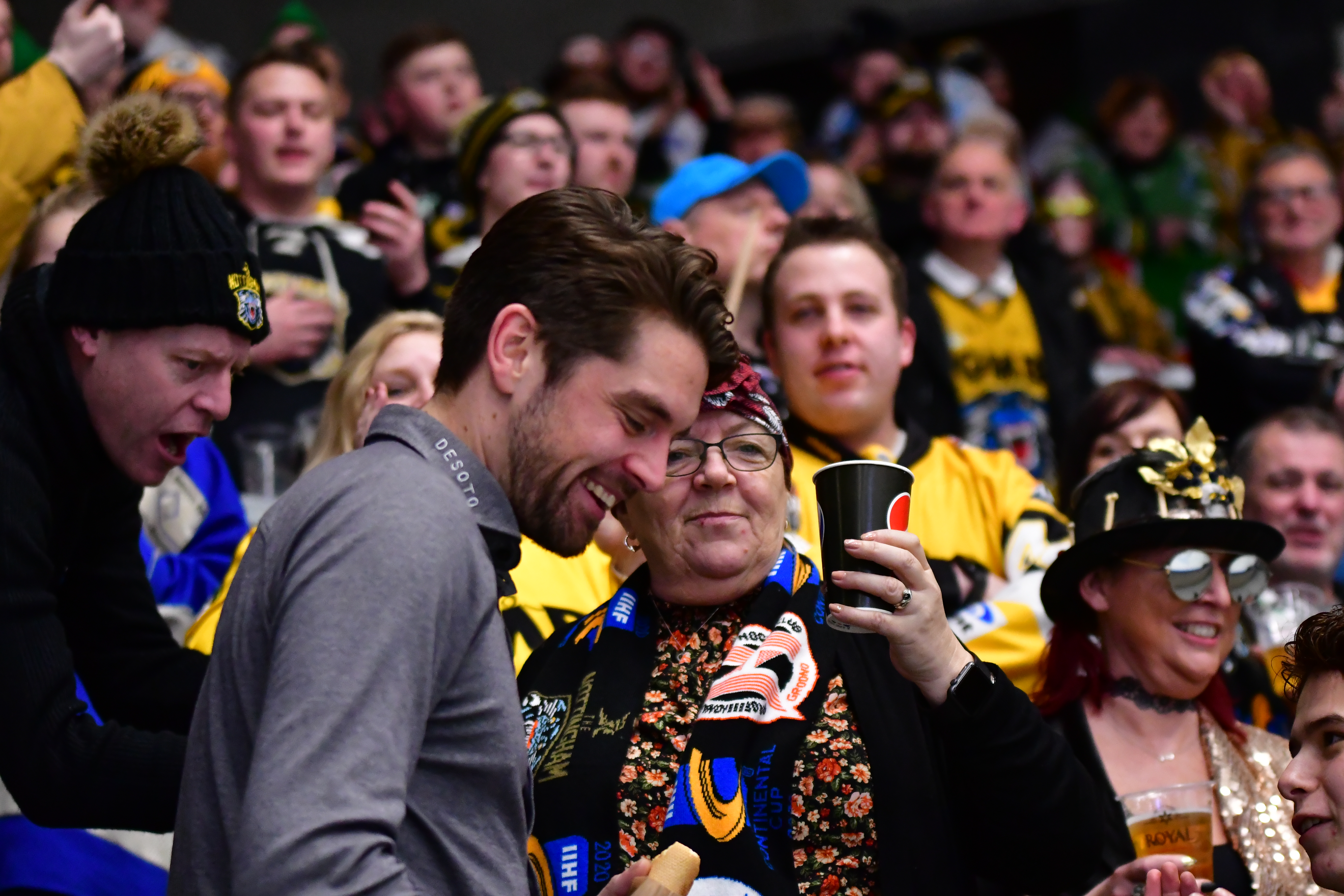 The Nottingham Panthers celebrate their win against Neman Grodno with their fans.