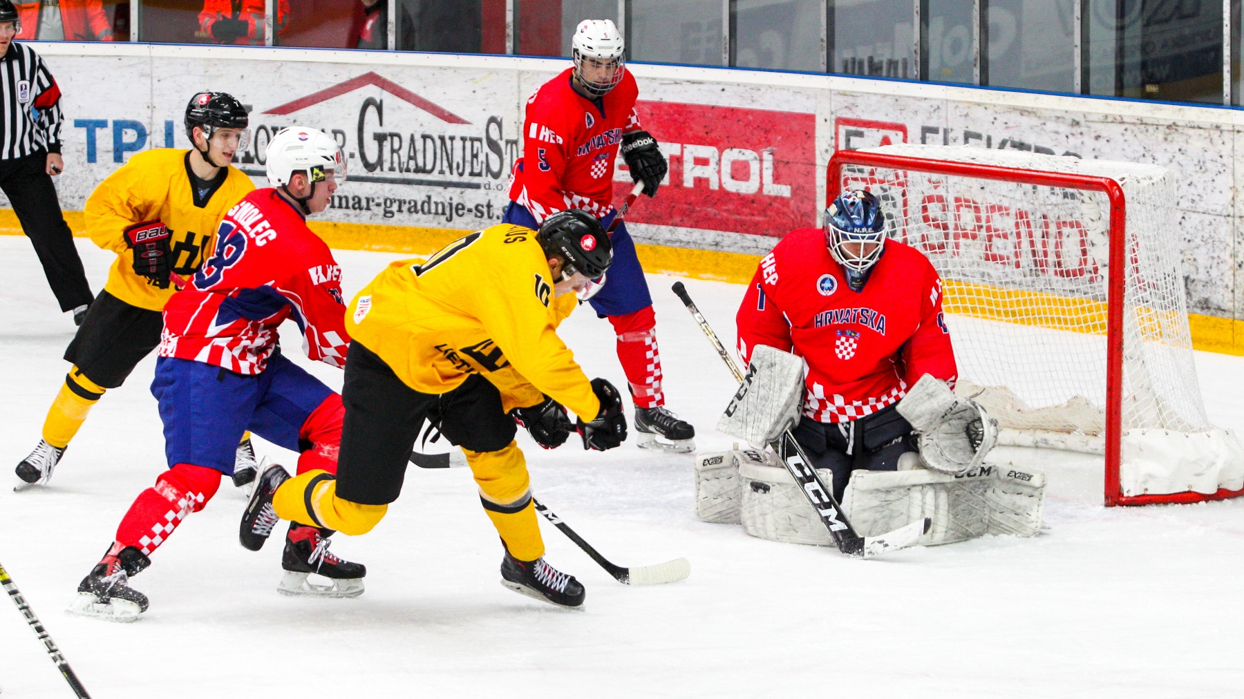 Lithuanian forwards Paulius Gintautas and Ilja Cetvertak put pressure on Croatian goaltender Vito Nikolic.
