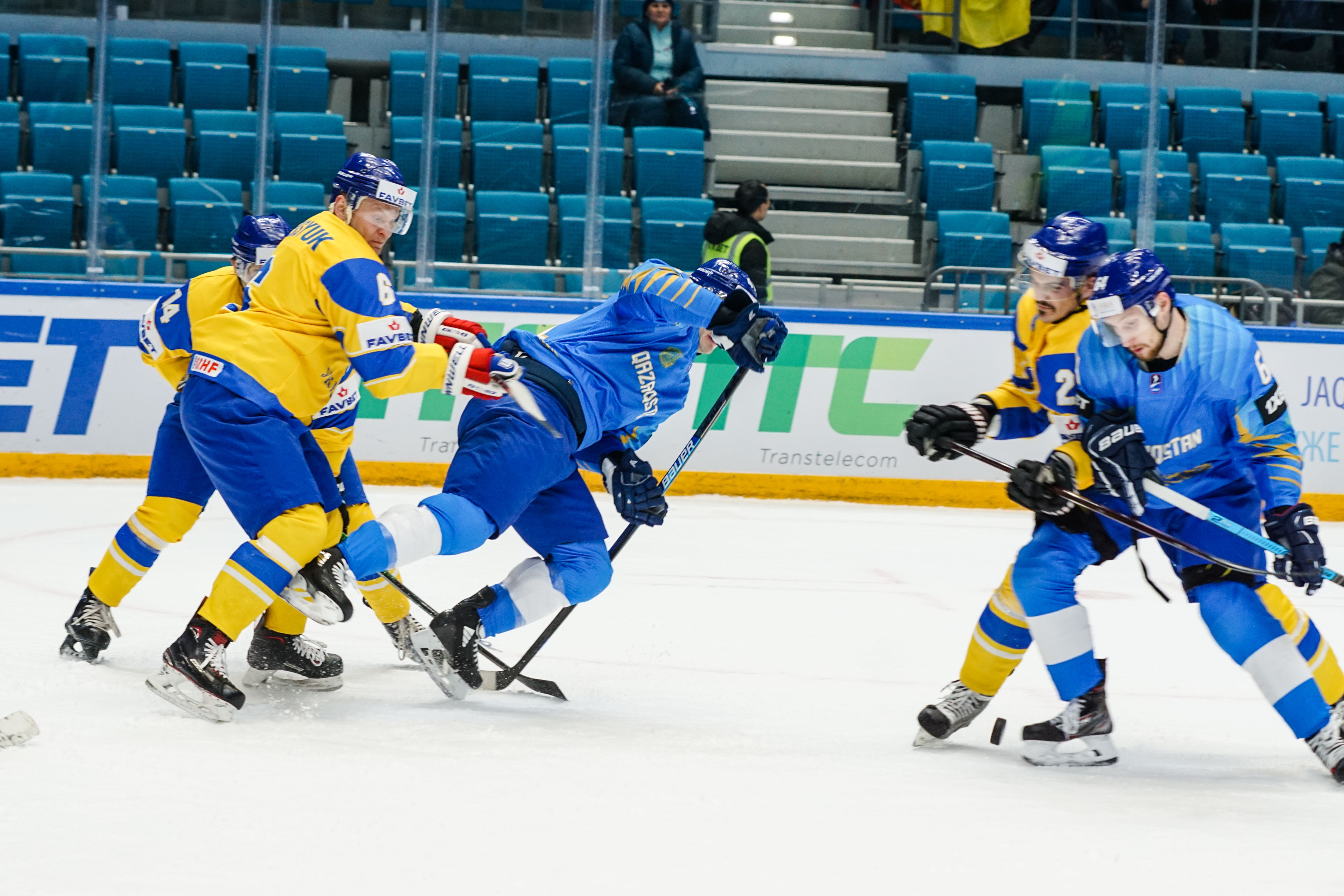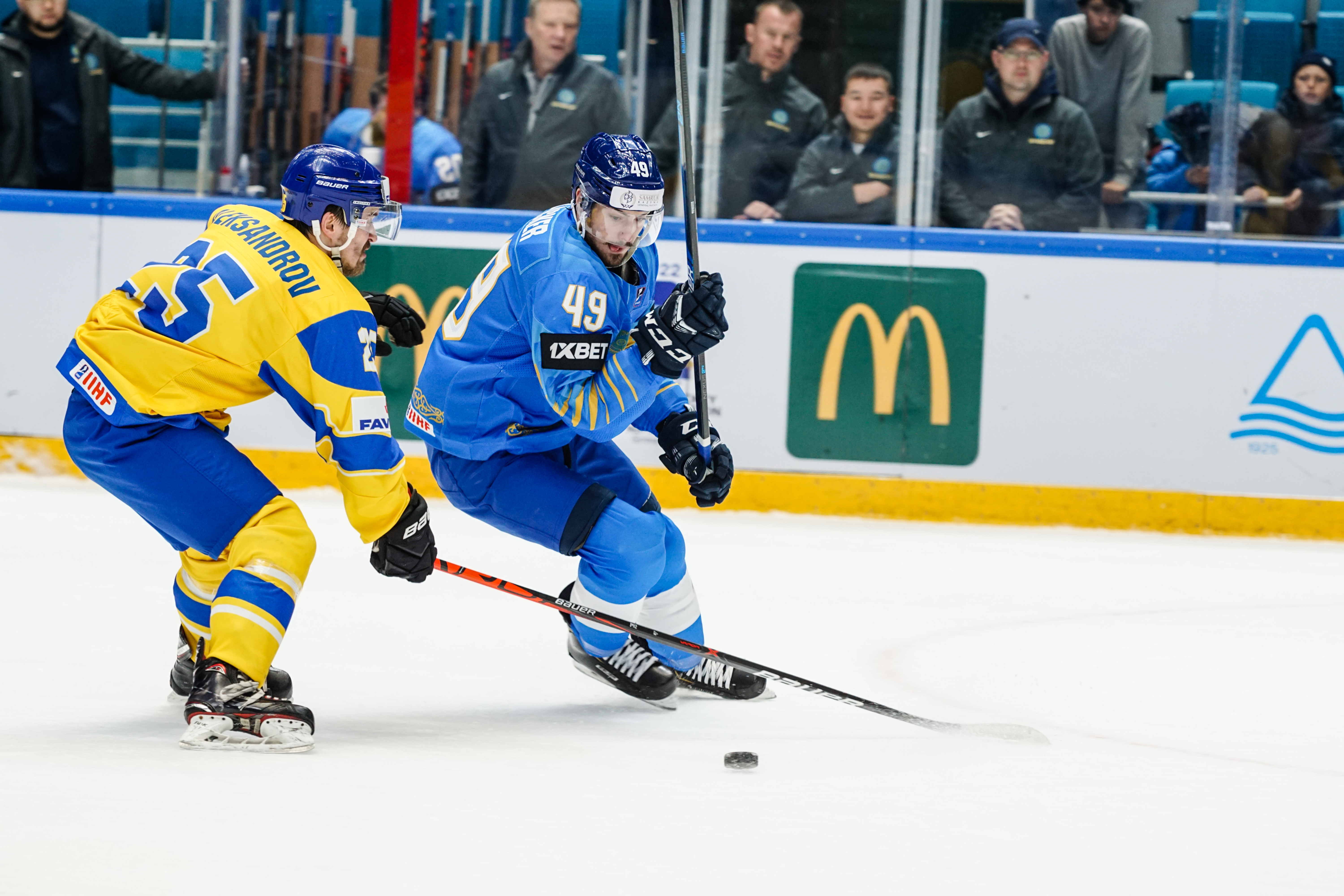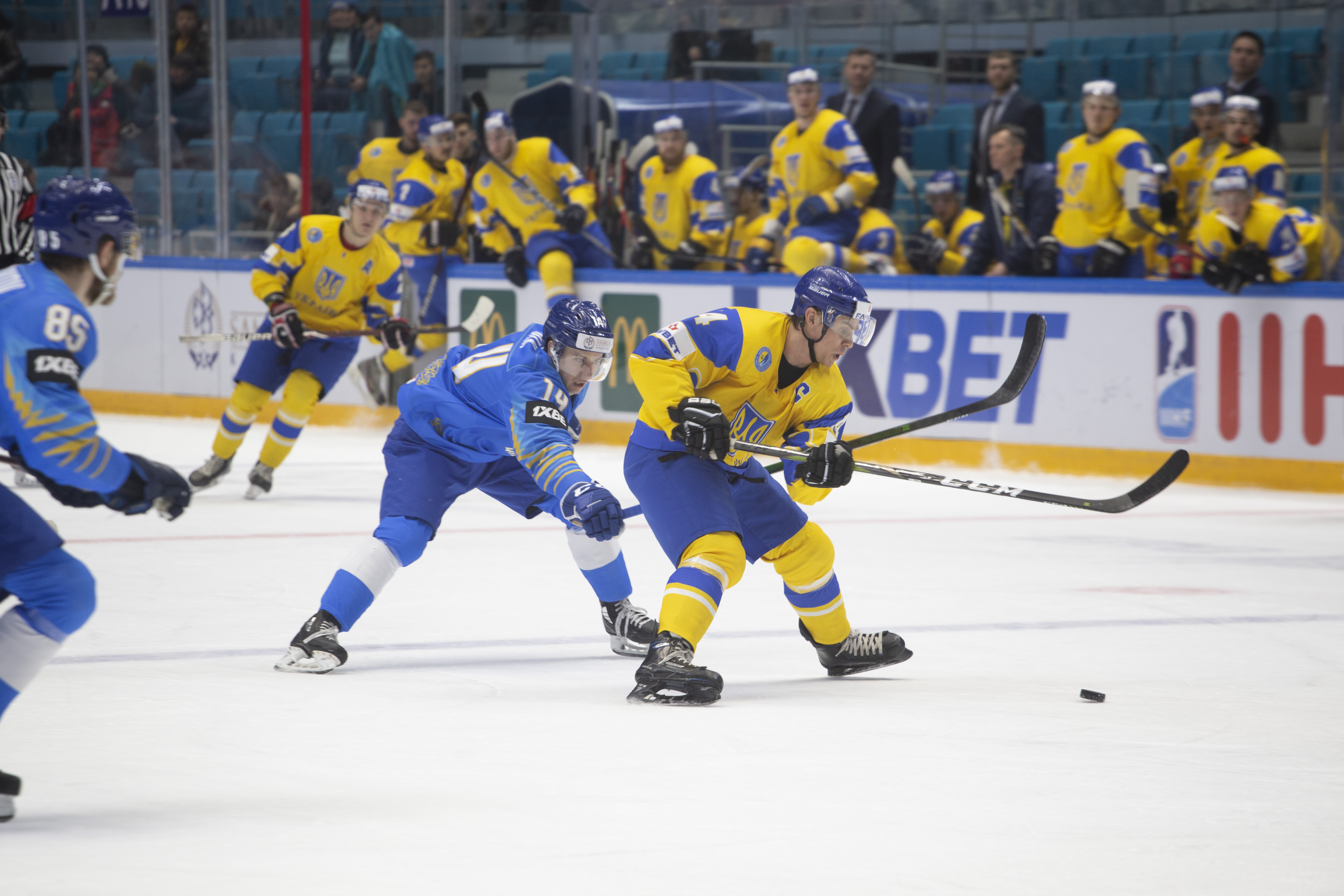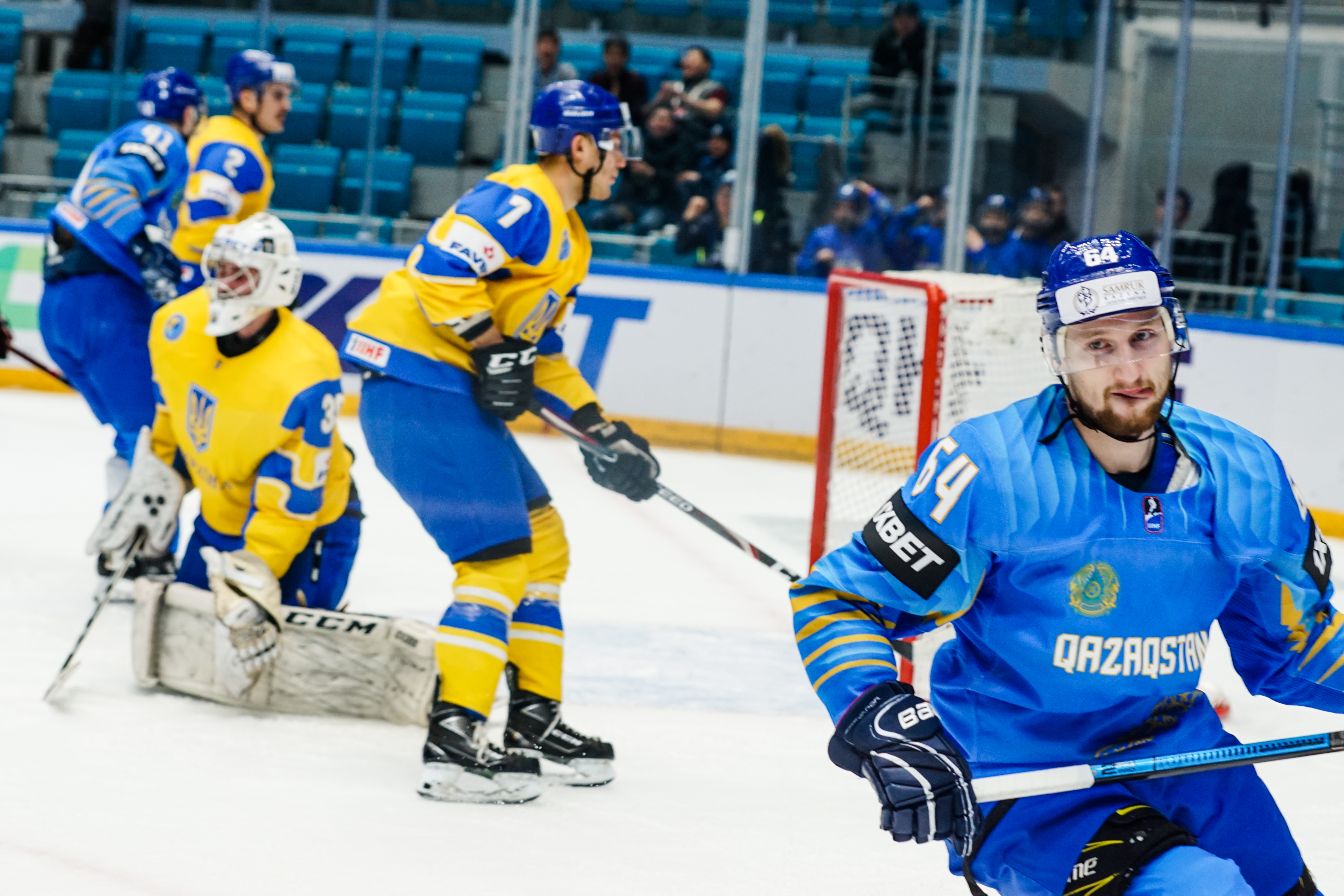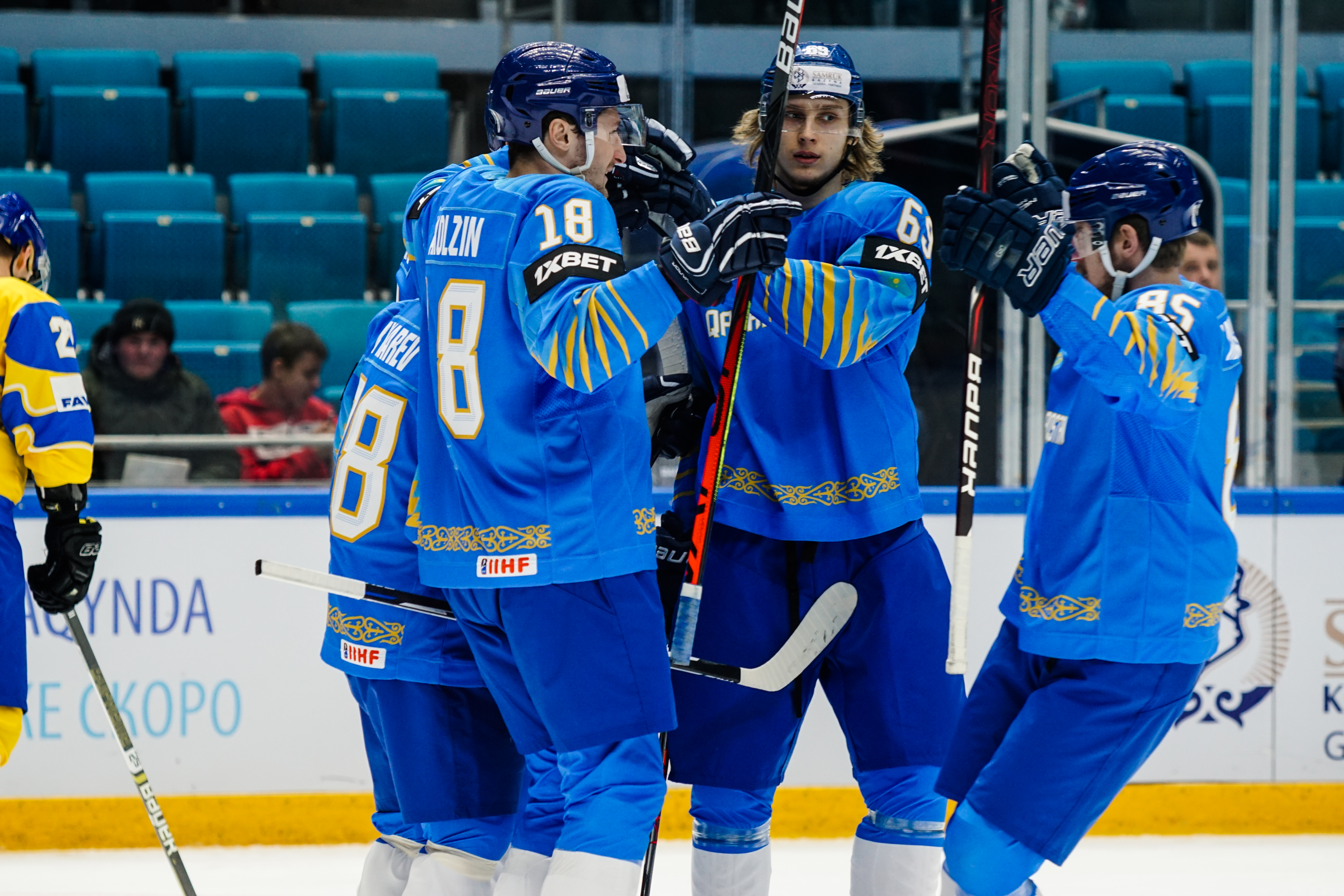 The reprieve was brief. Within a minute, Alexei Maklyukov’s point shot was tipped in by Dmitri Shevchenko. Next, Valeri Orekhov shaped to shoot before dinking a diagonal pass for Yegor Petukhov to score unmarked at the back door. And when Leonid Metalnikov fired home from the blue line, Kazakhstan had a 3-0 lead inside nine minutes. Kucher went back to the bench but the host was rampant. The speed of Kazakhstan’s passing was causing Ukraine all sorts of problems and too often players were left unguarded near the net. That enabled Curtis Valk to set up Starchenko out in front for 4-0, before Zhailauov had the crowd on its feet when he stuffed home a rebound from a Darren Dietz point shot.