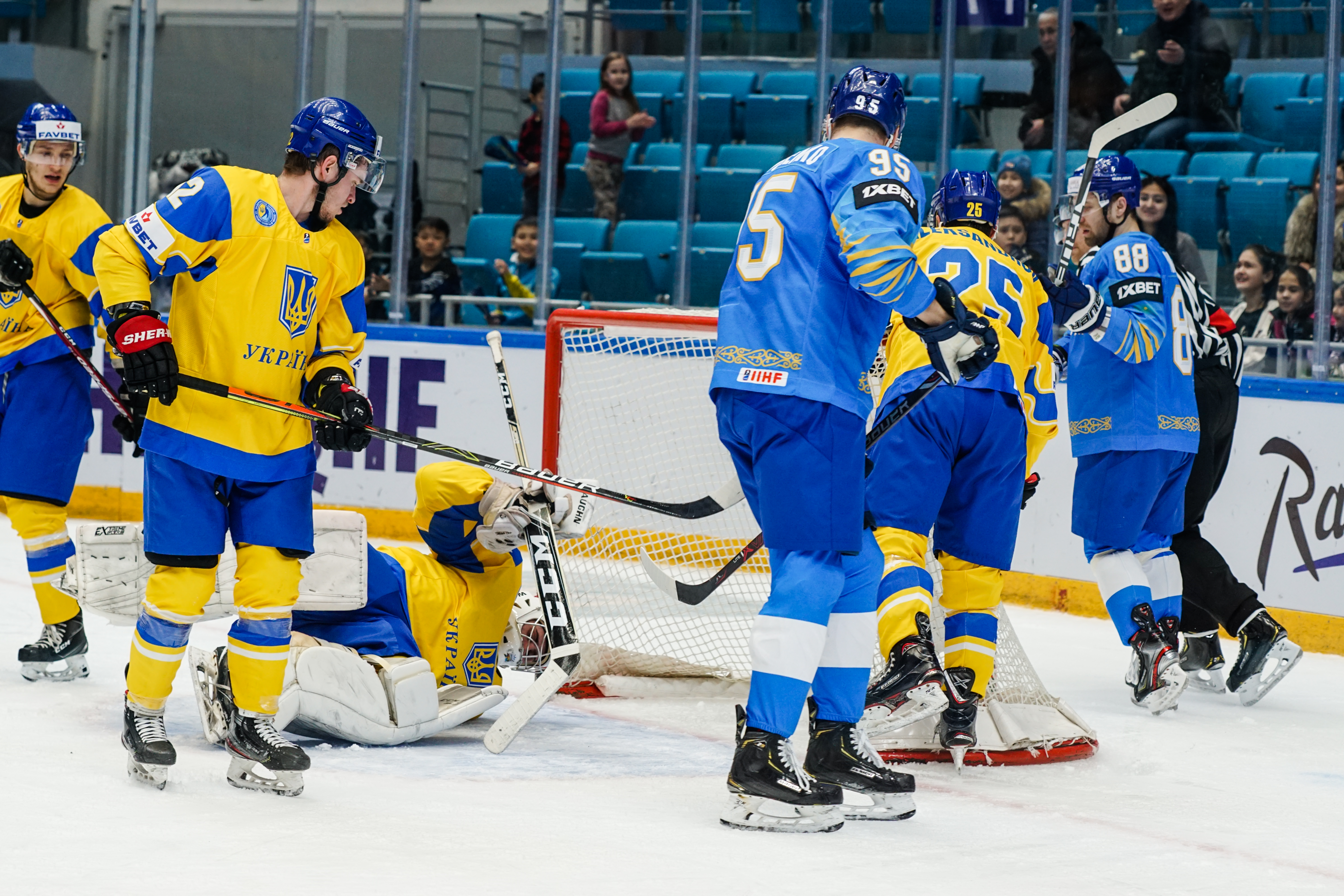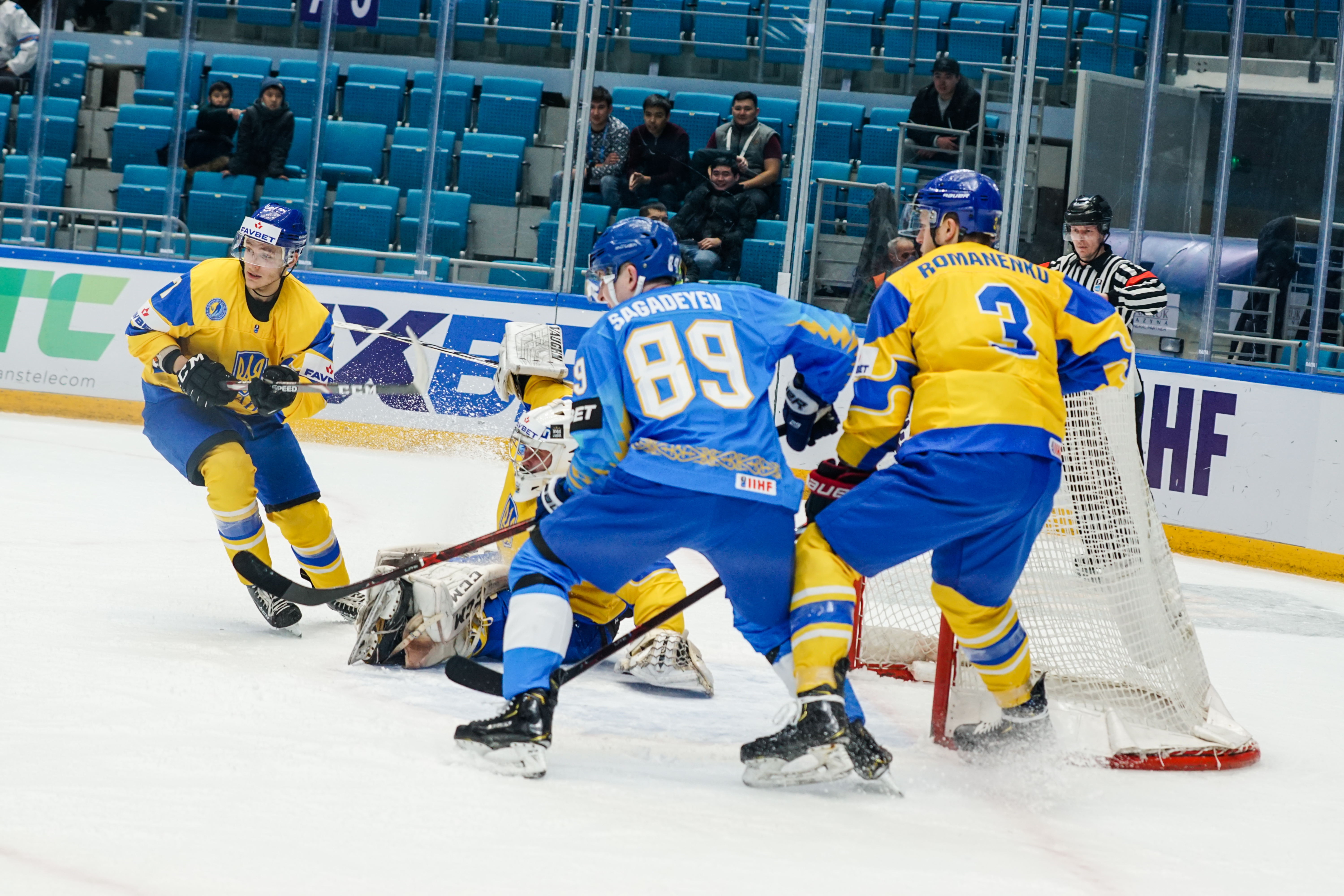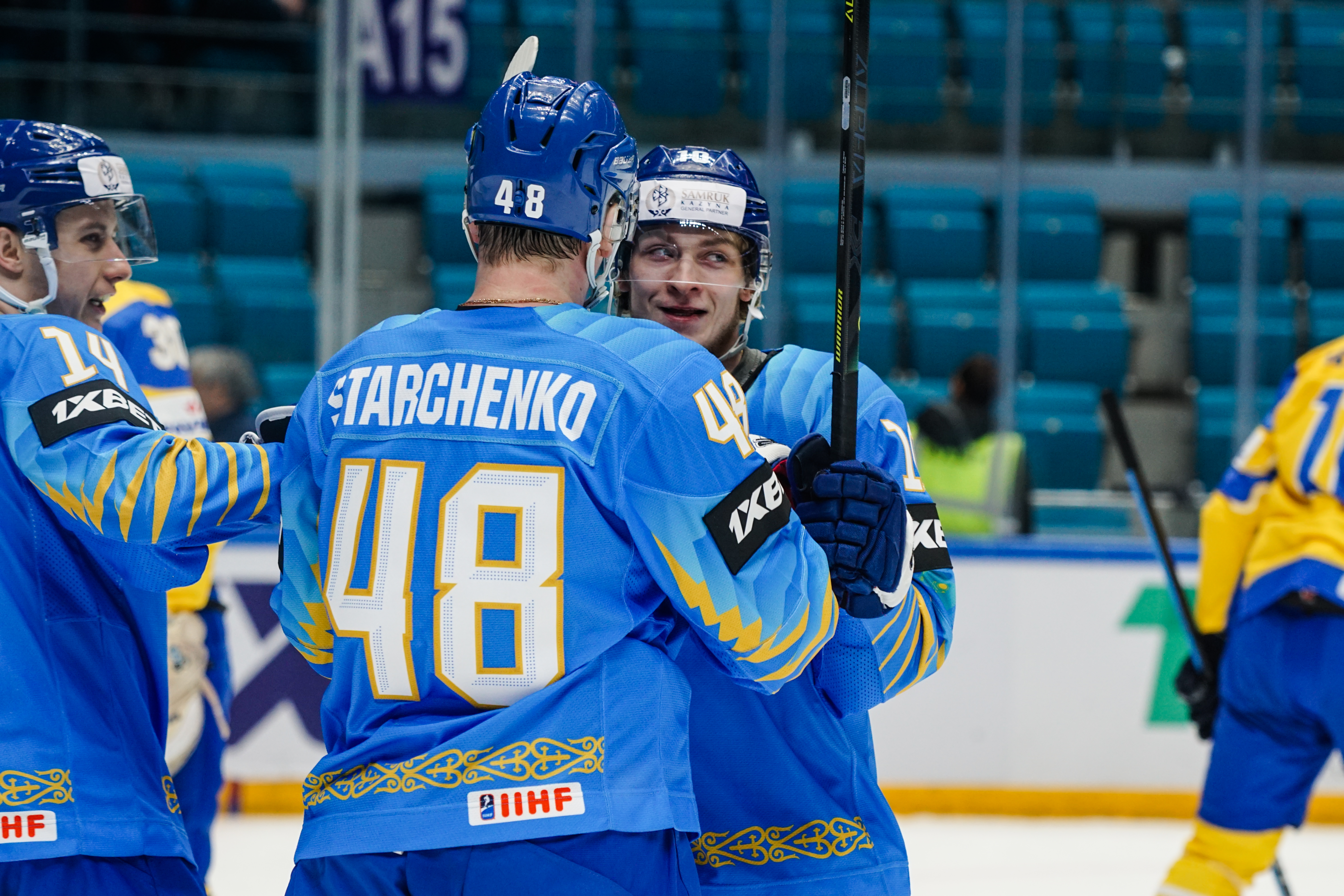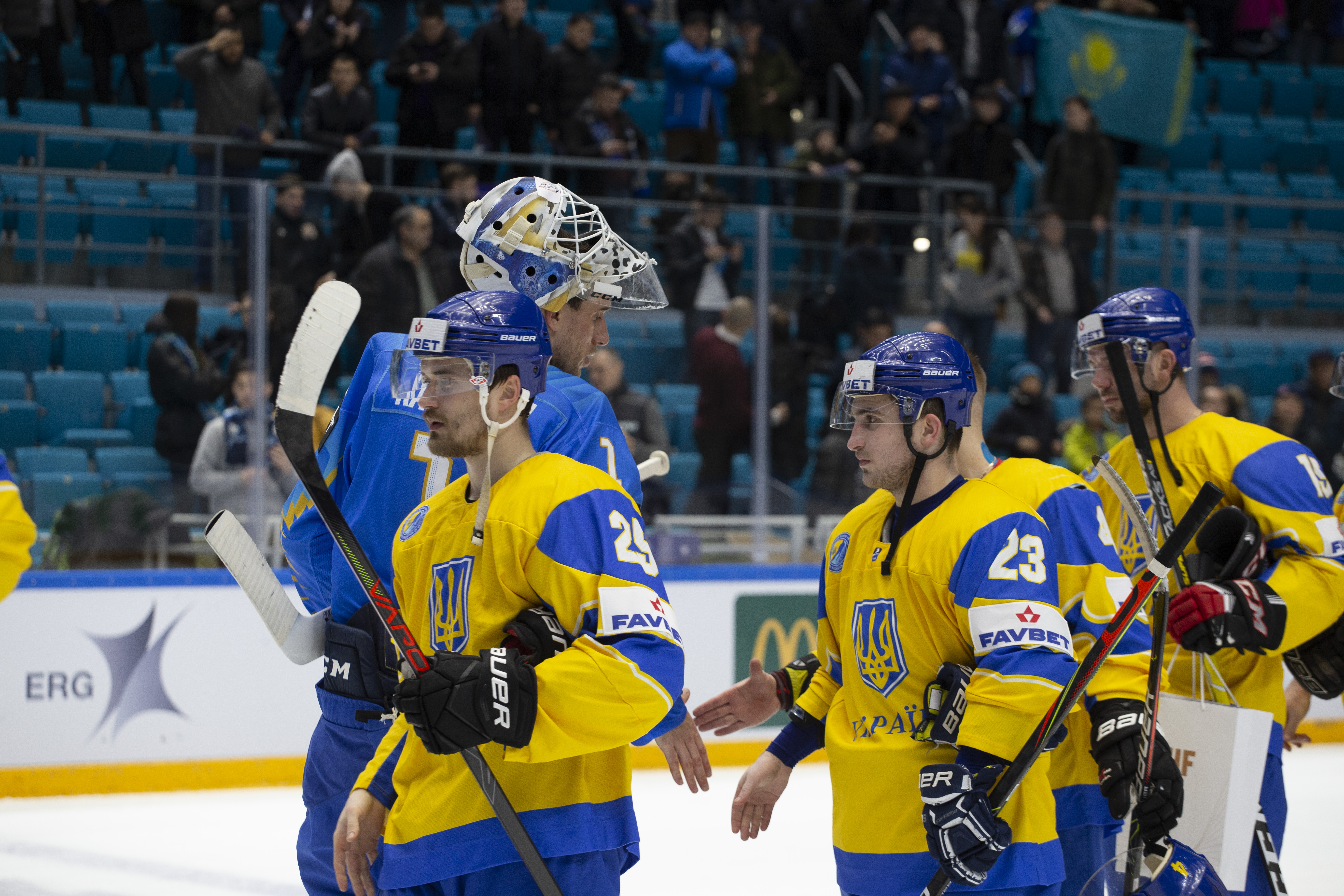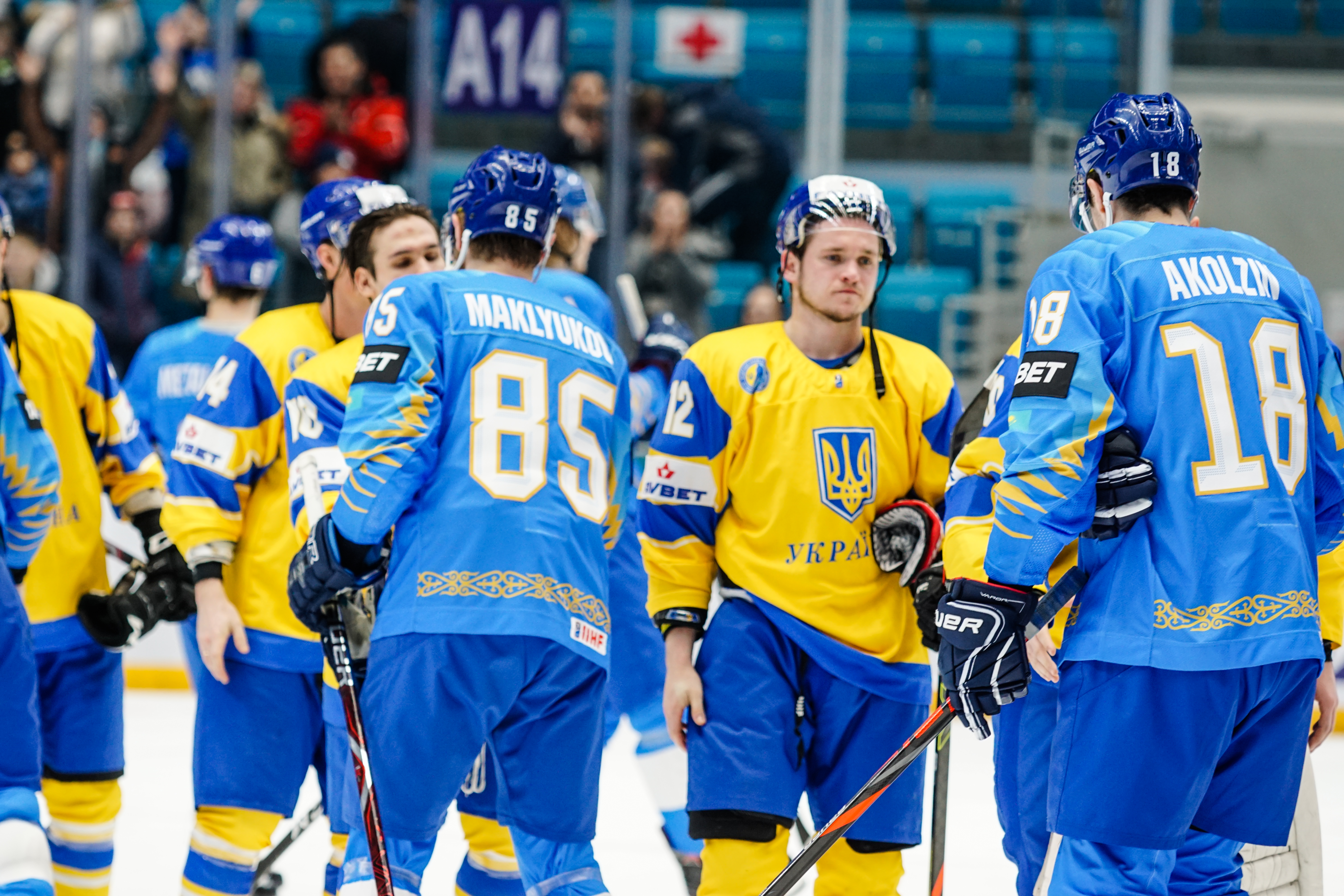 The reprieve was brief. Within a minute, Alexei Maklyukov’s point shot was tipped in by Dmitri Shevchenko. Next, Valeri Orekhov shaped to shoot before dinking a diagonal pass for Yegor Petukhov to score unmarked at the back door. And when Leonid Metalnikov fired home from the blue line, Kazakhstan had a 3-0 lead inside nine minutes. Kucher went back to the bench but the host was rampant. The speed of Kazakhstan’s passing was causing Ukraine all sorts of problems and too often players were left unguarded near the net. That enabled Curtis Valk to set up Starchenko out in front for 4-0, before Zhailauov had the crowd on its feet when he stuffed home a rebound from a Darren Dietz point shot.