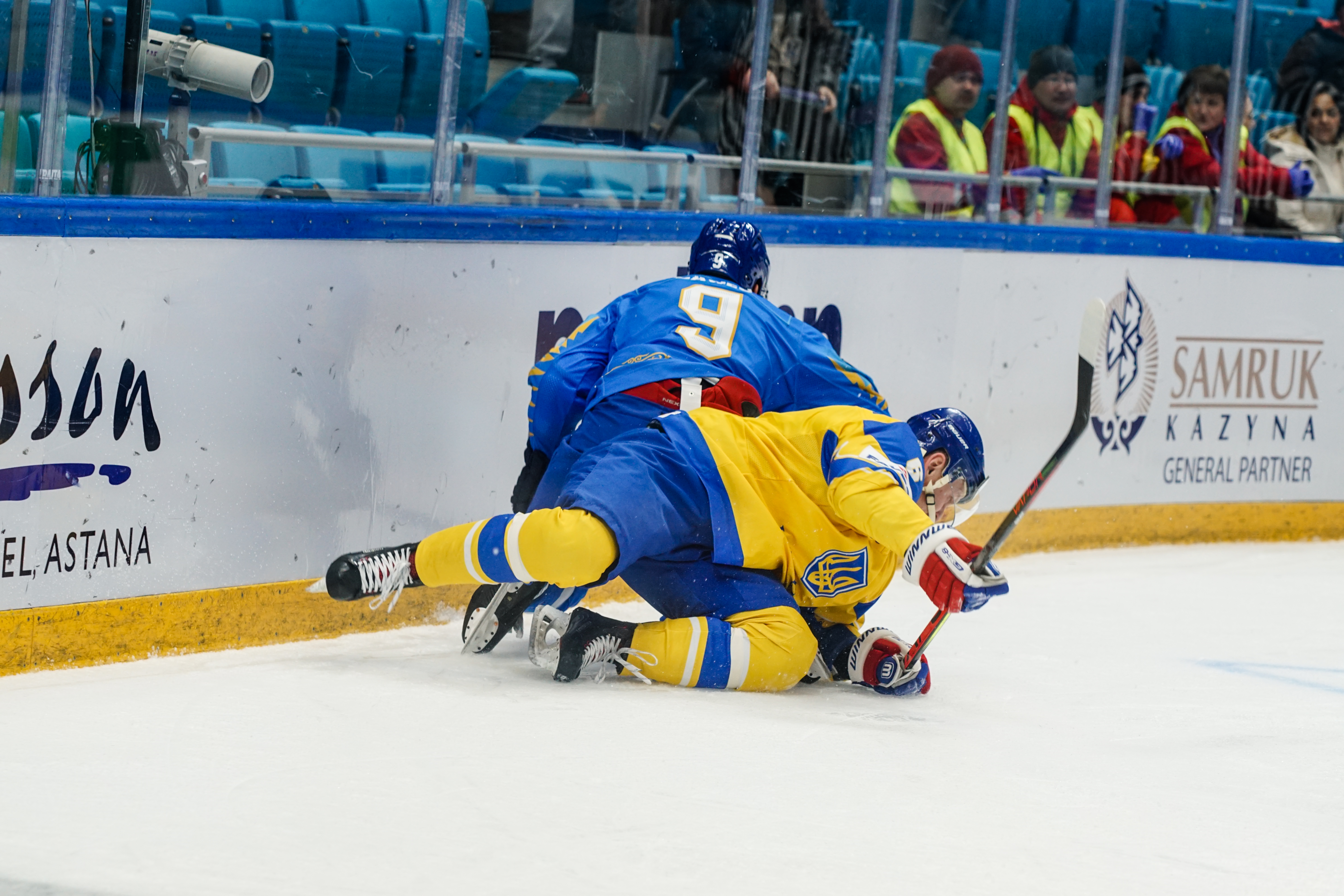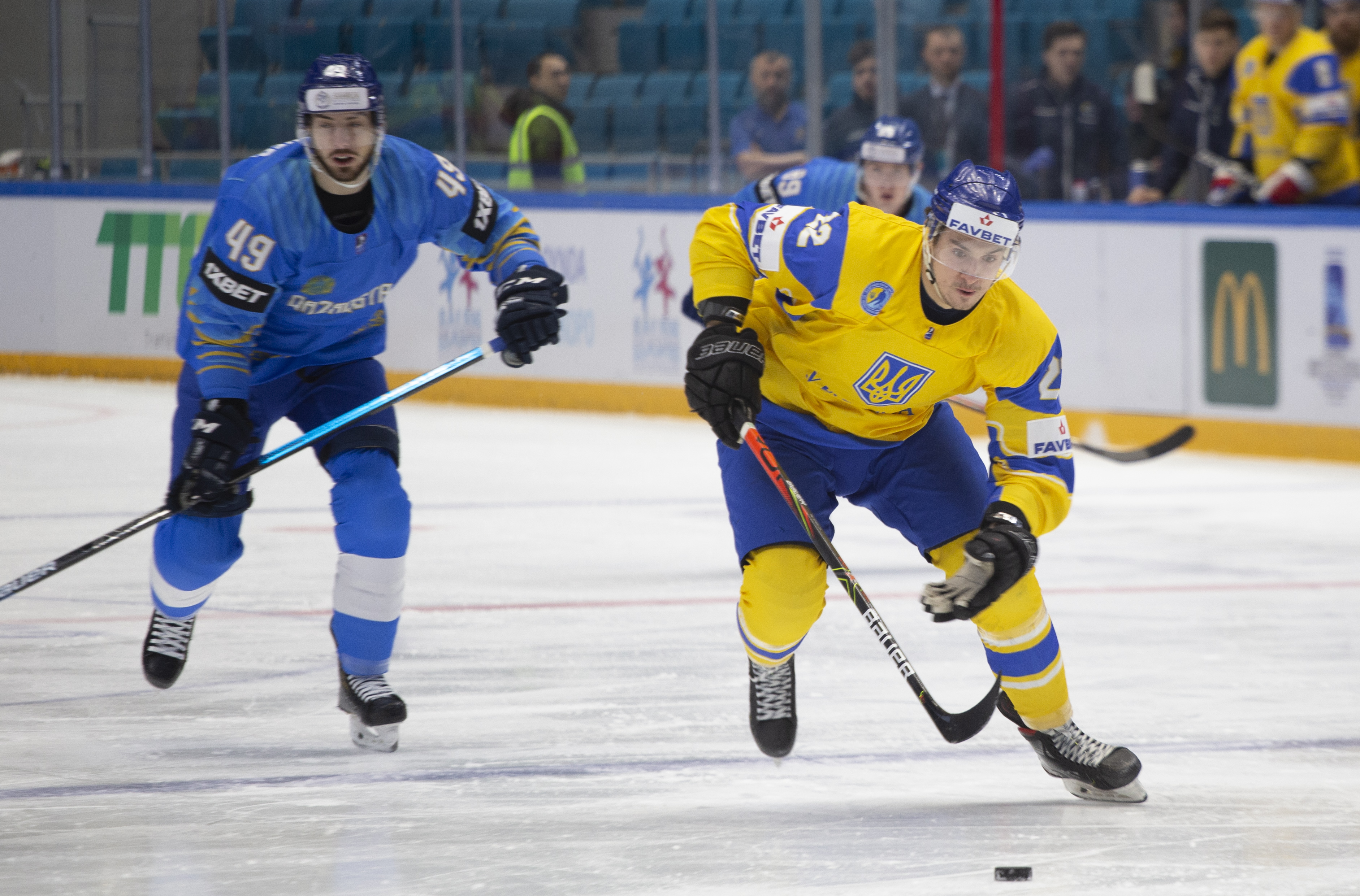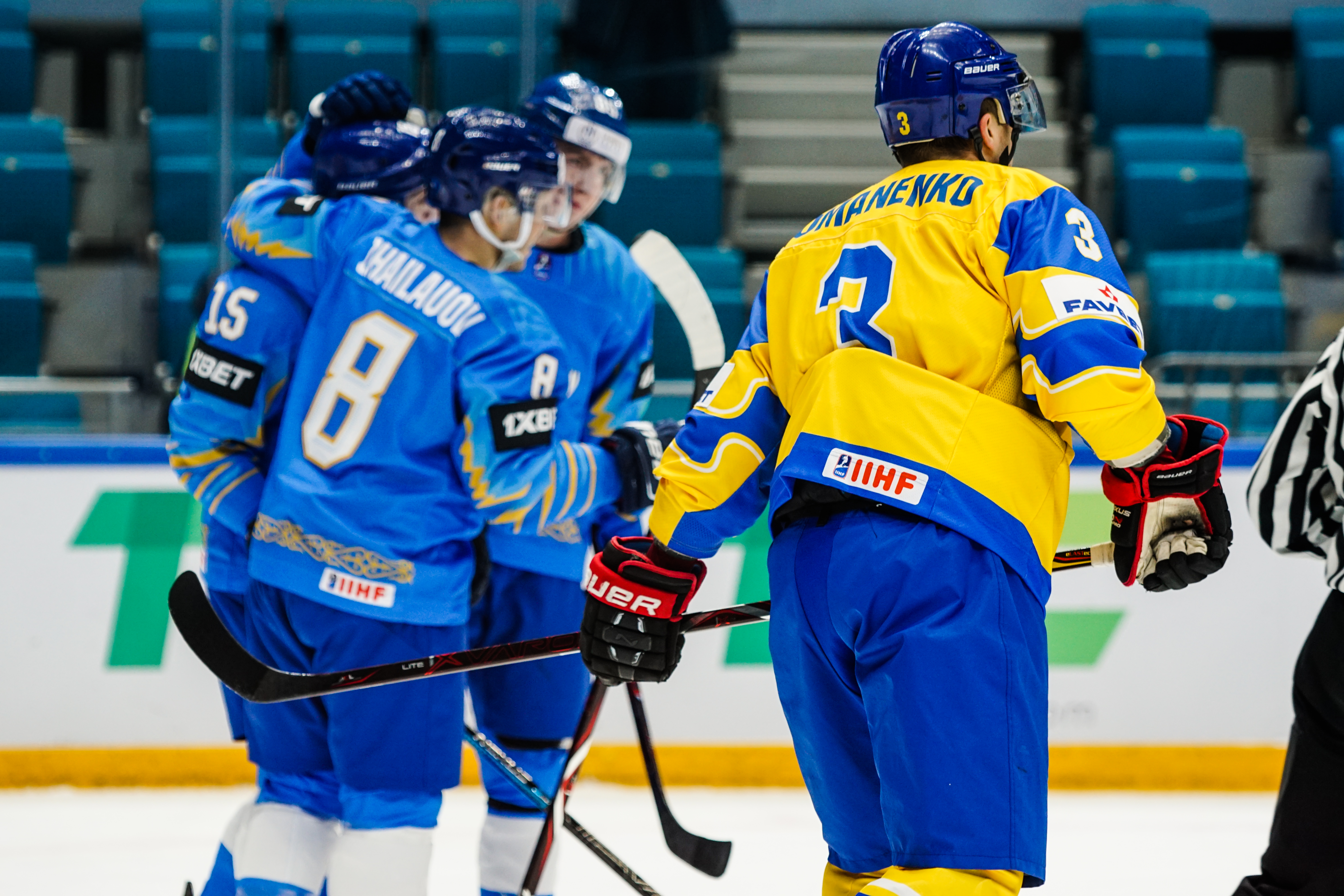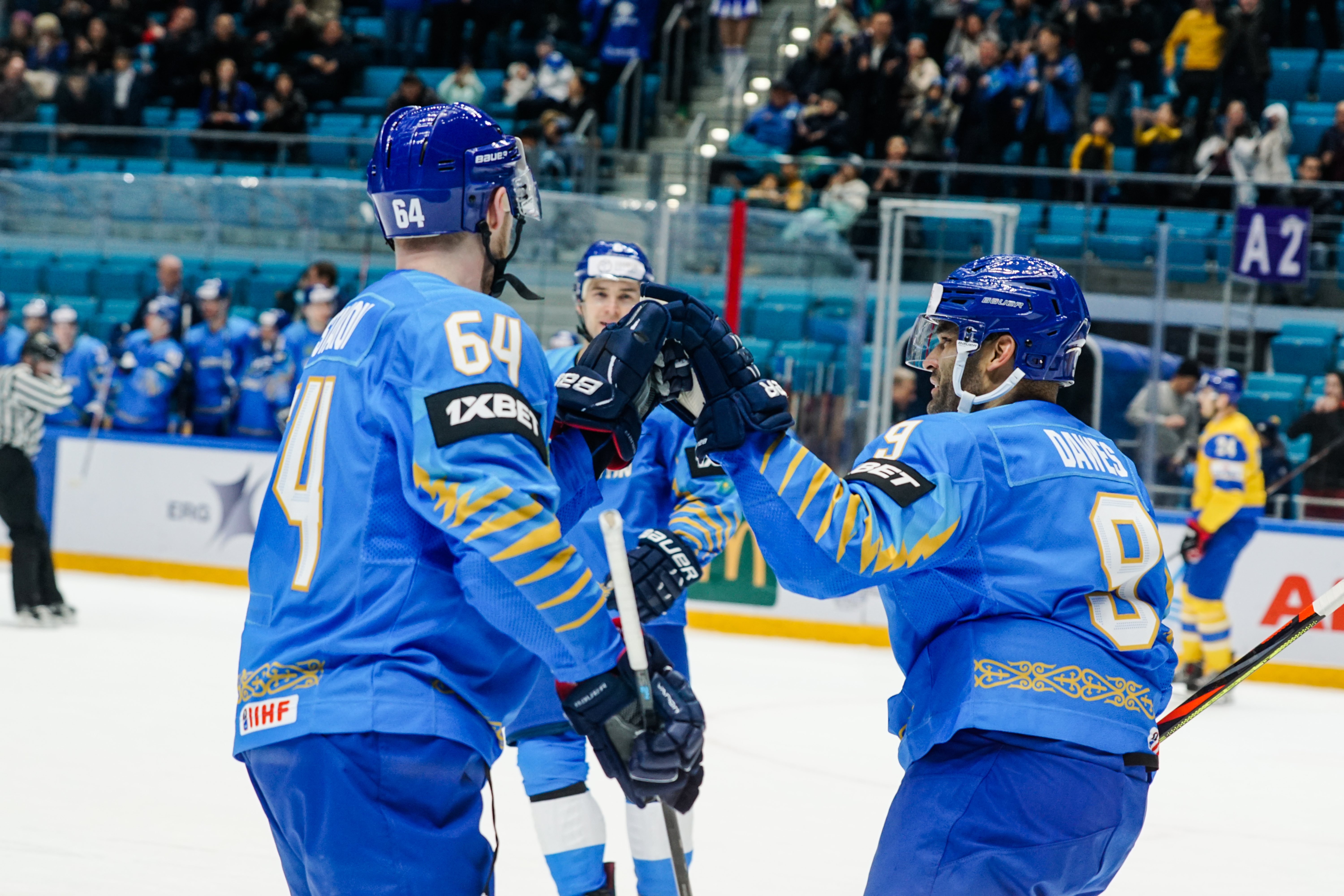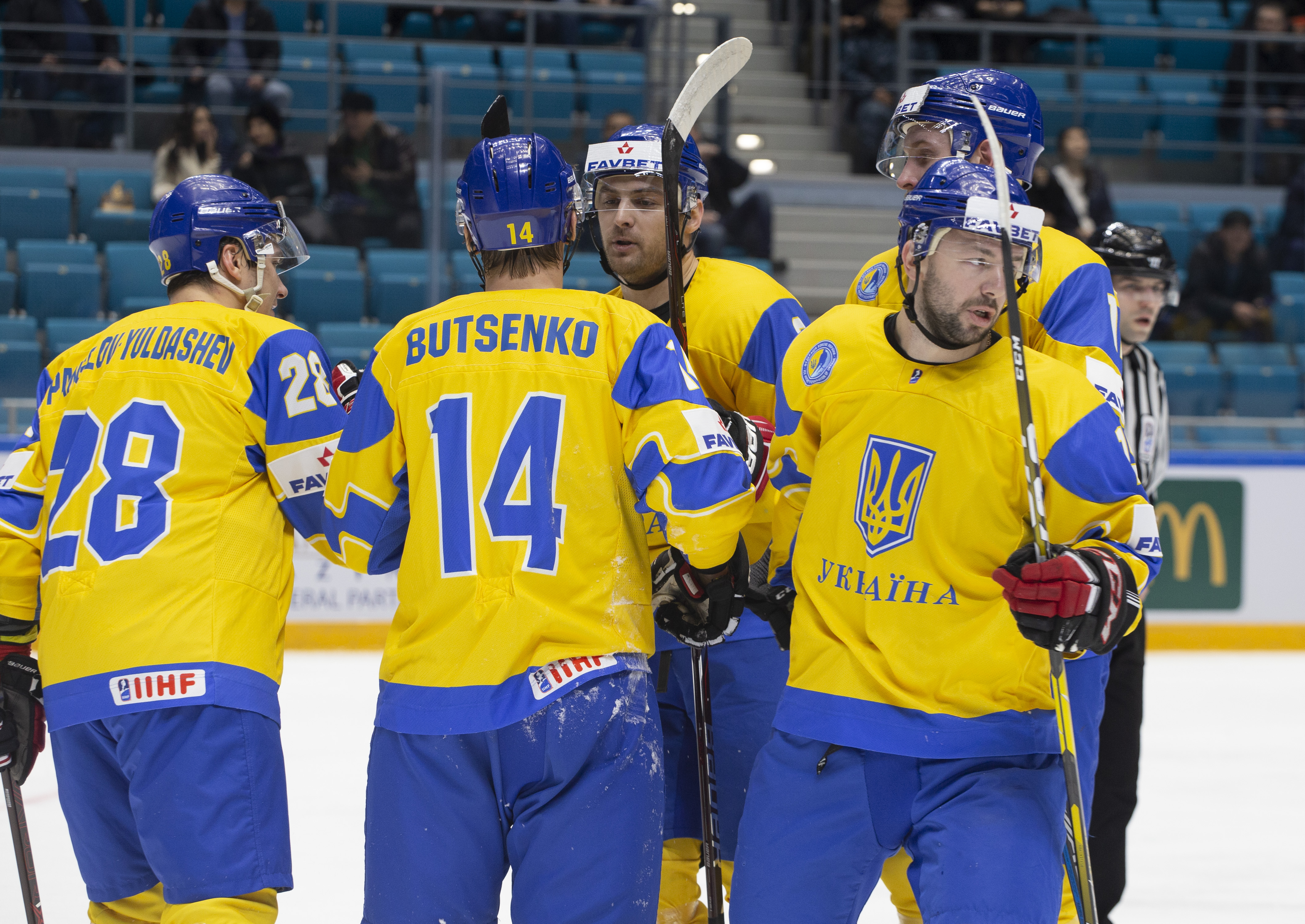 The reprieve was brief. Within a minute, Alexei Maklyukov’s point shot was tipped in by Dmitri Shevchenko. Next, Valeri Orekhov shaped to shoot before dinking a diagonal pass for Yegor Petukhov to score unmarked at the back door. And when Leonid Metalnikov fired home from the blue line, Kazakhstan had a 3-0 lead inside nine minutes. Kucher went back to the bench but the host was rampant. The speed of Kazakhstan’s passing was causing Ukraine all sorts of problems and too often players were left unguarded near the net. That enabled Curtis Valk to set up Starchenko out in front for 4-0, before Zhailauov had the crowd on its feet when he stuffed home a rebound from a Darren Dietz point shot.