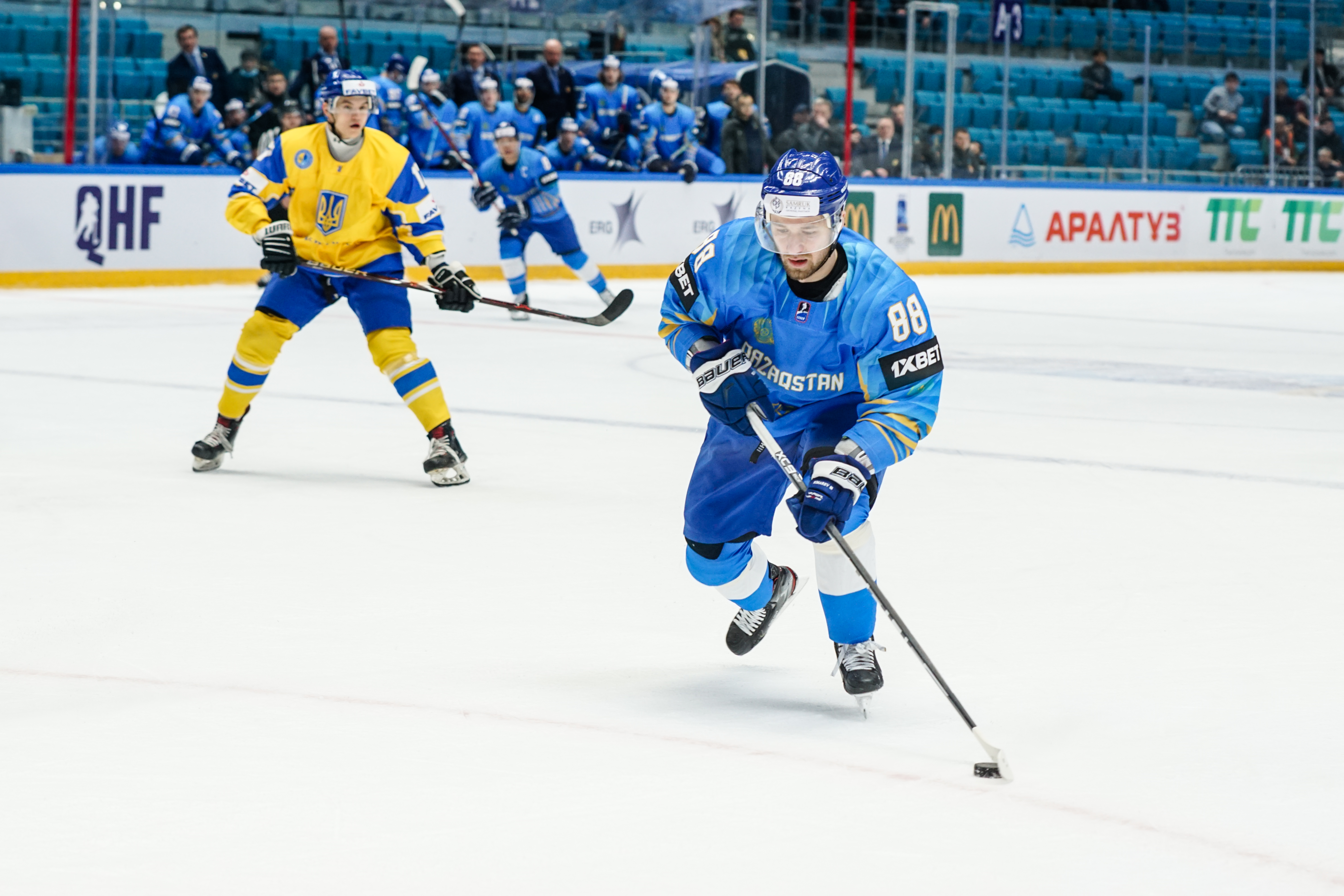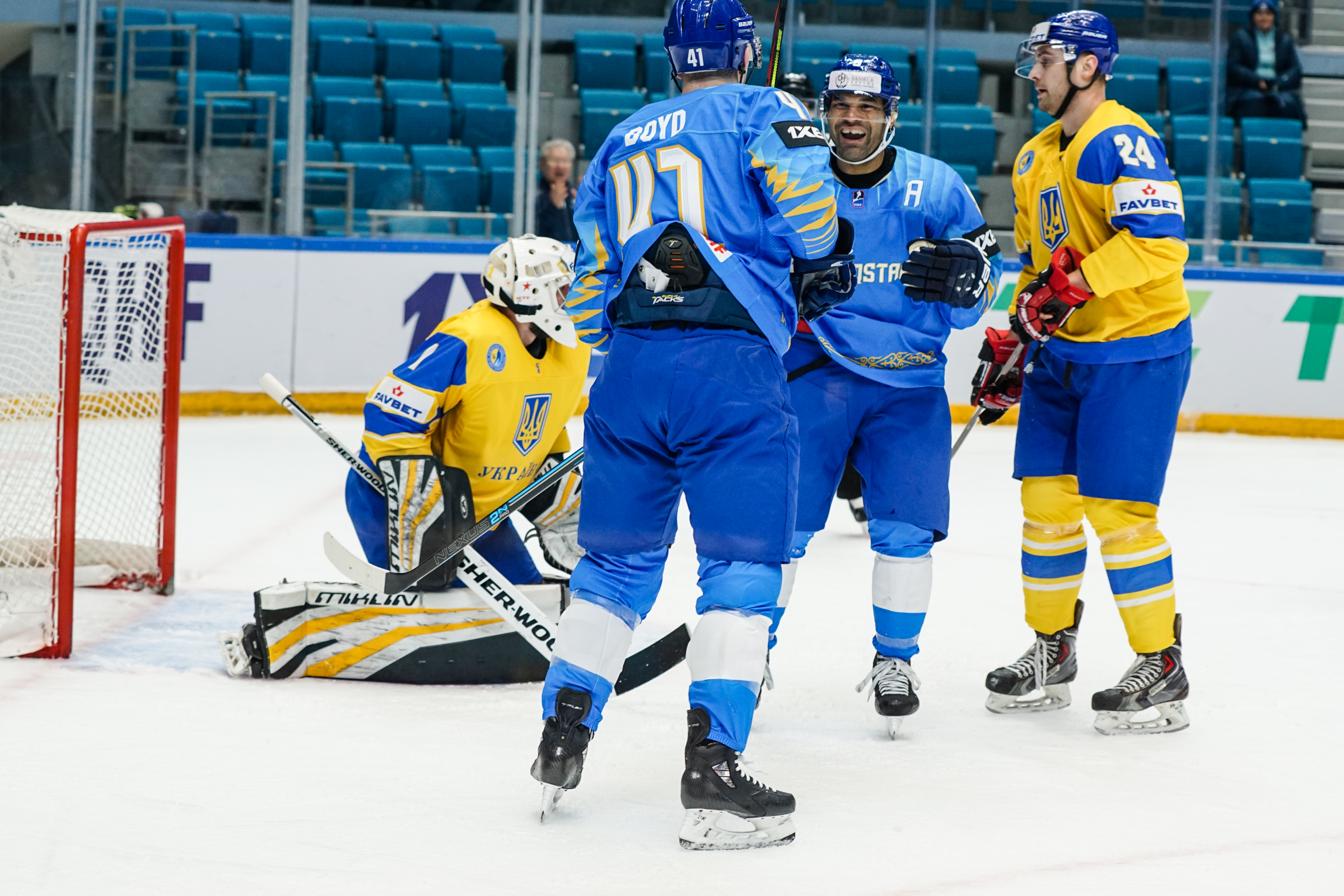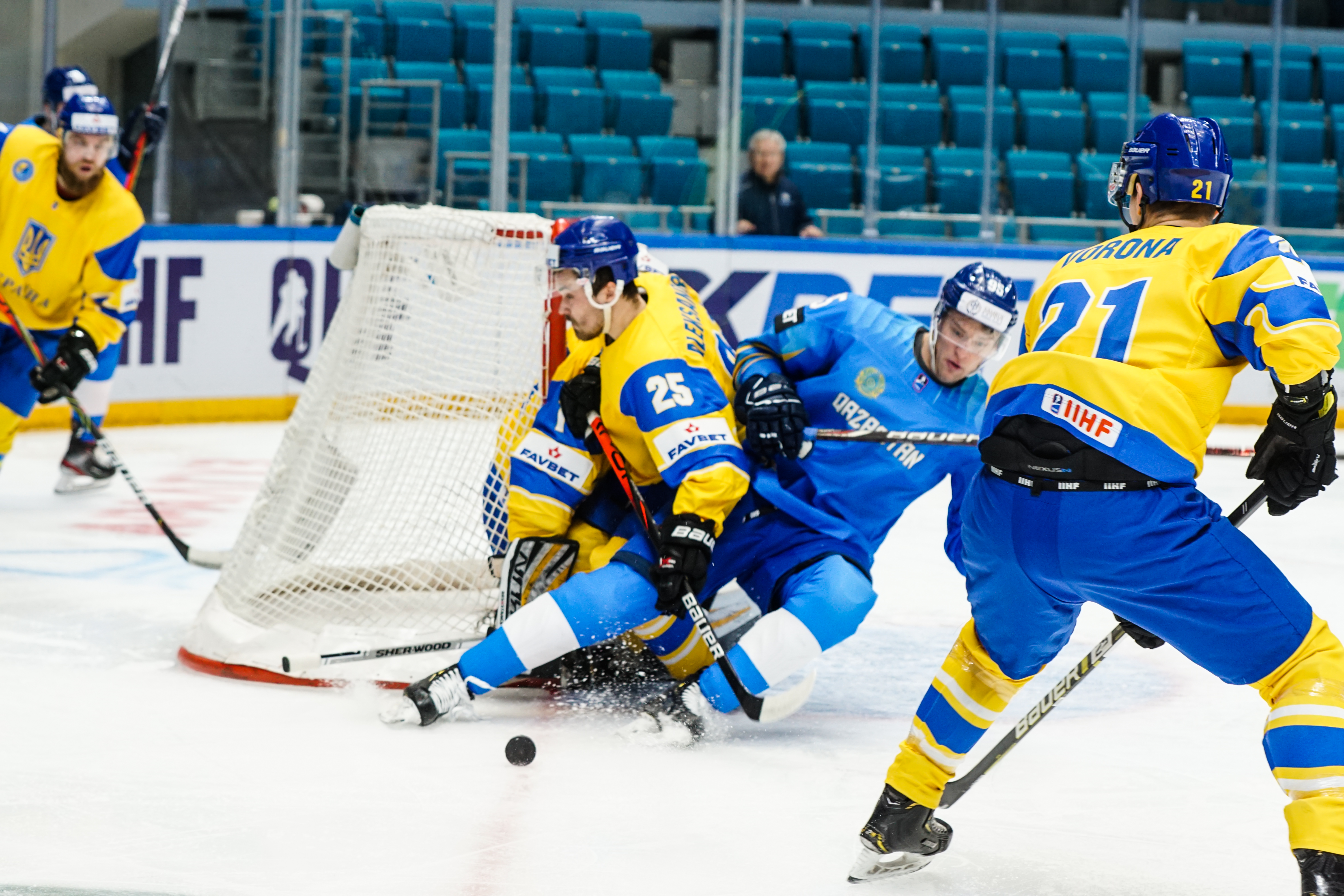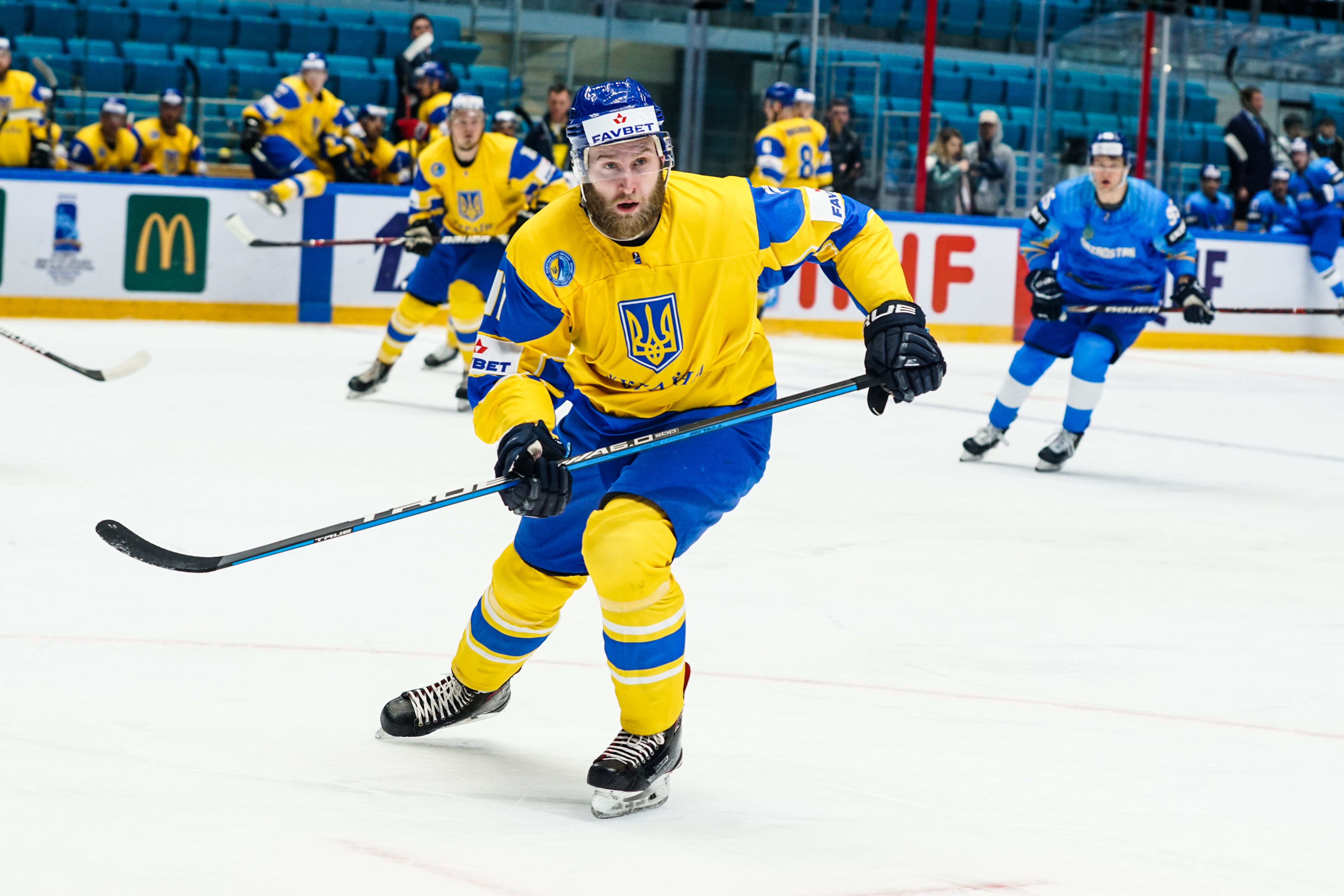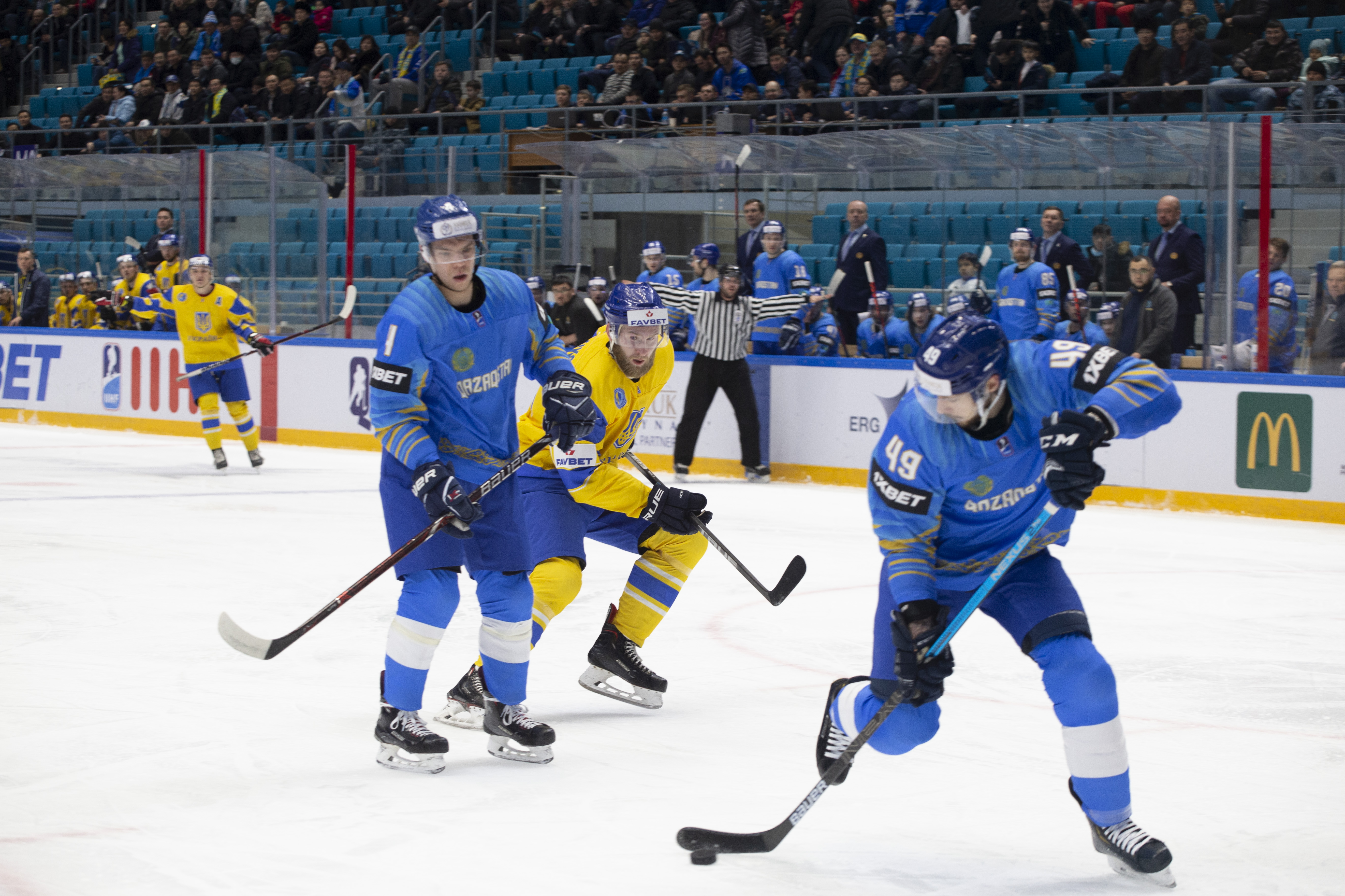 The reprieve was brief. Within a minute, Alexei Maklyukov’s point shot was tipped in by Dmitri Shevchenko. Next, Valeri Orekhov shaped to shoot before dinking a diagonal pass for Yegor Petukhov to score unmarked at the back door. And when Leonid Metalnikov fired home from the blue line, Kazakhstan had a 3-0 lead inside nine minutes. Kucher went back to the bench but the host was rampant. The speed of Kazakhstan’s passing was causing Ukraine all sorts of problems and too often players were left unguarded near the net. That enabled Curtis Valk to set up Starchenko out in front for 4-0, before Zhailauov had the crowd on its feet when he stuffed home a rebound from a Darren Dietz point shot.