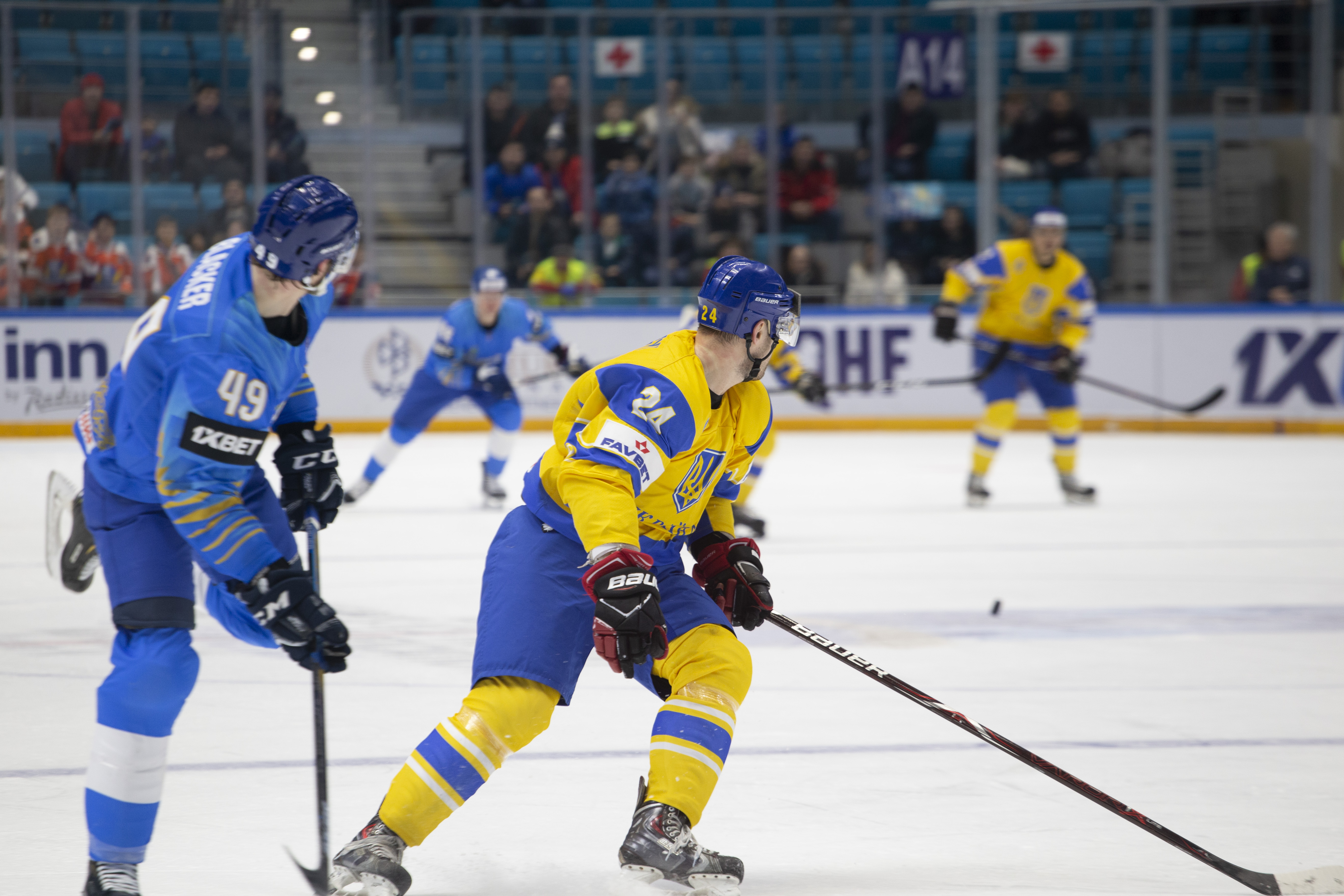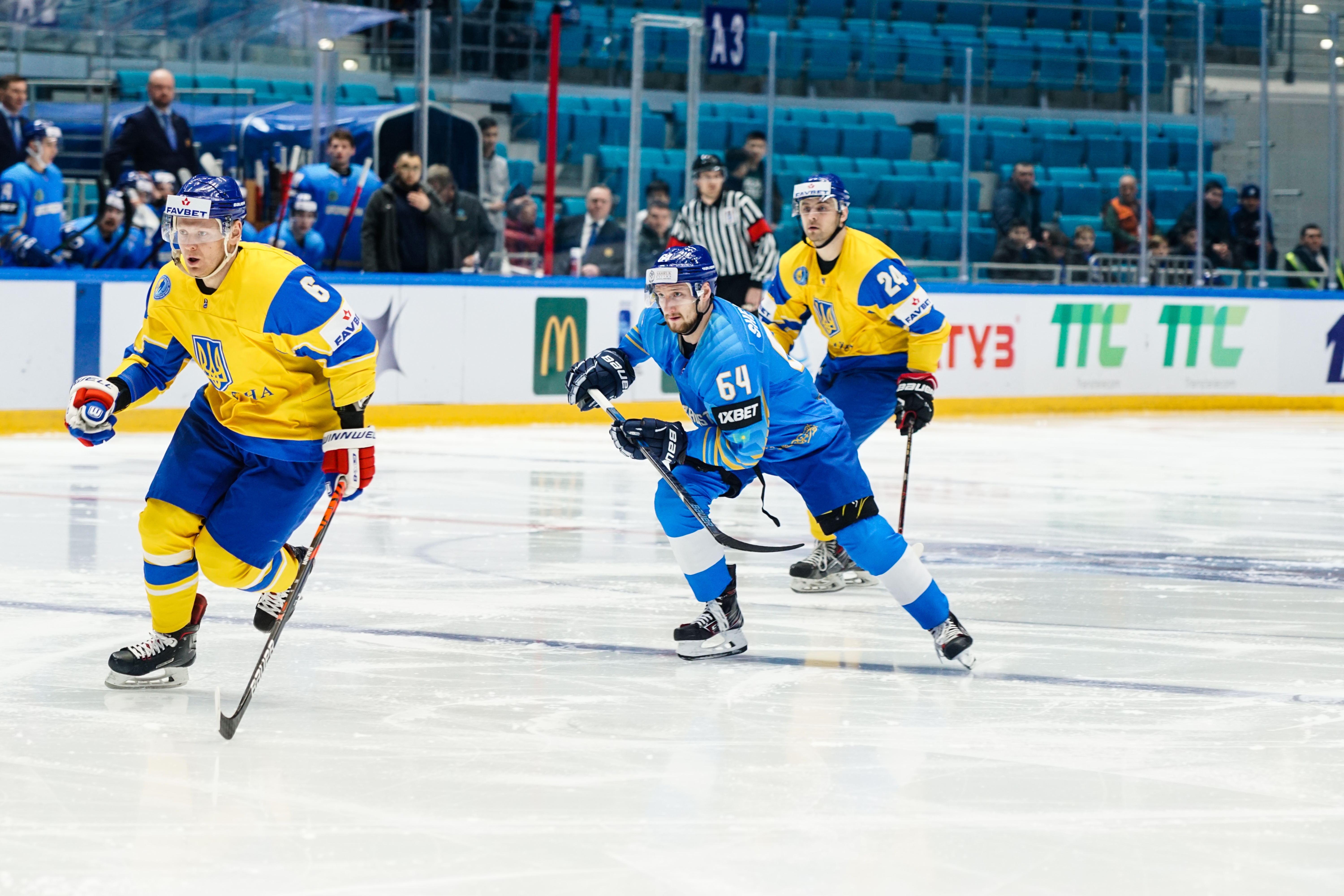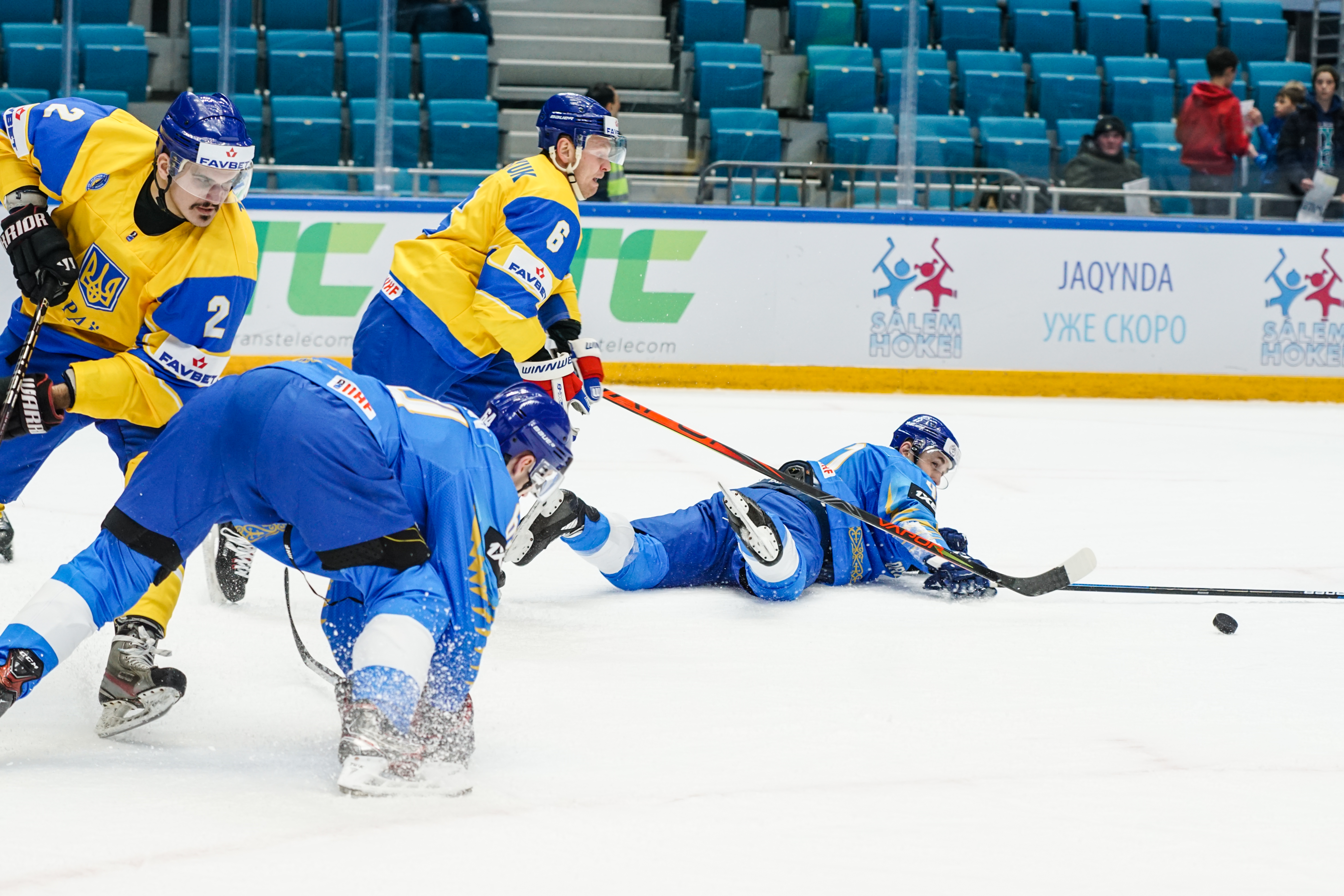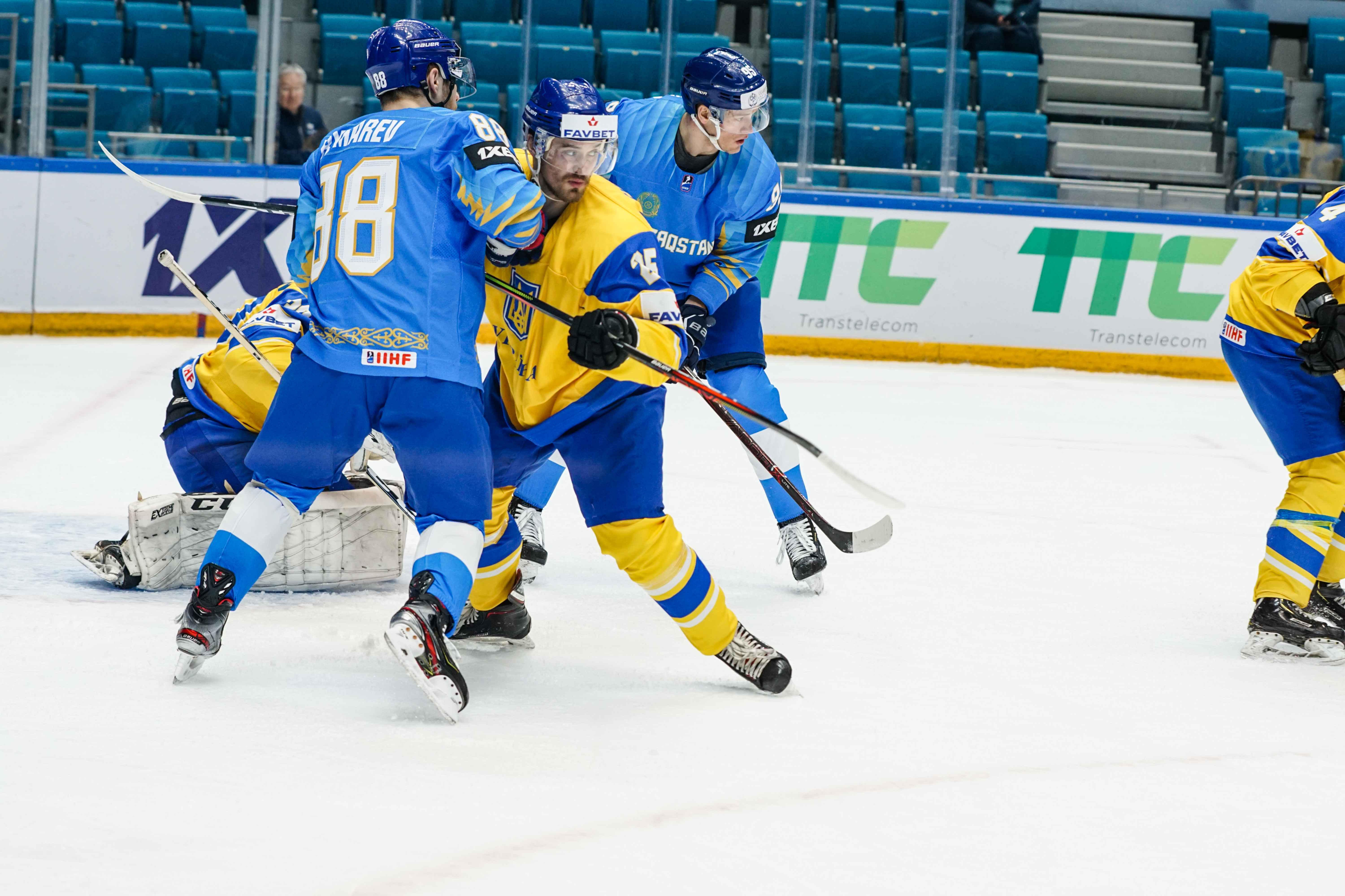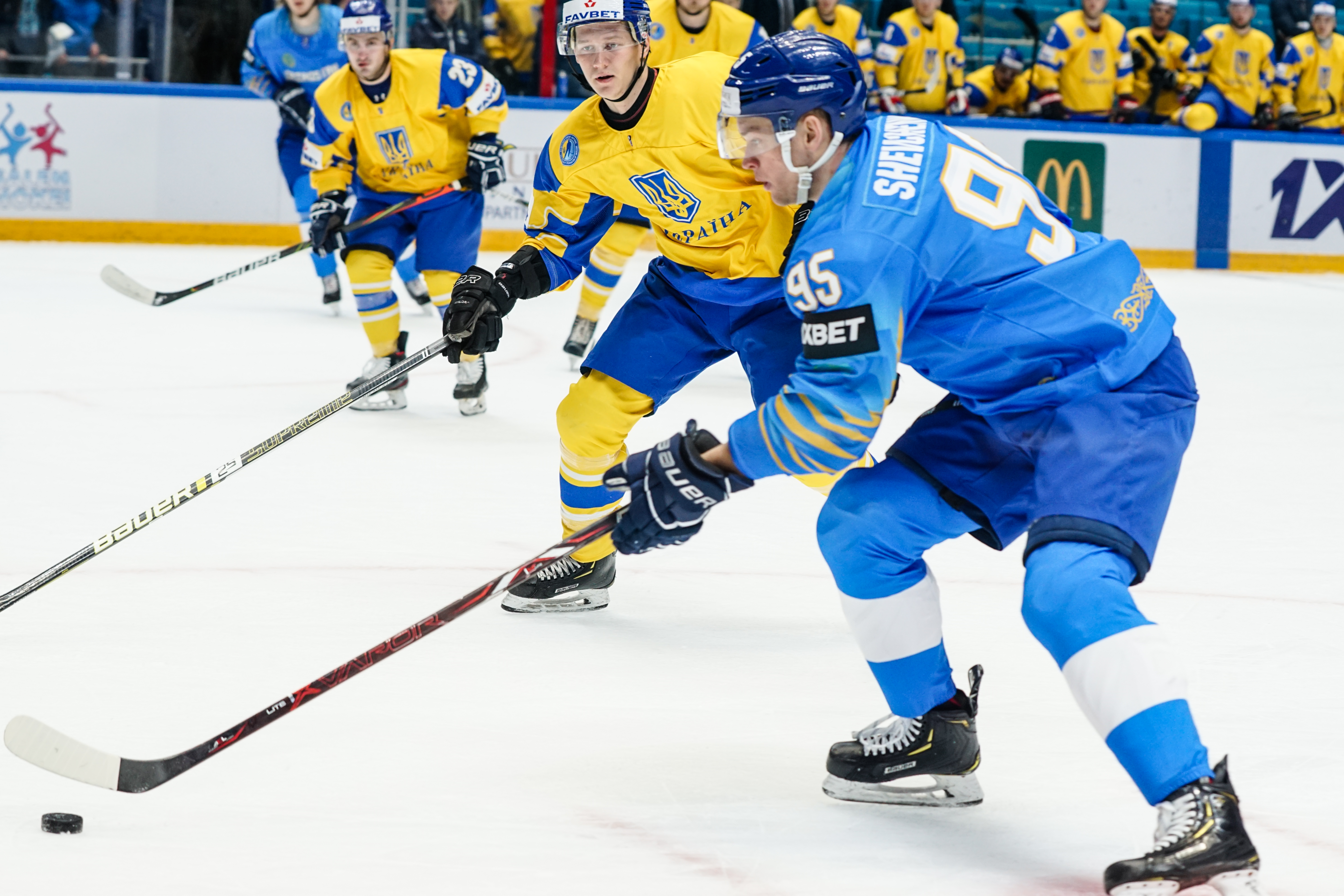 The reprieve was brief. Within a minute, Alexei Maklyukov’s point shot was tipped in by Dmitri Shevchenko. Next, Valeri Orekhov shaped to shoot before dinking a diagonal pass for Yegor Petukhov to score unmarked at the back door. And when Leonid Metalnikov fired home from the blue line, Kazakhstan had a 3-0 lead inside nine minutes. Kucher went back to the bench but the host was rampant. The speed of Kazakhstan’s passing was causing Ukraine all sorts of problems and too often players were left unguarded near the net. That enabled Curtis Valk to set up Starchenko out in front for 4-0, before Zhailauov had the crowd on its feet when he stuffed home a rebound from a Darren Dietz point shot.