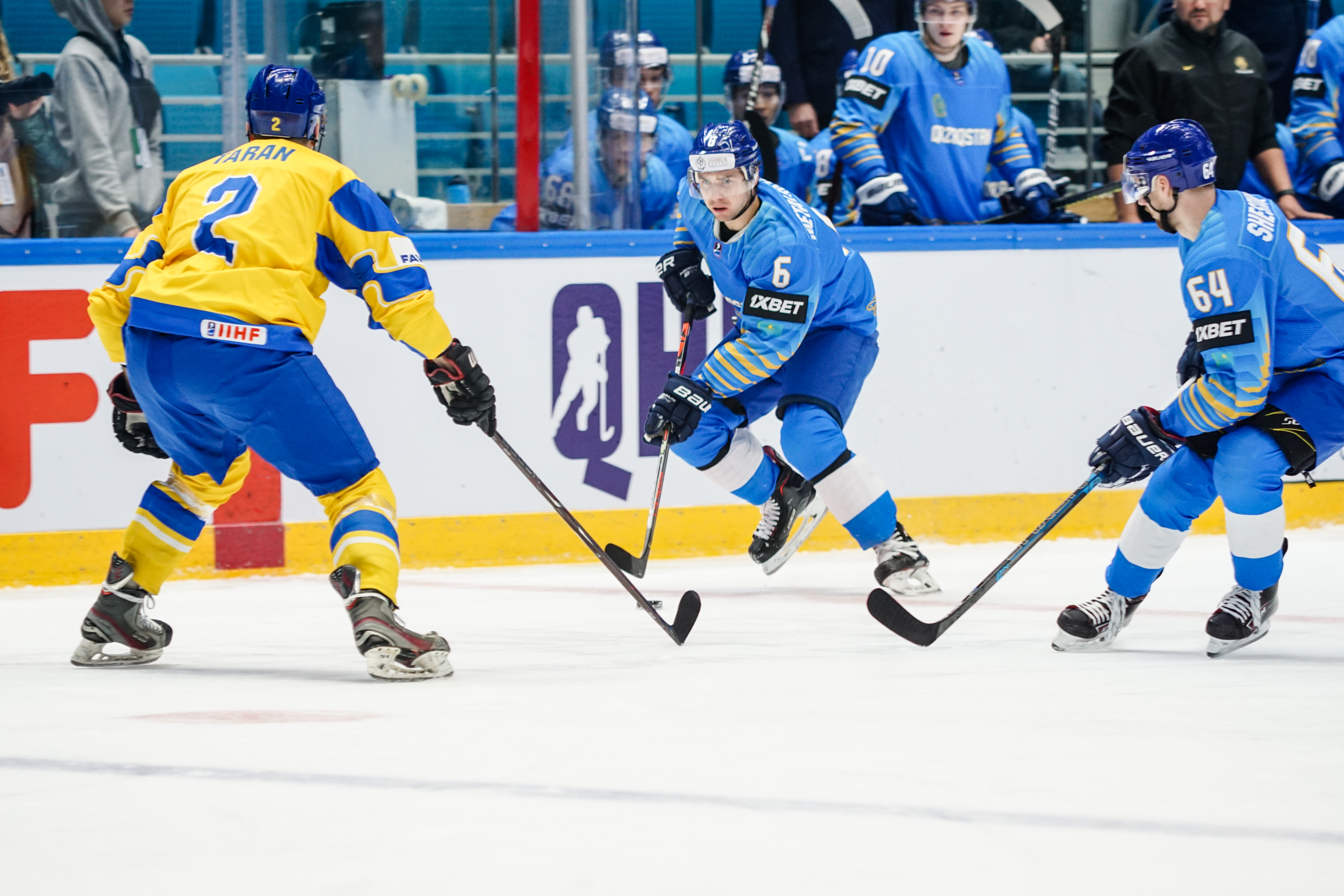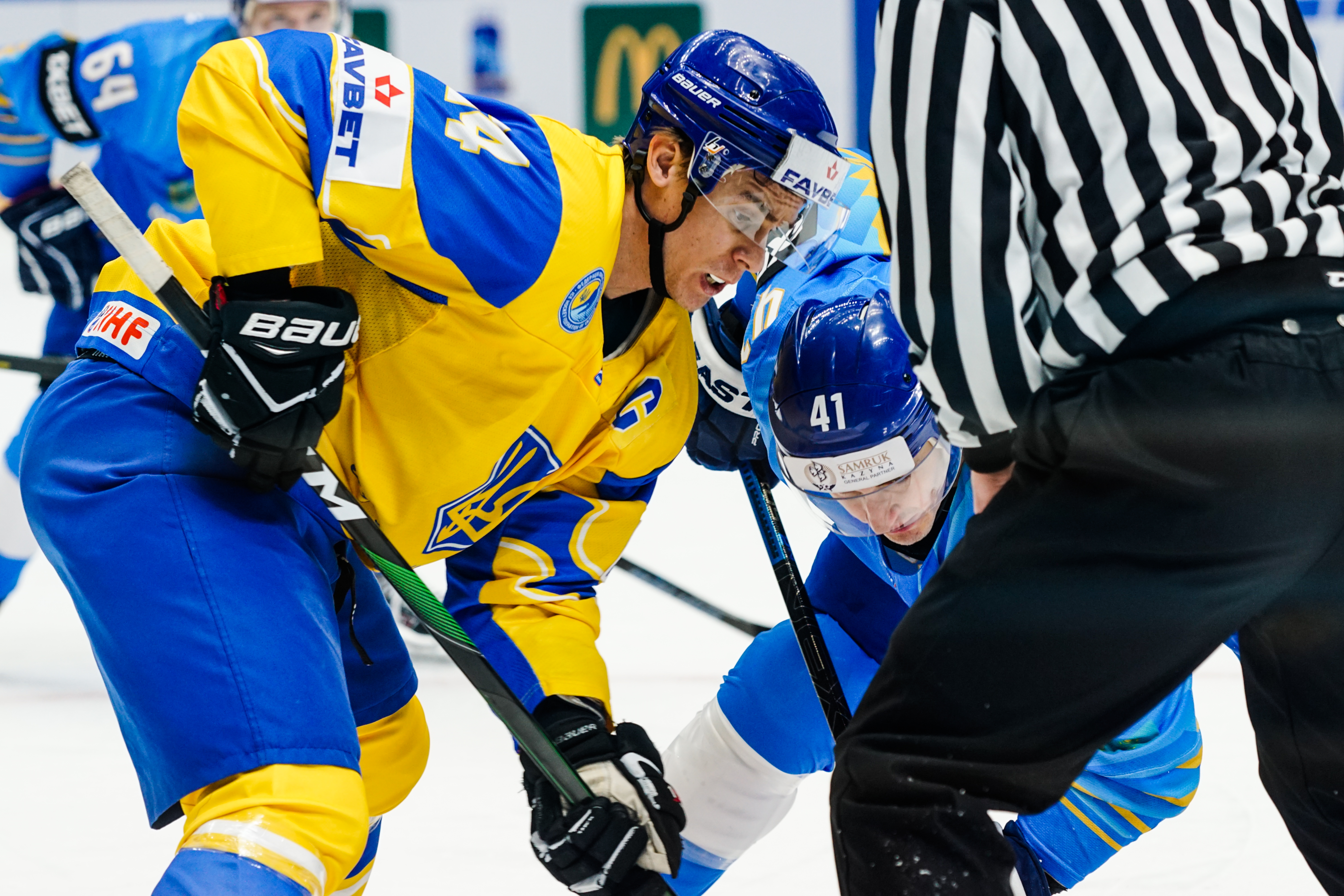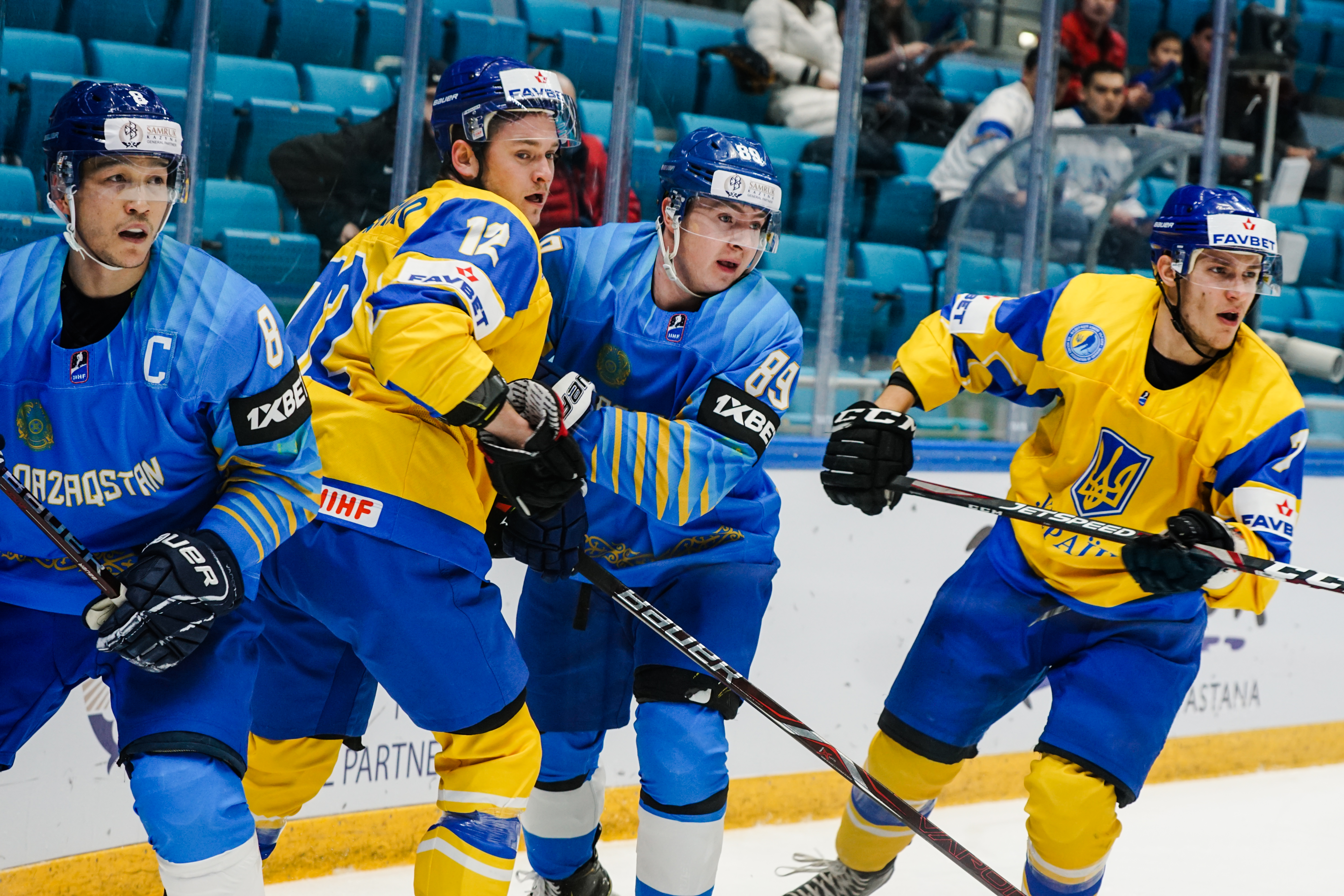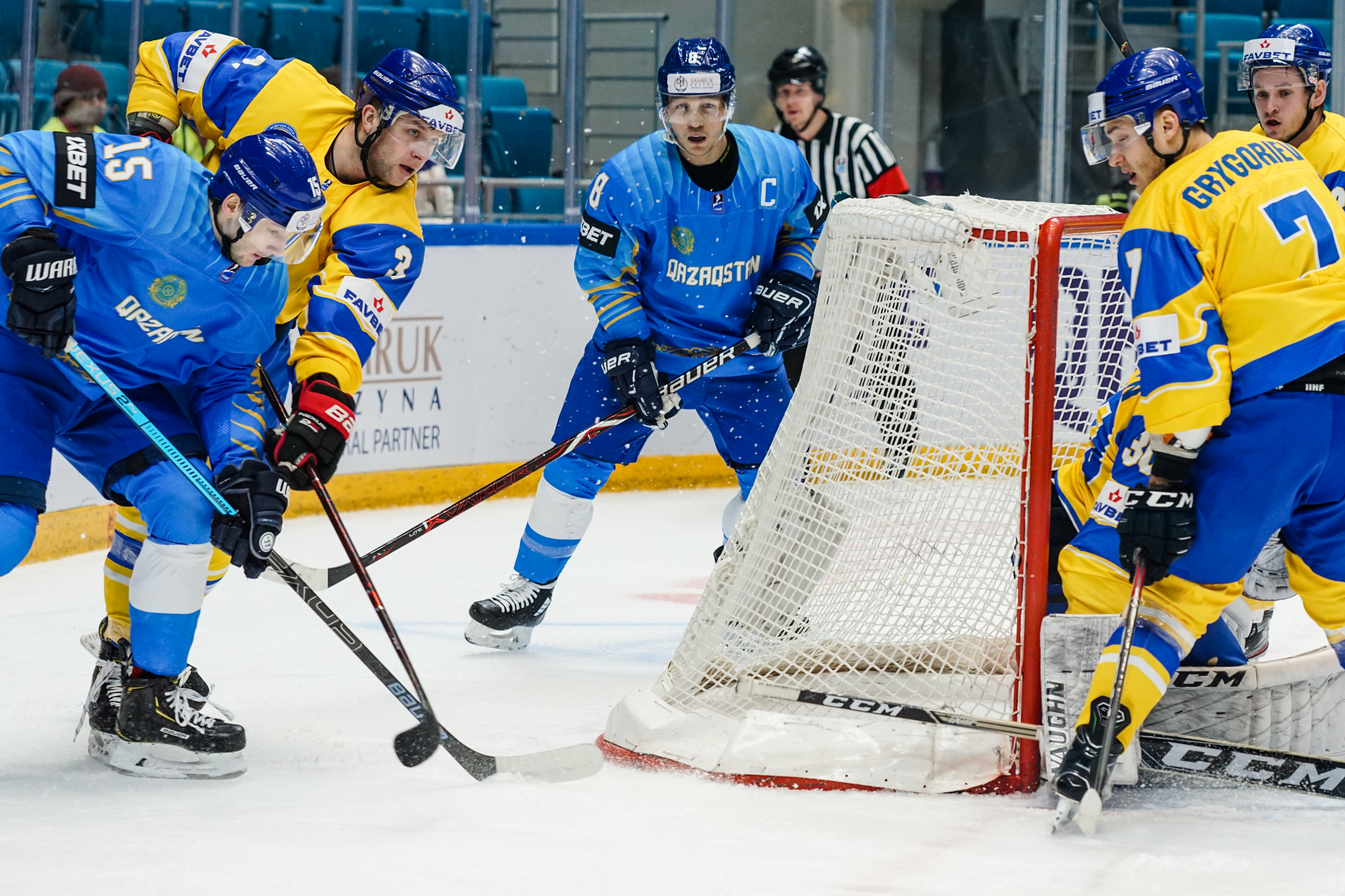 The reprieve was brief. Within a minute, Alexei Maklyukov’s point shot was tipped in by Dmitri Shevchenko. Next, Valeri Orekhov shaped to shoot before dinking a diagonal pass for Yegor Petukhov to score unmarked at the back door. And when Leonid Metalnikov fired home from the blue line, Kazakhstan had a 3-0 lead inside nine minutes. Kucher went back to the bench but the host was rampant. The speed of Kazakhstan’s passing was causing Ukraine all sorts of problems and too often players were left unguarded near the net. That enabled Curtis Valk to set up Starchenko out in front for 4-0, before Zhailauov had the crowd on its feet when he stuffed home a rebound from a Darren Dietz point shot.
