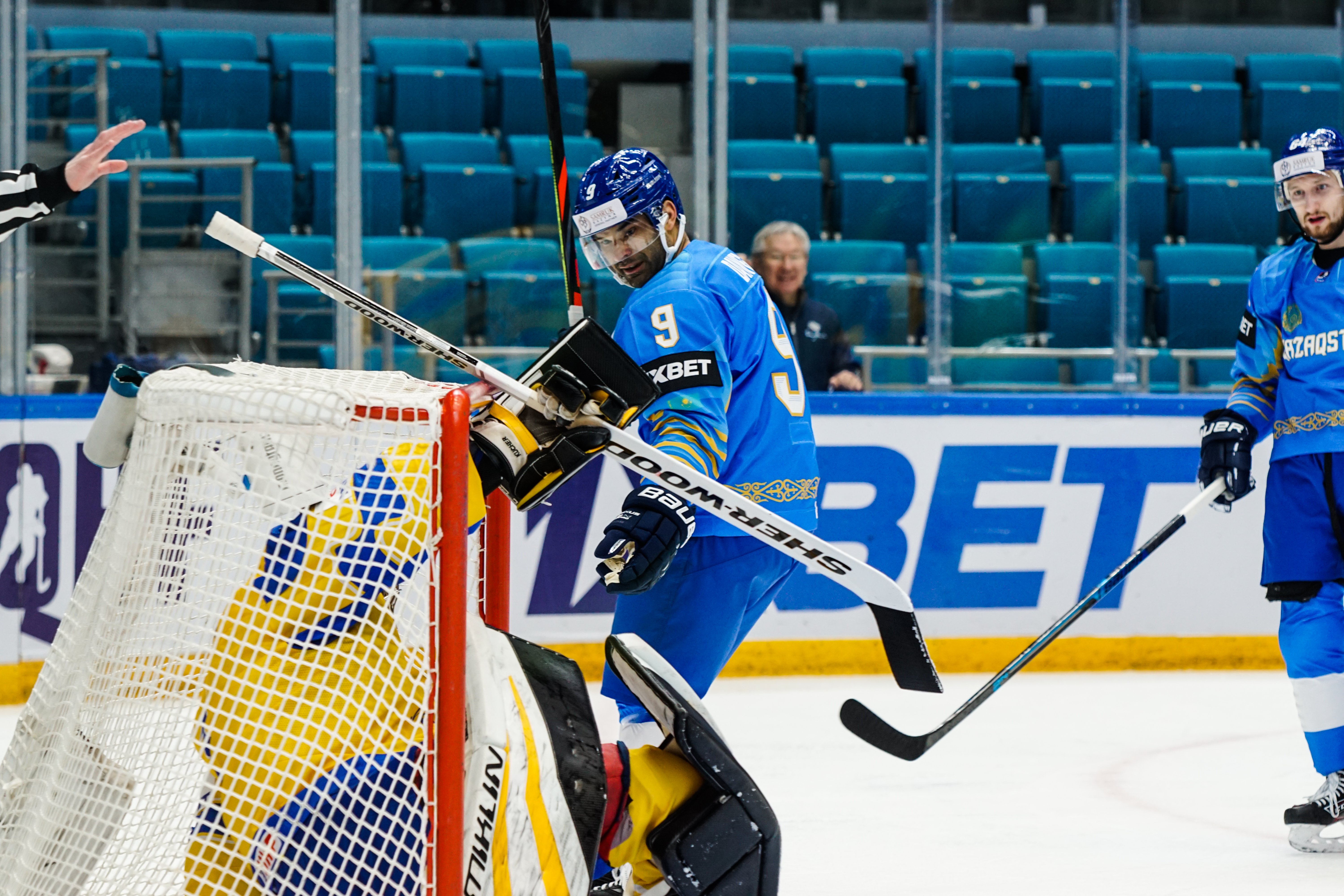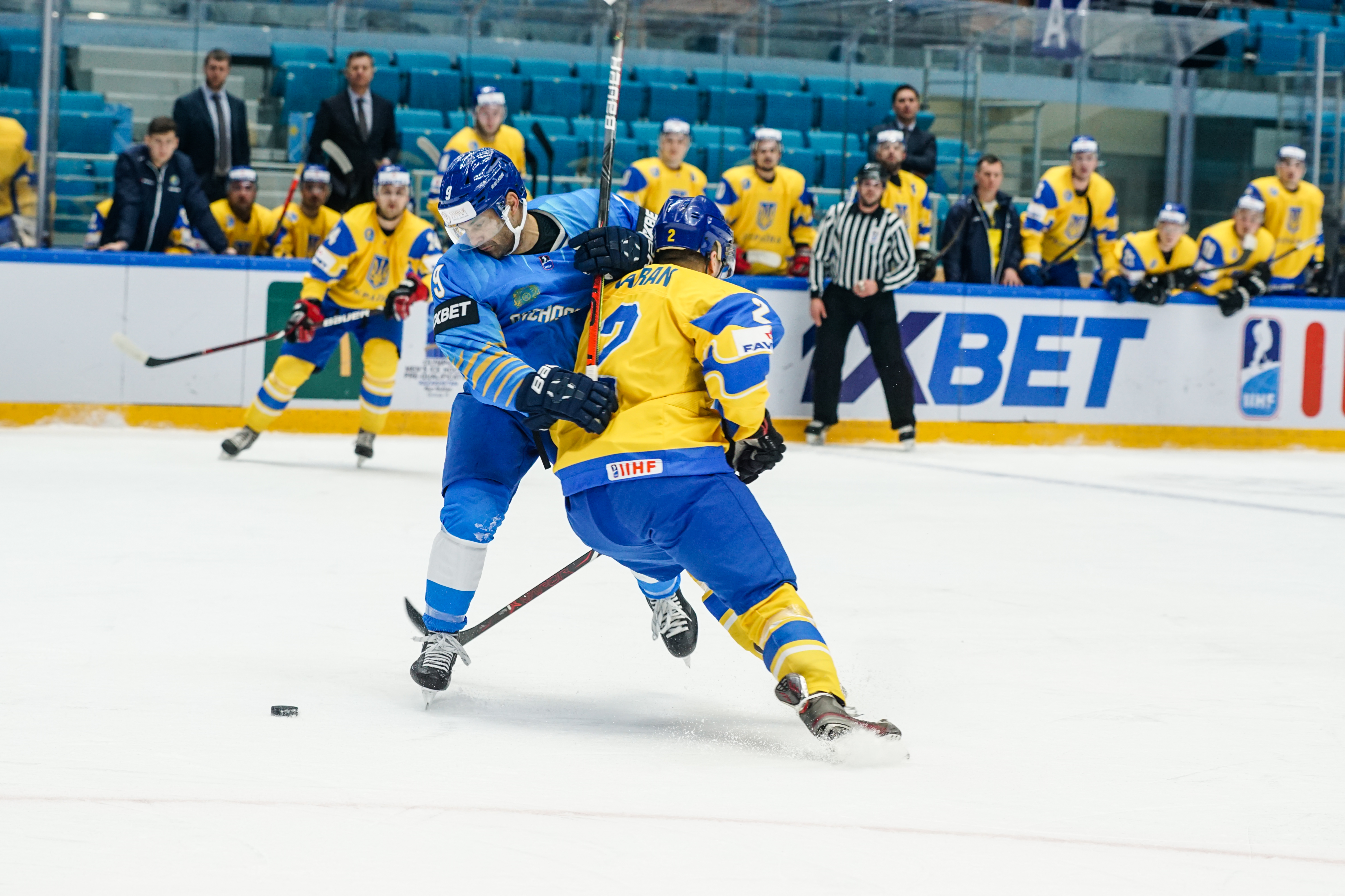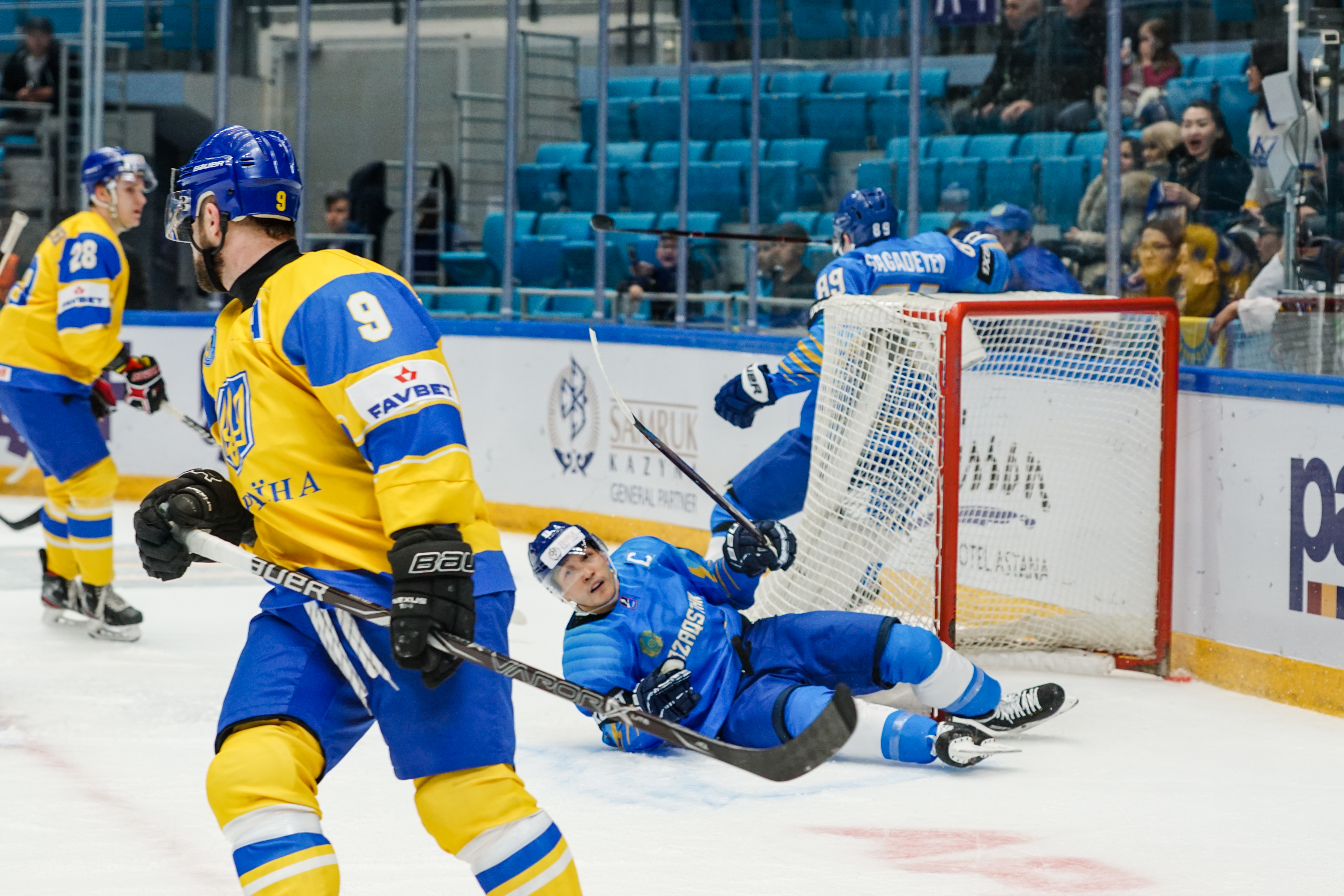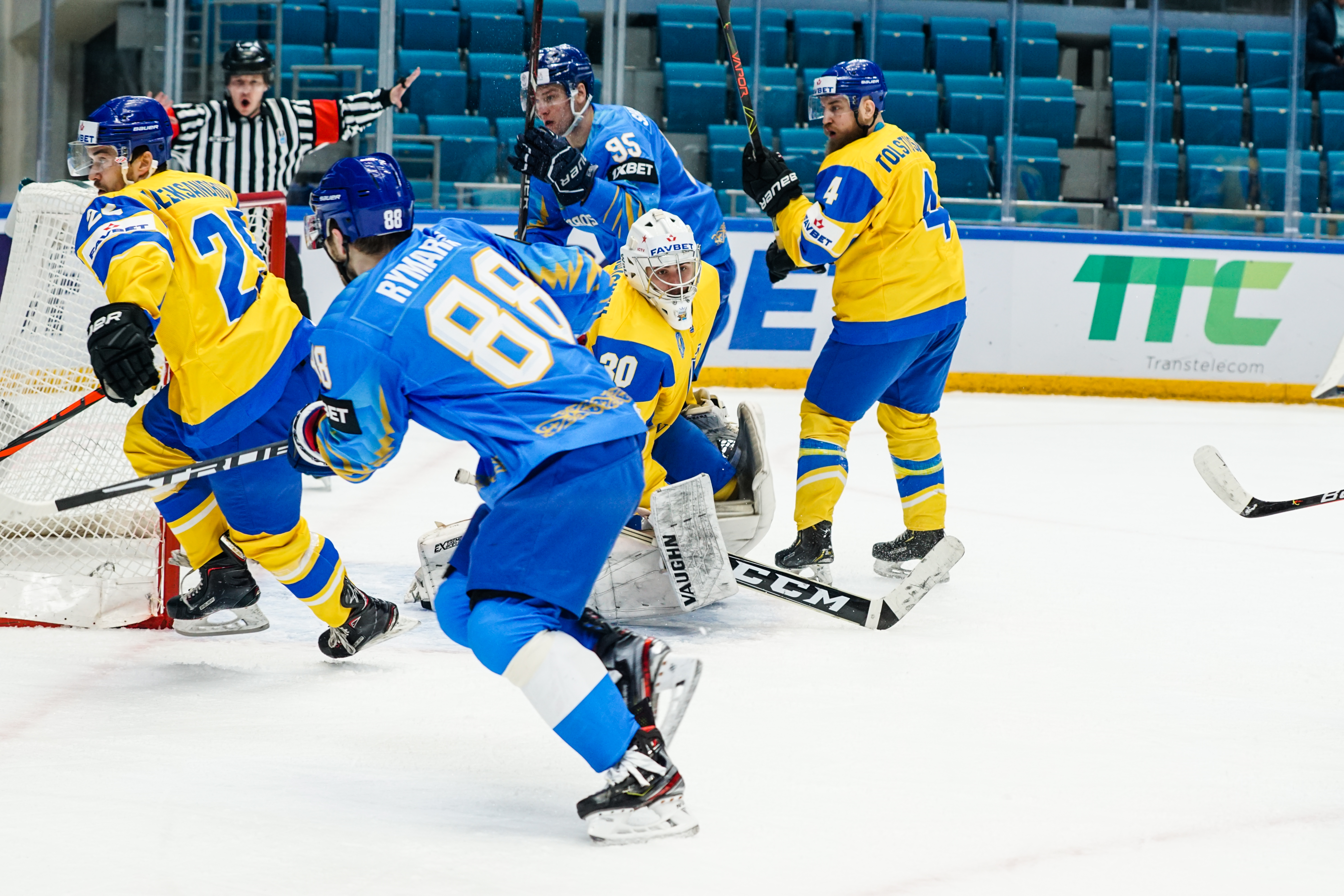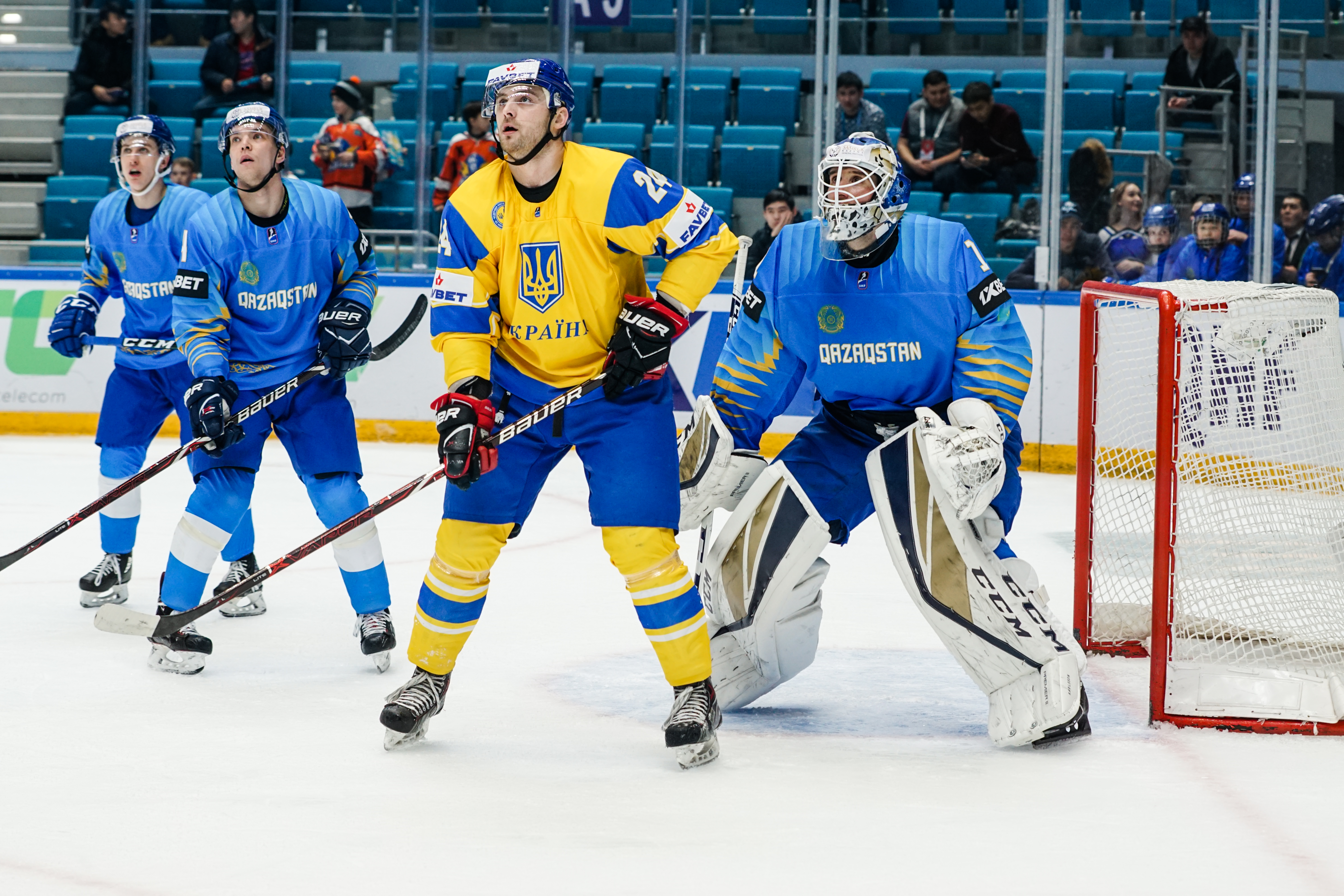 The reprieve was brief. Within a minute, Alexei Maklyukov’s point shot was tipped in by Dmitri Shevchenko. Next, Valeri Orekhov shaped to shoot before dinking a diagonal pass for Yegor Petukhov to score unmarked at the back door. And when Leonid Metalnikov fired home from the blue line, Kazakhstan had a 3-0 lead inside nine minutes. Kucher went back to the bench but the host was rampant. The speed of Kazakhstan’s passing was causing Ukraine all sorts of problems and too often players were left unguarded near the net. That enabled Curtis Valk to set up Starchenko out in front for 4-0, before Zhailauov had the crowd on its feet when he stuffed home a rebound from a Darren Dietz point shot.