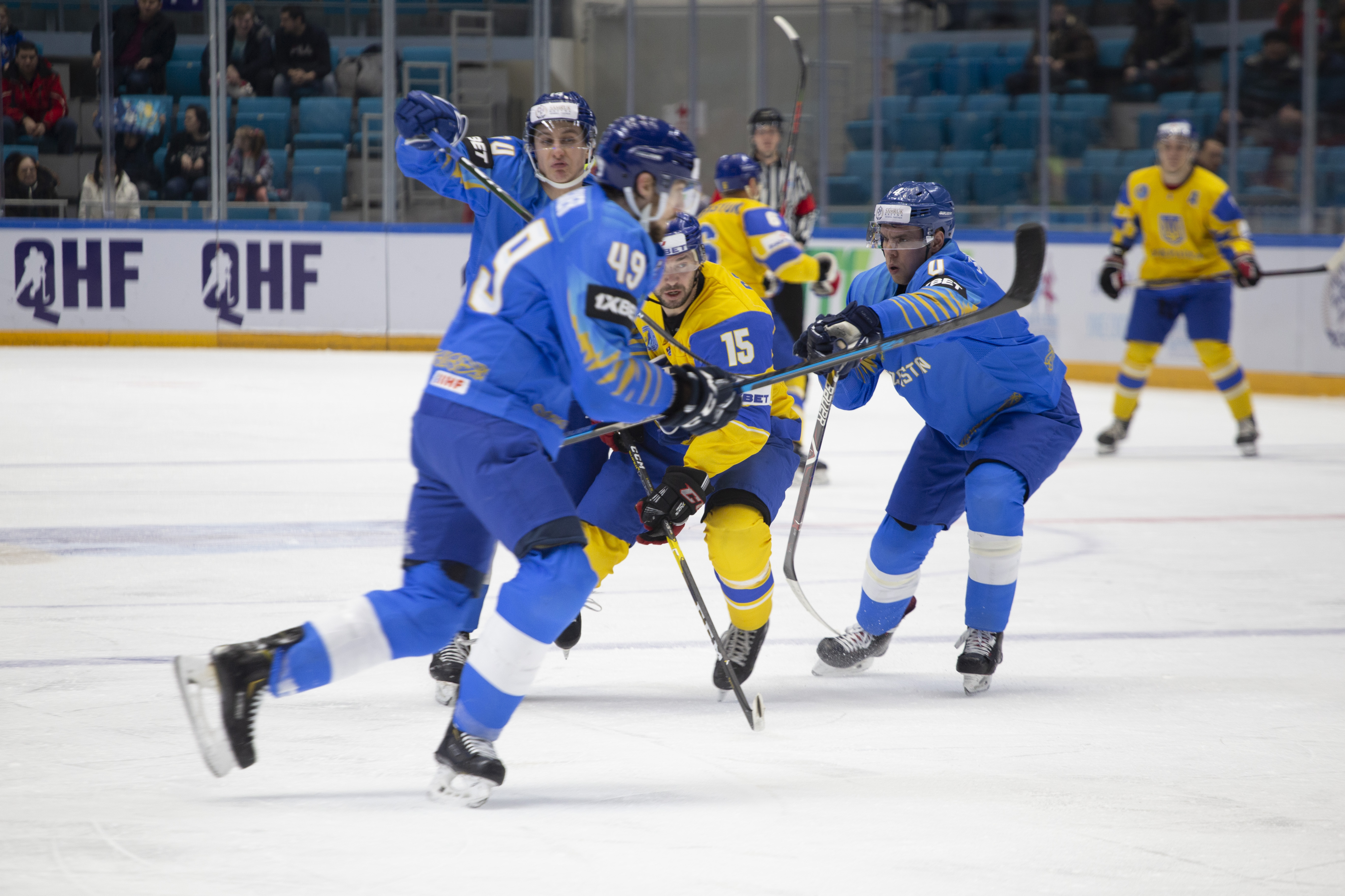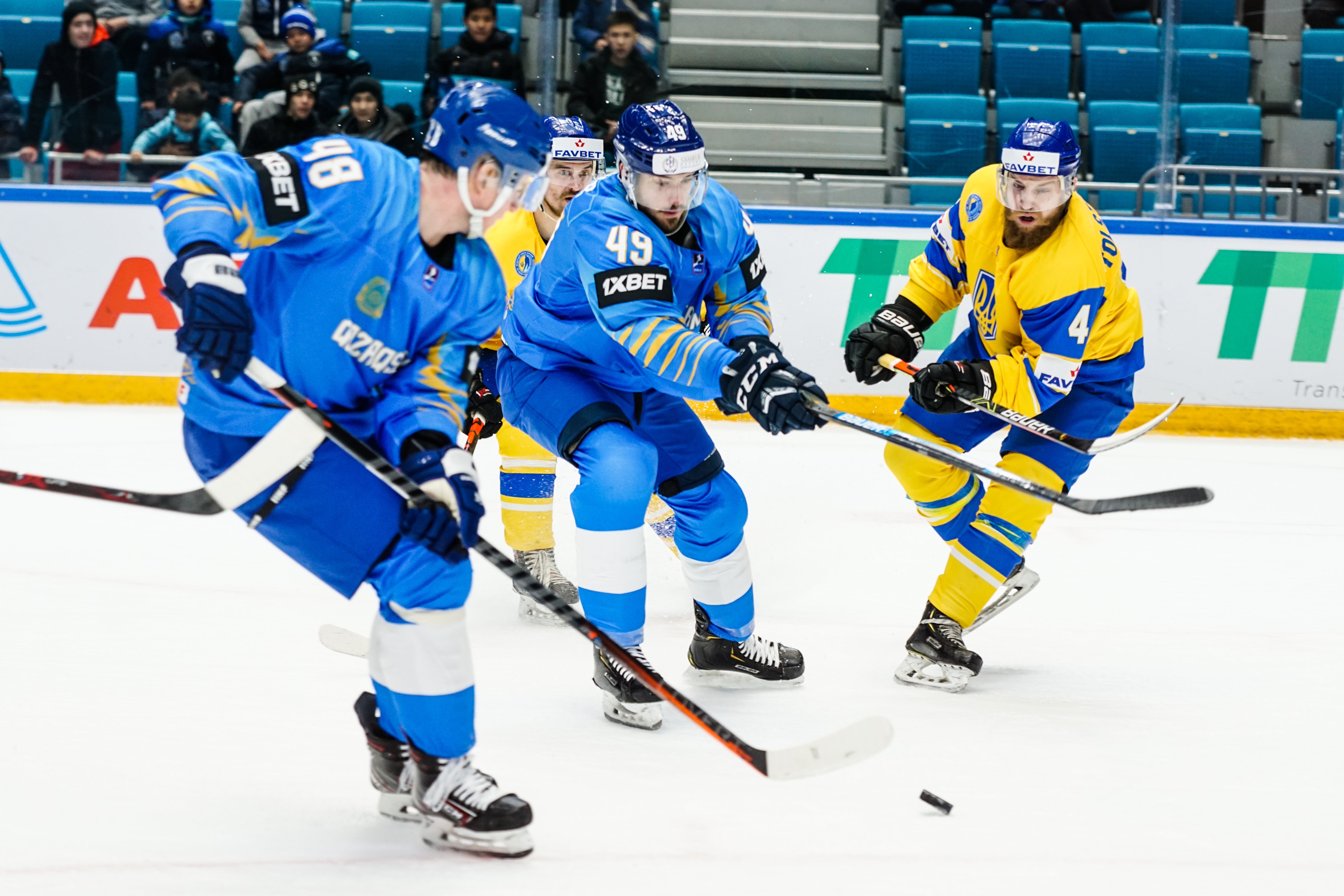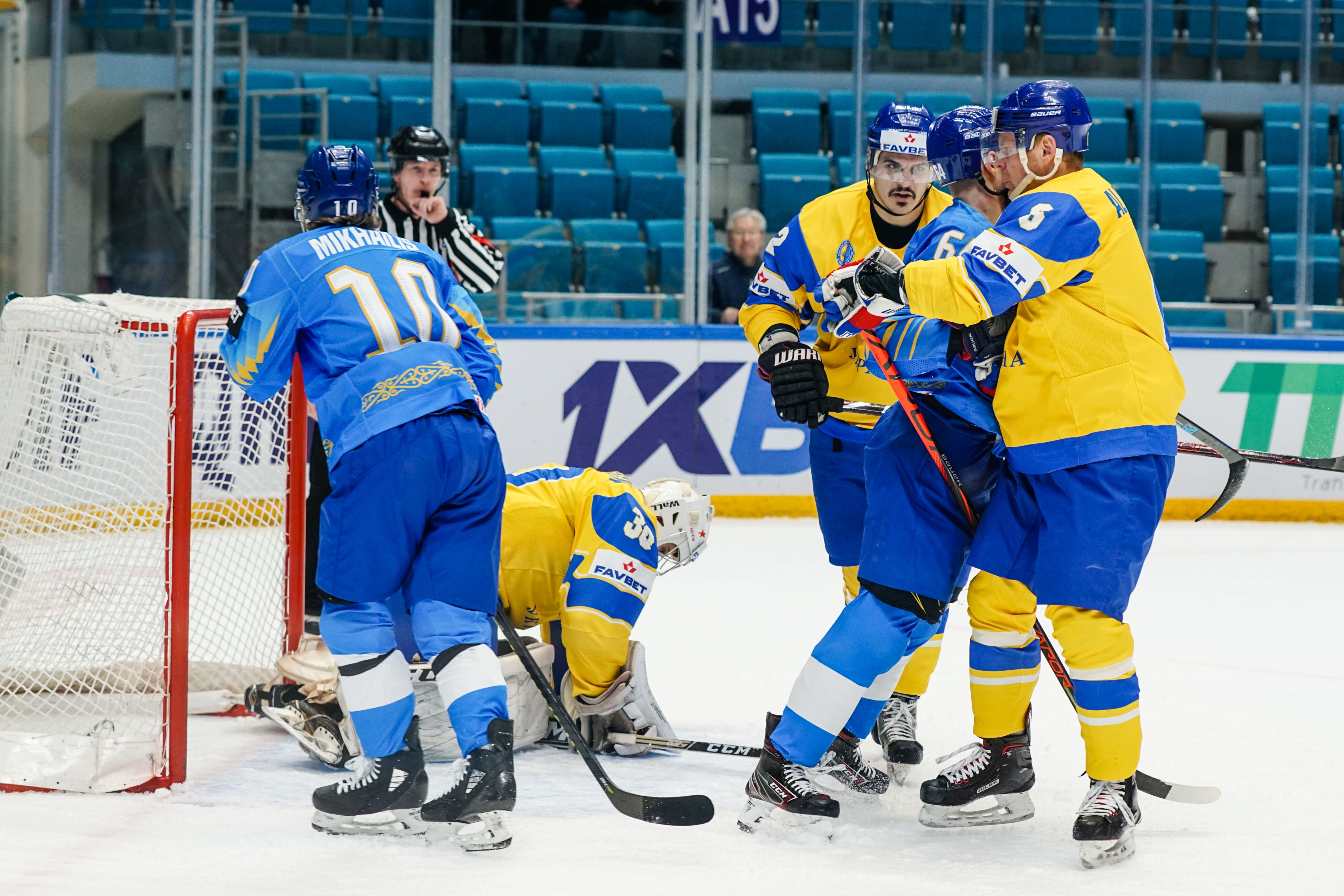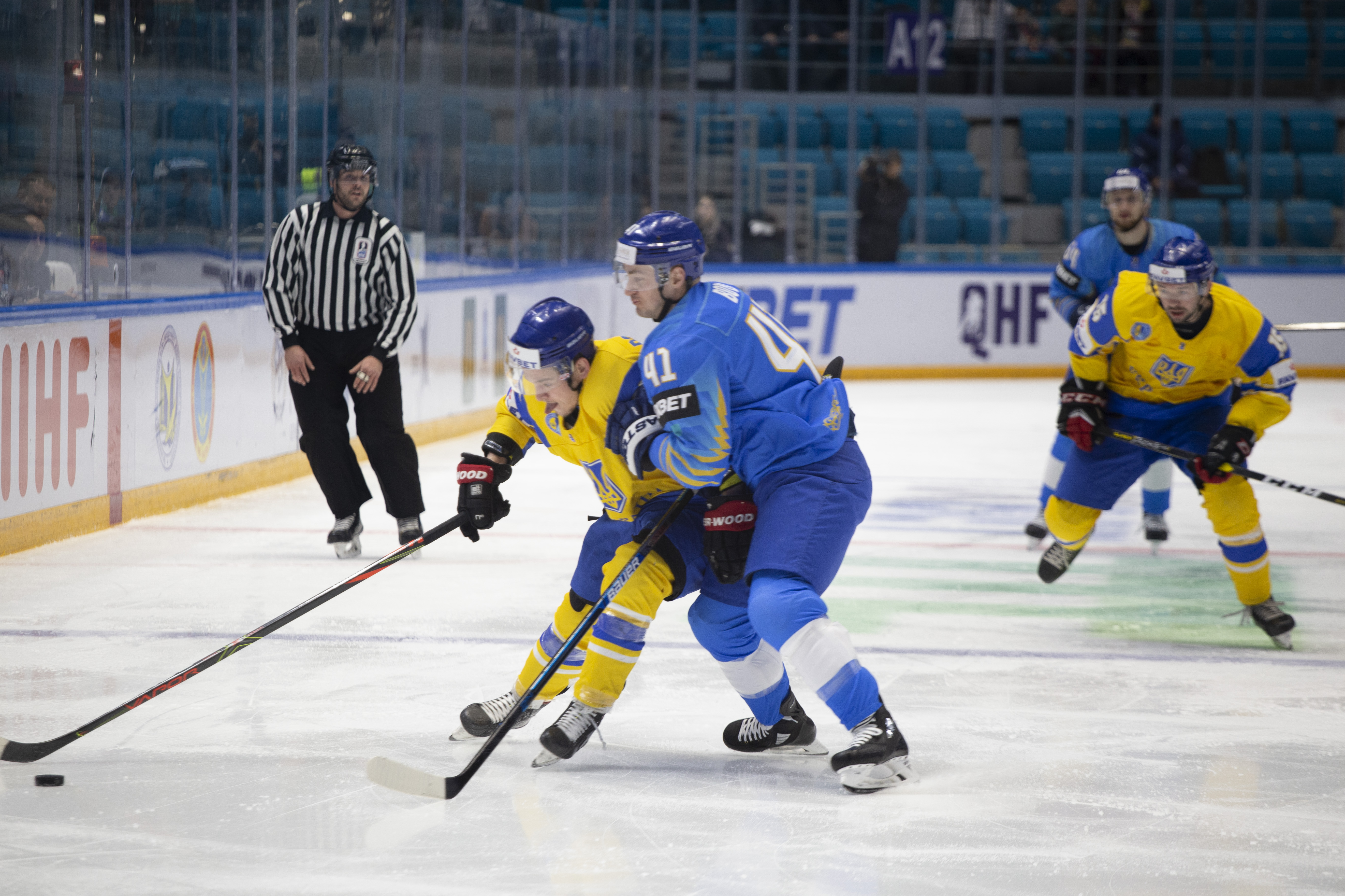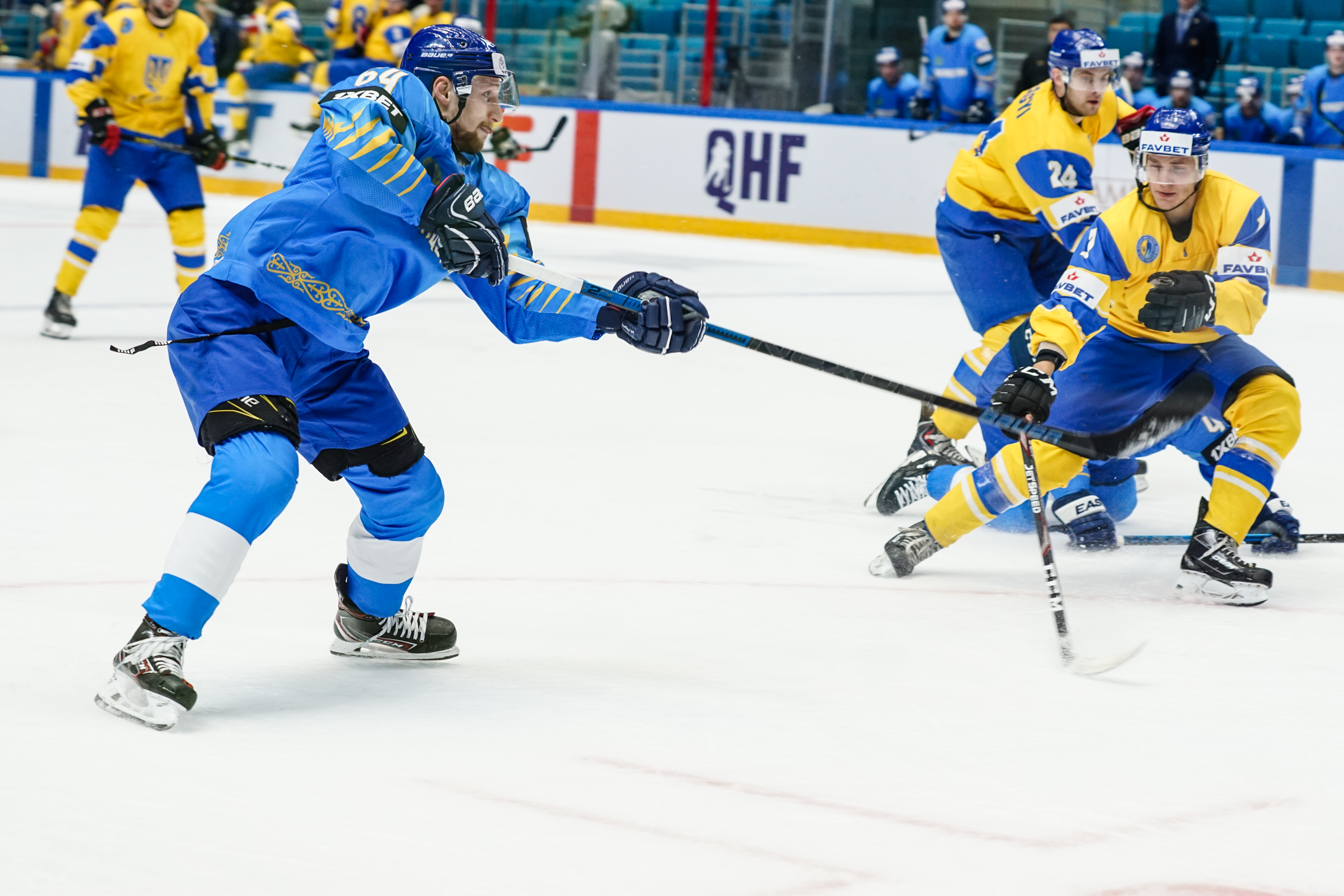 The reprieve was brief. Within a minute, Alexei Maklyukov’s point shot was tipped in by Dmitri Shevchenko. Next, Valeri Orekhov shaped to shoot before dinking a diagonal pass for Yegor Petukhov to score unmarked at the back door. And when Leonid Metalnikov fired home from the blue line, Kazakhstan had a 3-0 lead inside nine minutes. Kucher went back to the bench but the host was rampant. The speed of Kazakhstan’s passing was causing Ukraine all sorts of problems and too often players were left unguarded near the net. That enabled Curtis Valk to set up Starchenko out in front for 4-0, before Zhailauov had the crowd on its feet when he stuffed home a rebound from a Darren Dietz point shot.
