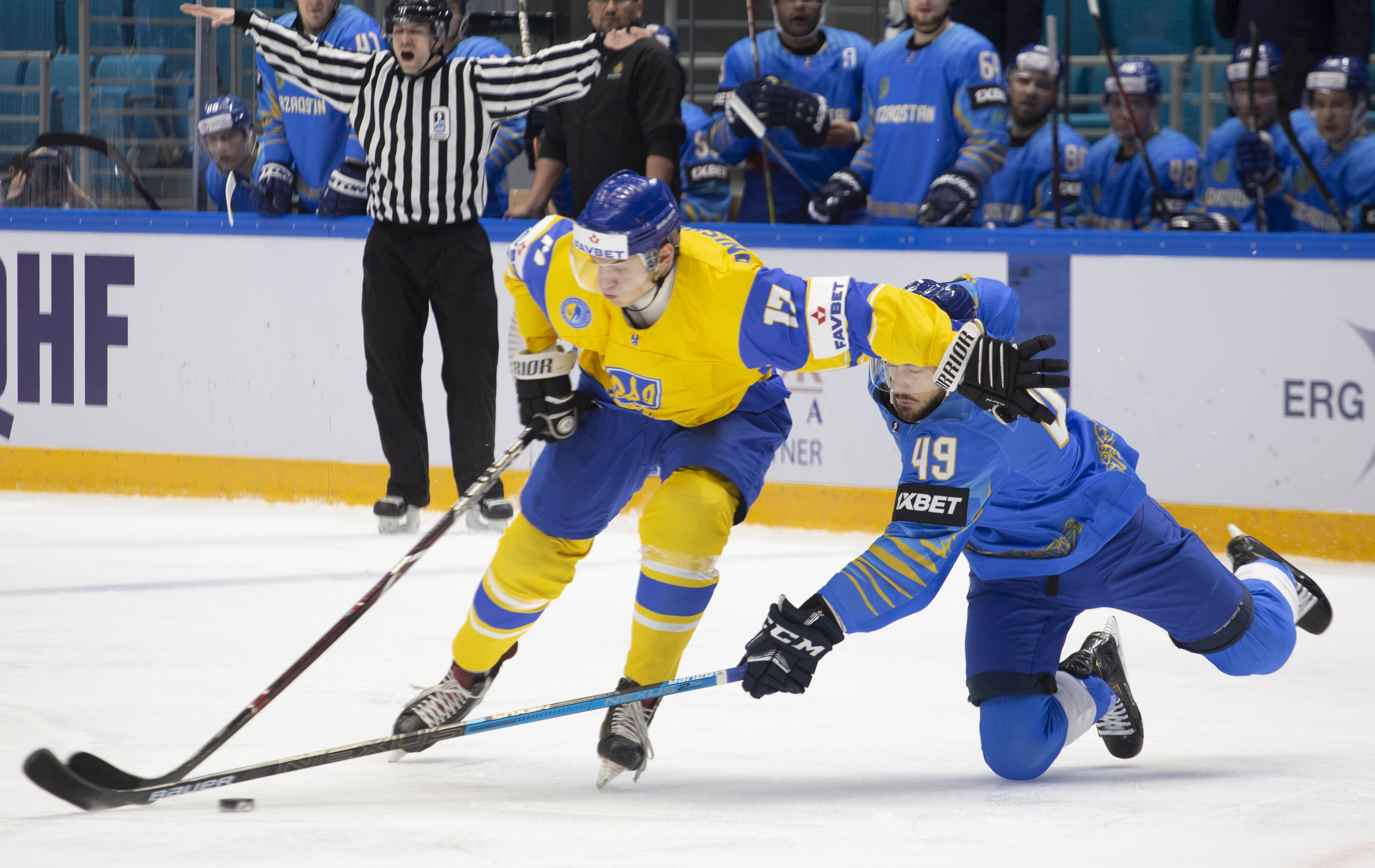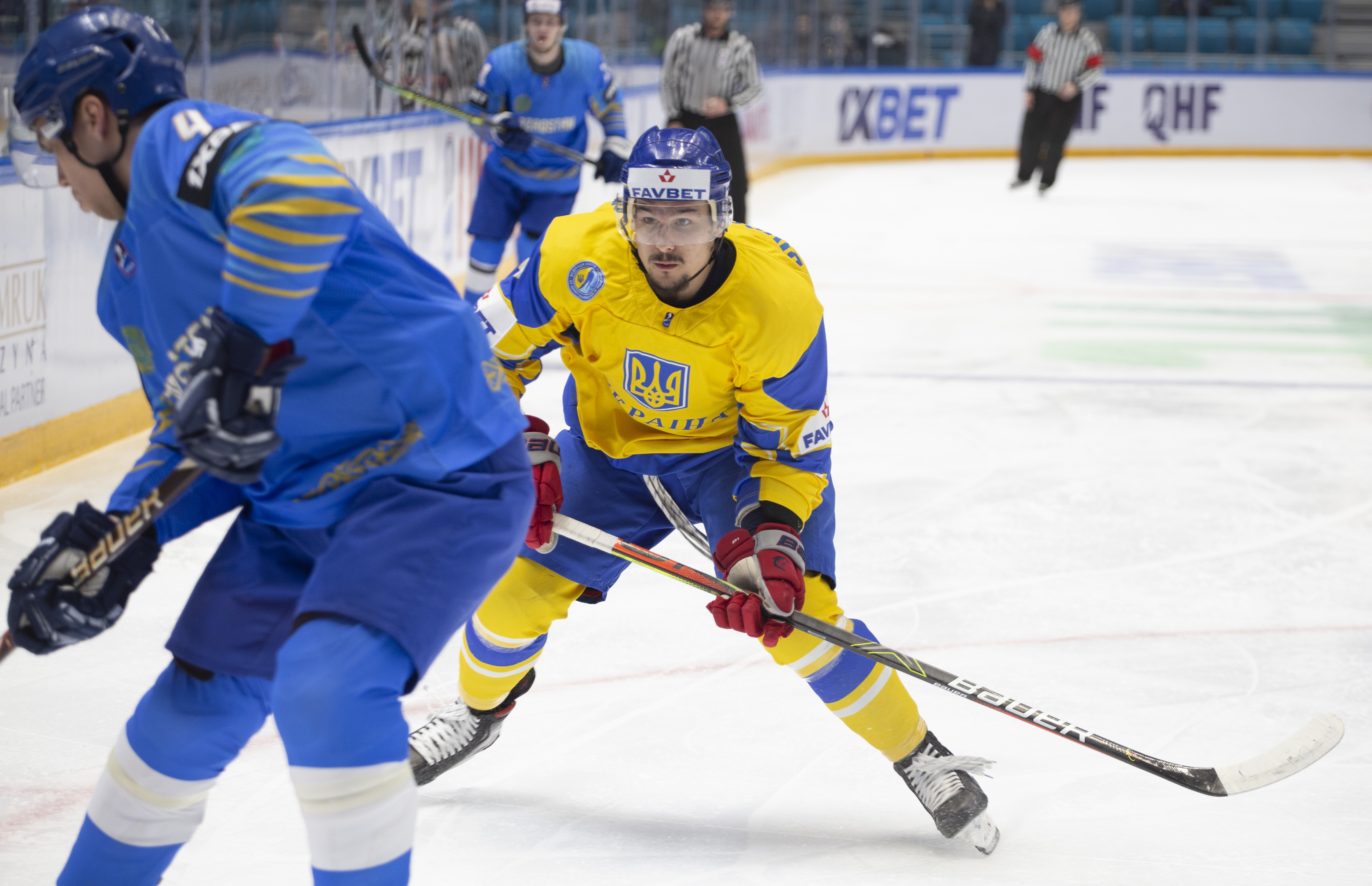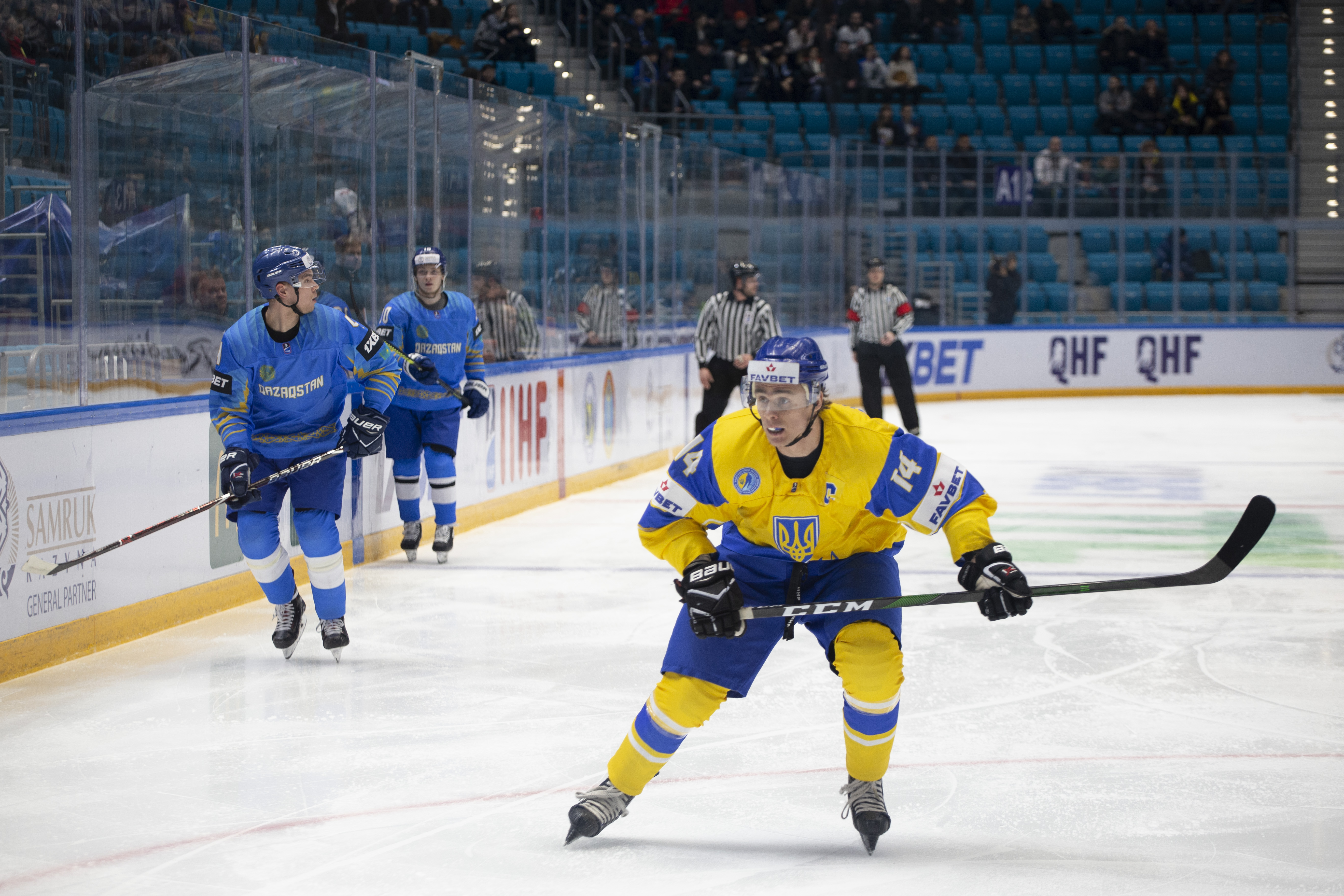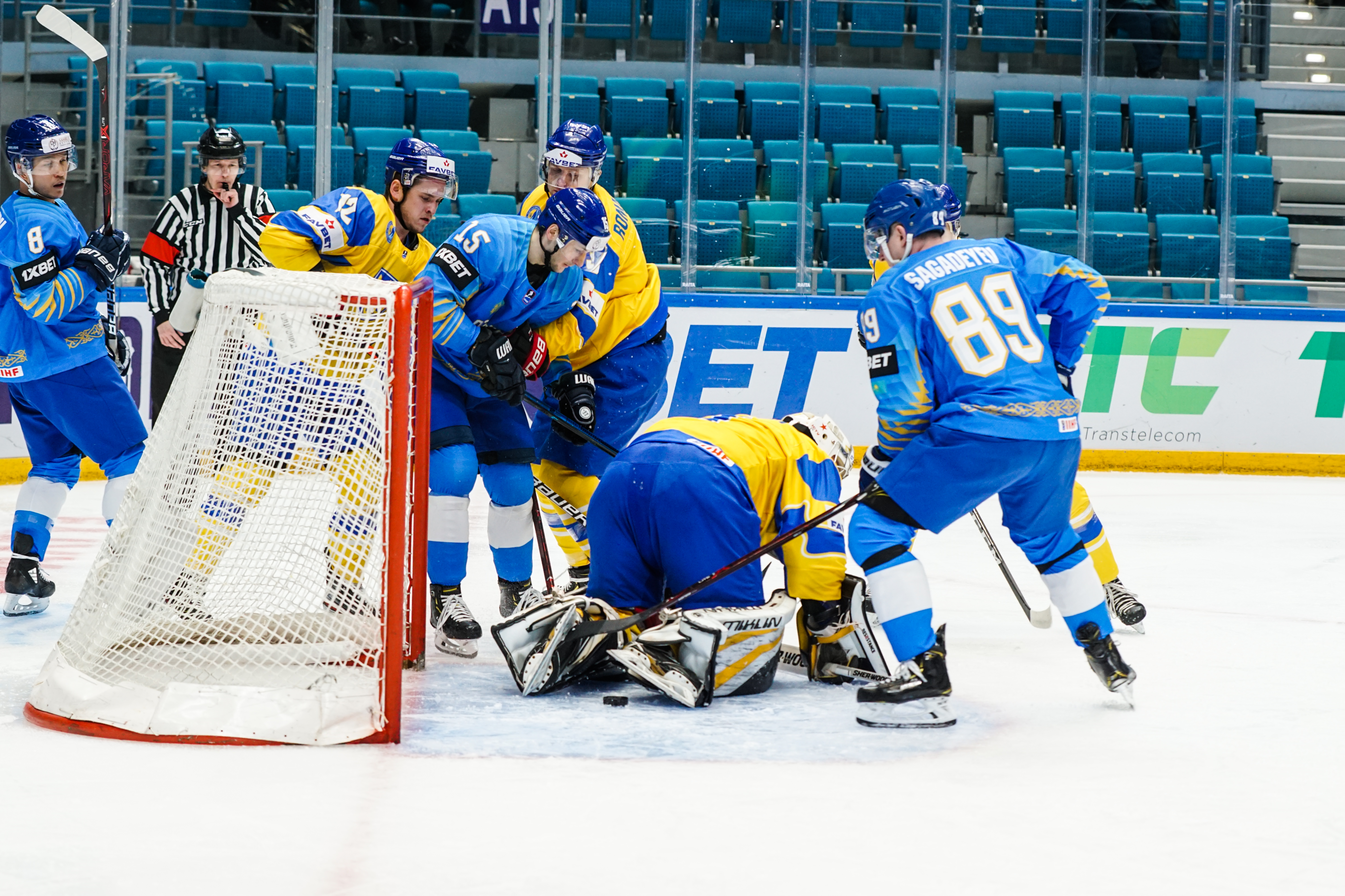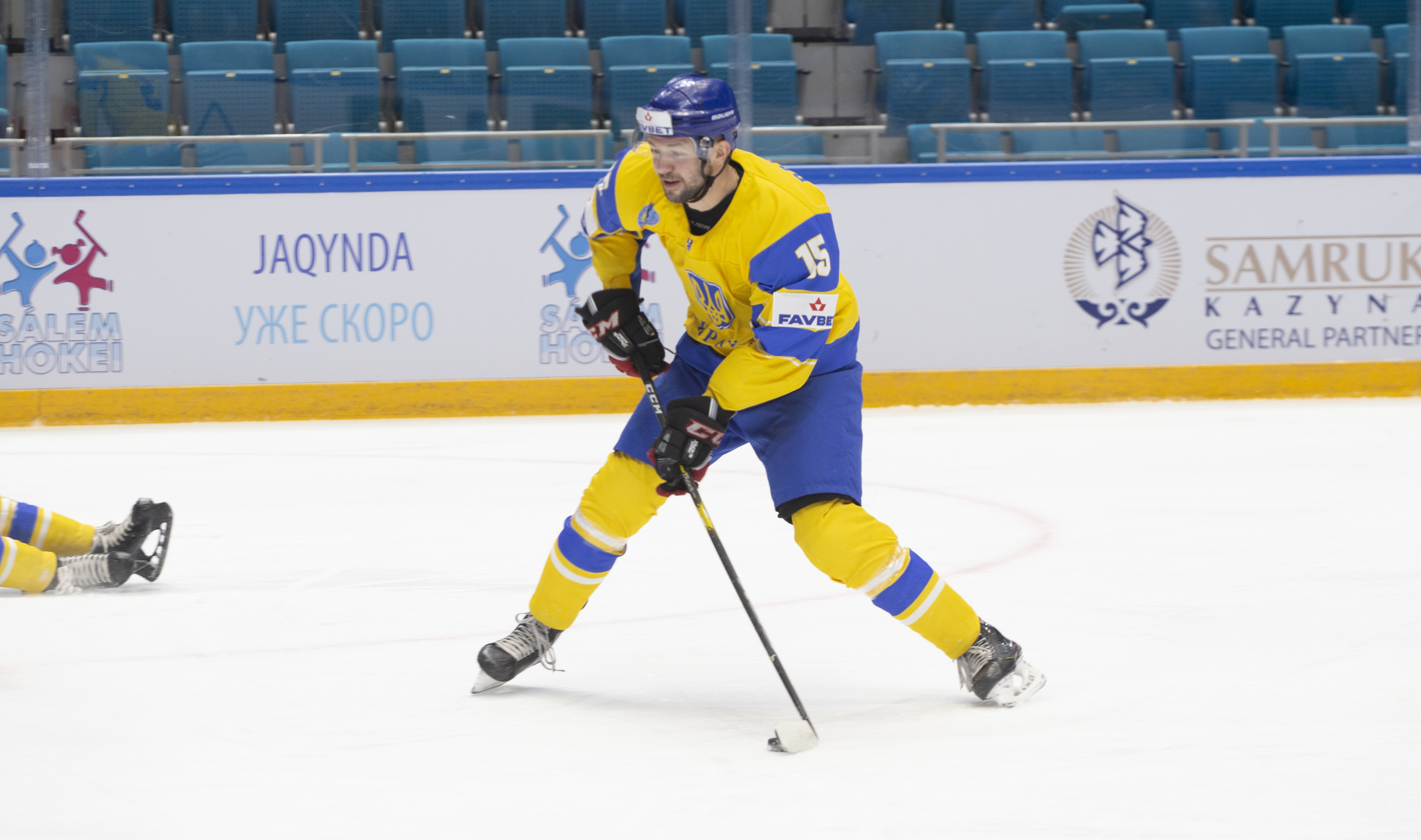 The reprieve was brief. Within a minute, Alexei Maklyukov’s point shot was tipped in by Dmitri Shevchenko. Next, Valeri Orekhov shaped to shoot before dinking a diagonal pass for Yegor Petukhov to score unmarked at the back door. And when Leonid Metalnikov fired home from the blue line, Kazakhstan had a 3-0 lead inside nine minutes. Kucher went back to the bench but the host was rampant. The speed of Kazakhstan’s passing was causing Ukraine all sorts of problems and too often players were left unguarded near the net. That enabled Curtis Valk to set up Starchenko out in front for 4-0, before Zhailauov had the crowd on its feet when he stuffed home a rebound from a Darren Dietz point shot.