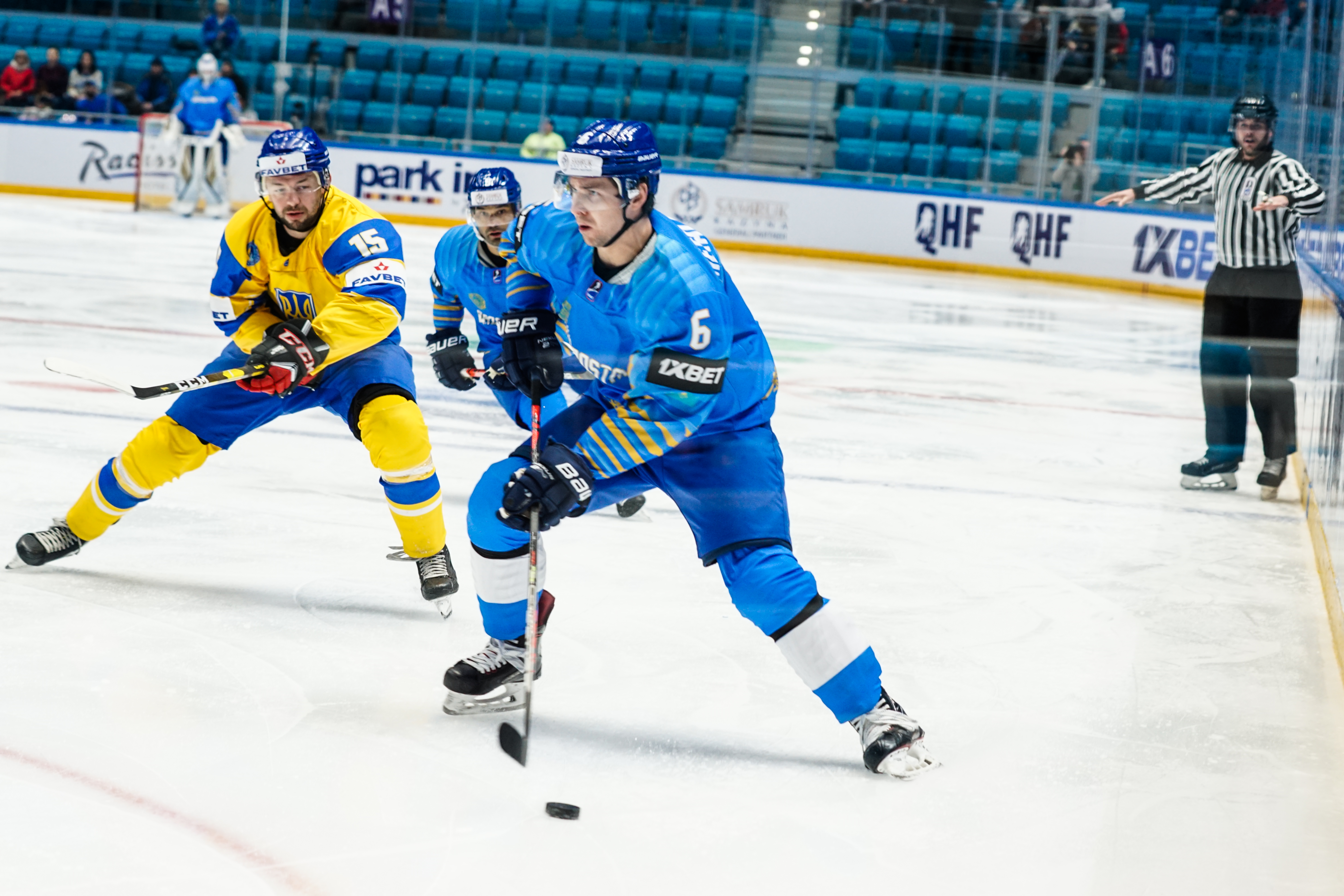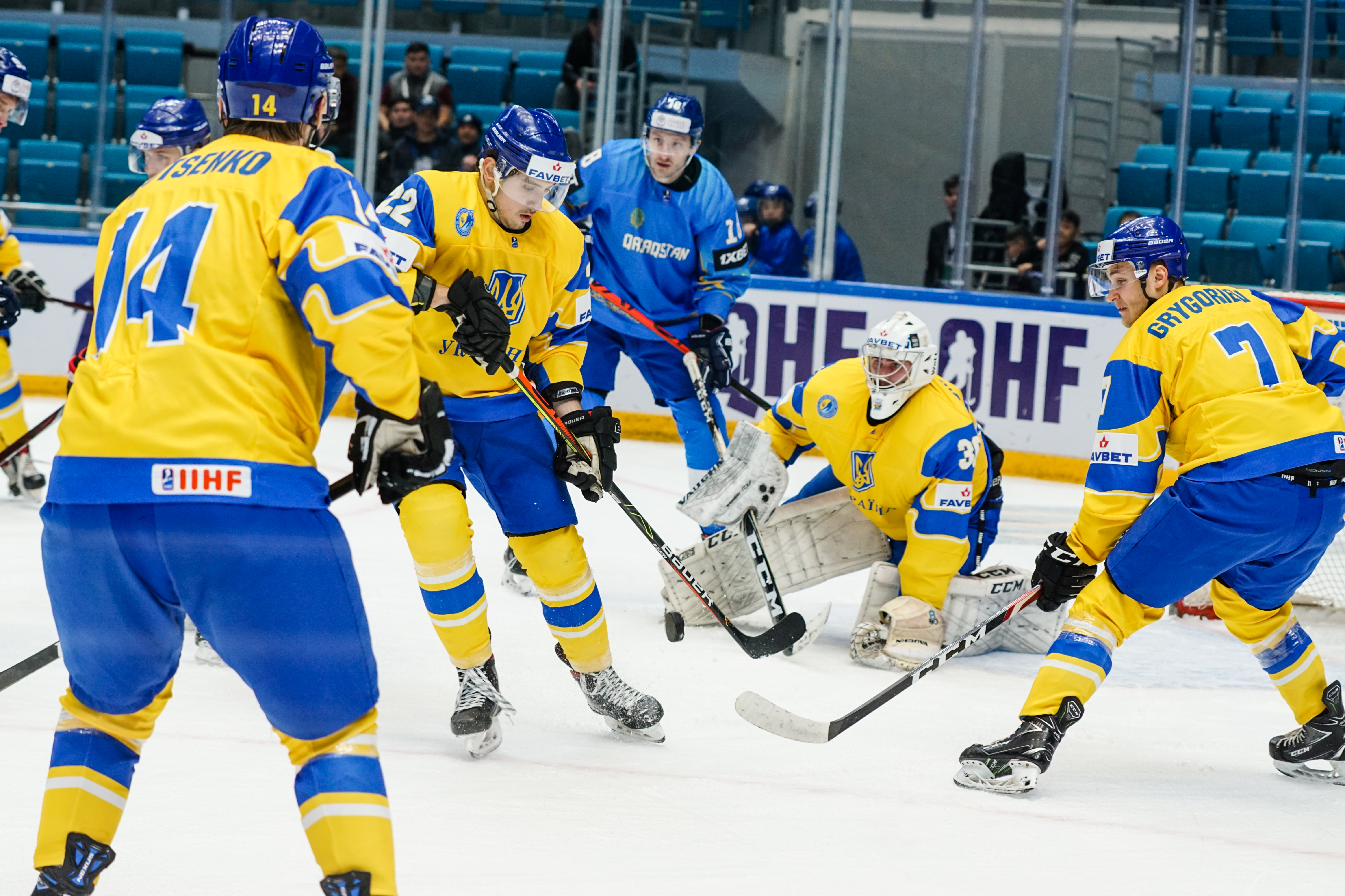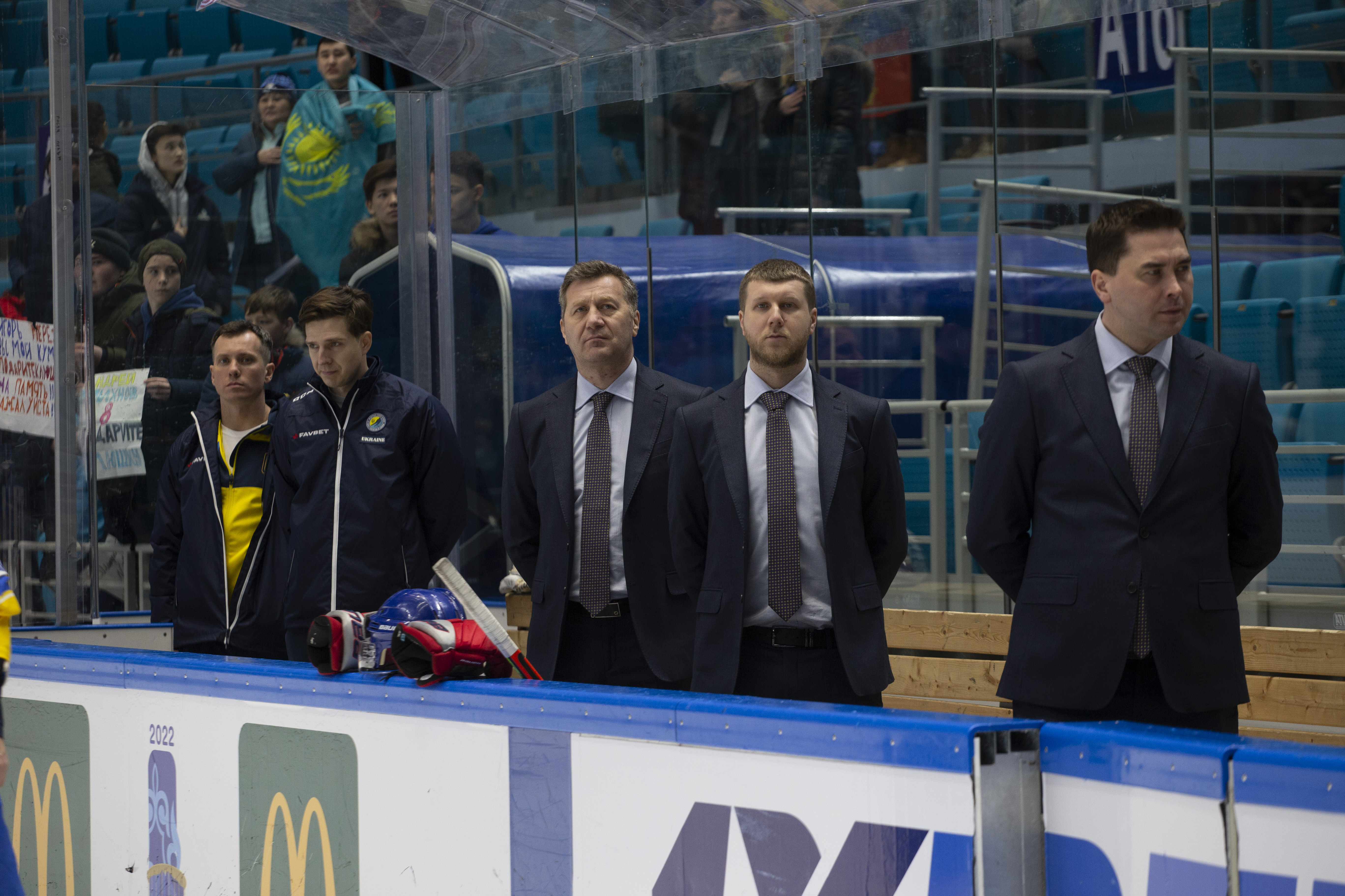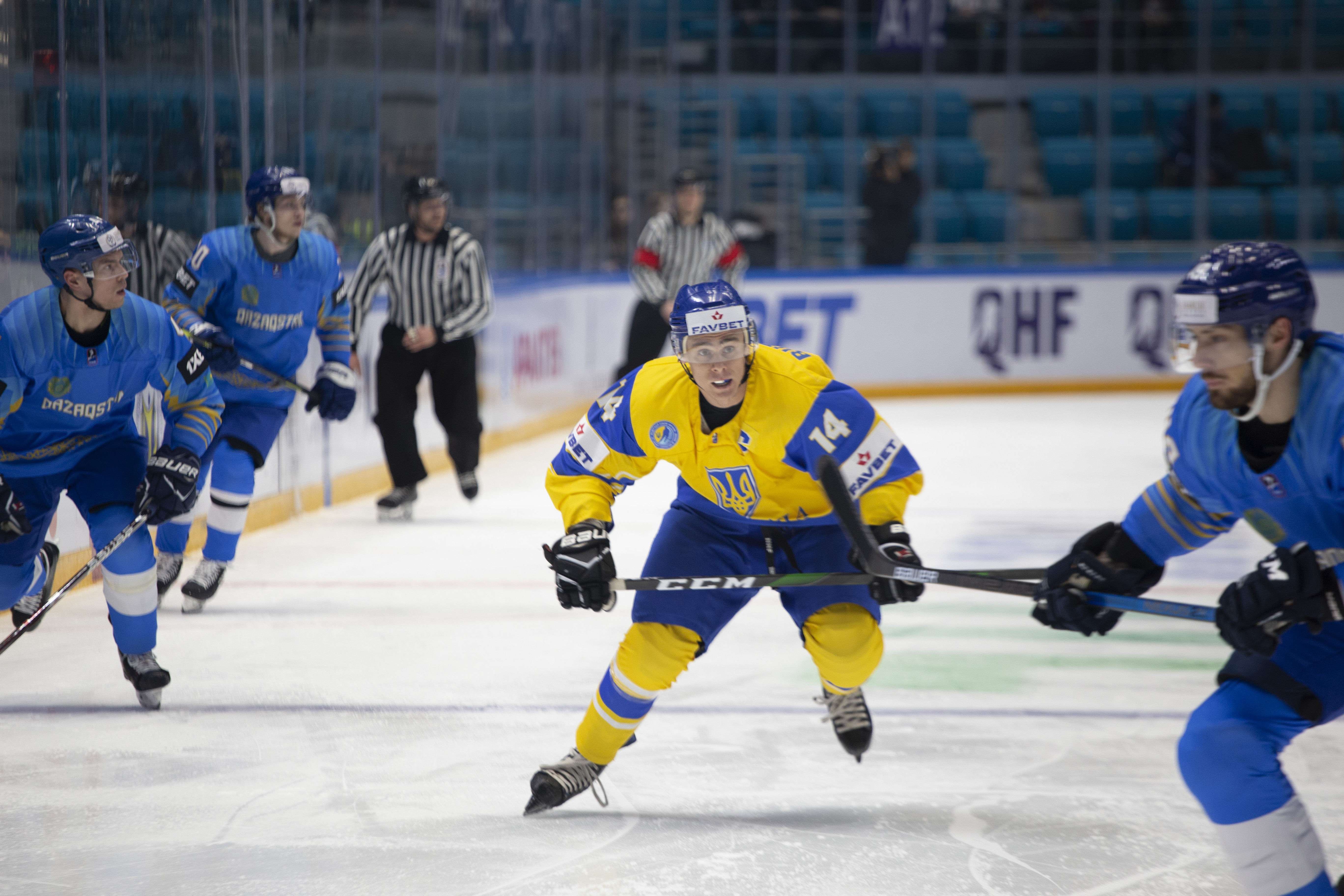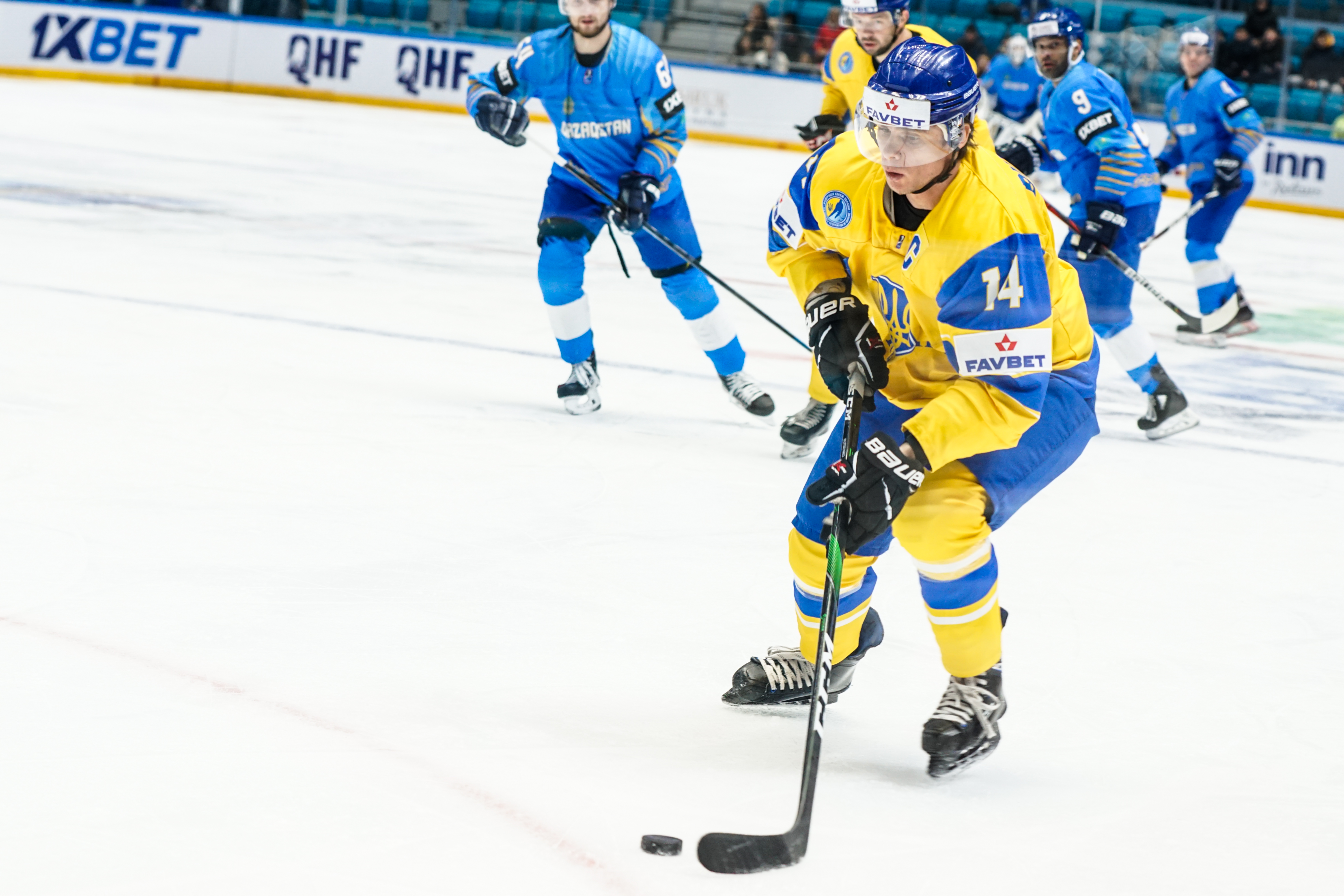The reprieve was brief. Within a minute, Alexei Maklyukov’s point shot was tipped in by Dmitri Shevchenko. Next, Valeri Orekhov shaped to shoot before dinking a diagonal pass for Yegor Petukhov to score unmarked at the back door. And when Leonid Metalnikov fired home from the blue line, Kazakhstan had a 3-0 lead inside nine minutes. Kucher went back to the bench but the host was rampant. The speed of Kazakhstan’s passing was causing Ukraine all sorts of problems and too often players were left unguarded near the net. That enabled Curtis Valk to set up Starchenko out in front for 4-0, before Zhailauov had the crowd on its feet when he stuffed home a rebound from a Darren Dietz point shot.