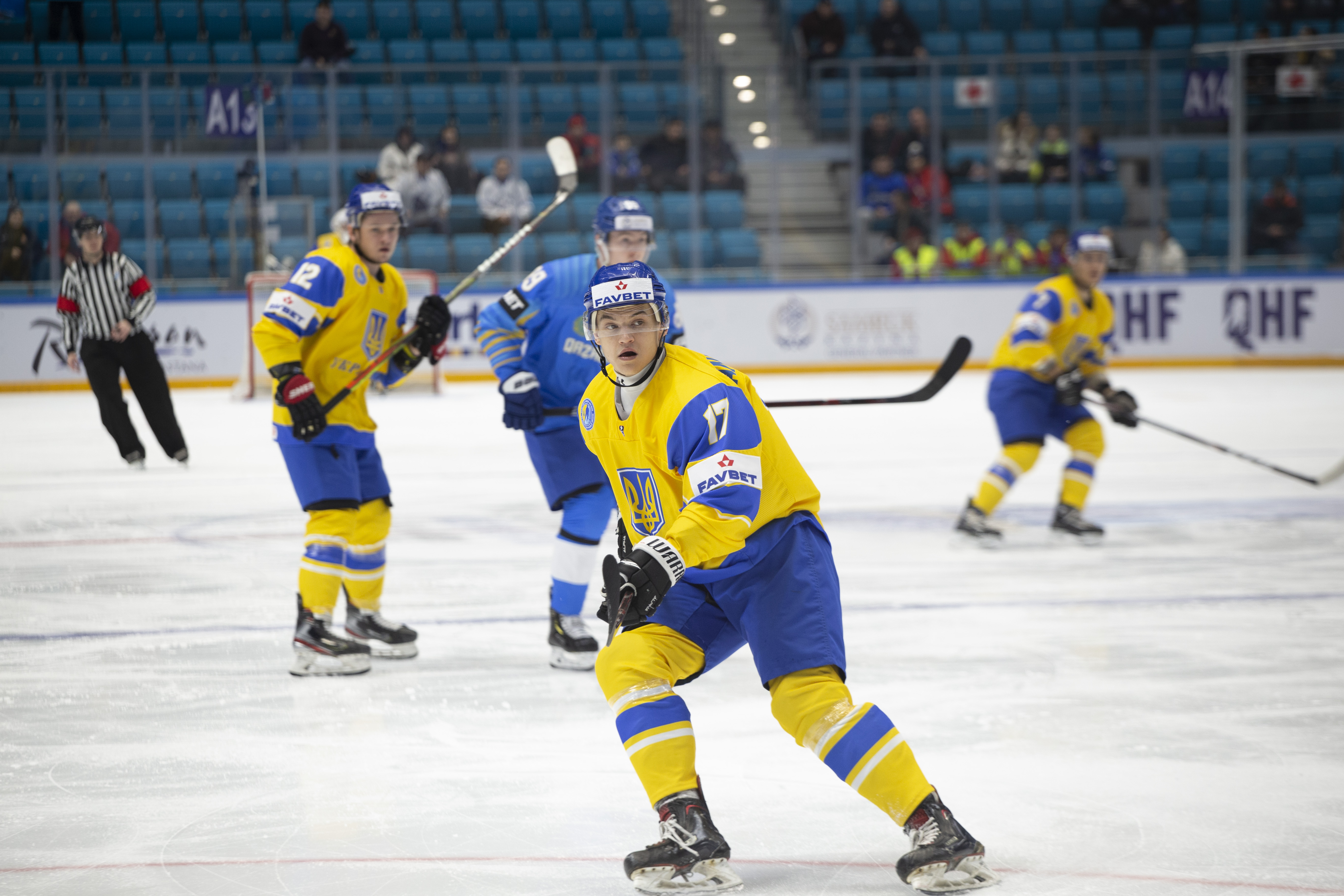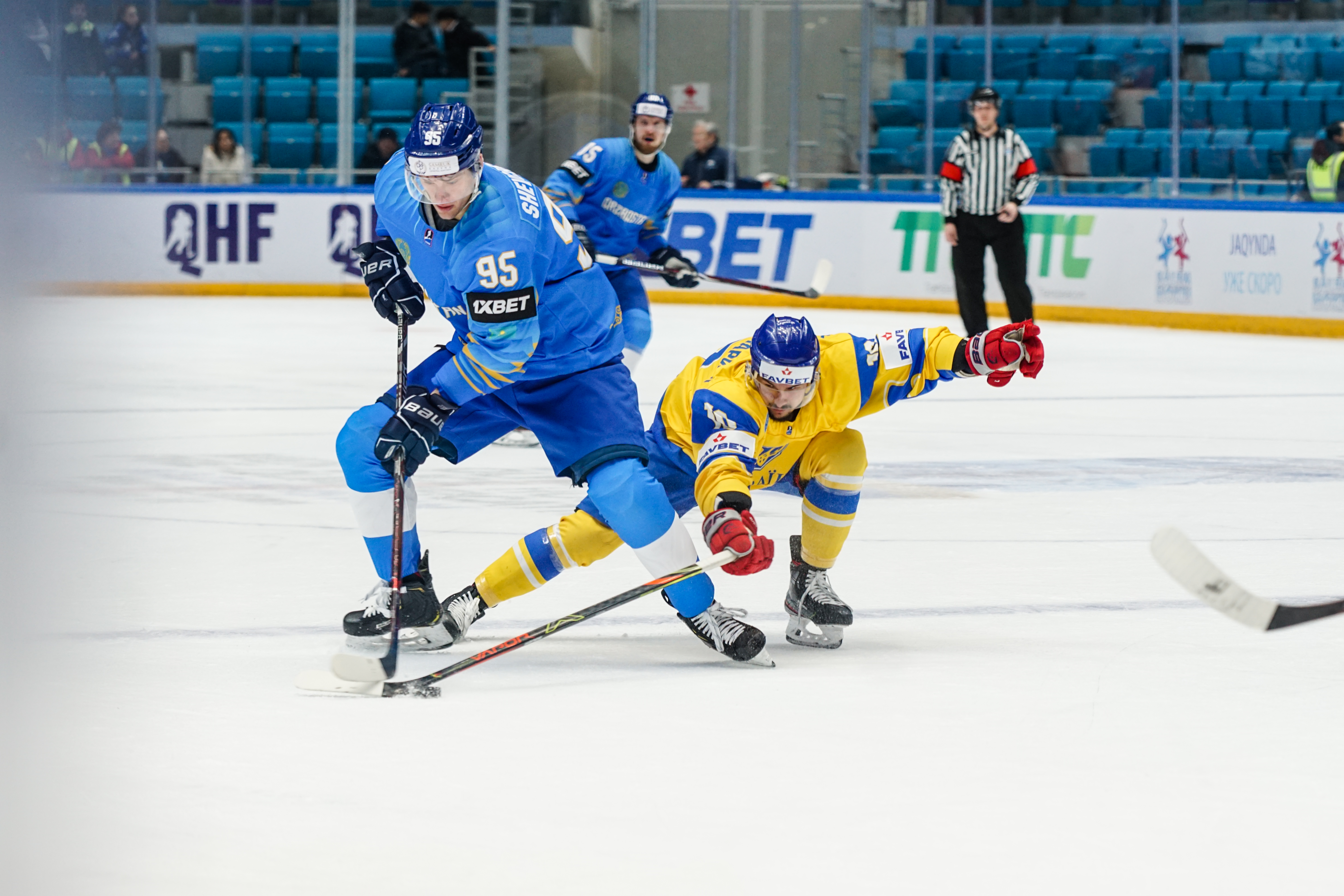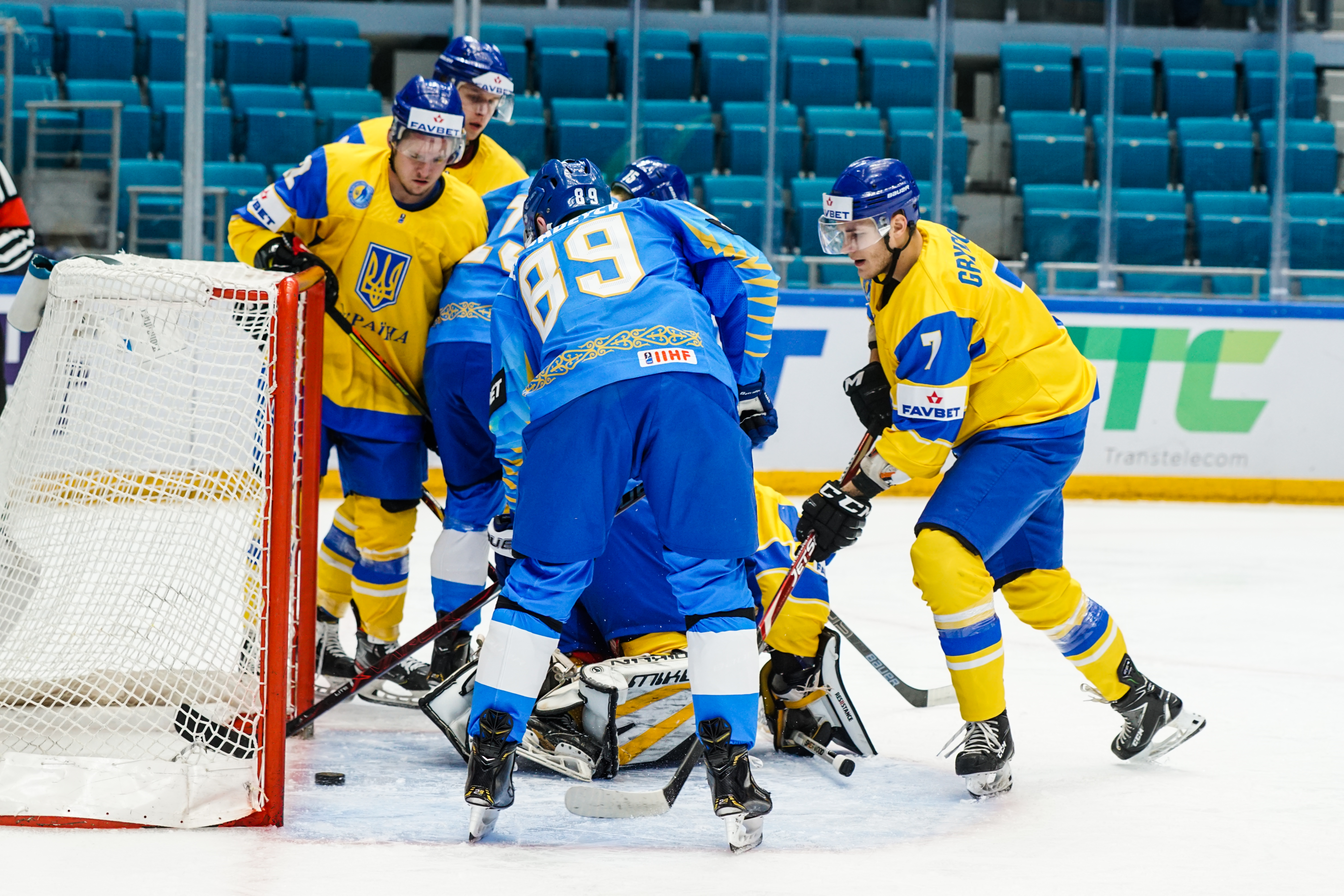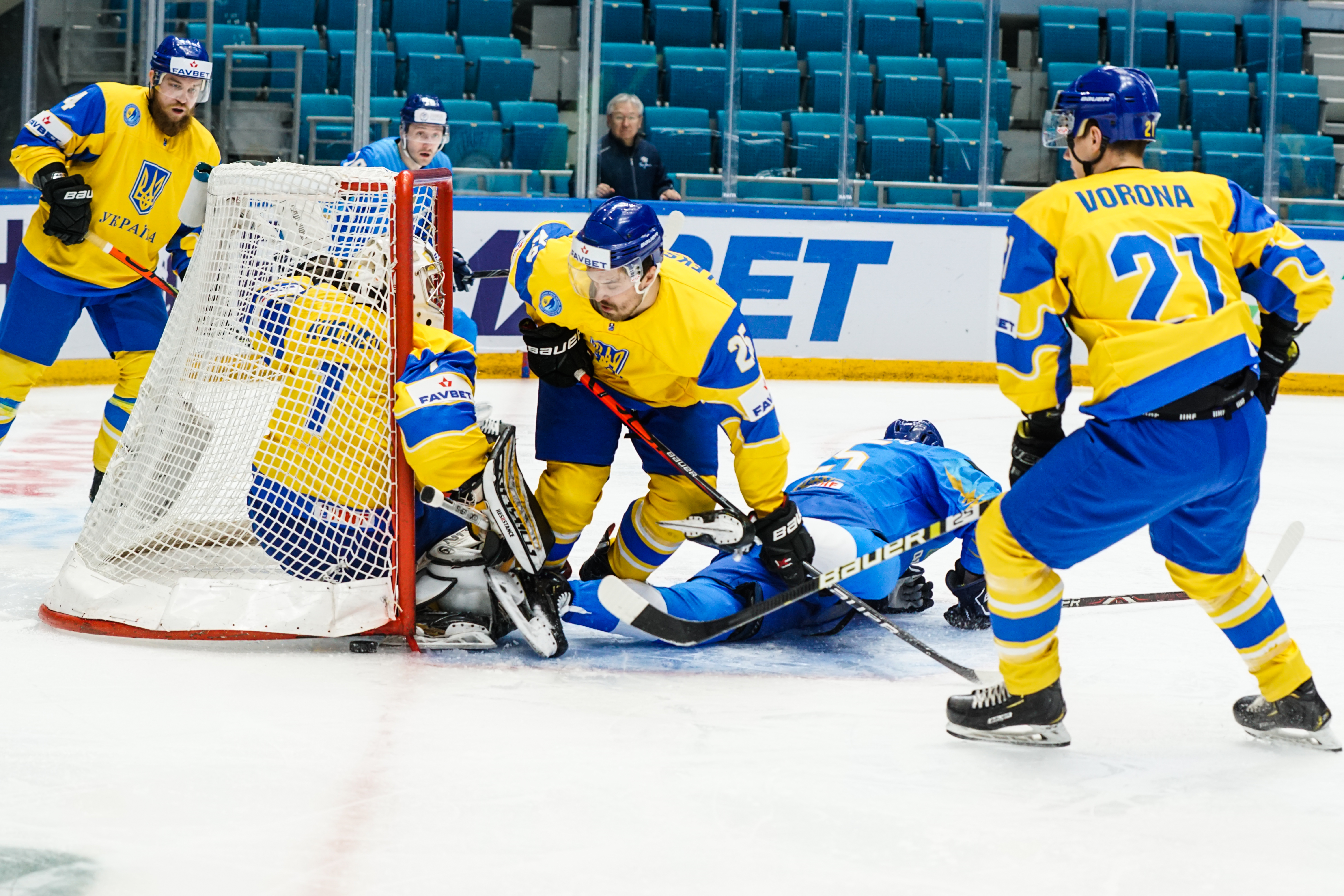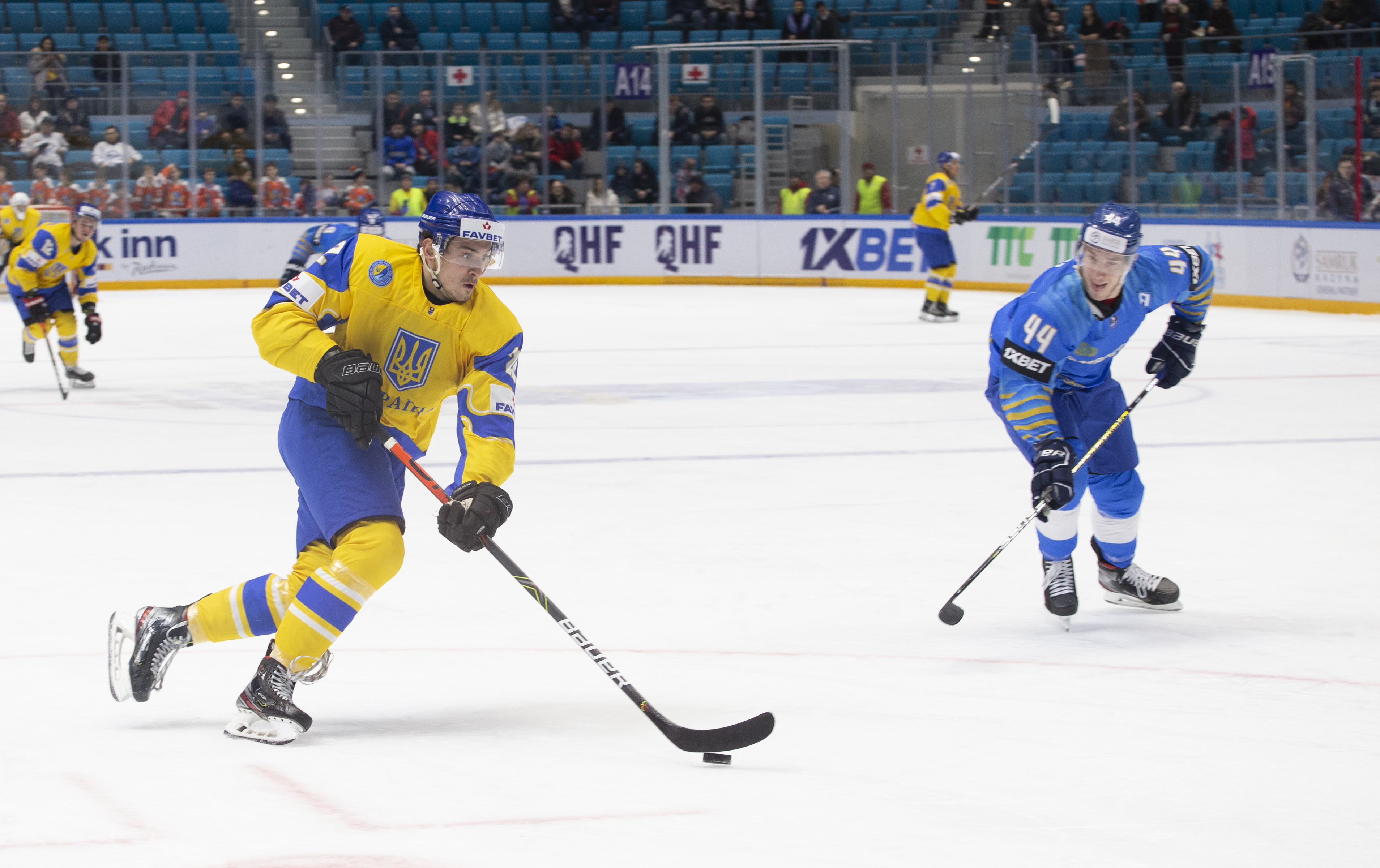 The reprieve was brief. Within a minute, Alexei Maklyukov’s point shot was tipped in by Dmitri Shevchenko. Next, Valeri Orekhov shaped to shoot before dinking a diagonal pass for Yegor Petukhov to score unmarked at the back door. And when Leonid Metalnikov fired home from the blue line, Kazakhstan had a 3-0 lead inside nine minutes. Kucher went back to the bench but the host was rampant. The speed of Kazakhstan’s passing was causing Ukraine all sorts of problems and too often players were left unguarded near the net. That enabled Curtis Valk to set up Starchenko out in front for 4-0, before Zhailauov had the crowd on its feet when he stuffed home a rebound from a Darren Dietz point shot.