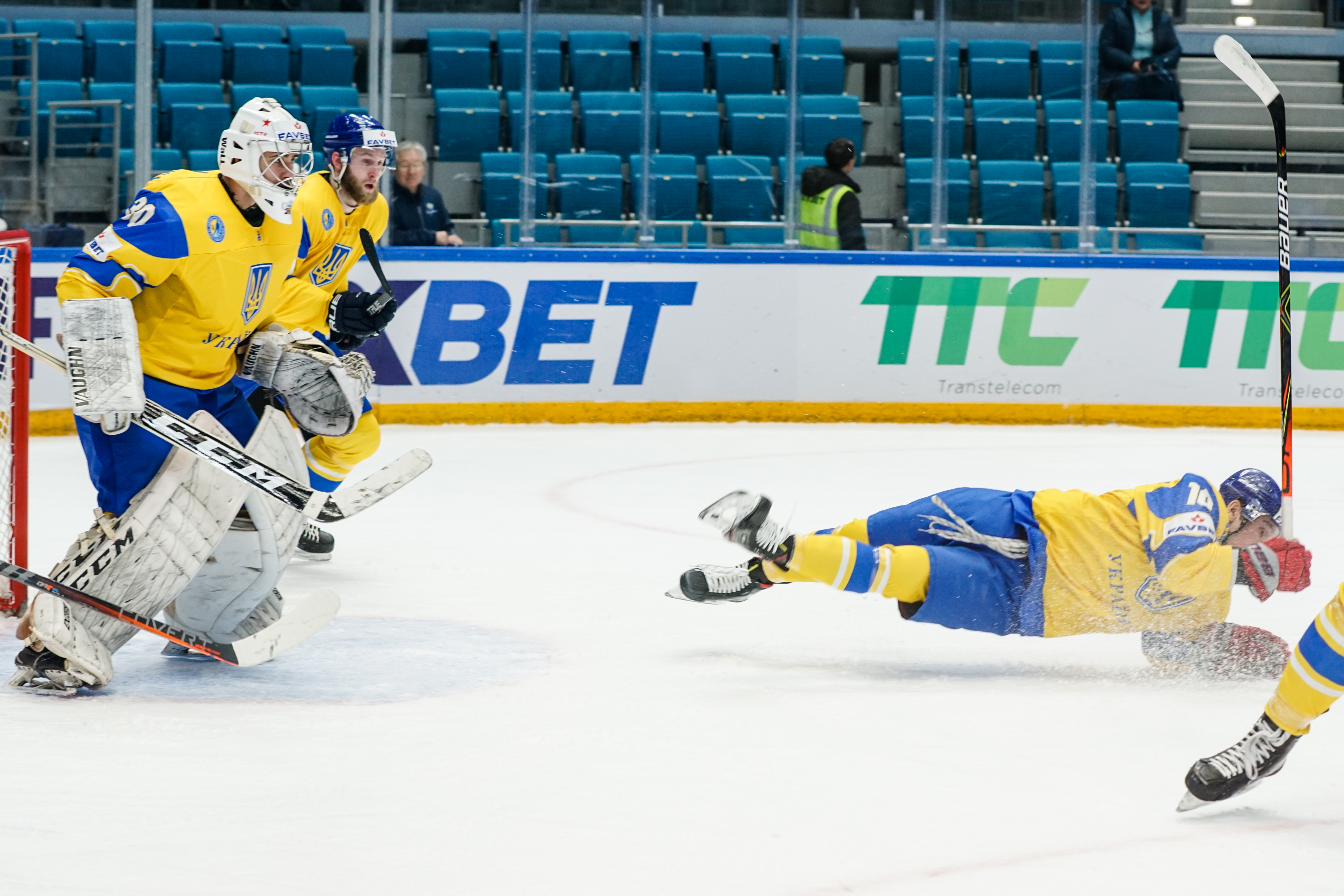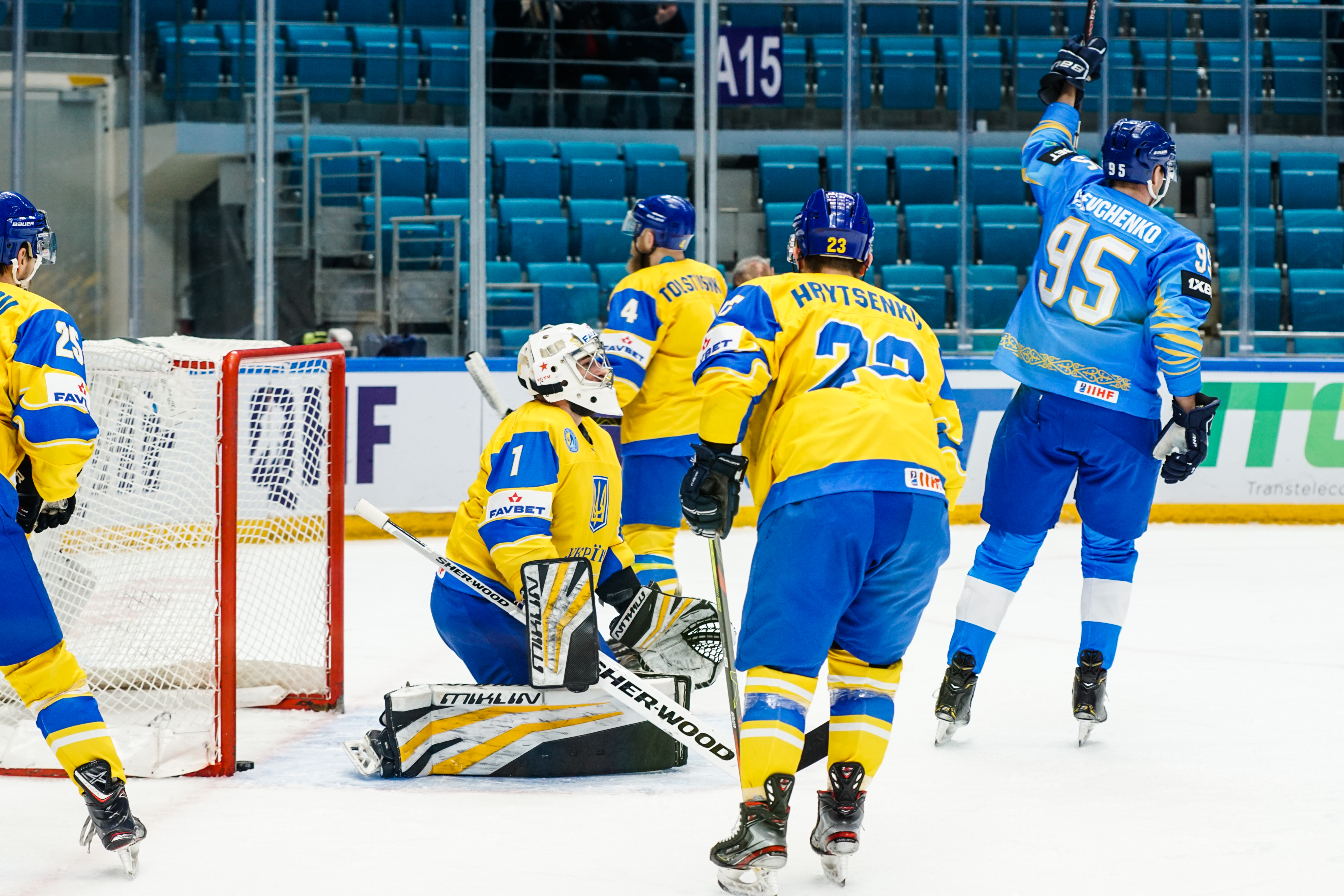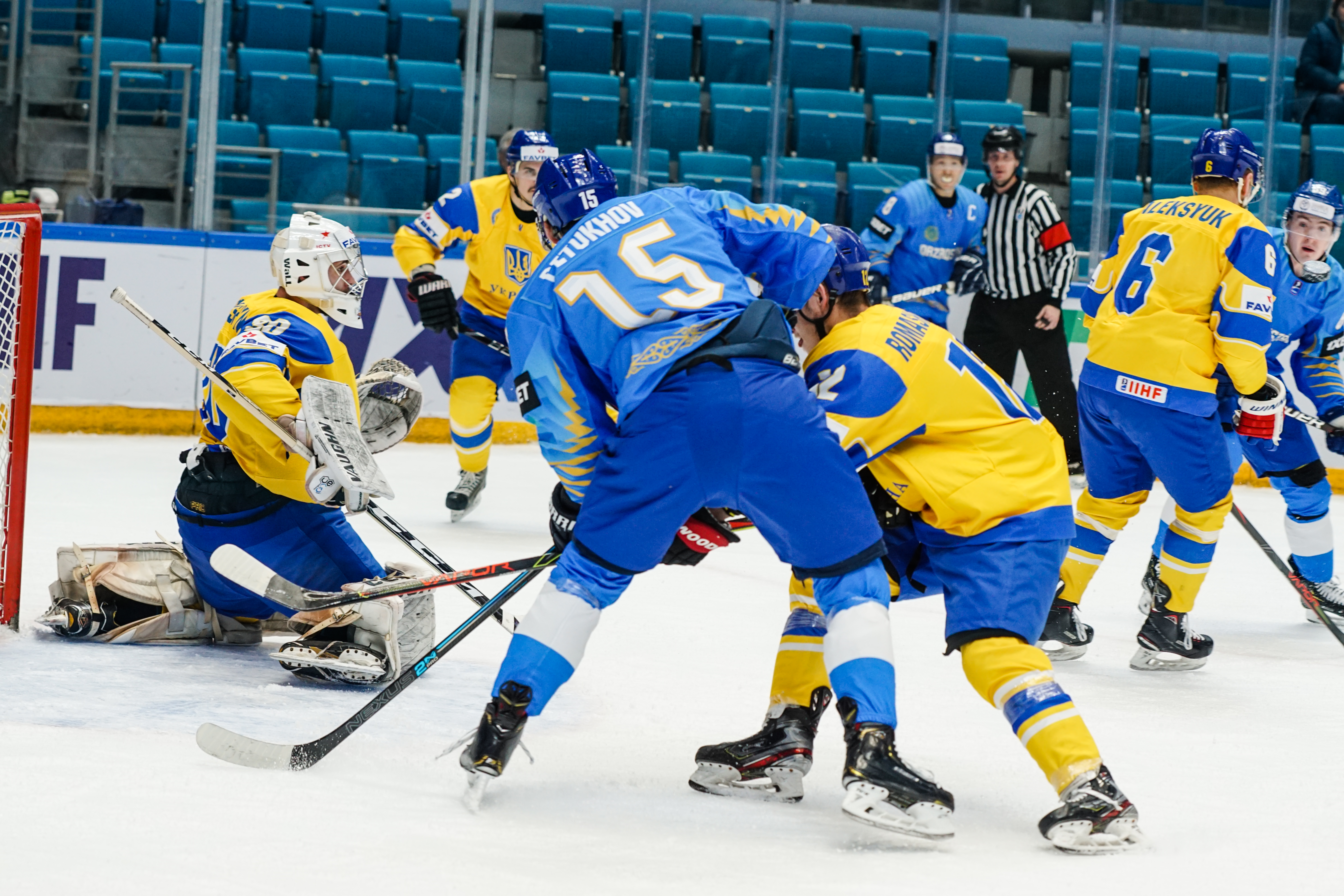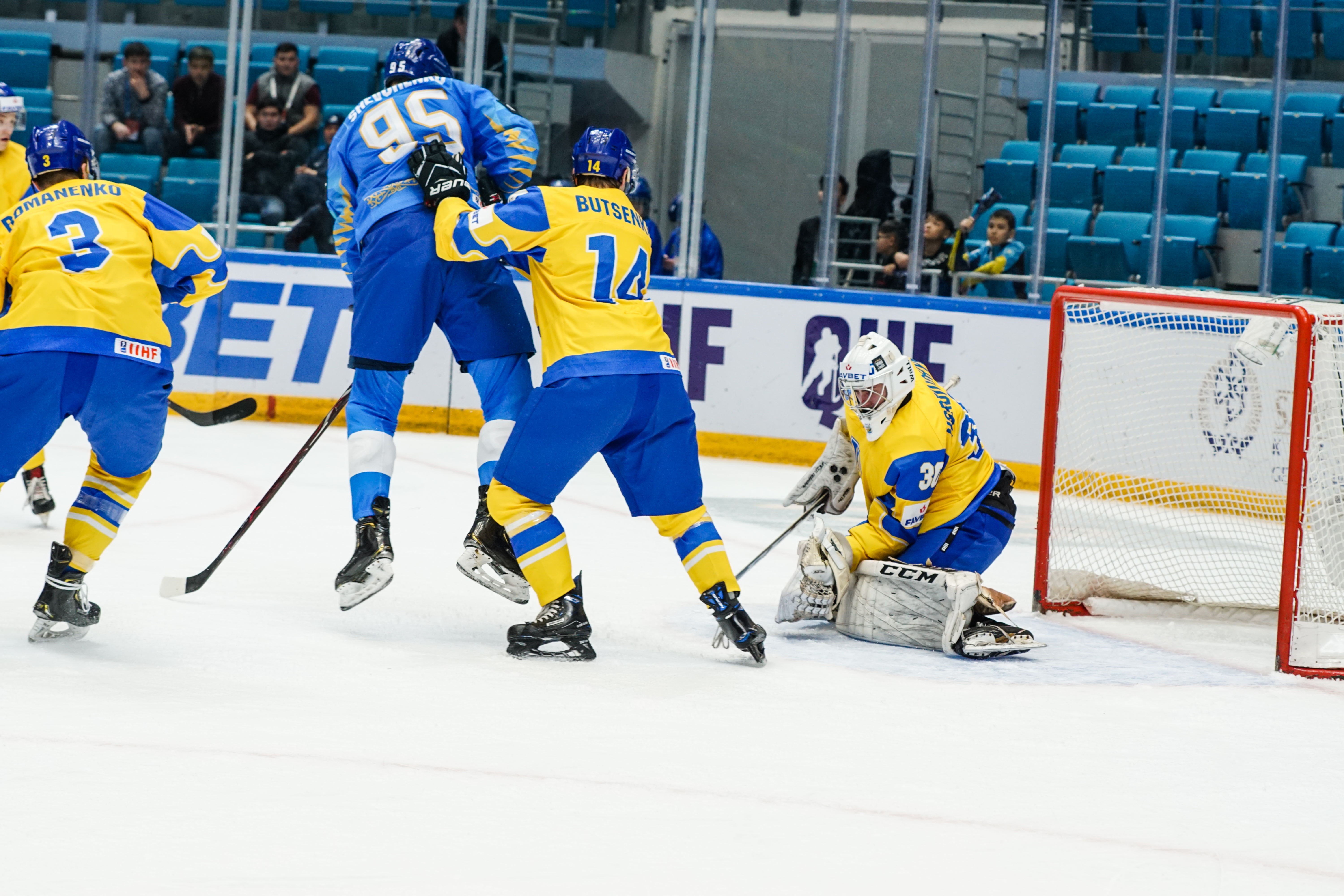 The first minute saw Starchenko flash a shot just wide, the second had Ukraine’s goalie Kyrylo Kucher rolling around his crease and the goal horn sounded in the third. It was a little premature: Arkadi Shestakov’s got a long way through Kucher’s pads but didn’t make it over the line.