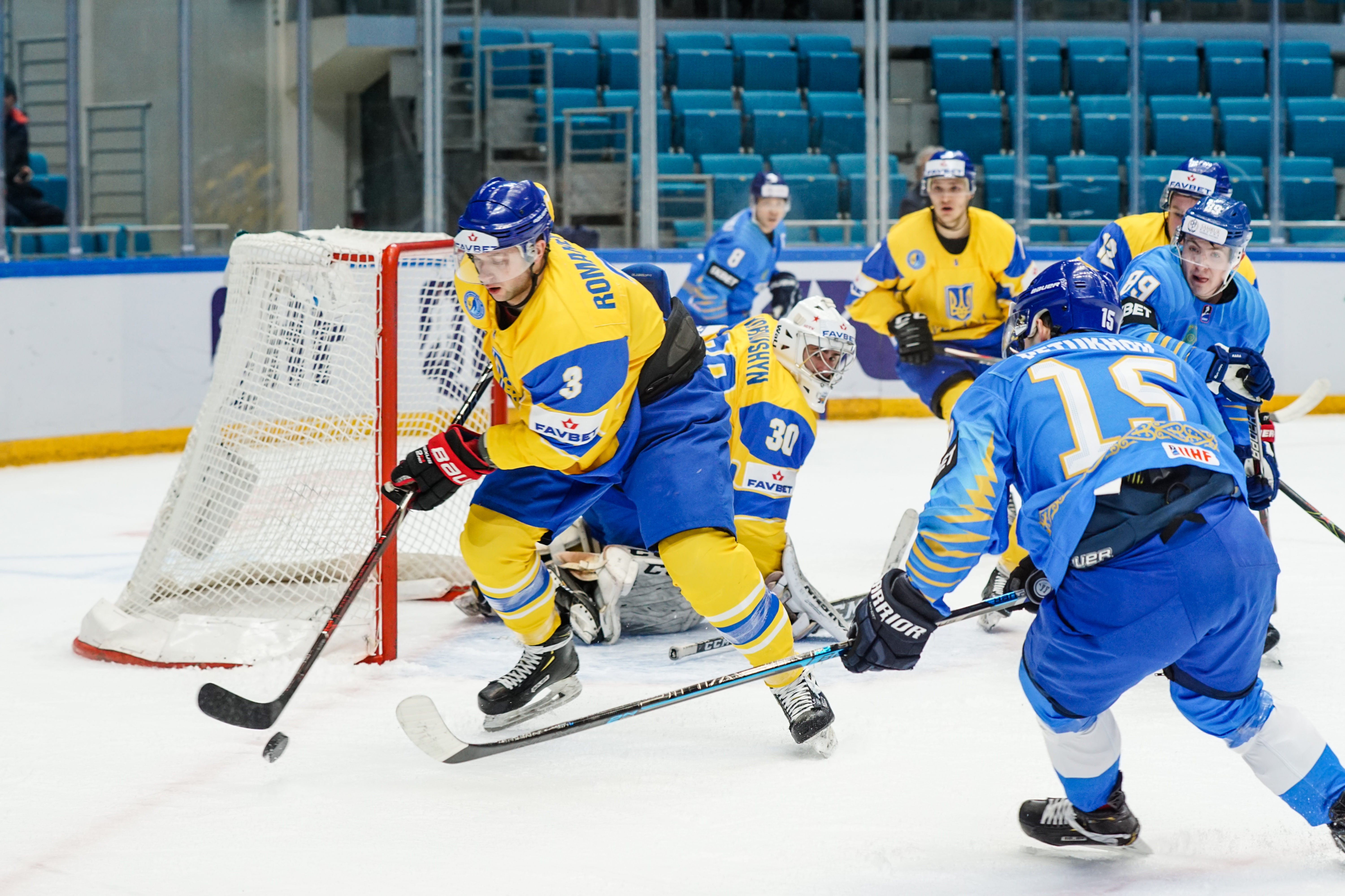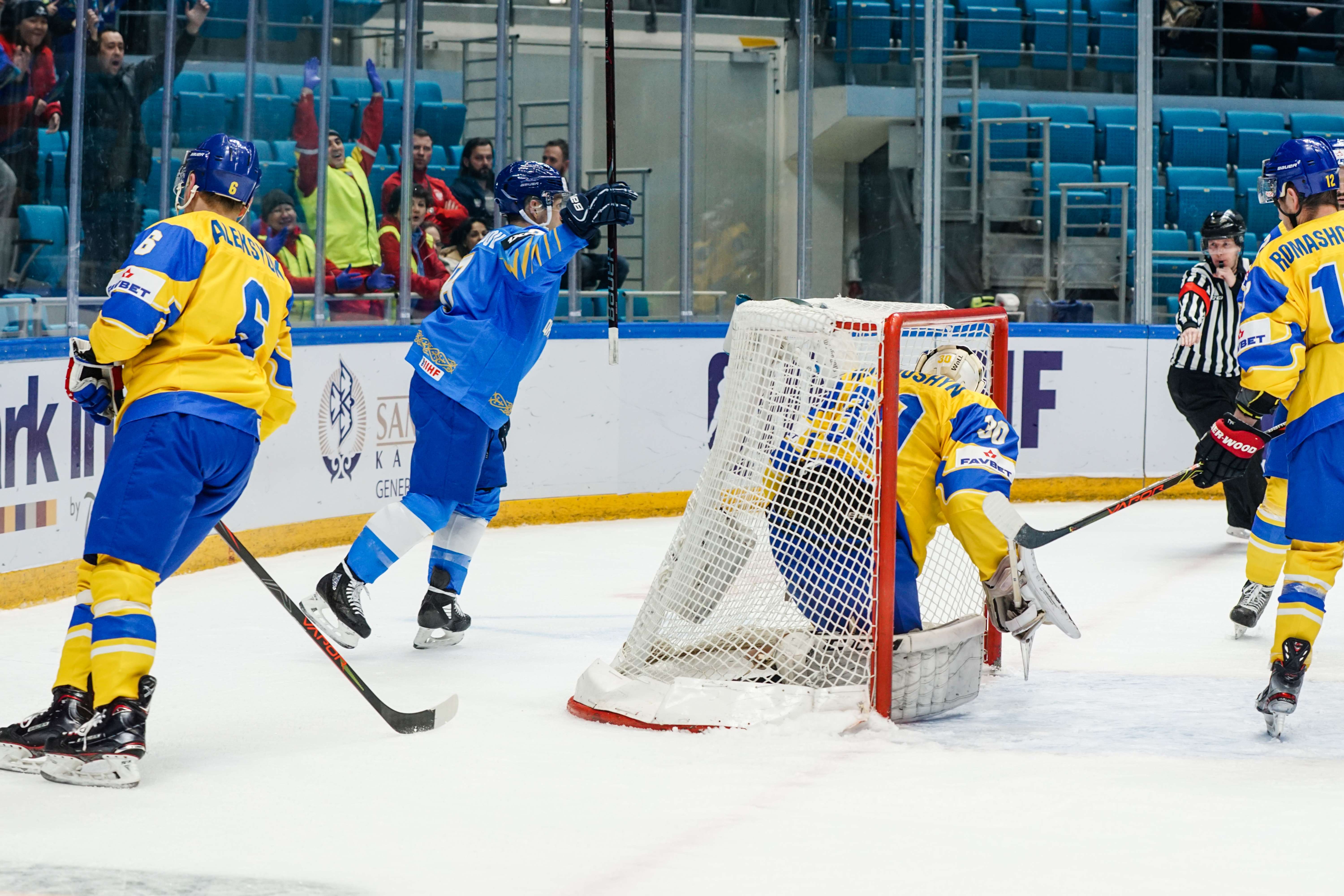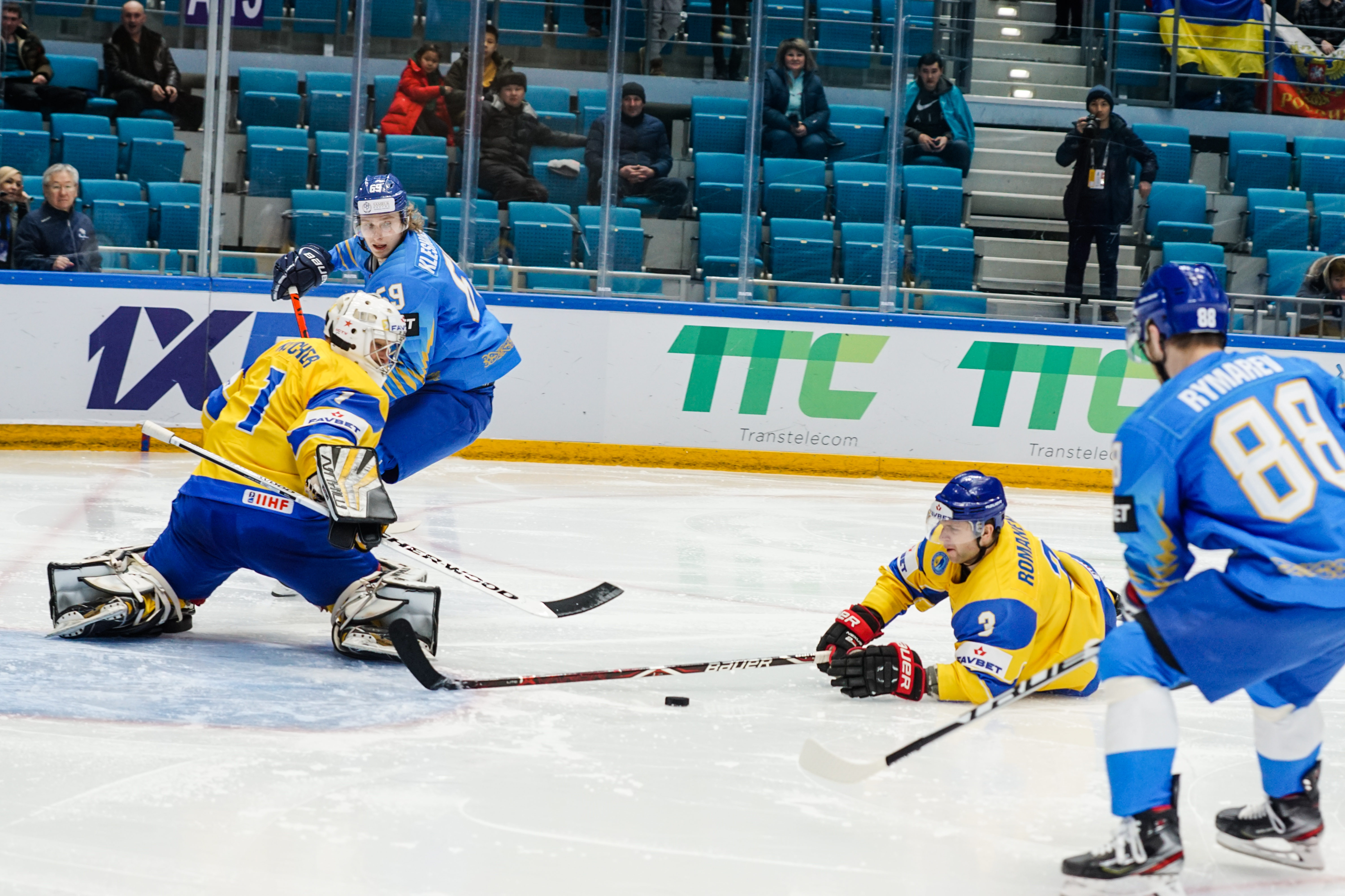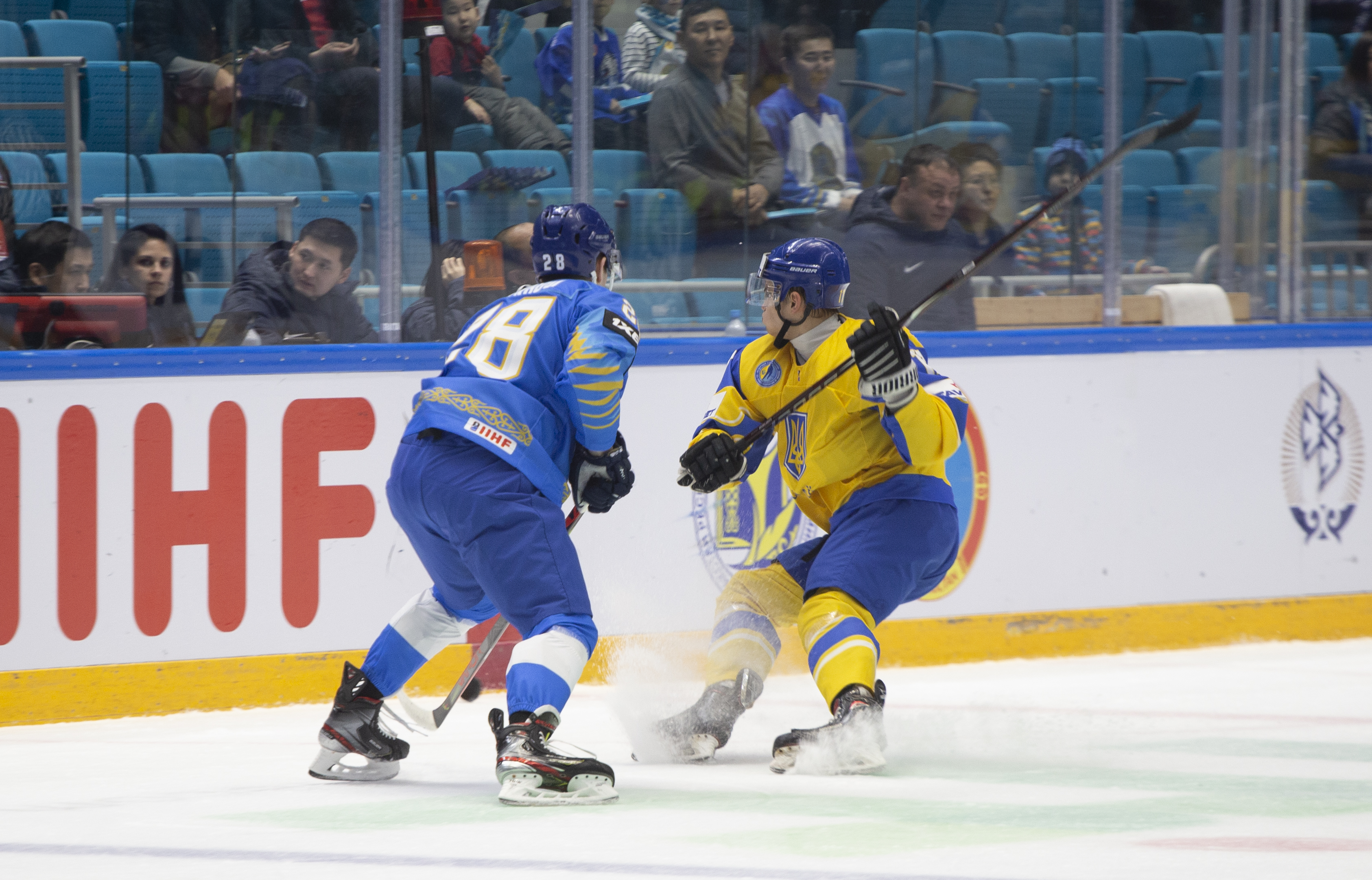 If there was anything to give the home fans pause for thought as they toasted a fine first period, it might have been a couple of defensive lapses. Although largely outplayed, Ukraine created three very clear chances, scoring one of them. Seconds after the opening goal, the Kazakh defence went walkabout to allow Olexander Kostikov a solo run on Henrik Karlsson’s net before his shot went high. In the 15th minute, Nikita Butsenko’s drop pass just inside the blue line invited Sergi Babynets to head for the danger zone and tuck away a wrister from between the hashmarks as the defence again failed to react. And late in the frame, Dmytro Nimenko stole the puck in the Kazakh zone, only to be denied by a blocker save from Karlsson.