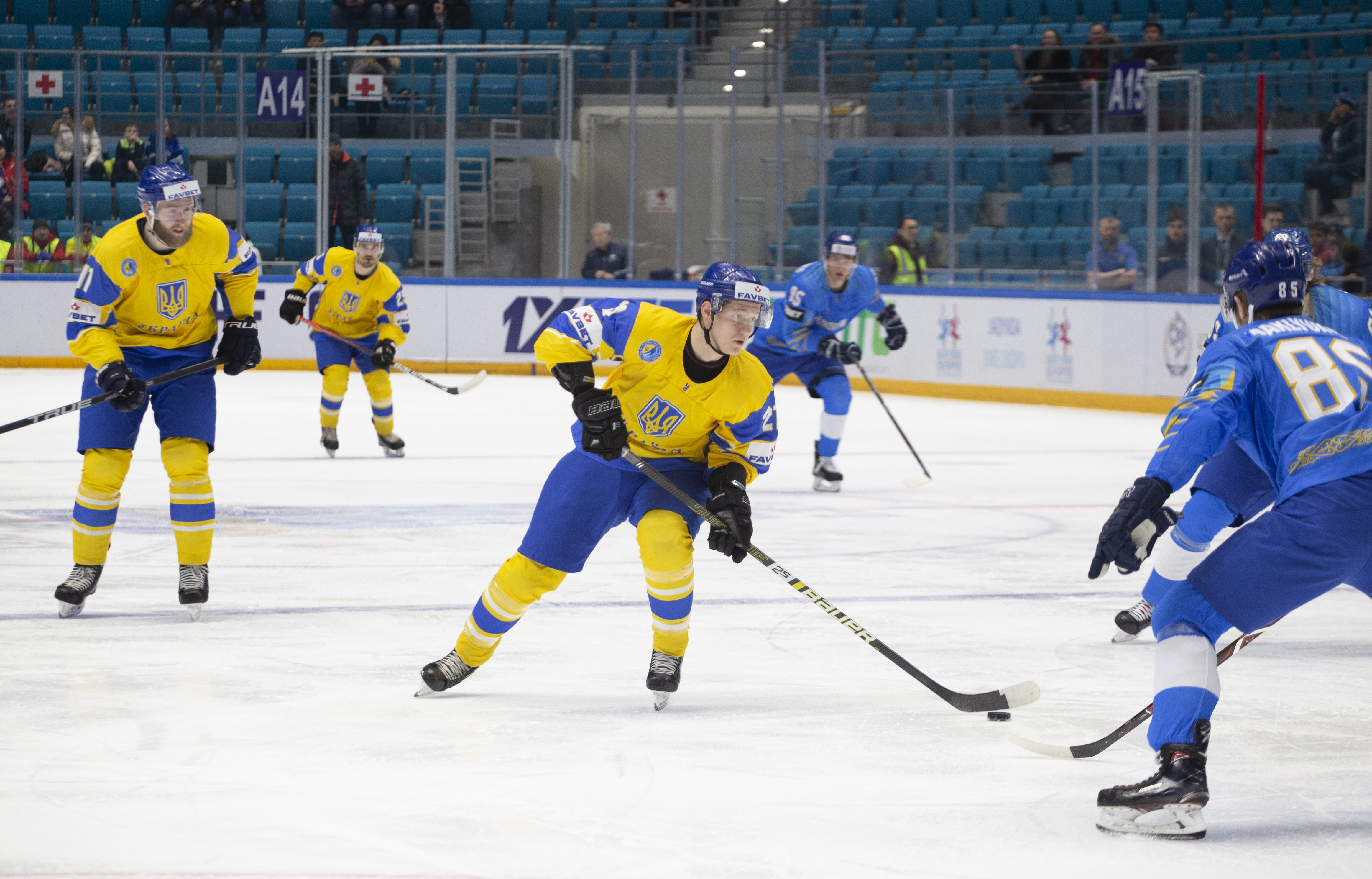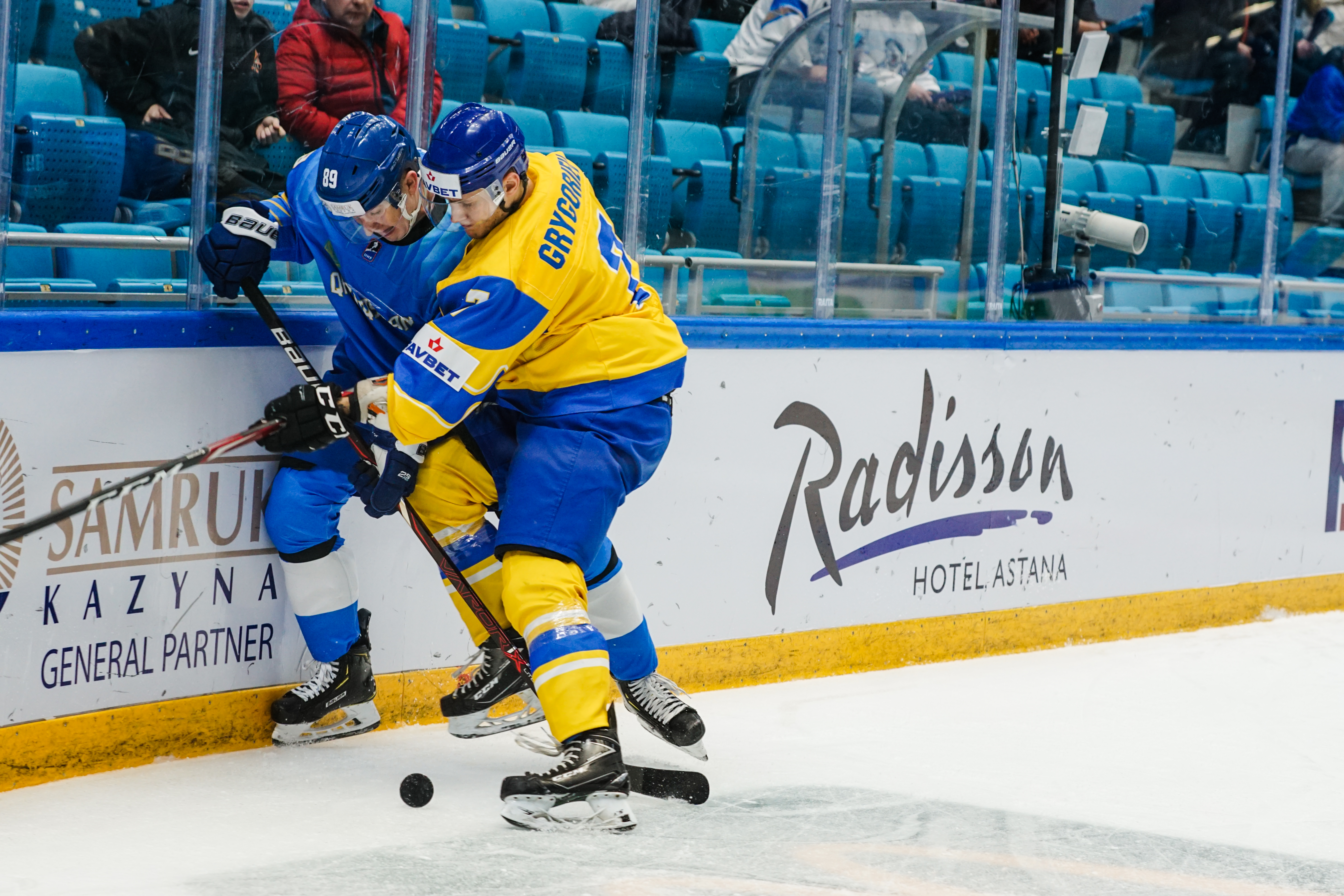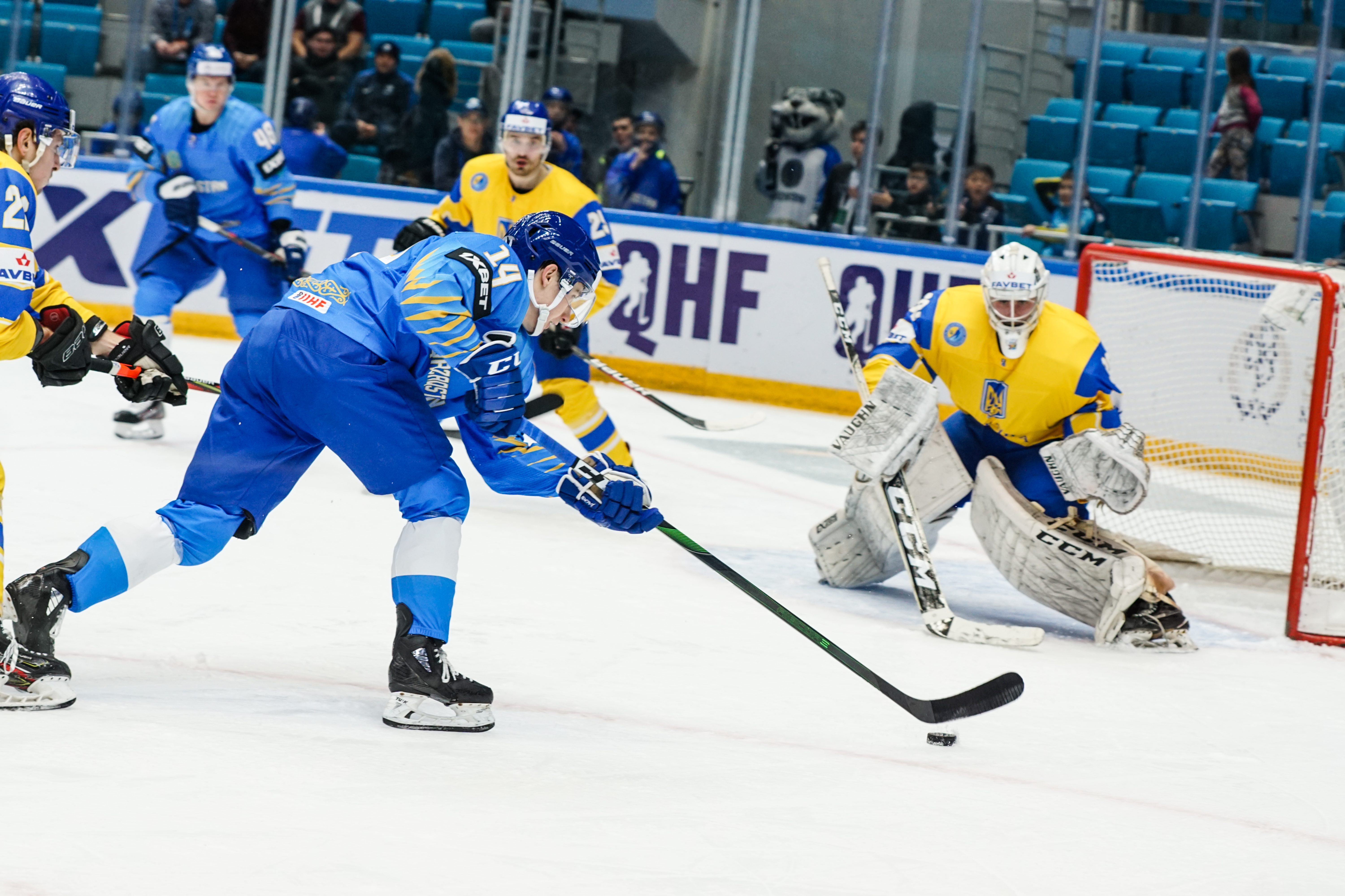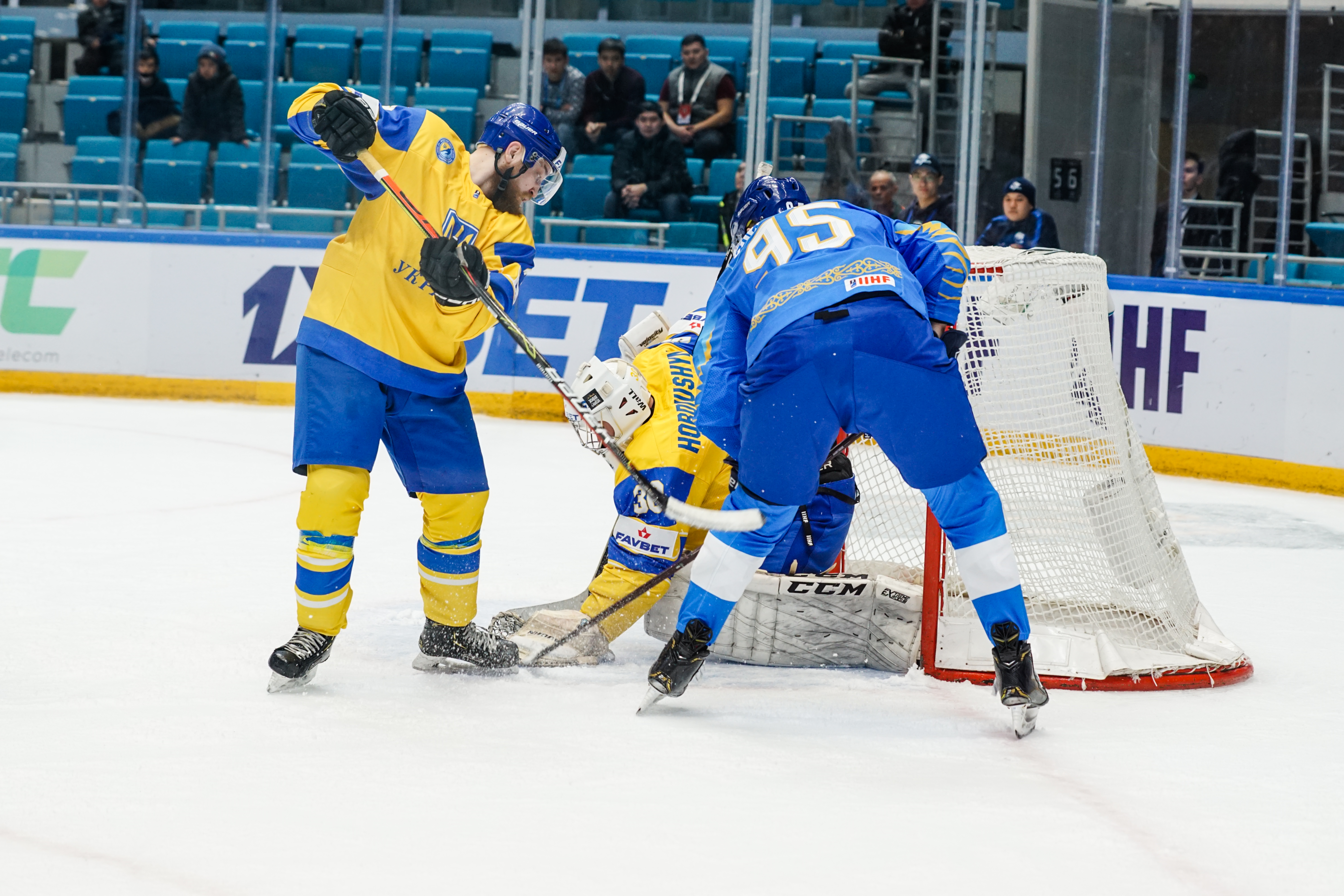 If there was anything to give the home fans pause for thought as they toasted a fine first period, it might have been a couple of defensive lapses. Although largely outplayed, Ukraine created three very clear chances, scoring one of them. Seconds after the opening goal, the Kazakh defence went walkabout to allow Olexander Kostikov a solo run on Henrik Karlsson’s net before his shot went high. In the 15th minute, Nikita Butsenko’s drop pass just inside the blue line invited Sergi Babynets to head for the danger zone and tuck away a wrister from between the hashmarks as the defence again failed to react. And late in the frame, Dmytro Nimenko stole the puck in the Kazakh zone, only to be denied by a blocker save from Karlsson.