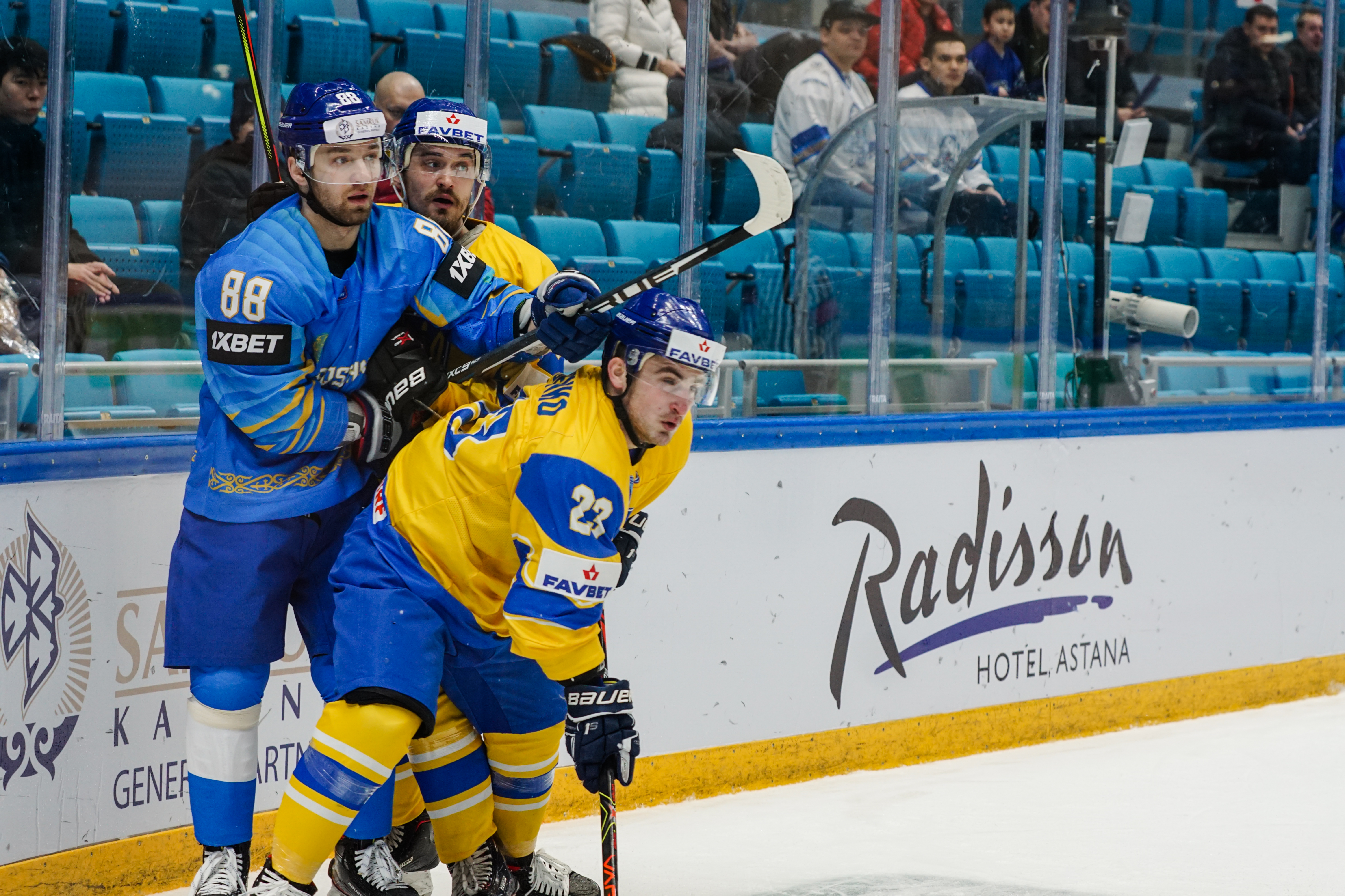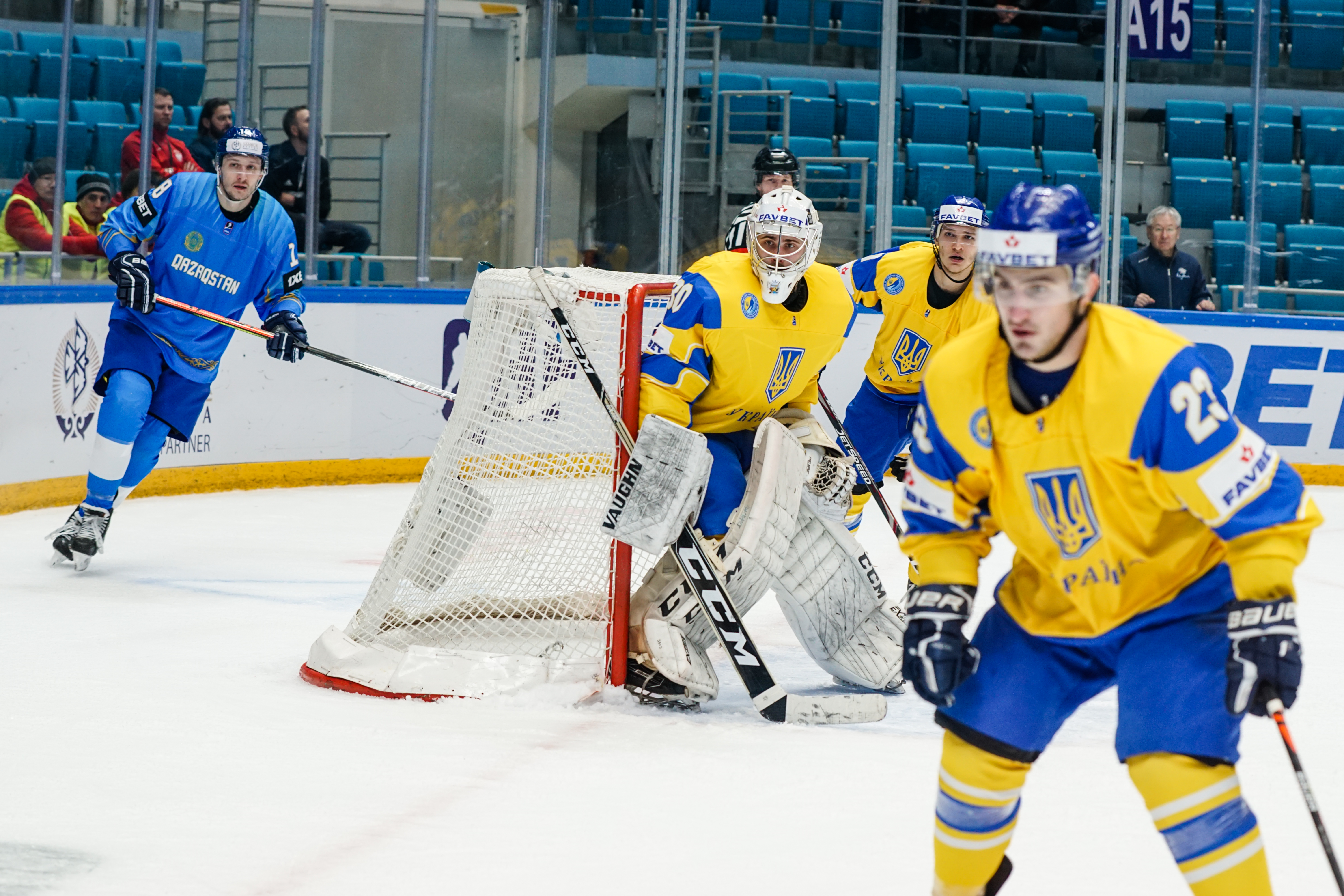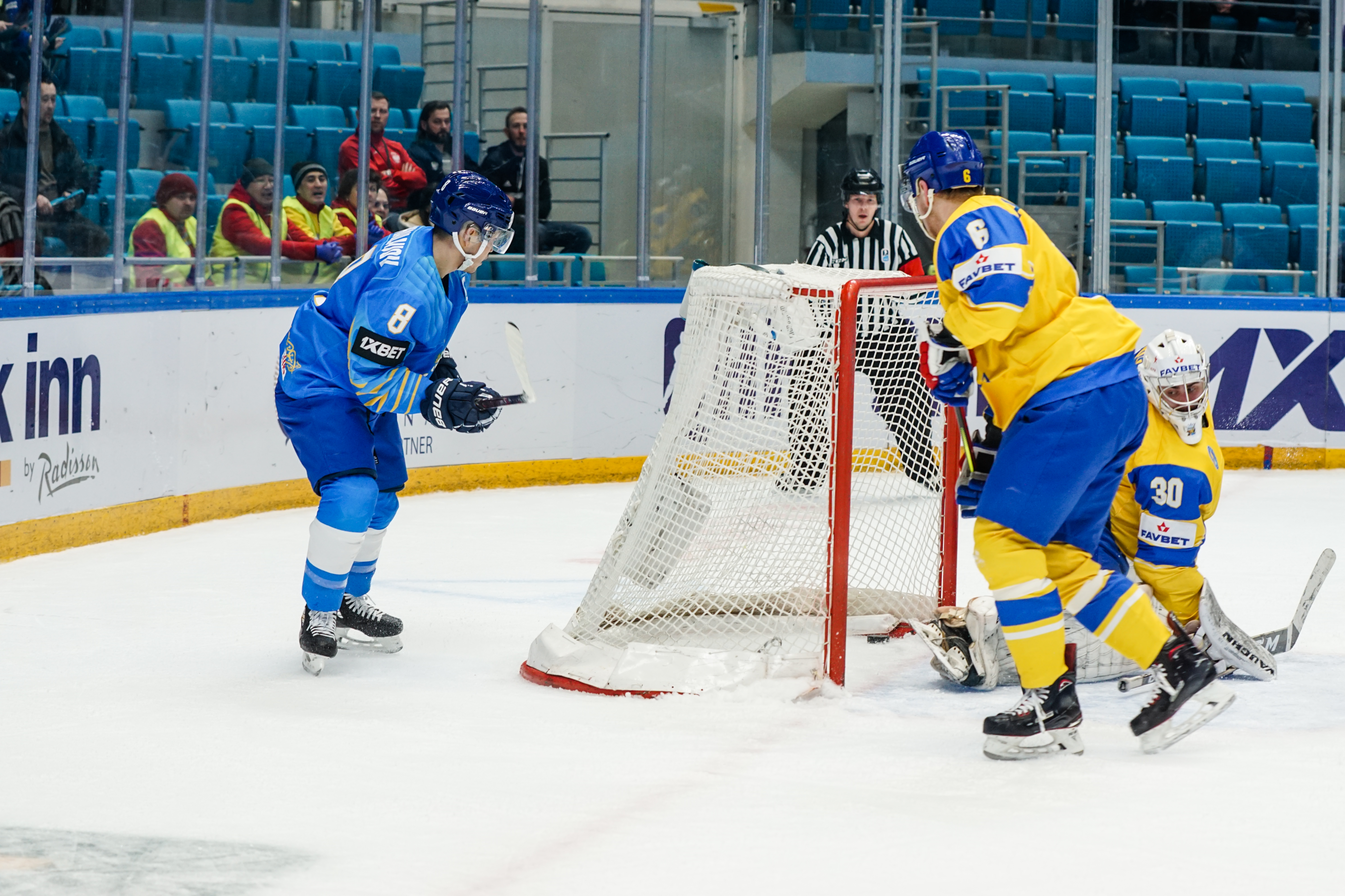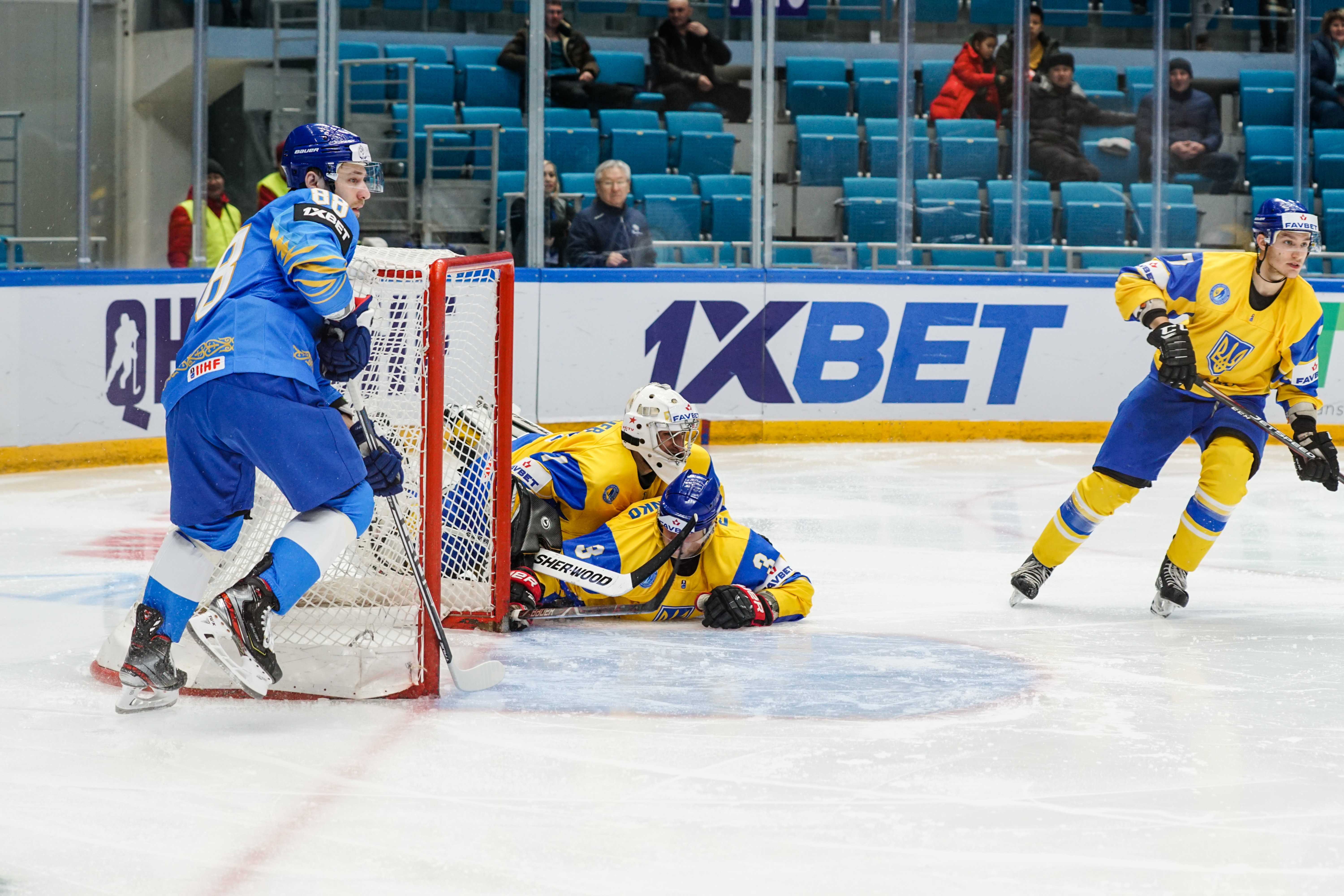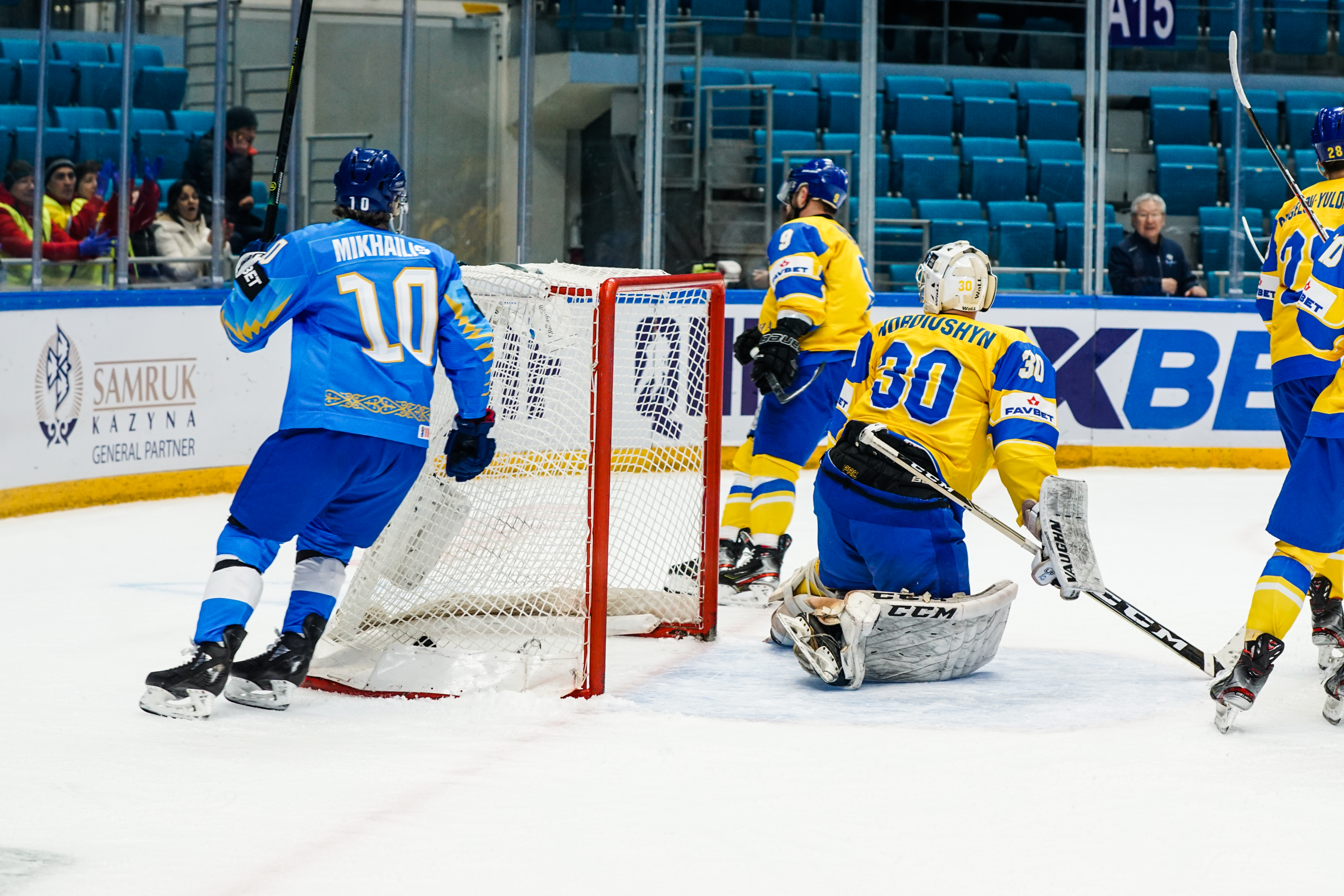 If there was anything to give the home fans pause for thought as they toasted a fine first period, it might have been a couple of defensive lapses. Although largely outplayed, Ukraine created three very clear chances, scoring one of them. Seconds after the opening goal, the Kazakh defence went walkabout to allow Olexander Kostikov a solo run on Henrik Karlsson’s net before his shot went high. In the 15th minute, Nikita Butsenko’s drop pass just inside the blue line invited Sergi Babynets to head for the danger zone and tuck away a wrister from between the hashmarks as the defence again failed to react. And late in the frame, Dmytro Nimenko stole the puck in the Kazakh zone, only to be denied by a blocker save from Karlsson.