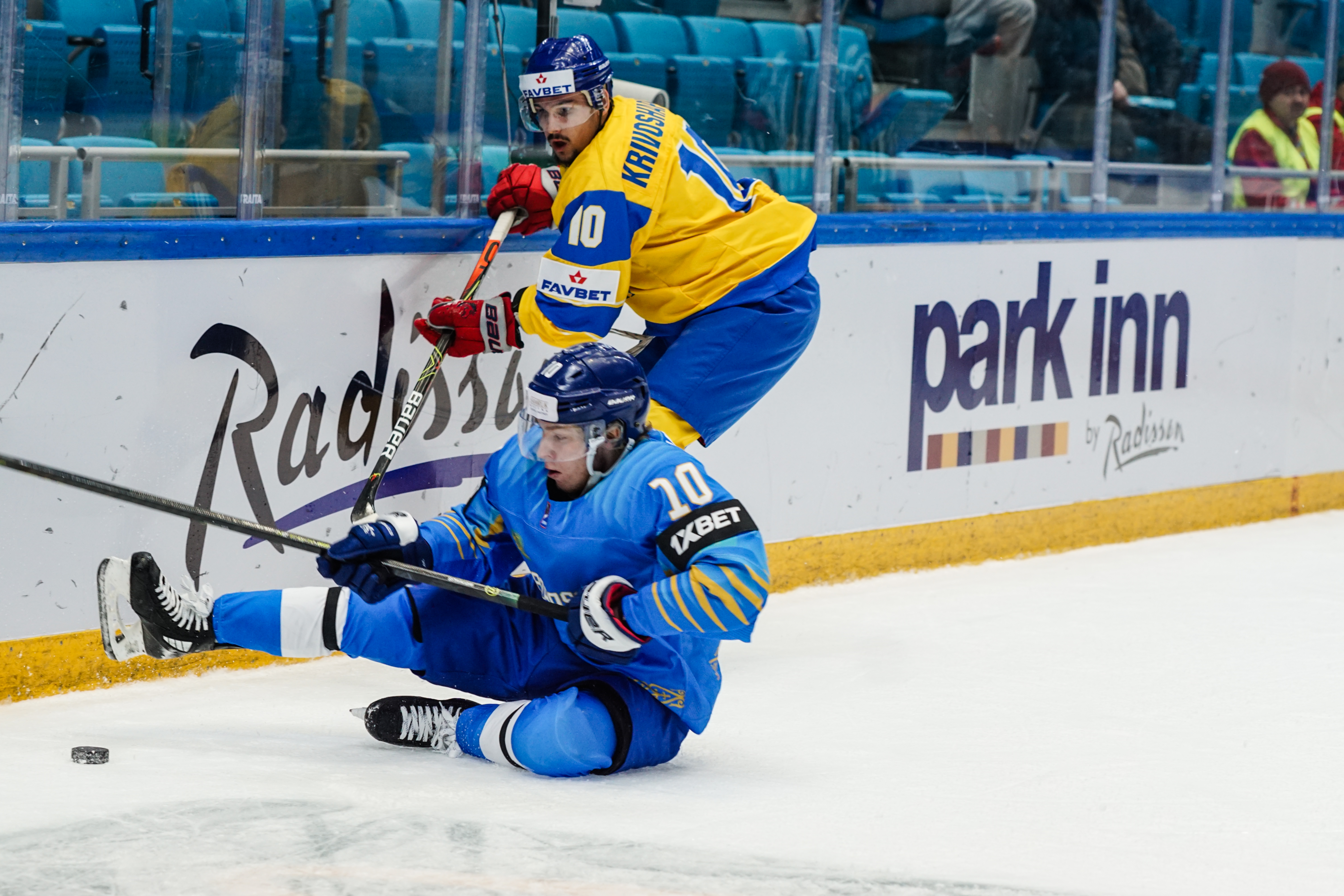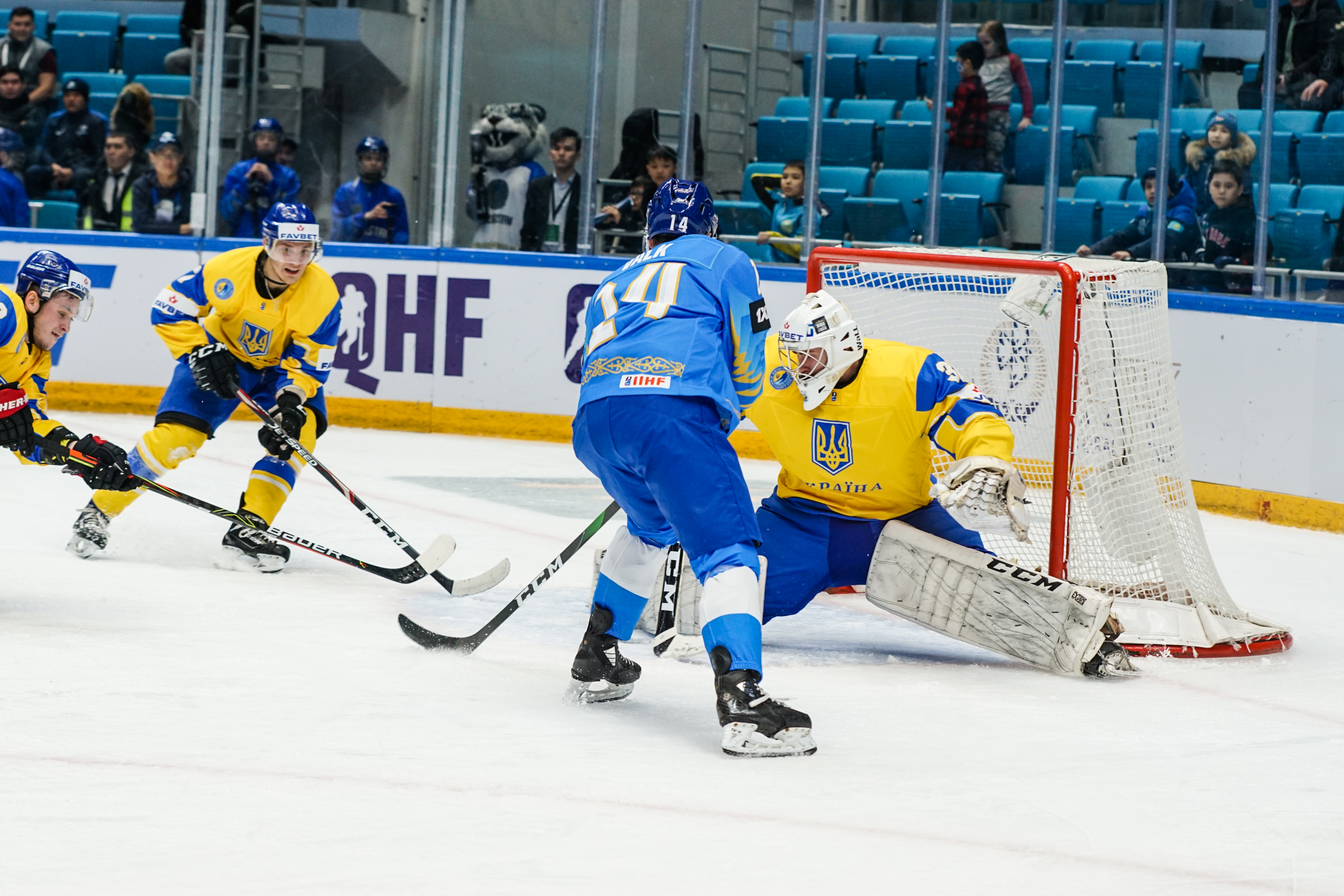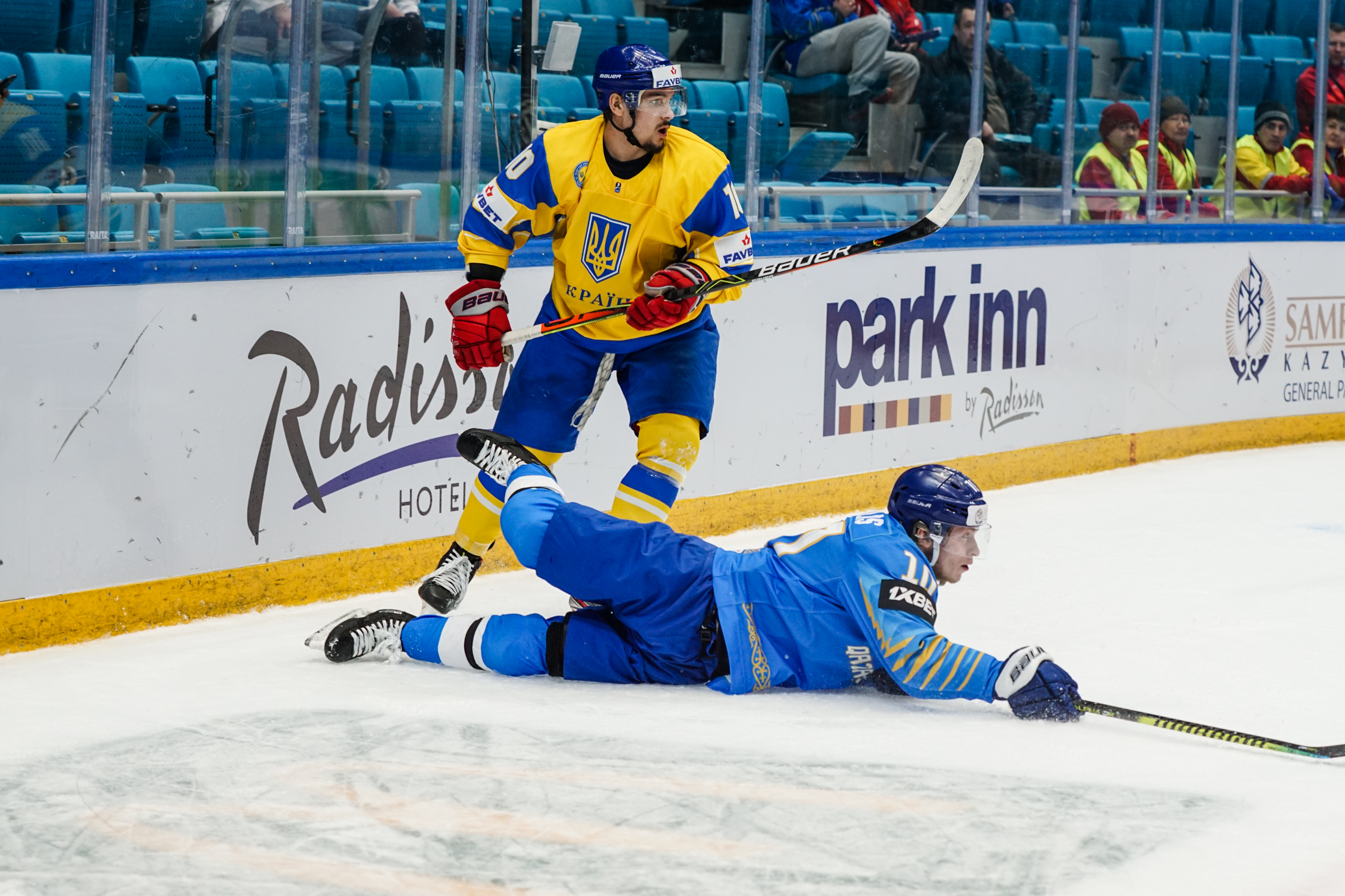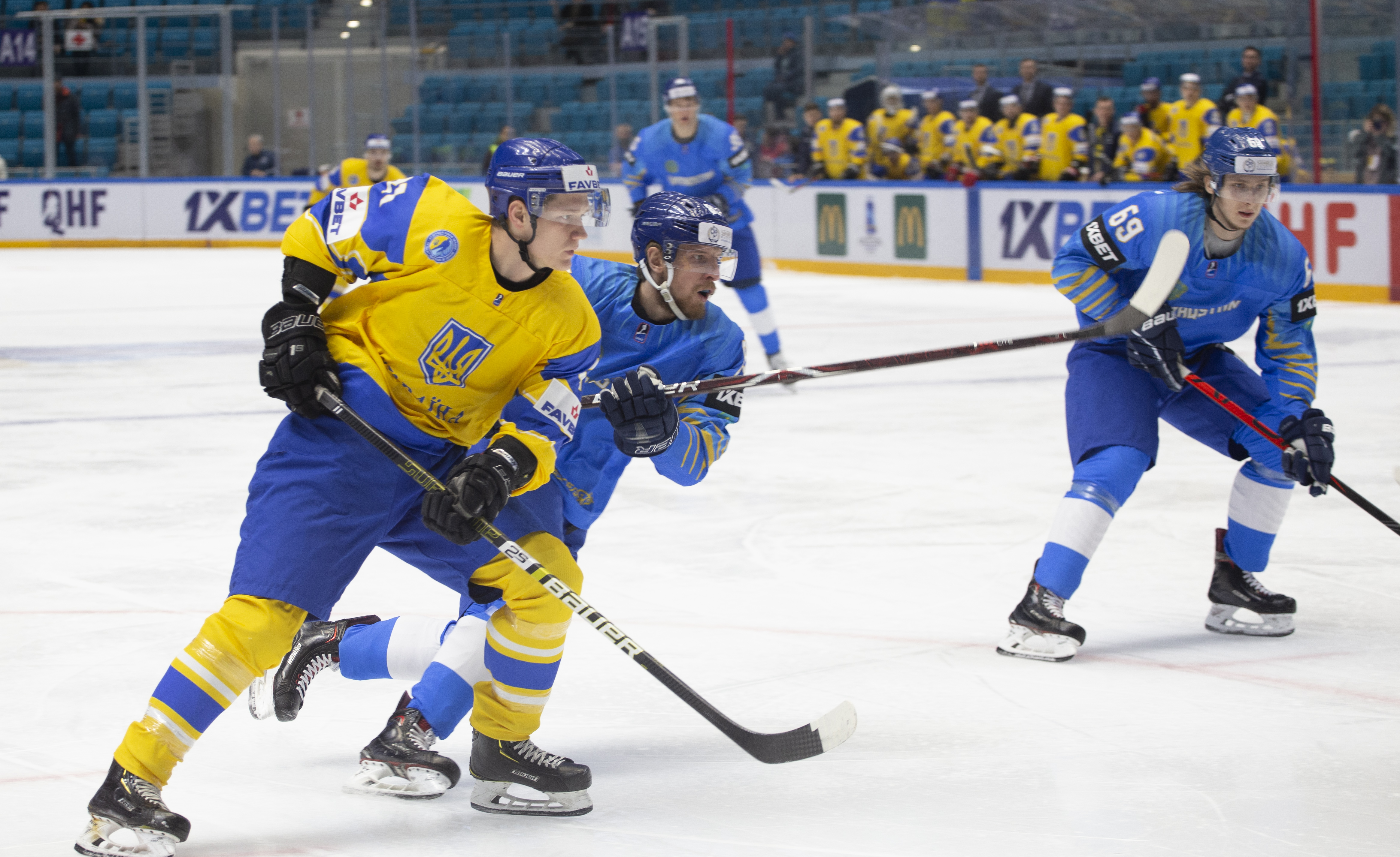 If there was anything to give the home fans pause for thought as they toasted a fine first period, it might have been a couple of defensive lapses. Although largely outplayed, Ukraine created three very clear chances, scoring one of them. Seconds after the opening goal, the Kazakh defence went walkabout to allow Olexander Kostikov a solo run on Henrik Karlsson’s net before his shot went high. In the 15th minute, Nikita Butsenko’s drop pass just inside the blue line invited Sergi Babynets to head for the danger zone and tuck away a wrister from between the hashmarks as the defence again failed to react. And late in the frame, Dmytro Nimenko stole the puck in the Kazakh zone, only to be denied by a blocker save from Karlsson.