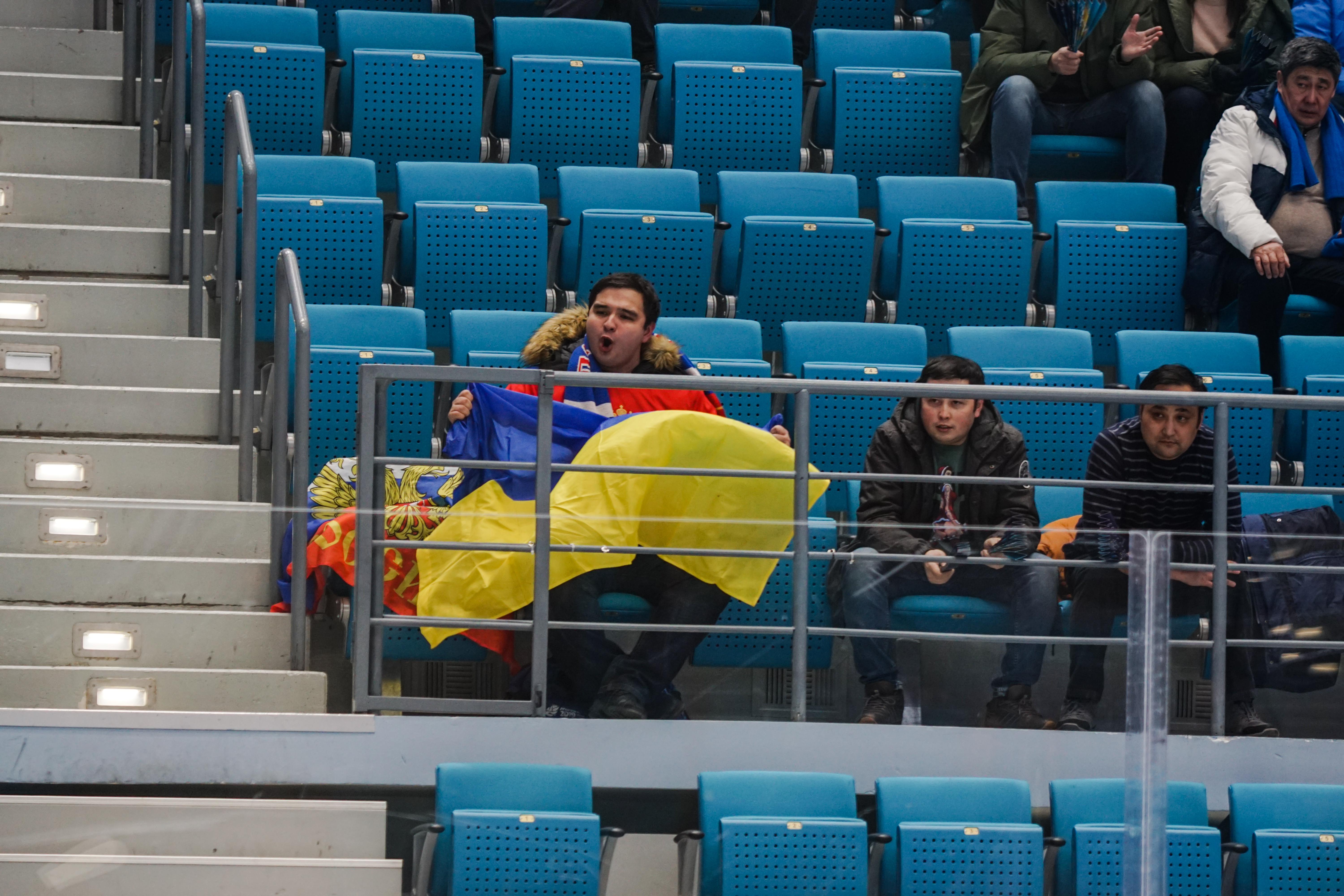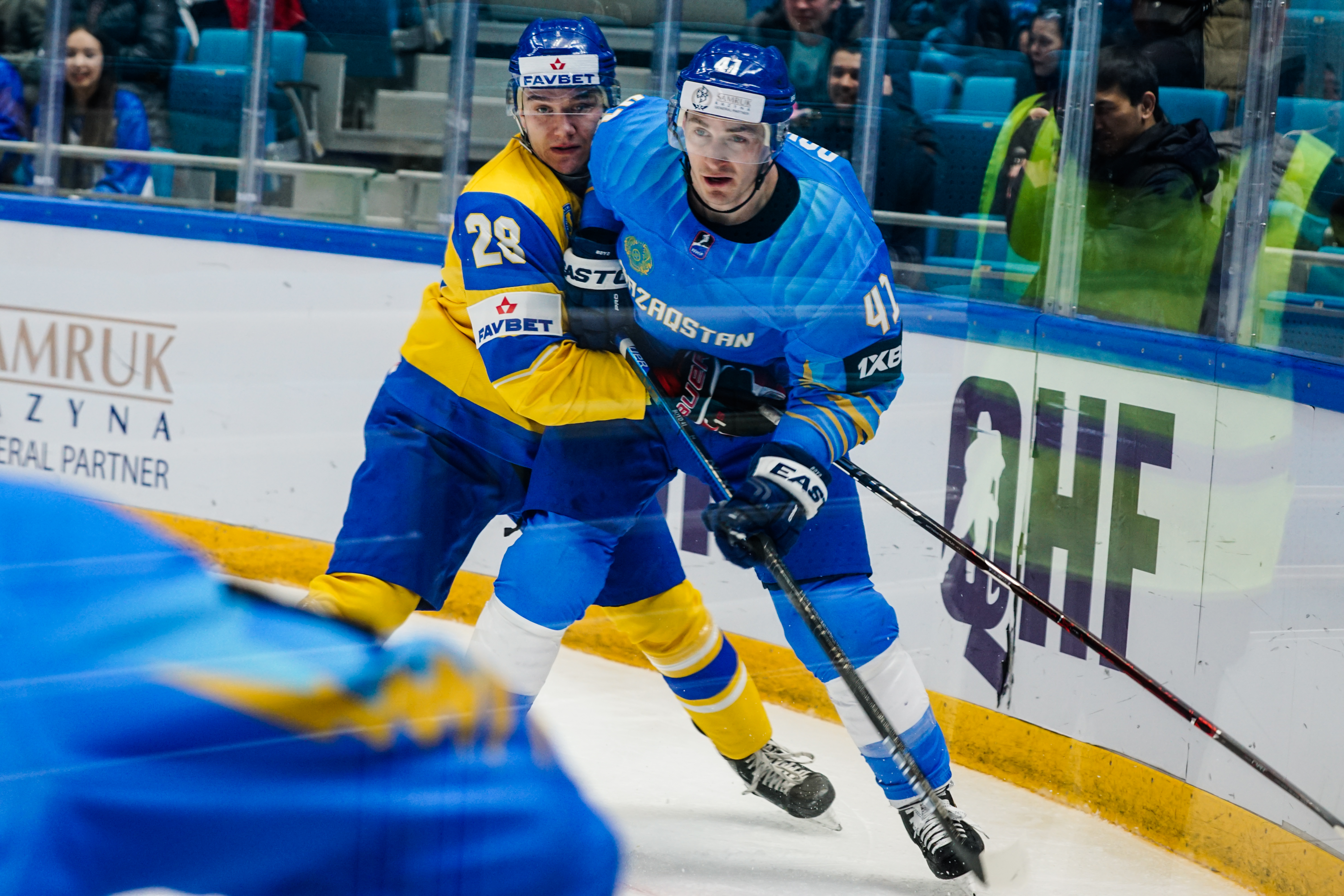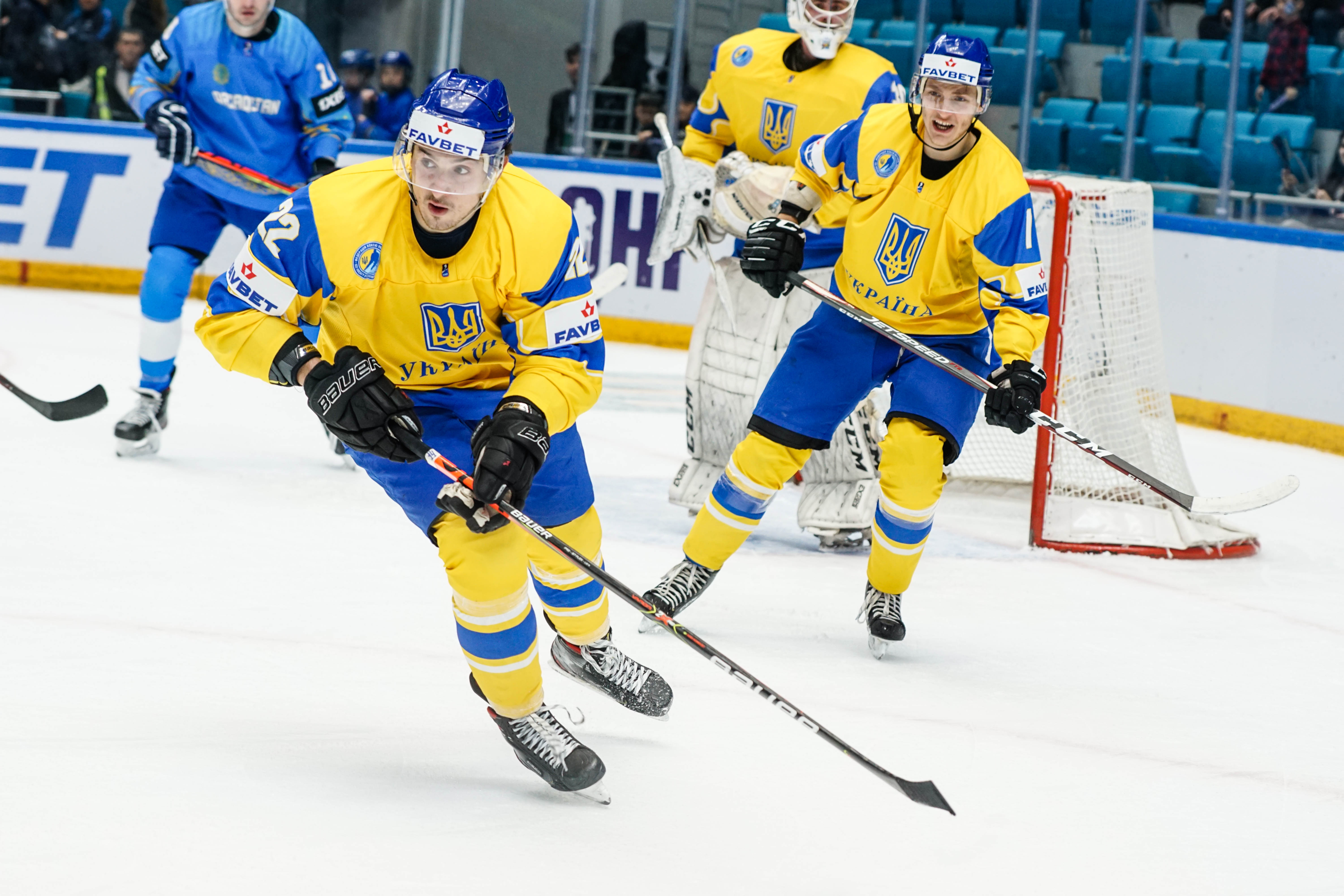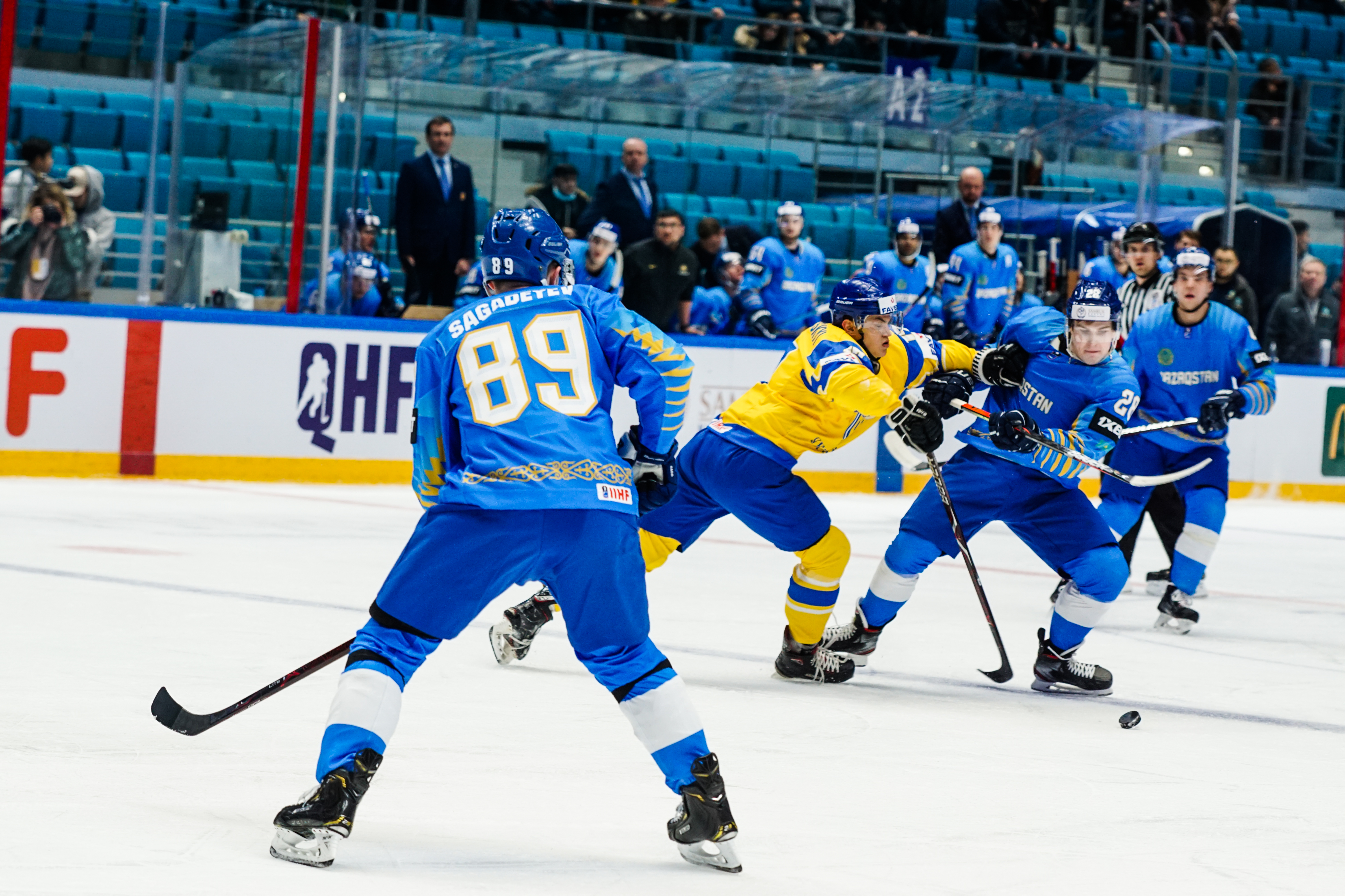 If there was anything to give the home fans pause for thought as they toasted a fine first period, it might have been a couple of defensive lapses. Although largely outplayed, Ukraine created three very clear chances, scoring one of them. Seconds after the opening goal, the Kazakh defence went walkabout to allow Olexander Kostikov a solo run on Henrik Karlsson’s net before his shot went high. In the 15th minute, Nikita Butsenko’s drop pass just inside the blue line invited Sergi Babynets to head for the danger zone and tuck away a wrister from between the hashmarks as the defence again failed to react. And late in the frame, Dmytro Nimenko stole the puck in the Kazakh zone, only to be denied by a blocker save from Karlsson.