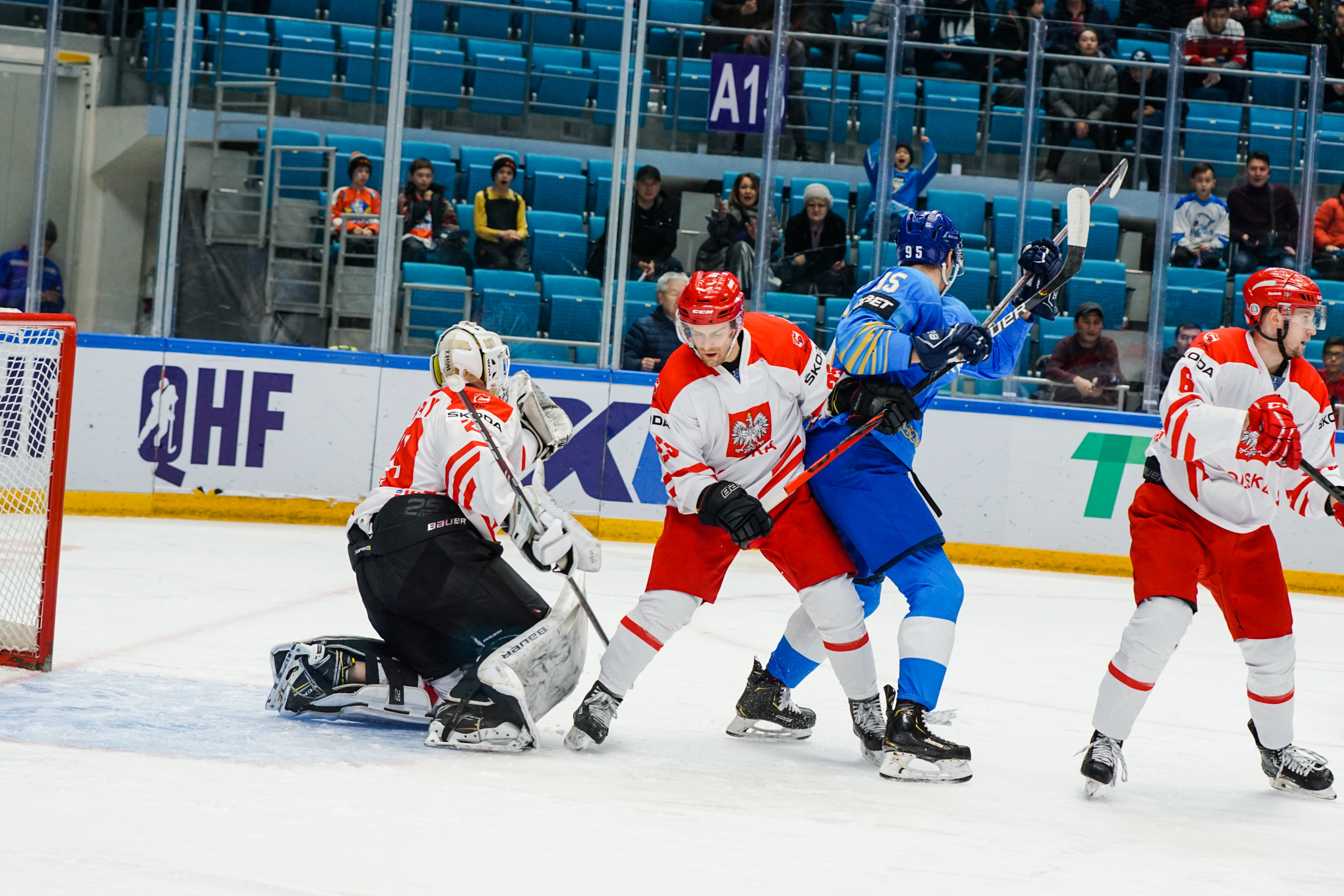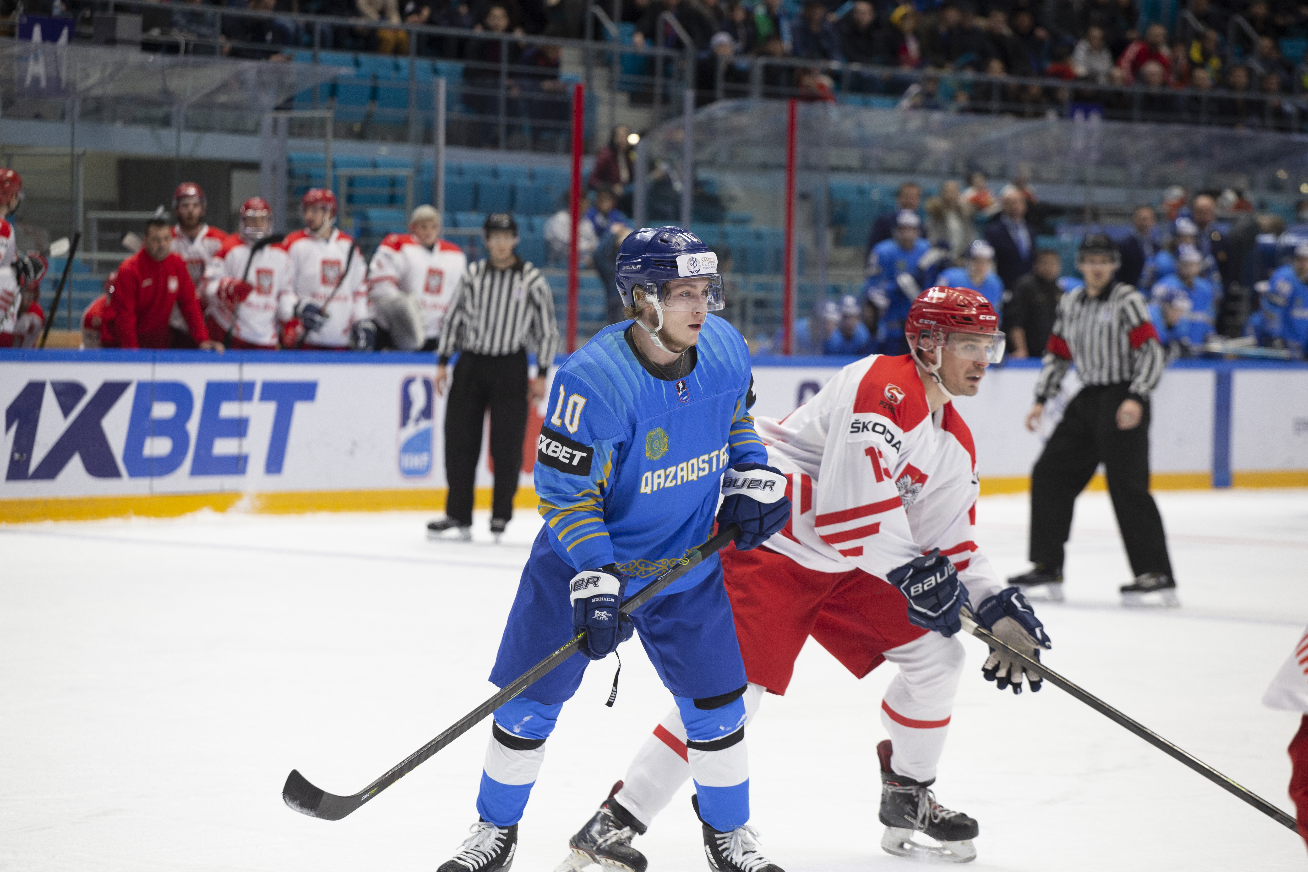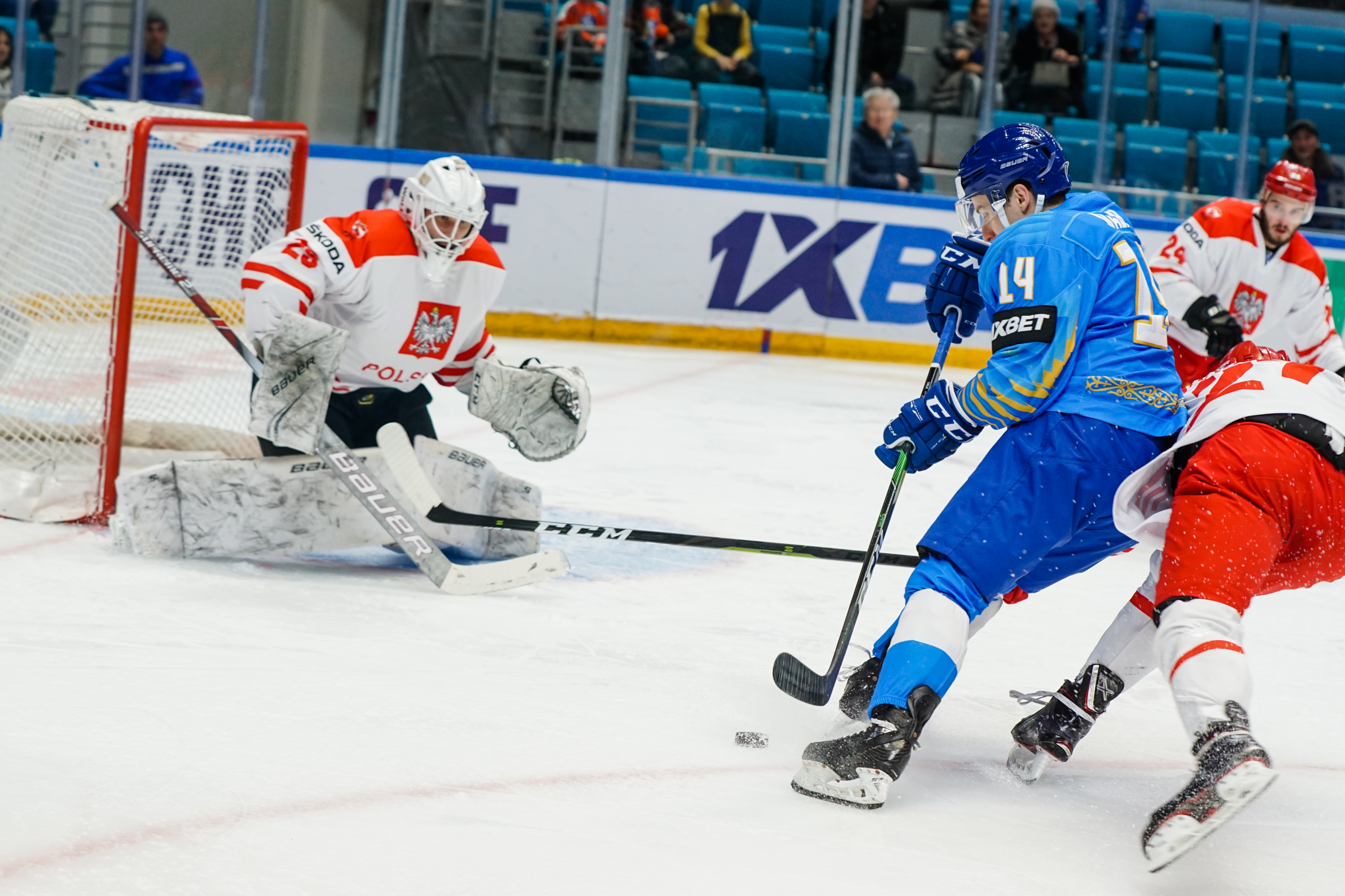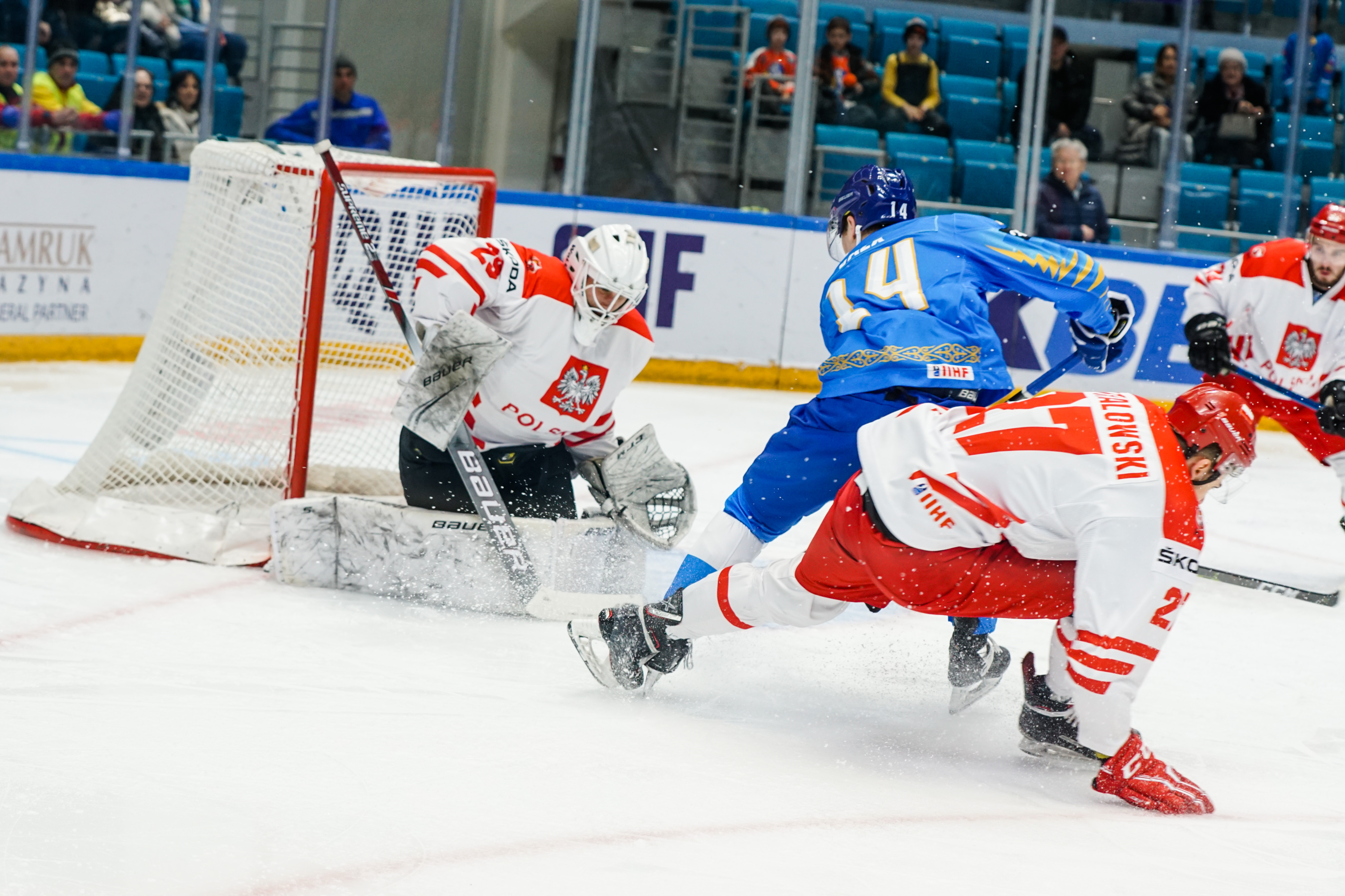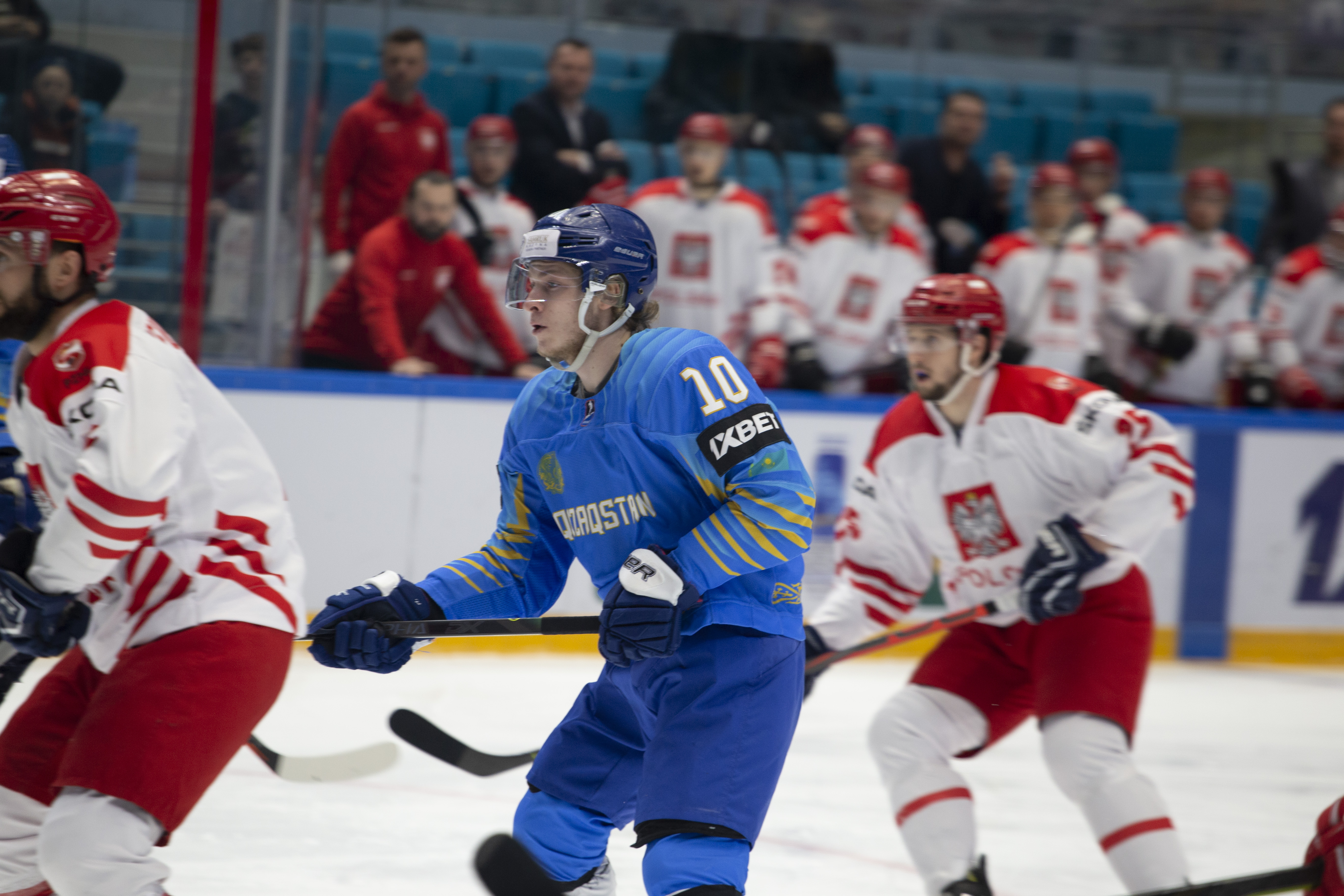 This was to be one his busier first periods: the home offence roared into action, moving the puck around at pace and penning the Poles into their zone. But, unlike the previous games, not scoring. Whether it was a Curtis Valk rush all the way to the paint or a shot from Yegor Petukhov that bounced off a Polish skate and off the post to safety, Kazakhstan was close, but not close enough.