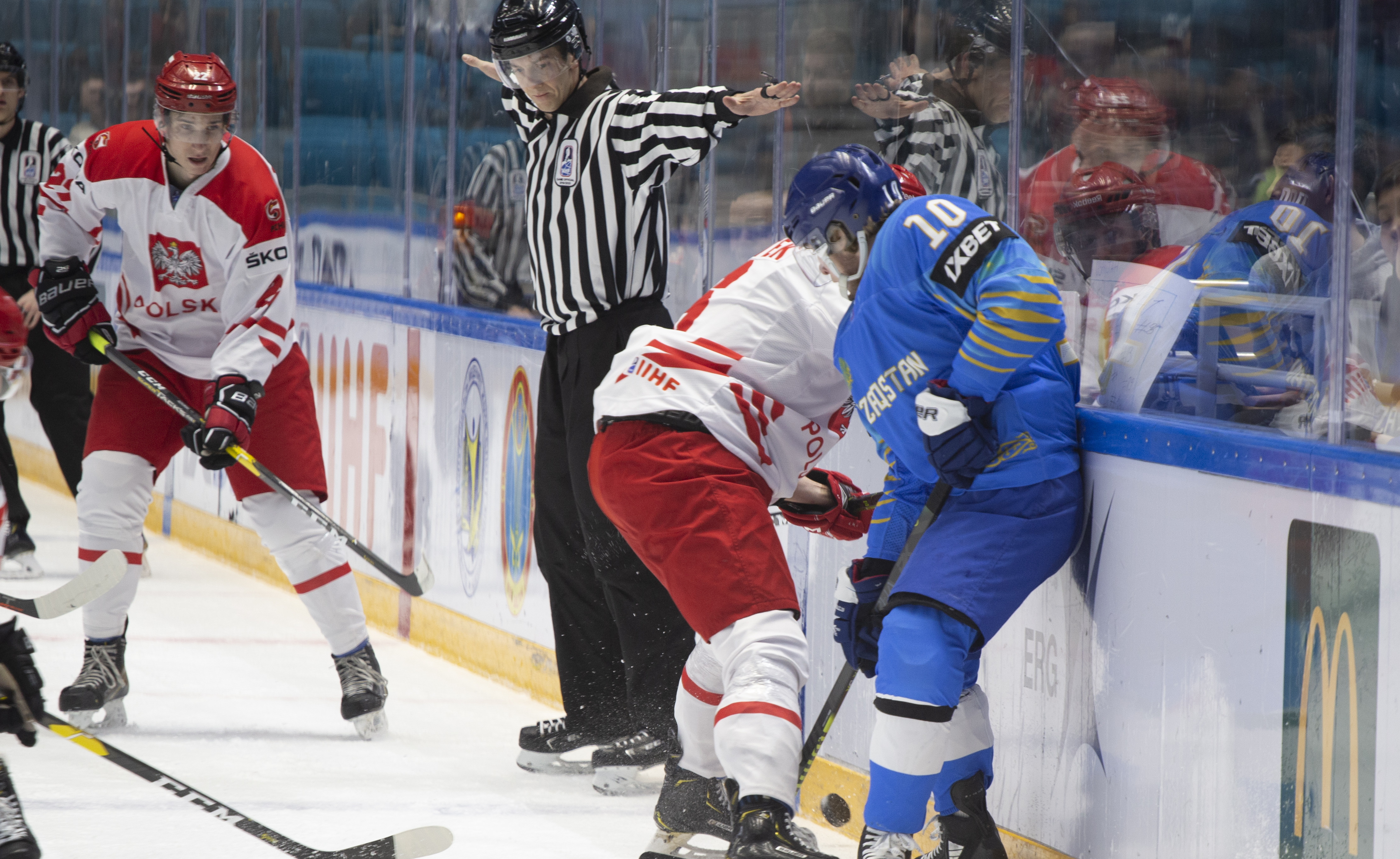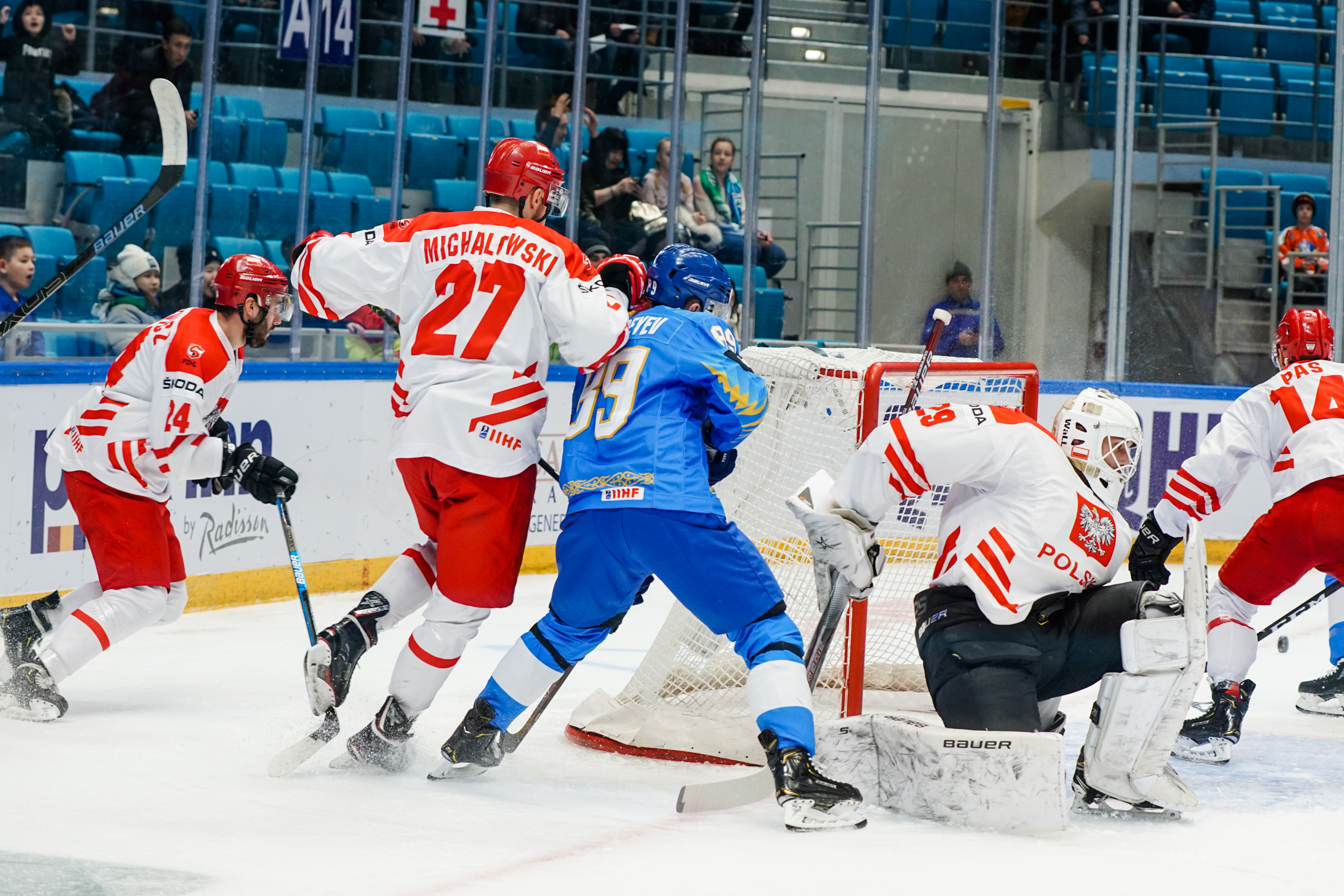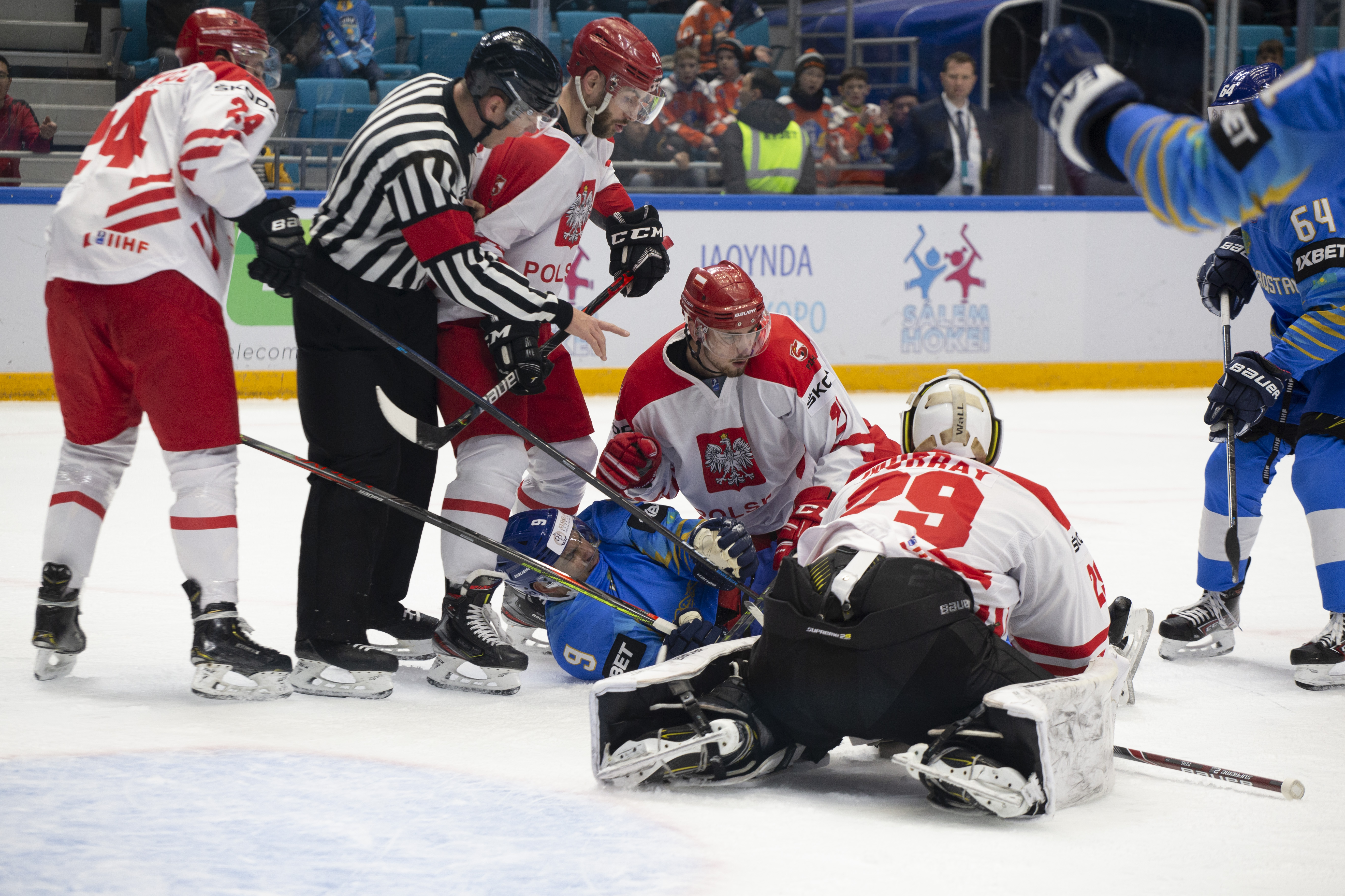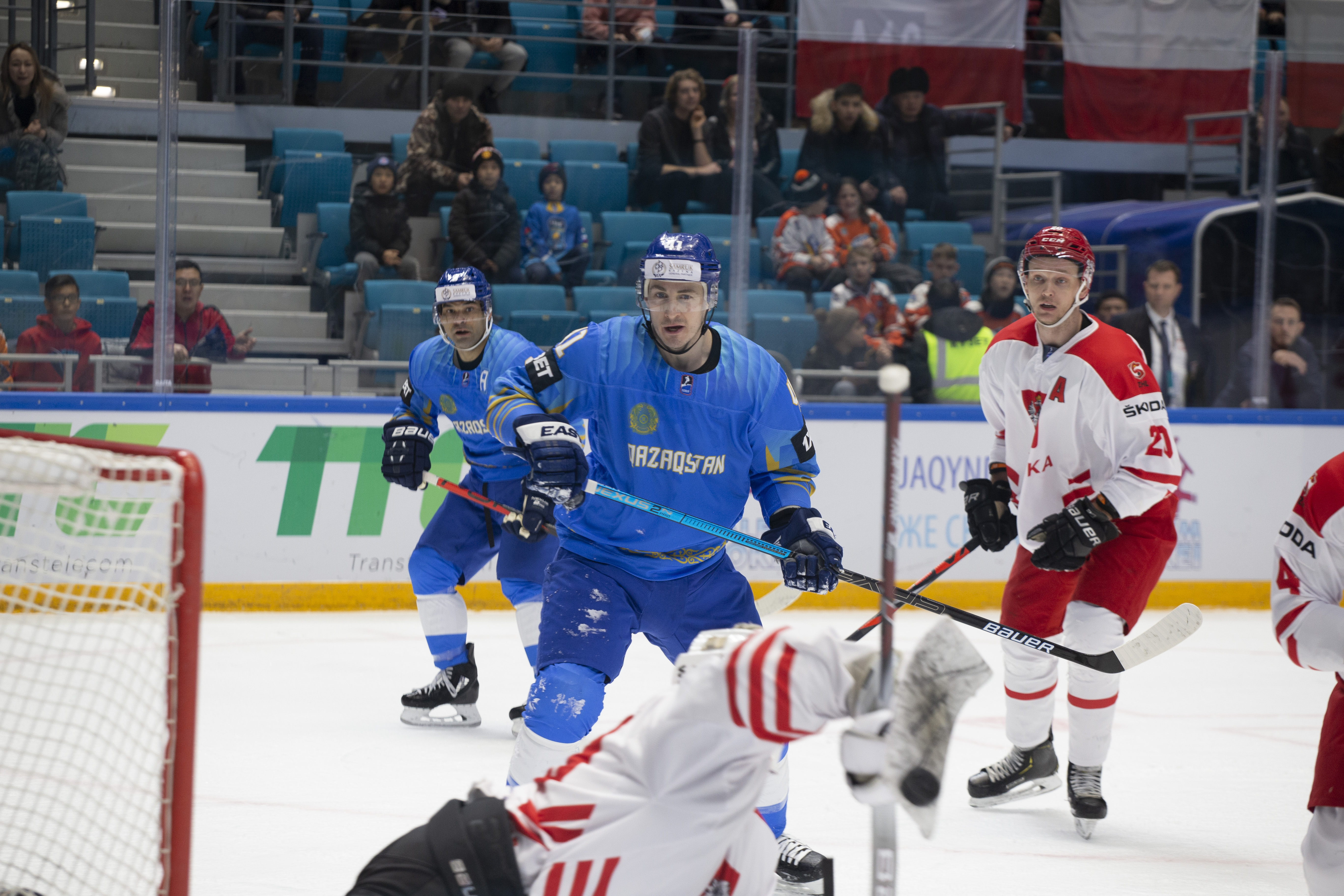 This was to be one his busier first periods: the home offence roared into action, moving the puck around at pace and penning the Poles into their zone. But, unlike the previous games, not scoring. Whether it was a Curtis Valk rush all the way to the paint or a shot from Yegor Petukhov that bounced off a Polish skate and off the post to safety, Kazakhstan was close, but not close enough.