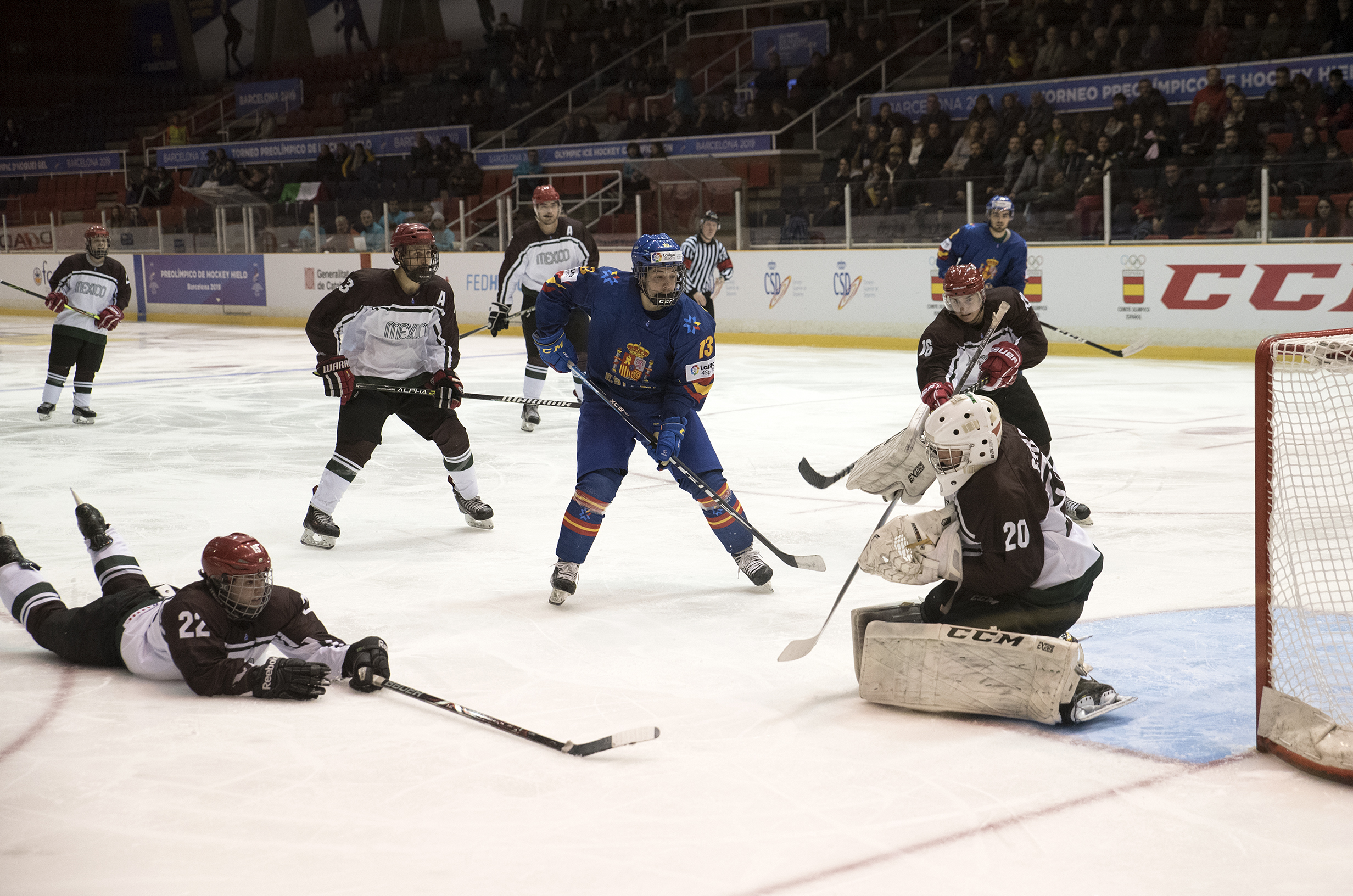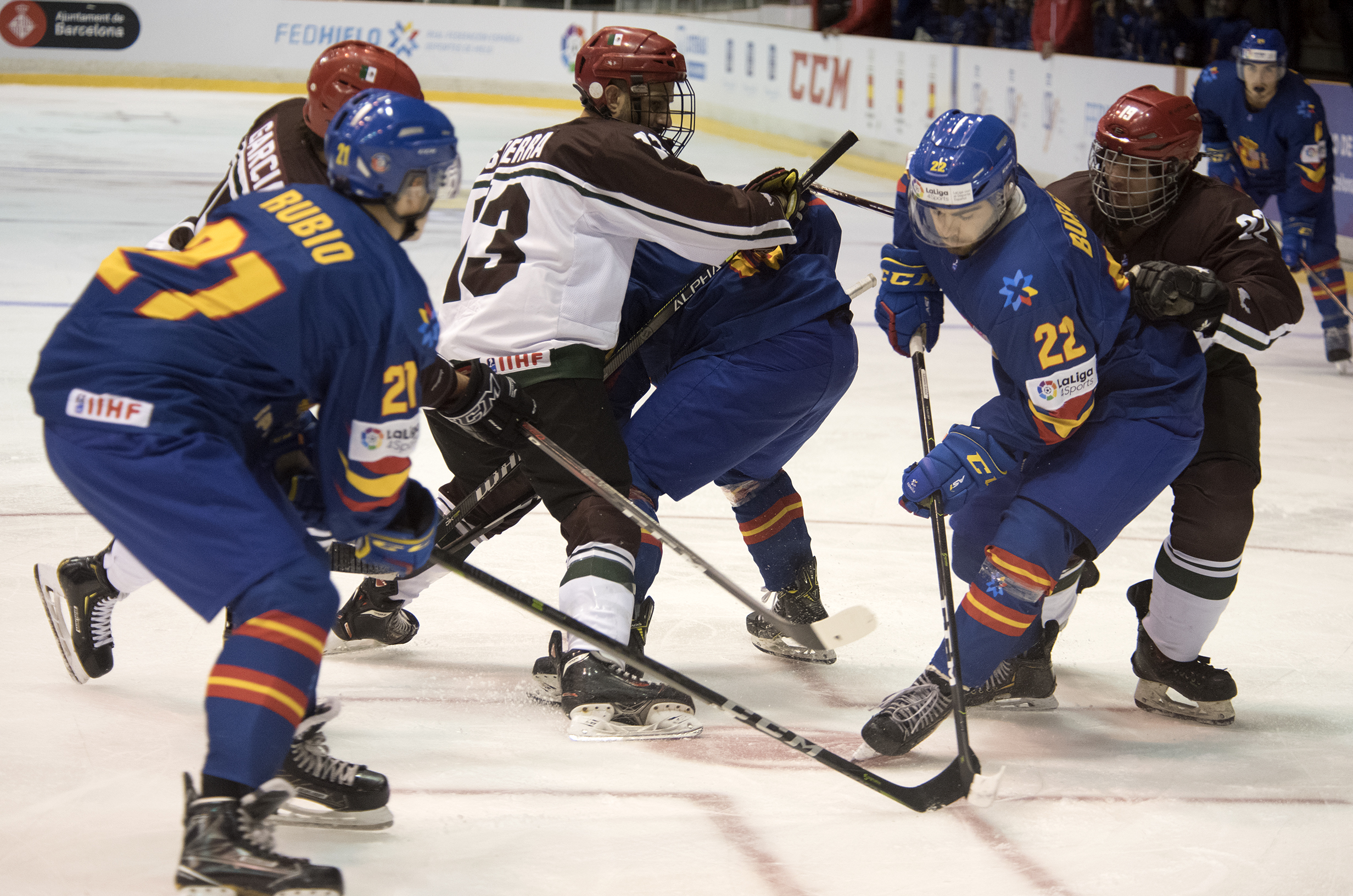 While Mexico’s offensive ambitions were creditable, some of its defence would prove overly hesitant. And that allowed Spain to seize the initiative late in the first frame. Barely two minutes after that tying goal, the visiting D dozed off and allowed Imanol Lasuen to advance unimpeded down the left before heading to the net and beating Gerardo Garcia de Valle up close. Less than a minute later it was 3-1 as Bruno Baldris spotted Oriol Boronel in acres of space in that left channel. Spain’s captain unleashed his wrister from the inside of the circle and potted his team’s second power play goal.