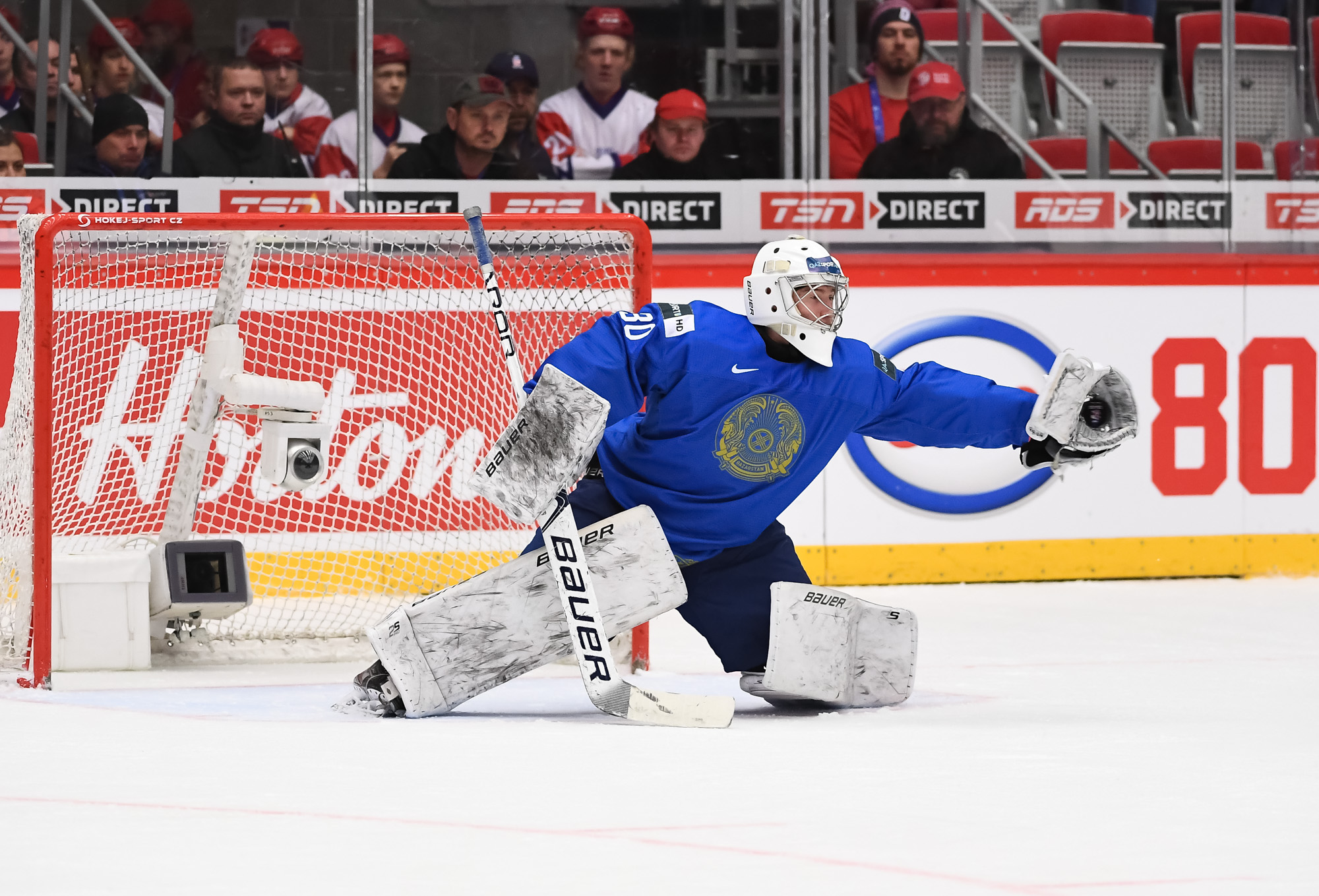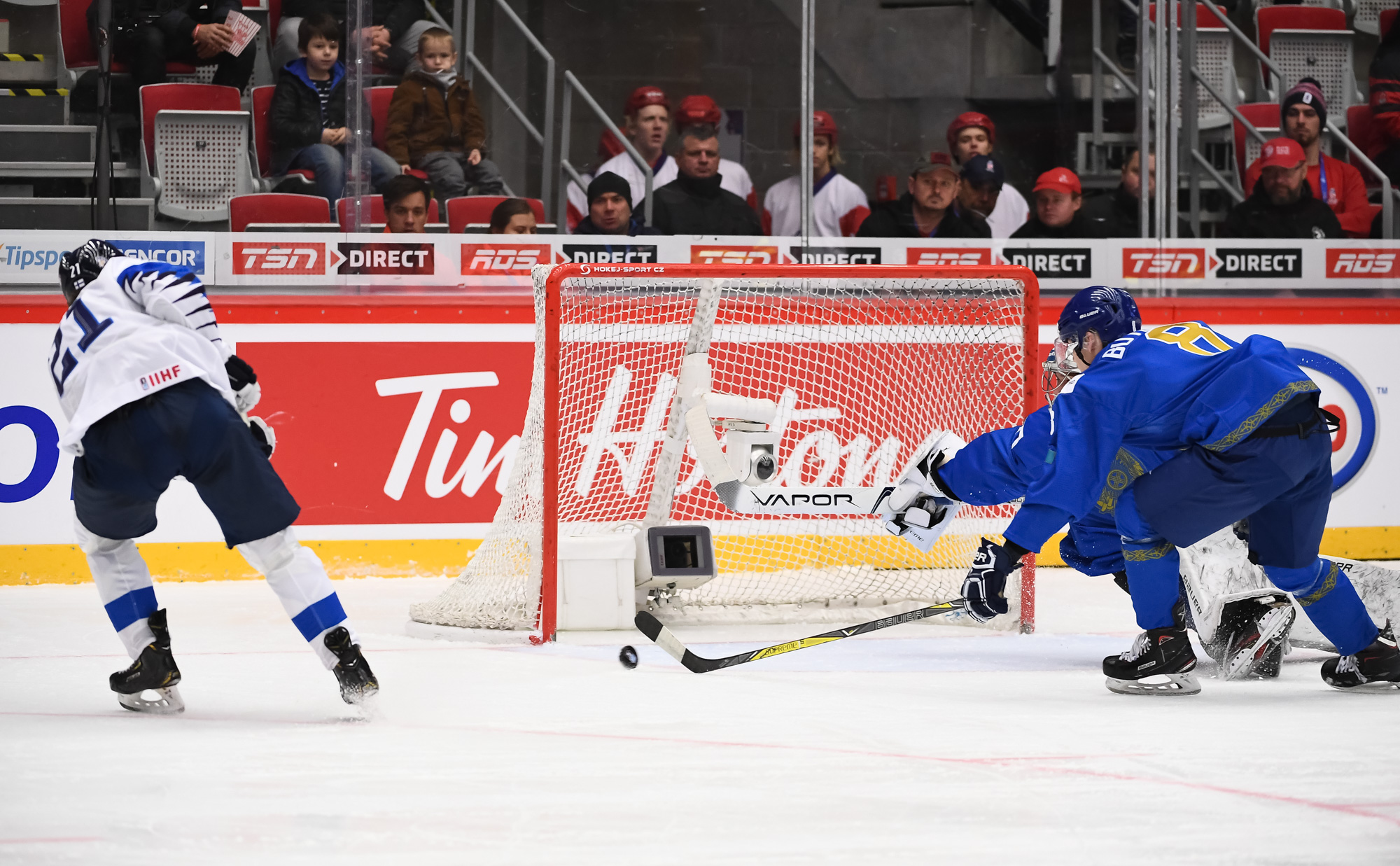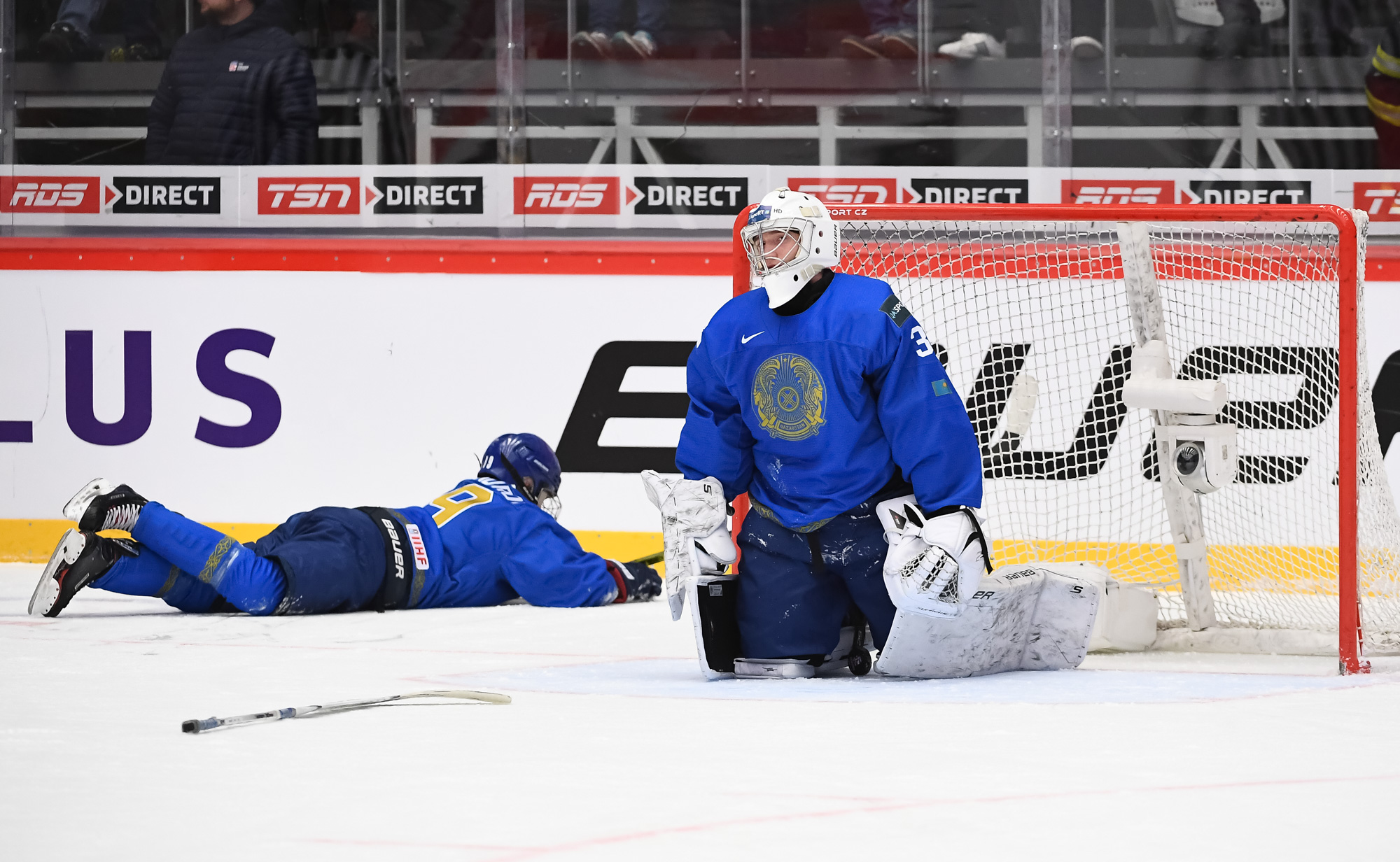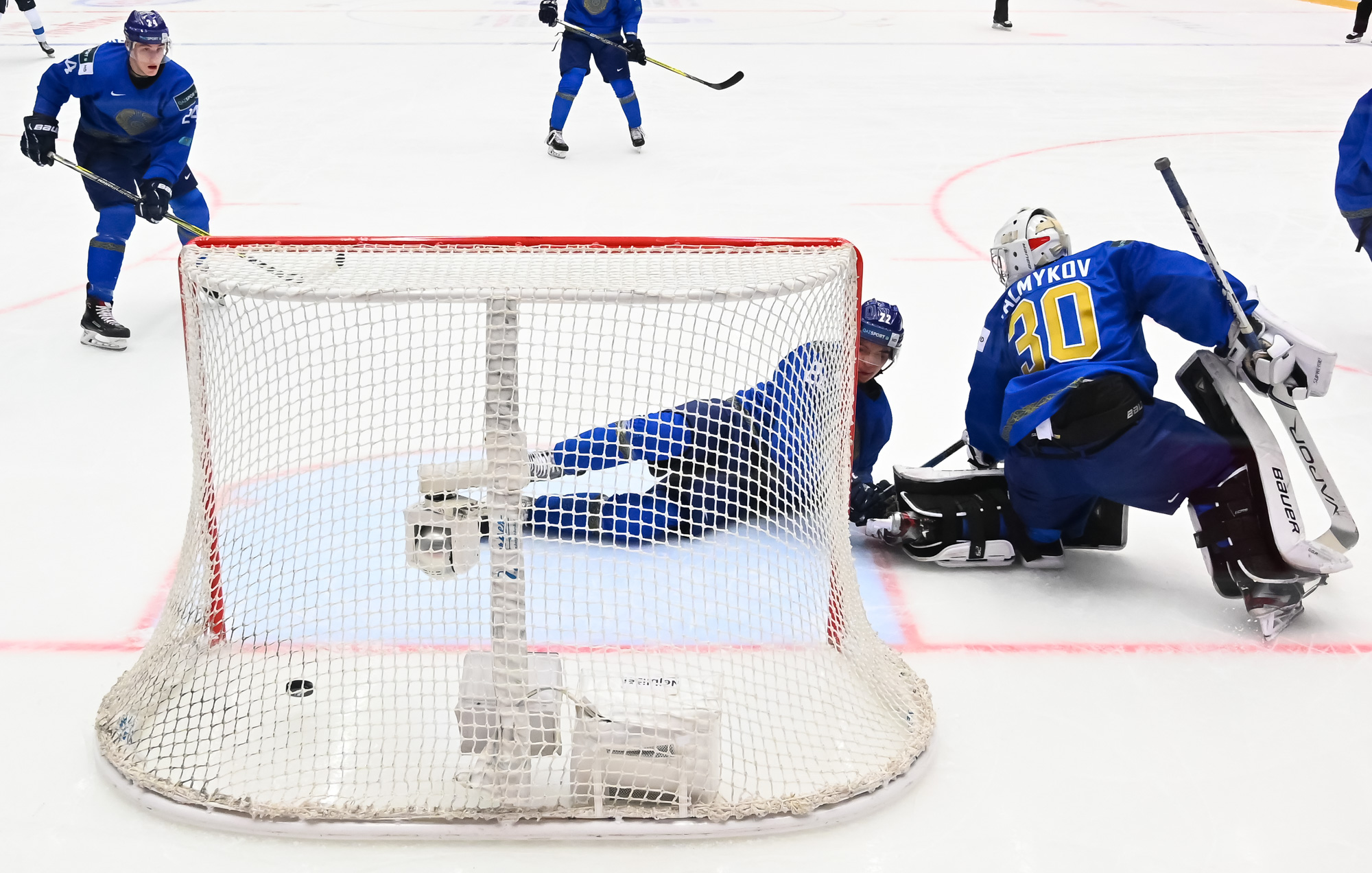 At 10:13, Kazakhstan struck back with the man advantage. Buyalski had time to line up his shot from the right faceoff circle, and it was a doozy, right under the bar, for his first of the tournament. The 19-year-old forward had a goal and an assist at the 2019 World Juniors.