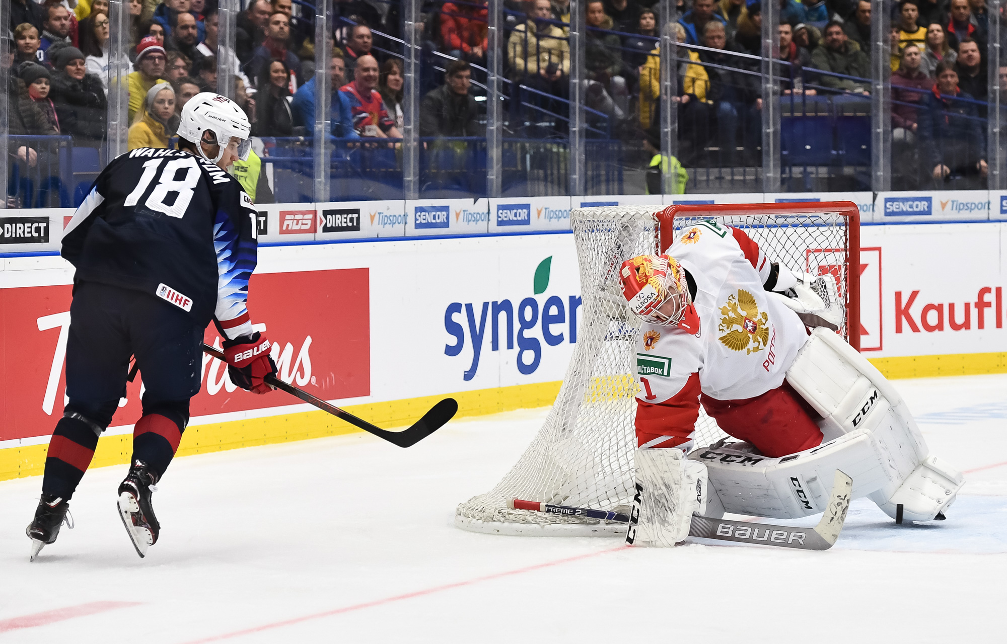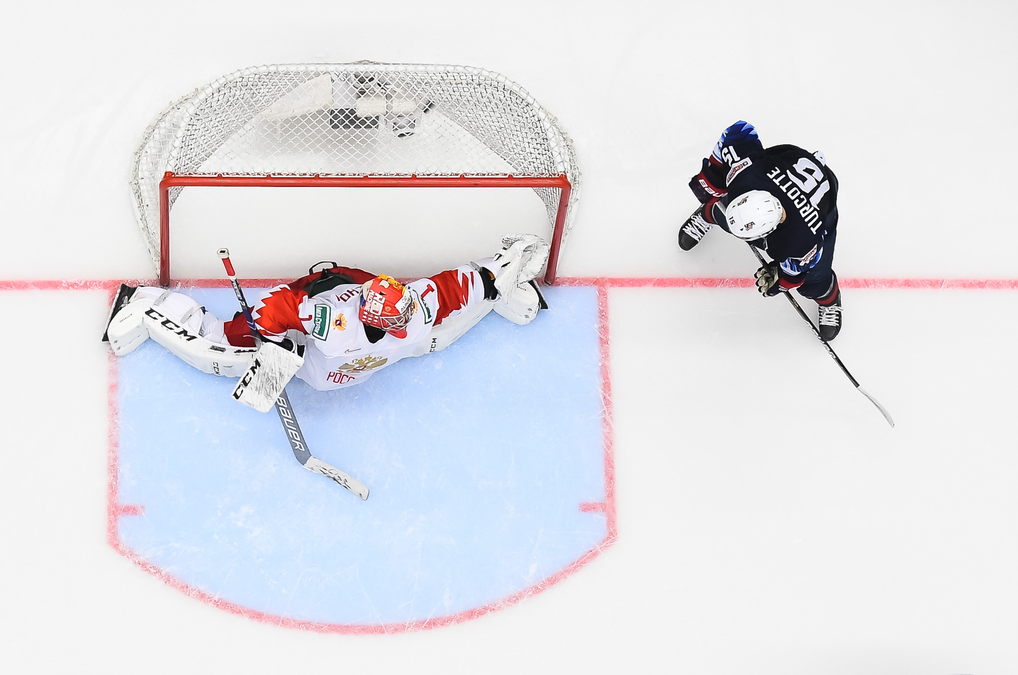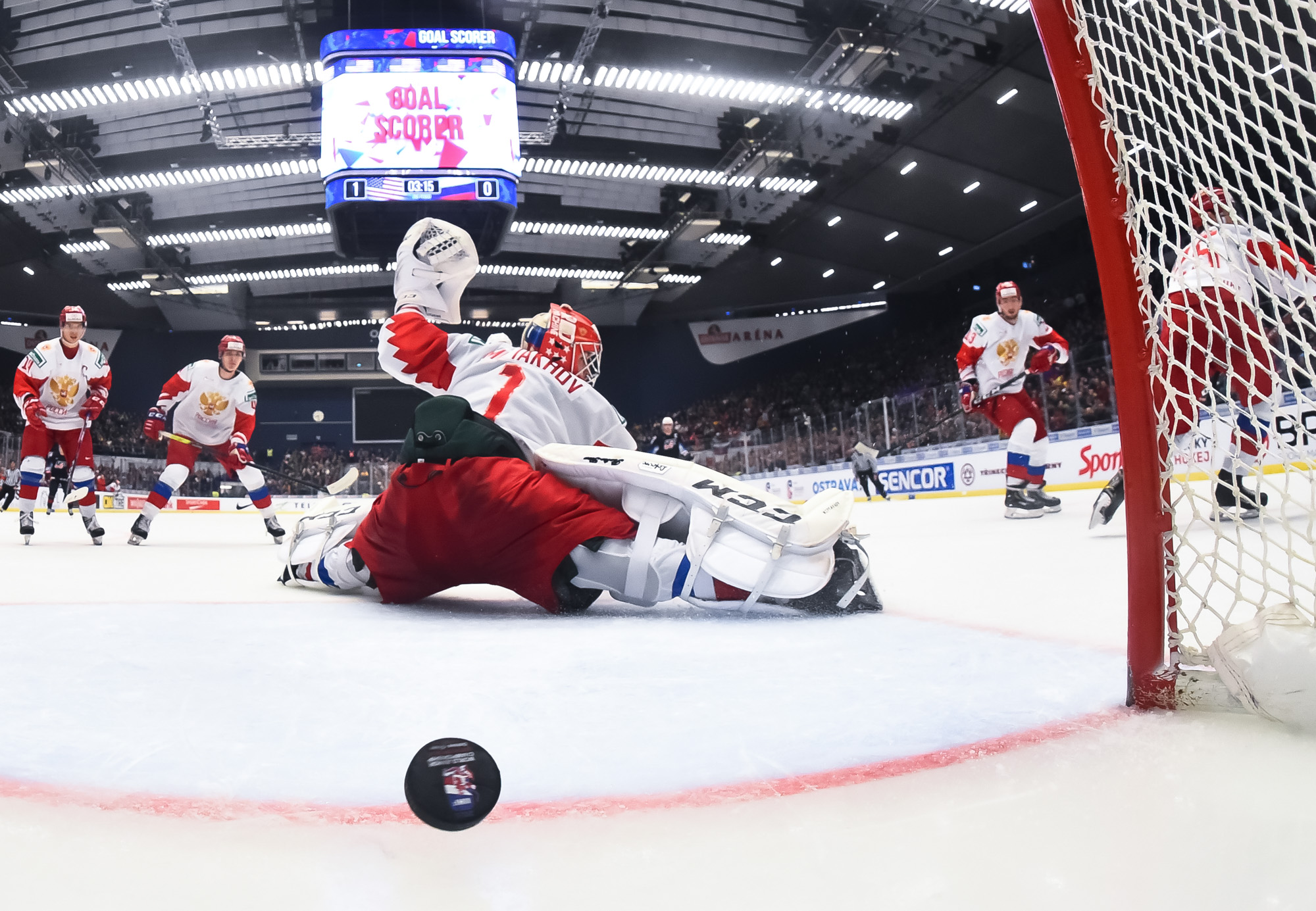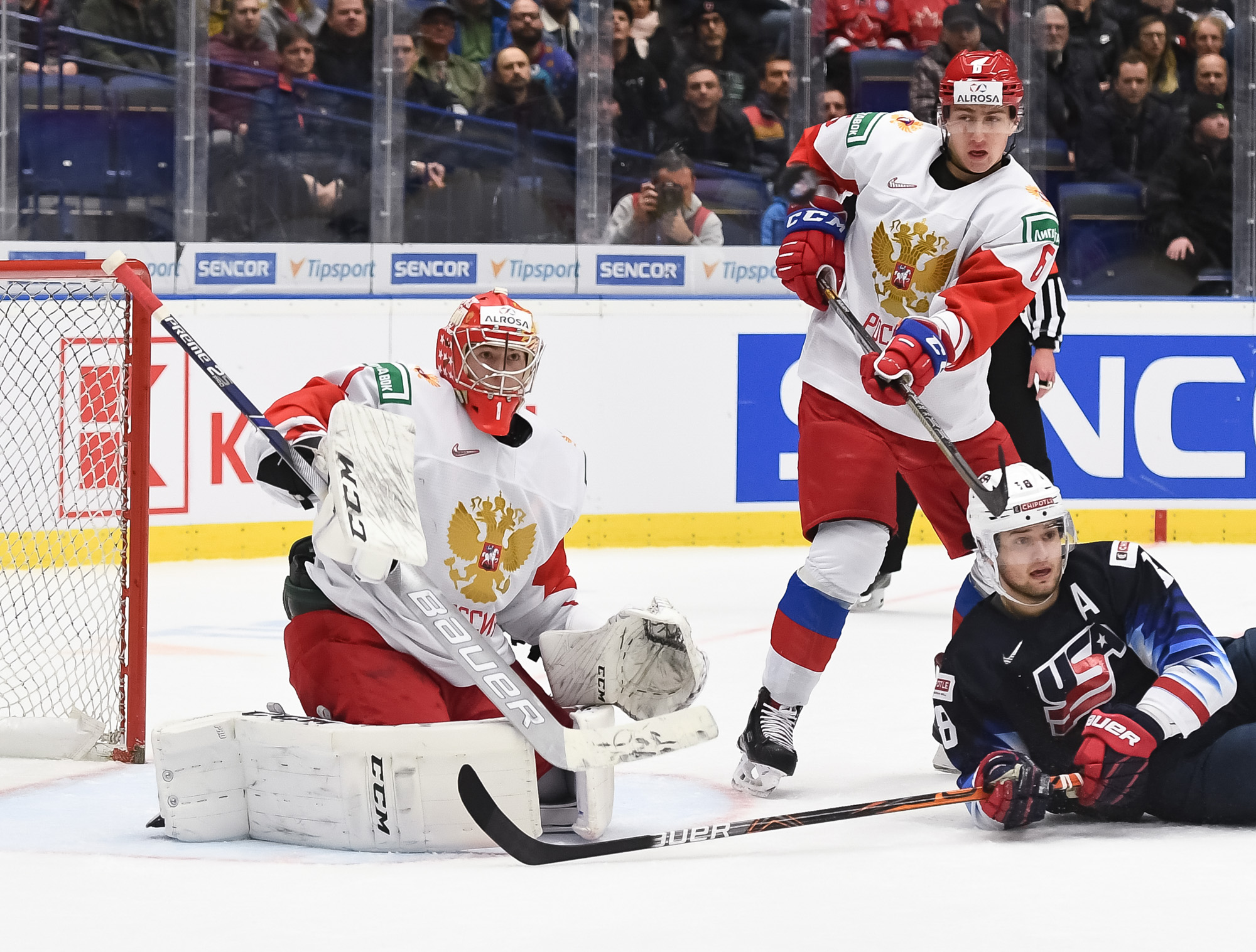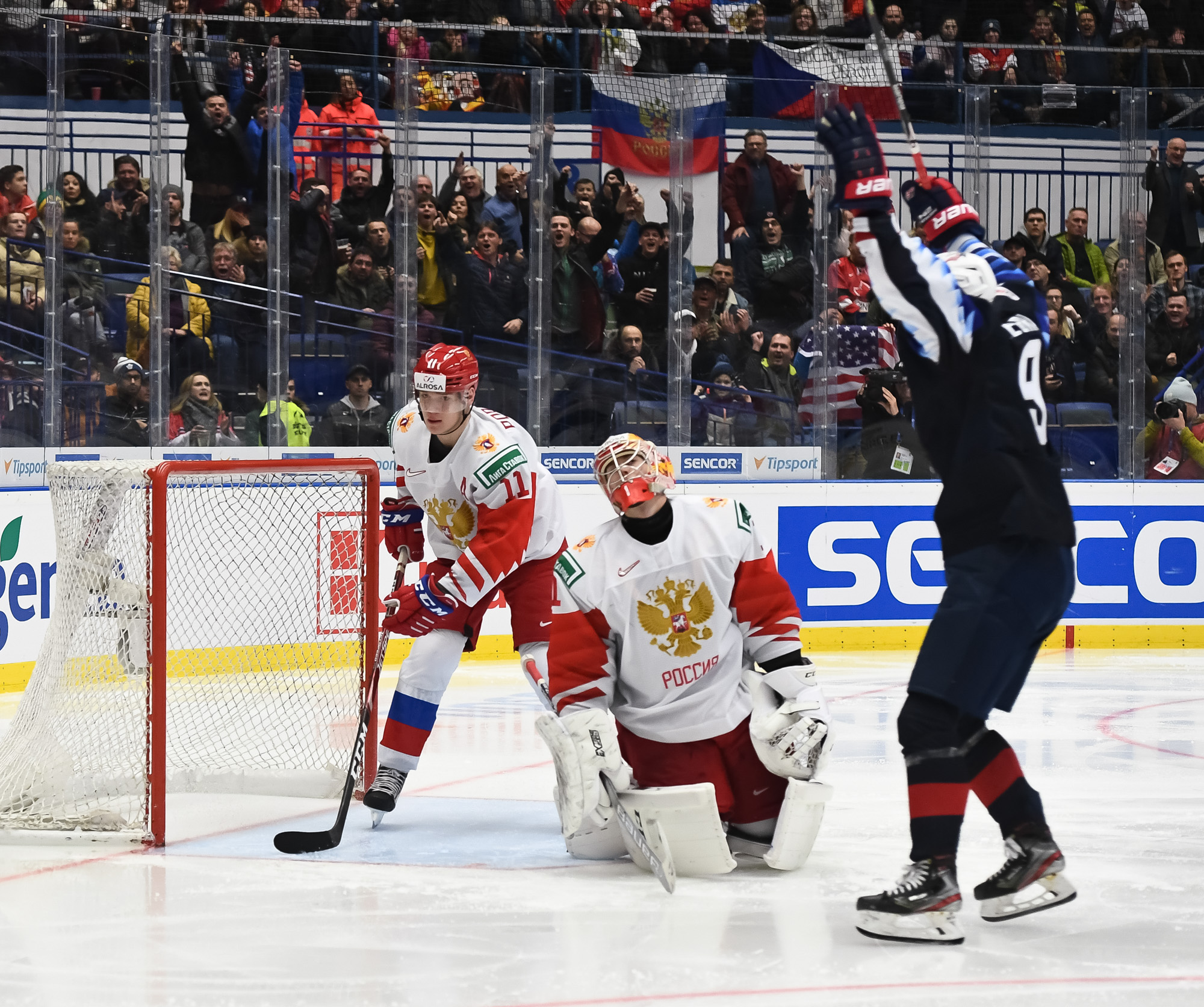 The turning point came late in the period during a U.S. power play, one of four they enjoyed in the middle 20 (the Russians had three). The Russians broke out after a turnover and created an odd-man rush, and Maxim Sorkin found himself taking a cross-ice pass looking at an empty net. He failed to connect, however, and the Americans came down the ice and scored.
