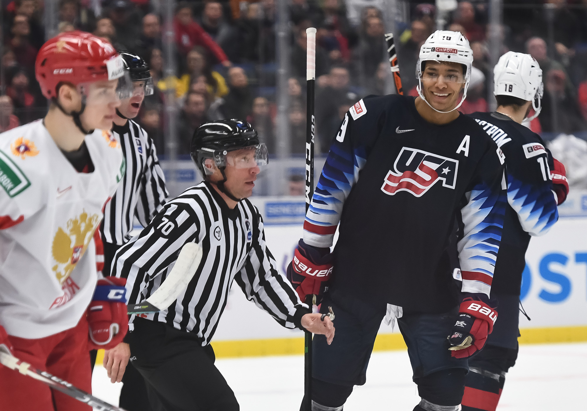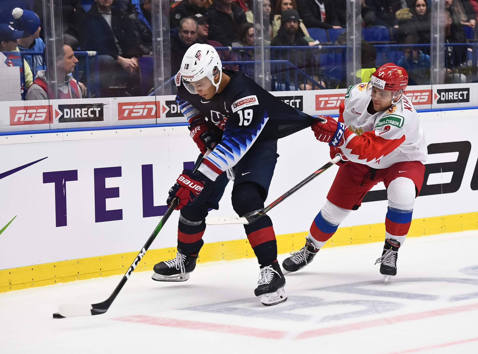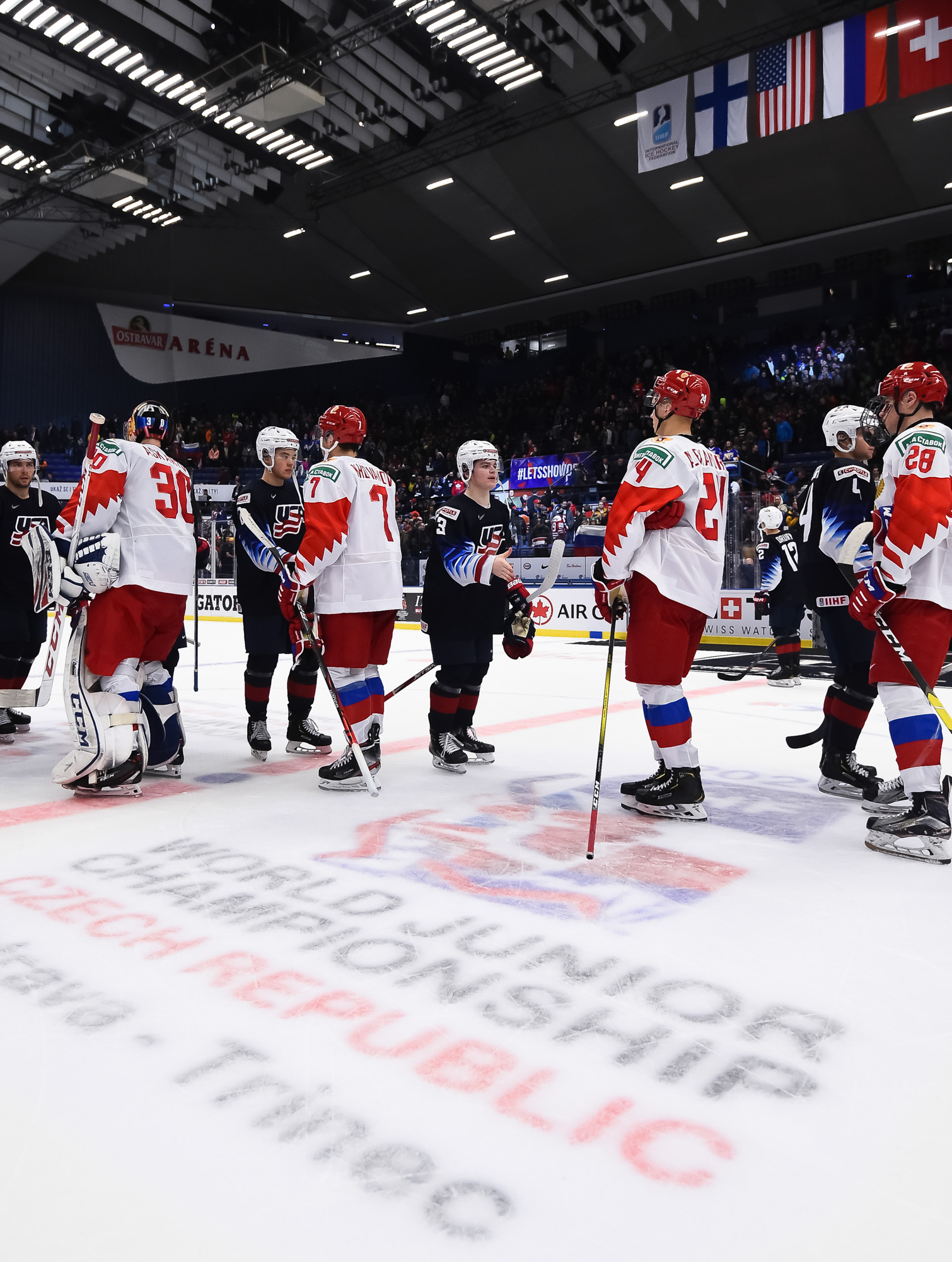 But while fans were either celebrating or booing, as appropriate for the teams they were cheering, the Americans created a two-on-one off the faceoff. Oliver Wahlstrom made a pass over to Robertson, and it bounced off his stick, off a defenceman, and over Miftakhov’s stick. The two goals came just six seconds apart, tying the U20 record for fastest two goals by a team.
