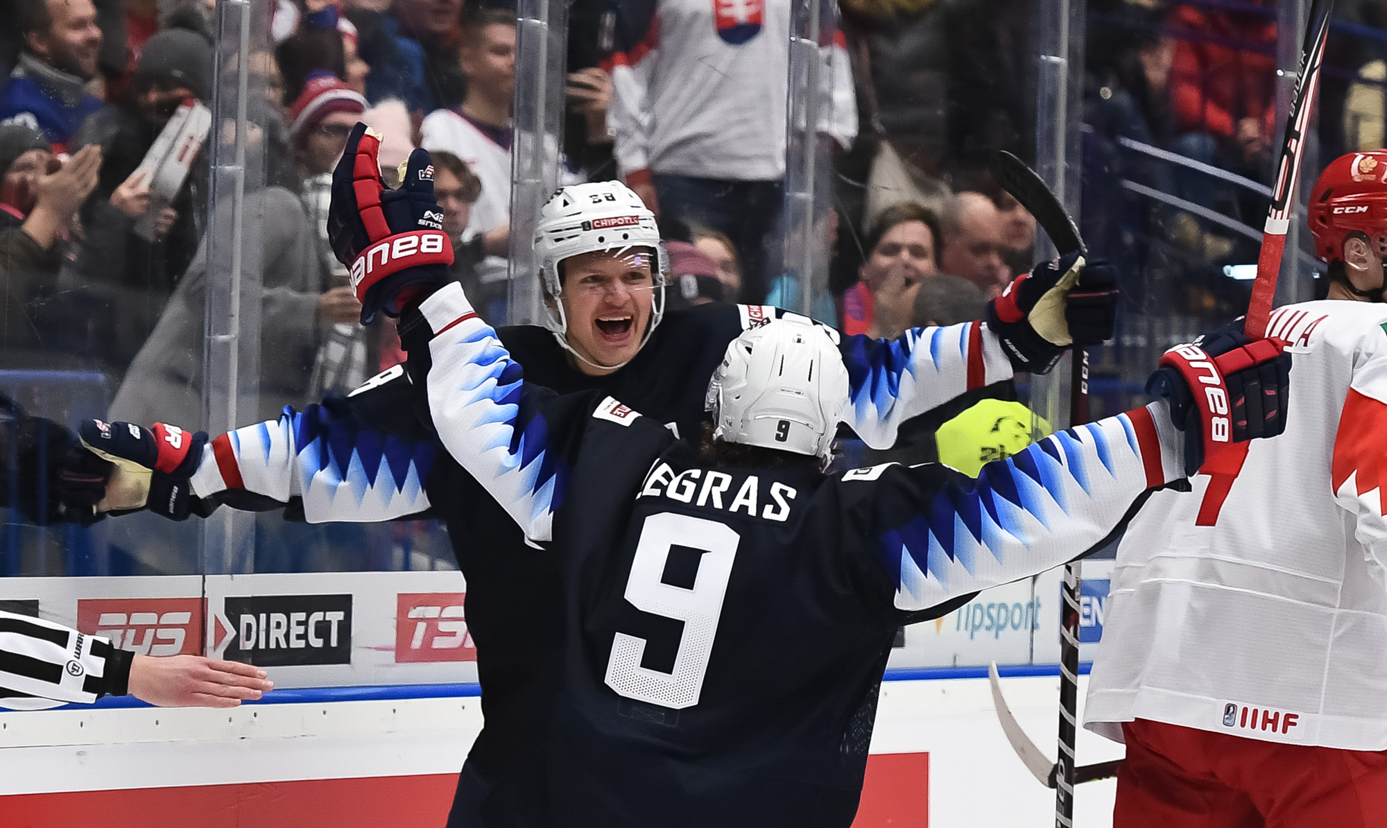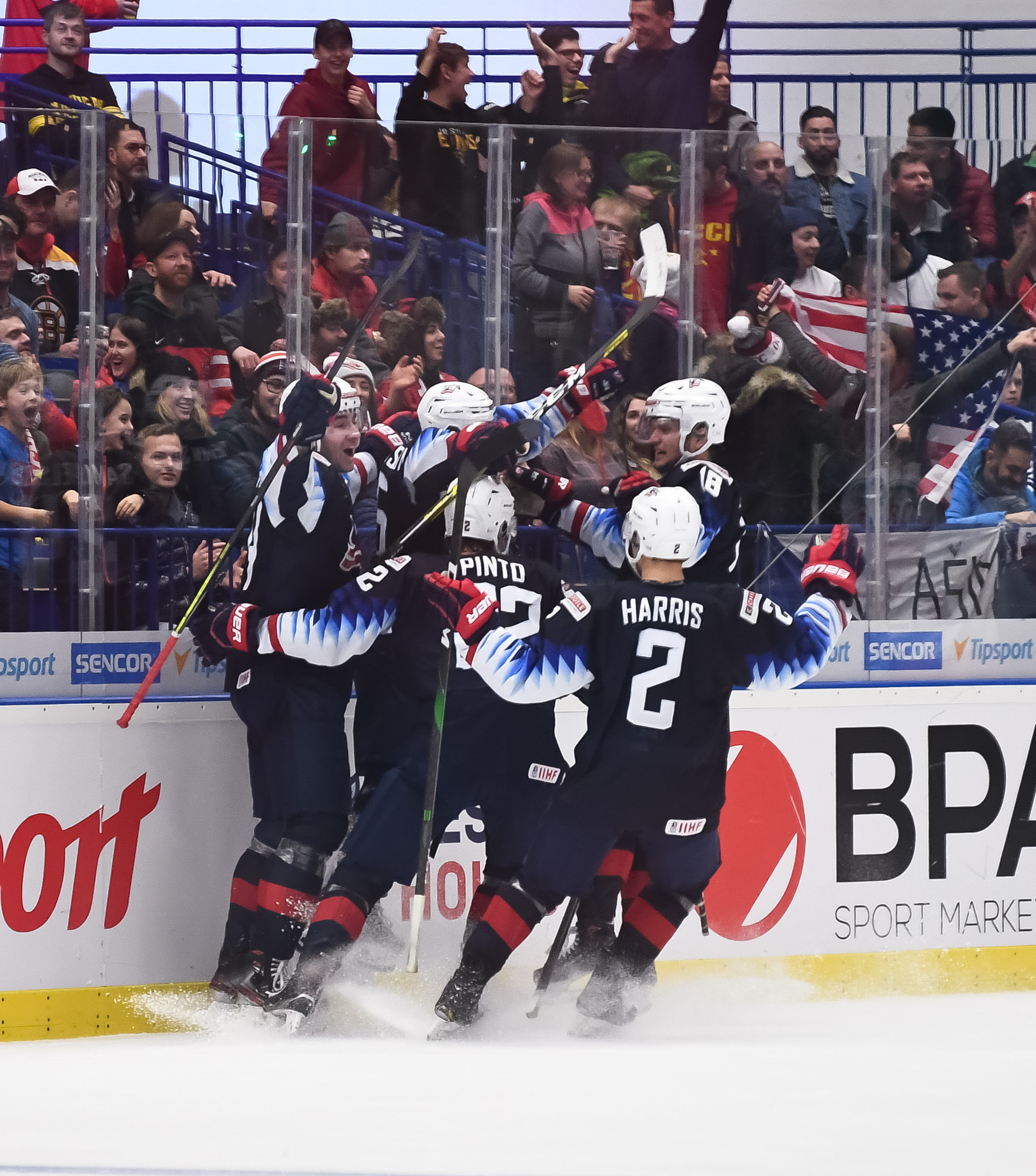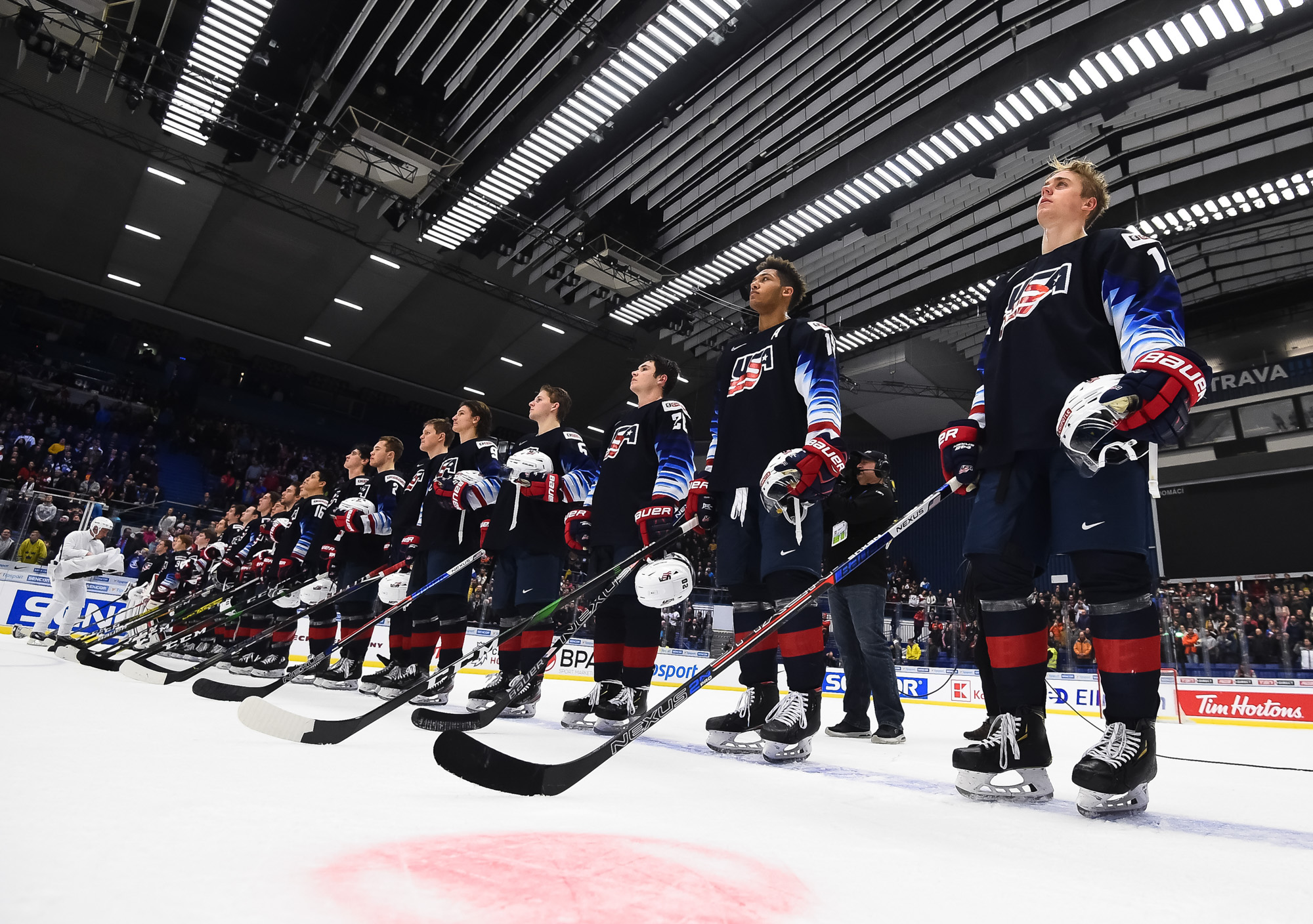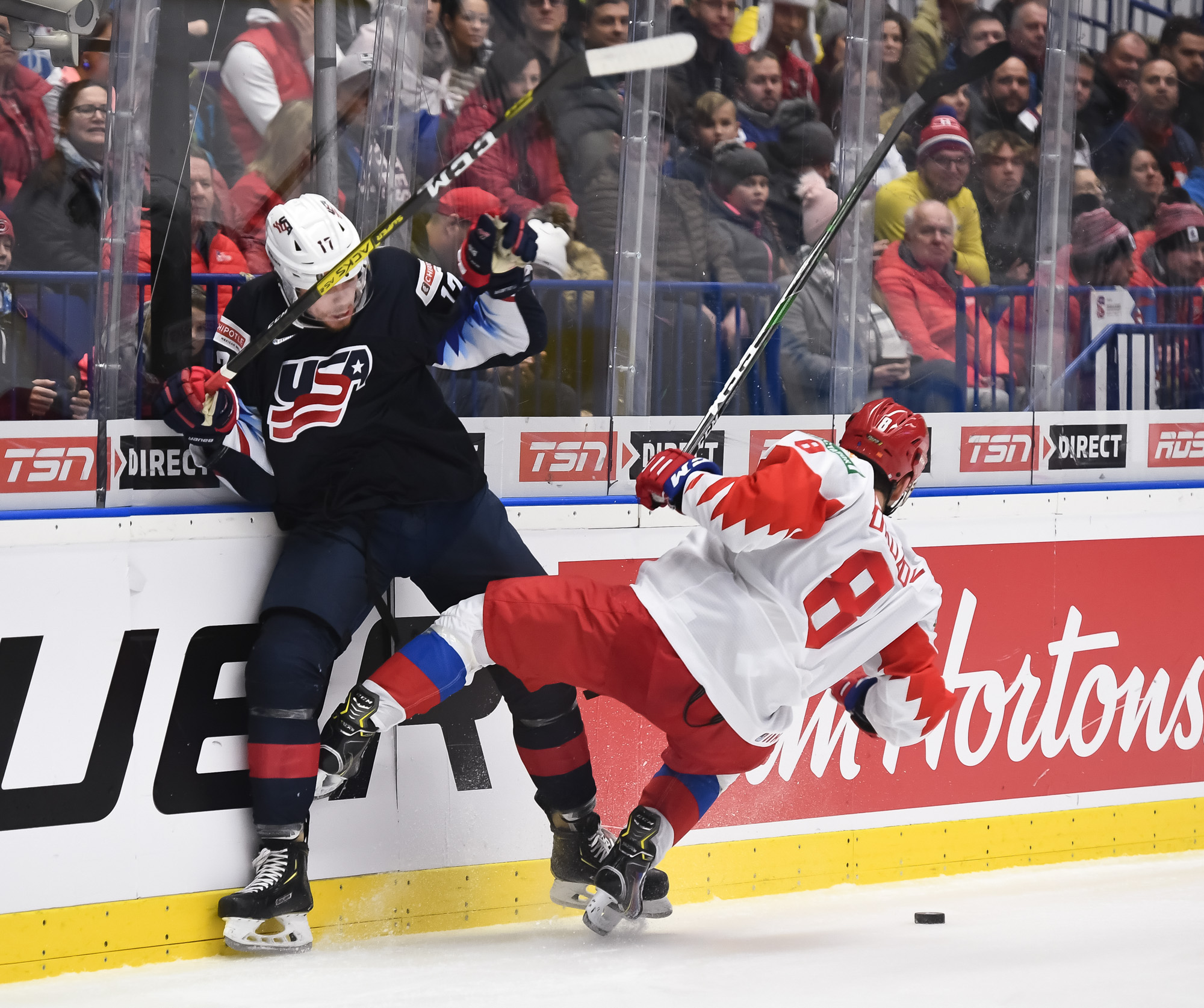 But while fans were either celebrating or booing, as appropriate for the teams they were cheering, the Americans created a two-on-one off the faceoff. Oliver Wahlstrom made a pass over to Robertson, and it bounced off his stick, off a defenceman, and over Miftakhov’s stick. The two goals came just six seconds apart, tying the U20 record for fastest two goals by a team.