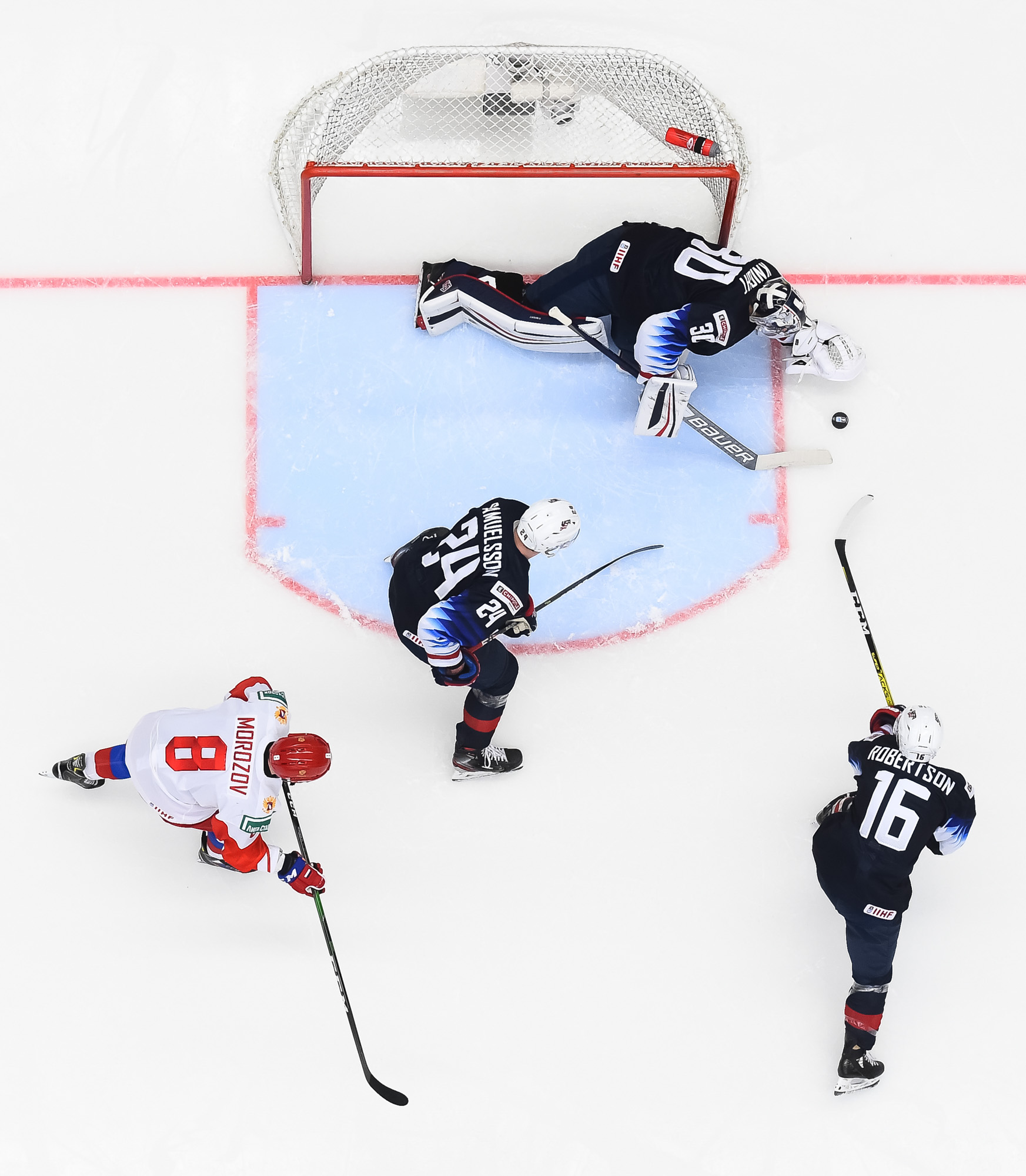 But what a difference 24 hours makes! One night, everything goes in; the next night? Not so much. Russia's puck luck in a 6-0 win over Canada was nowhere to be found tonight, and U.S. goalie Spencer Knight stole the show with solid, rebound-free goaltending.