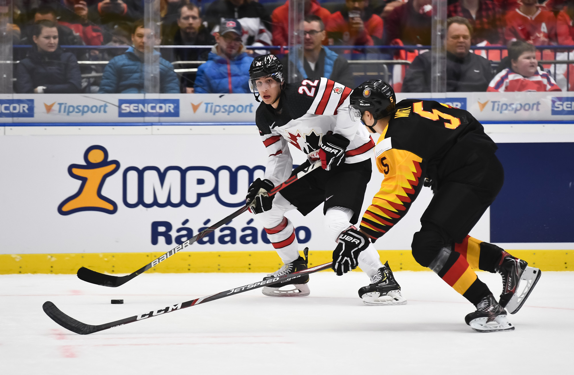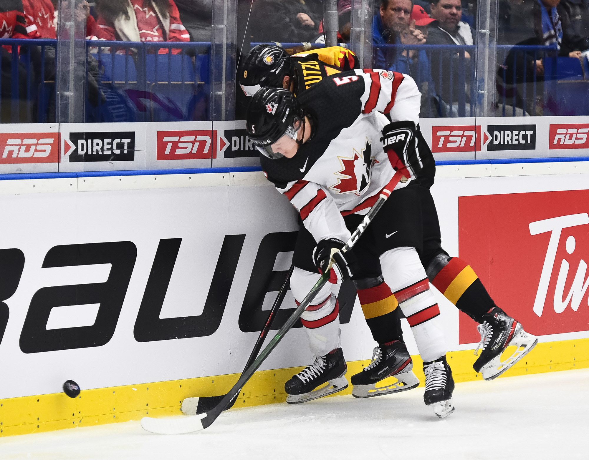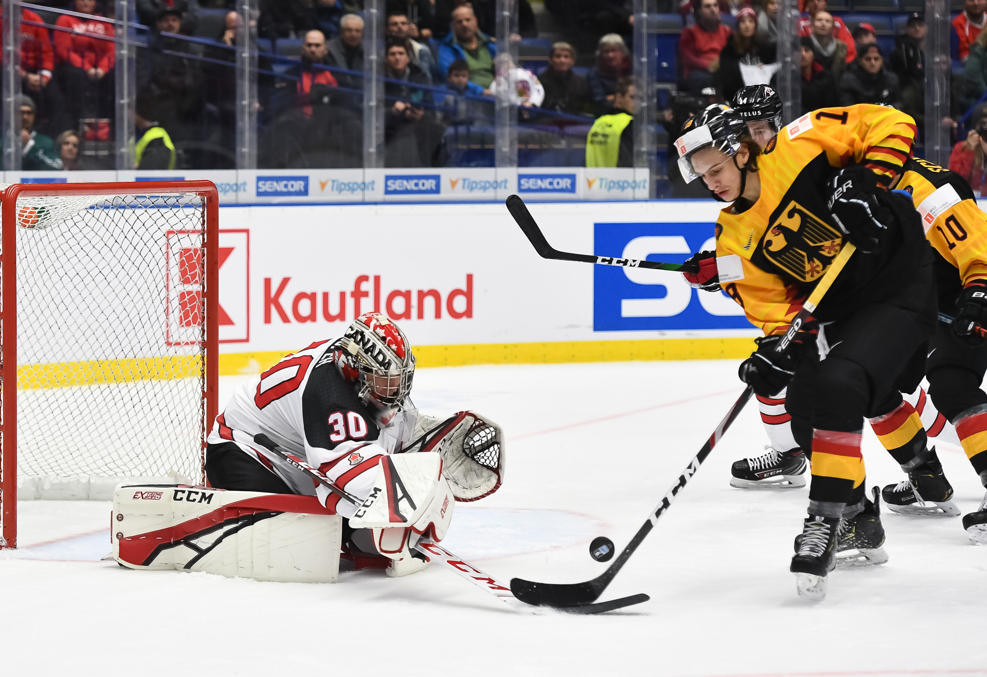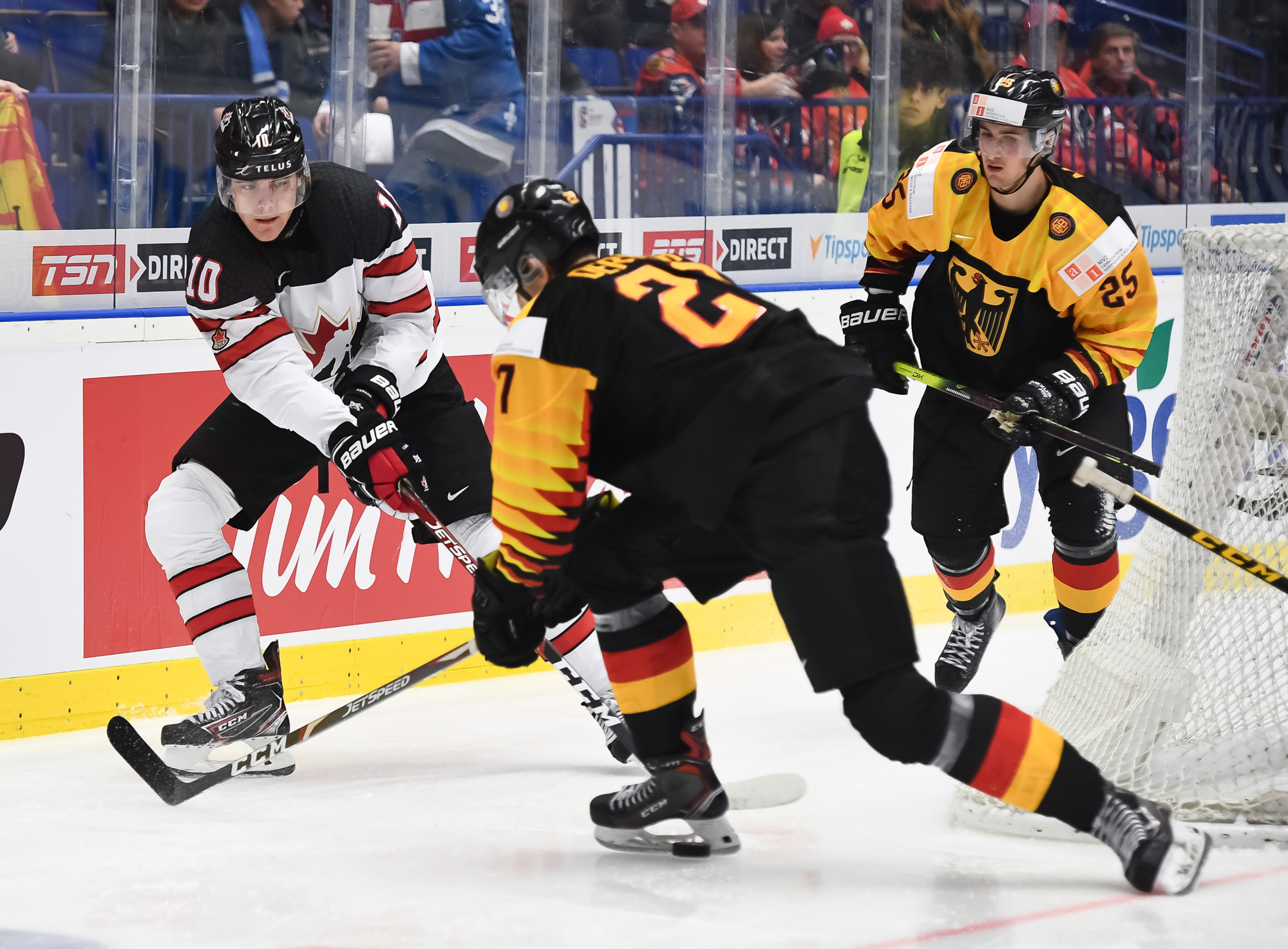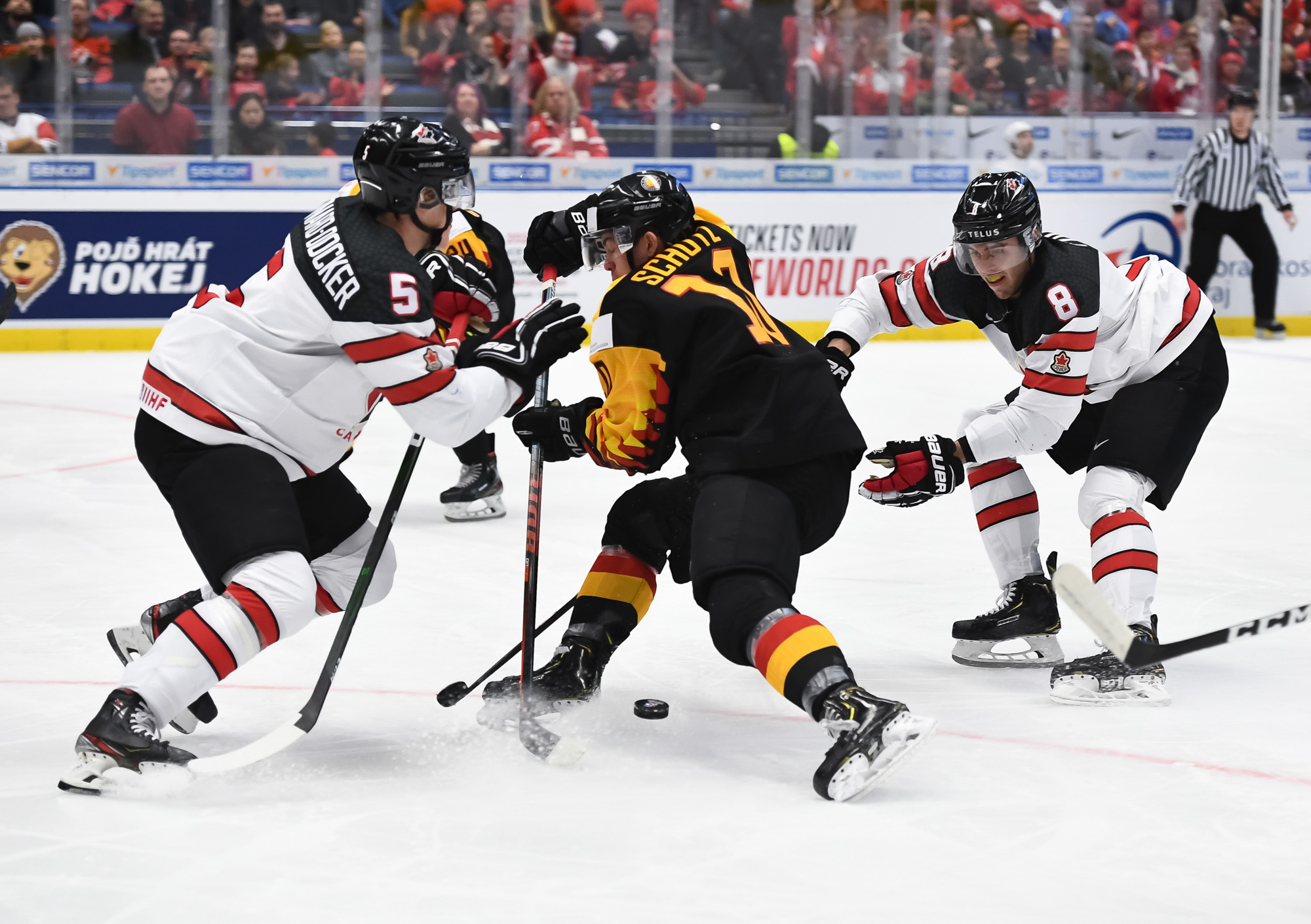 Germany's Justin Schutz #10 attempts to slip the puck past Canada's Jacob Bernard-Docker #5 while Liam Foudy #8 defends.