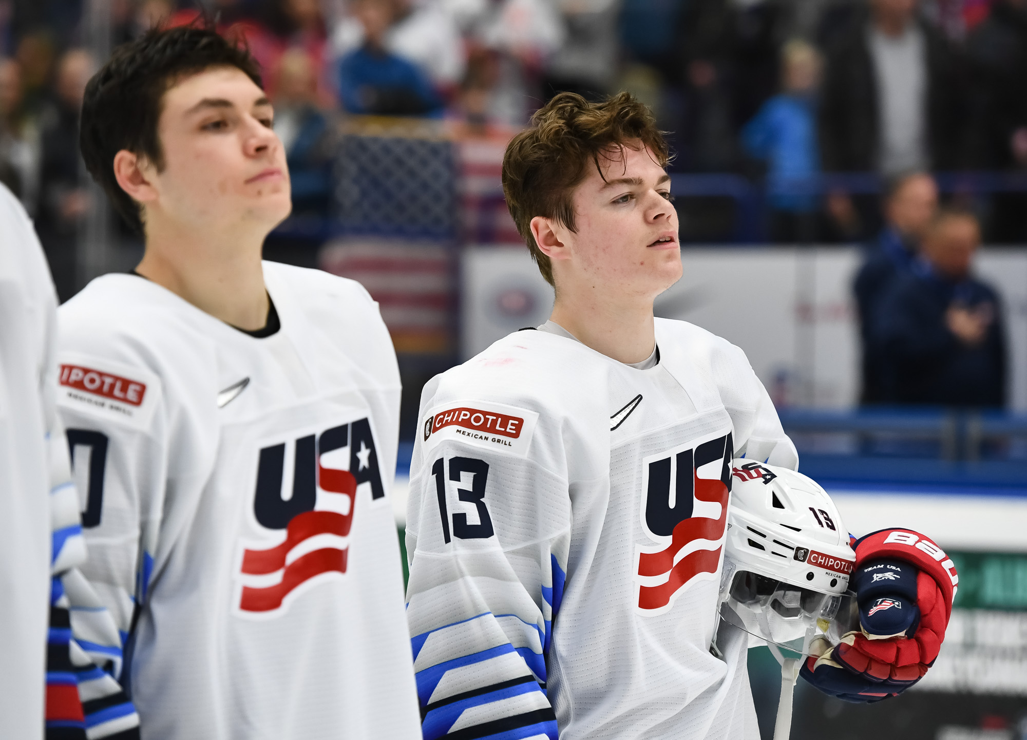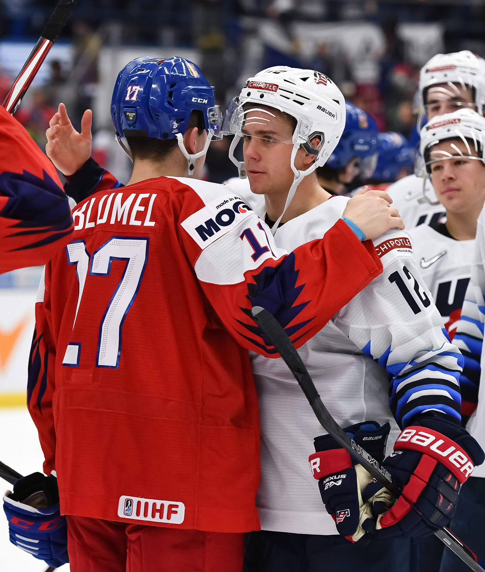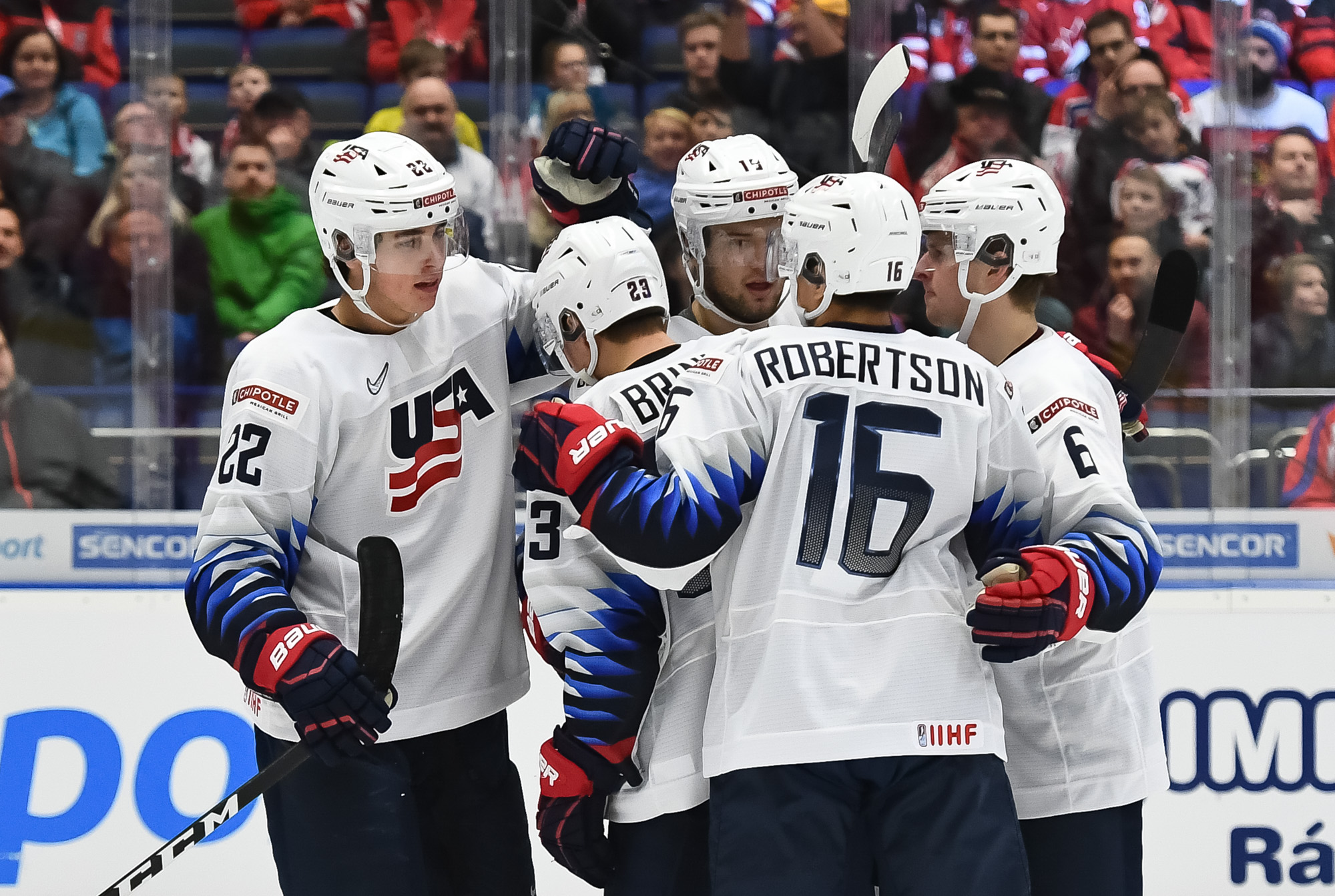 The Americans got on the board early to silence the crowd, scoring a nice goal on the power play. Nick Robertson feathered a pass from behind the net to Shane Pinto at the top of the crease, and he wasted no time in scoring his fourth goal of the tournament at 3:45.