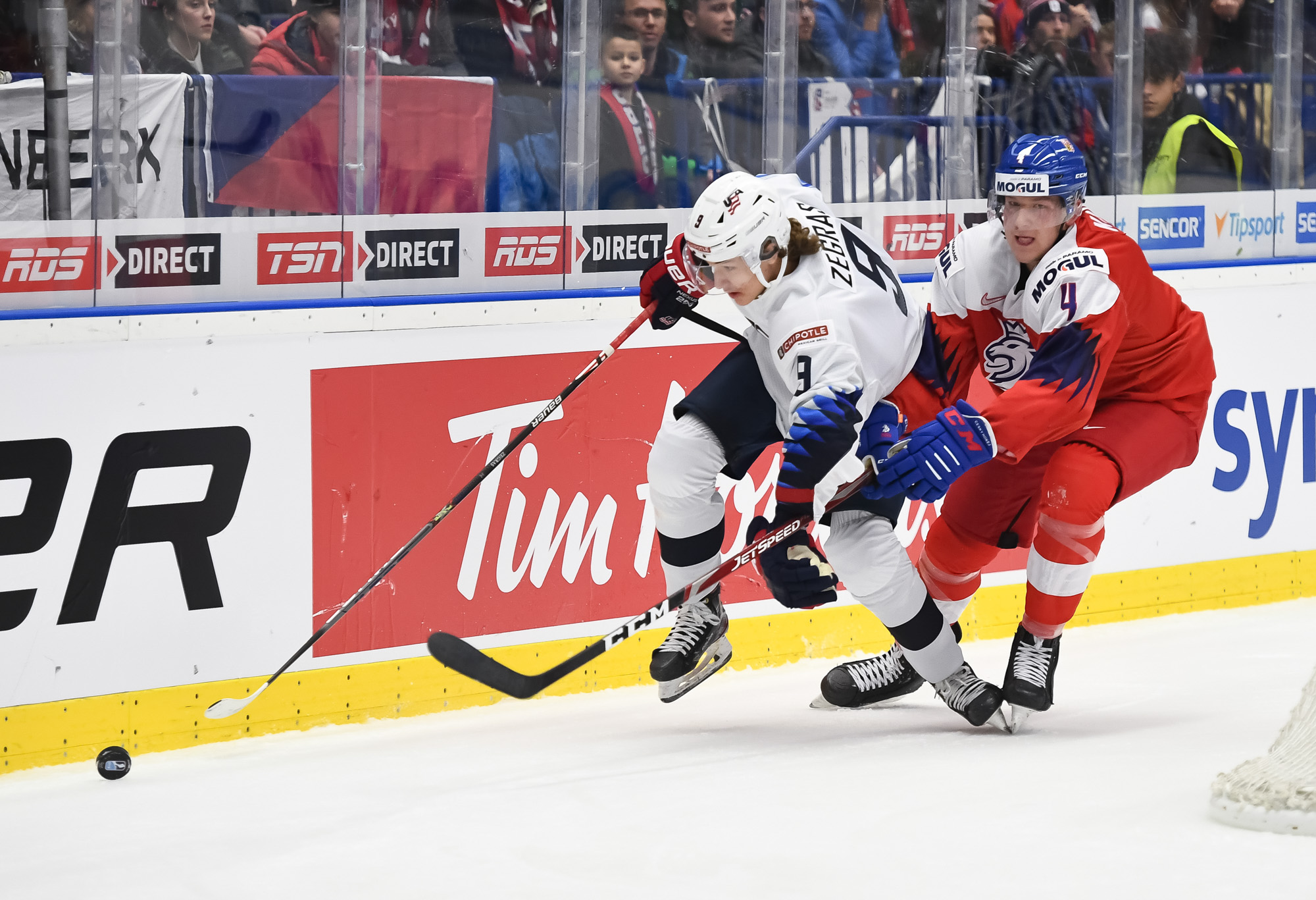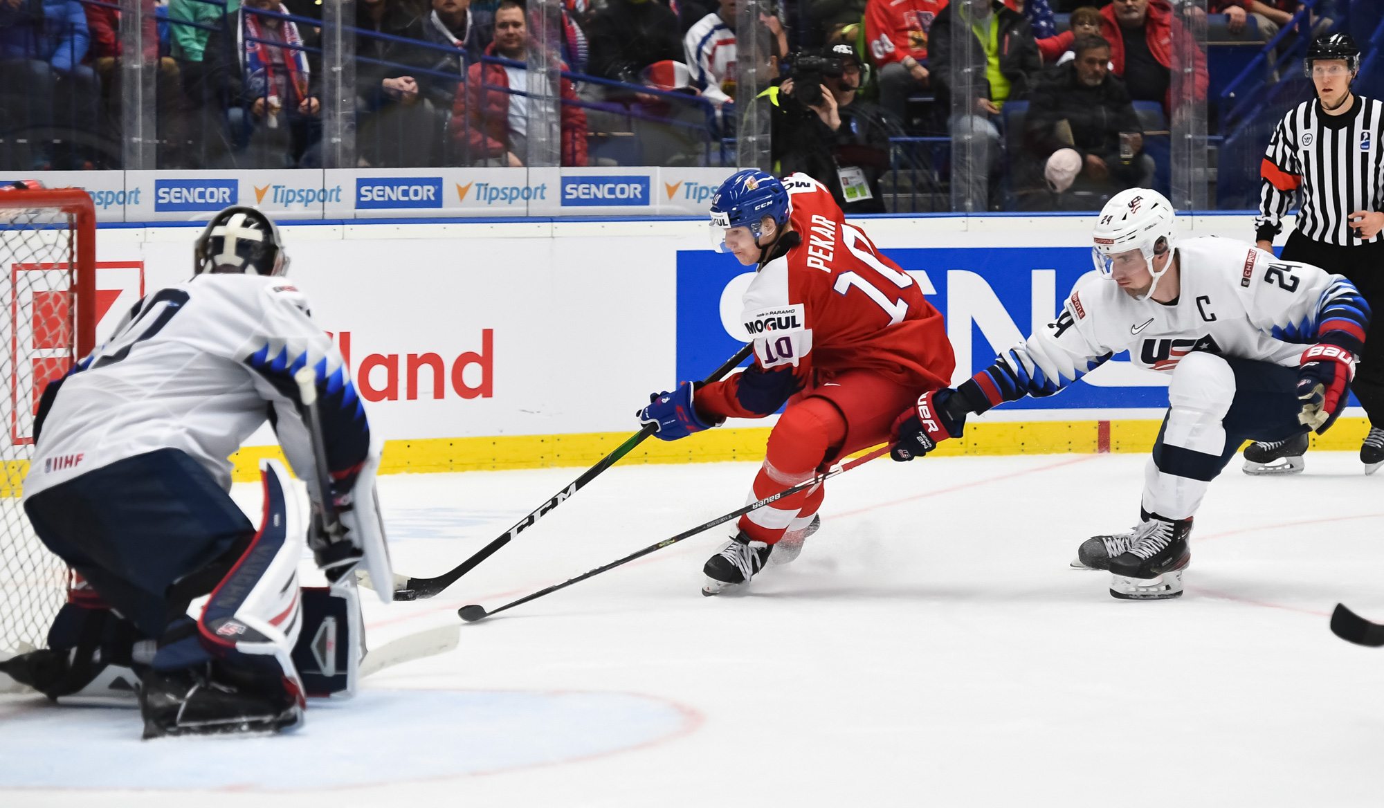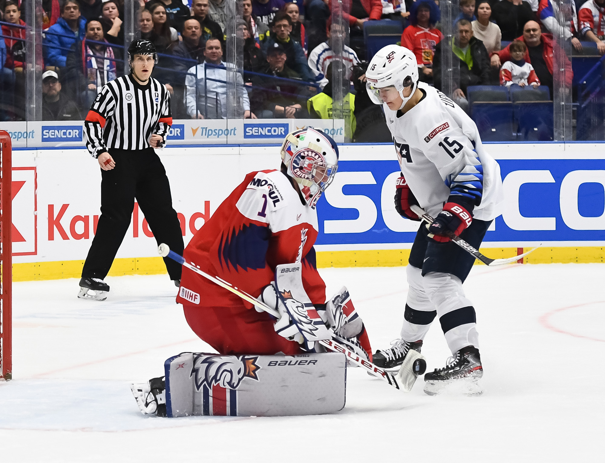 Team USA's Trevor Zegras with a scoring chance on Czech goaltender Lukas Parik.