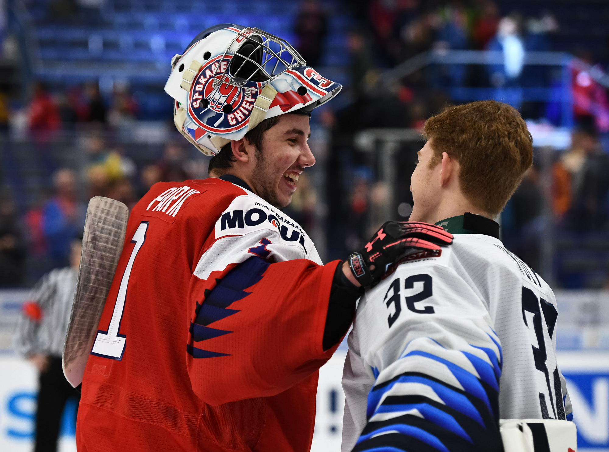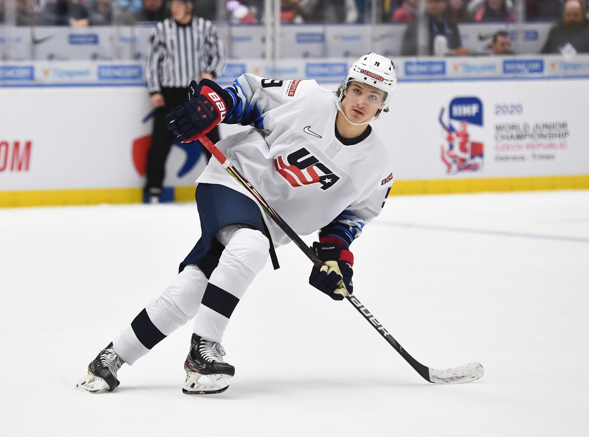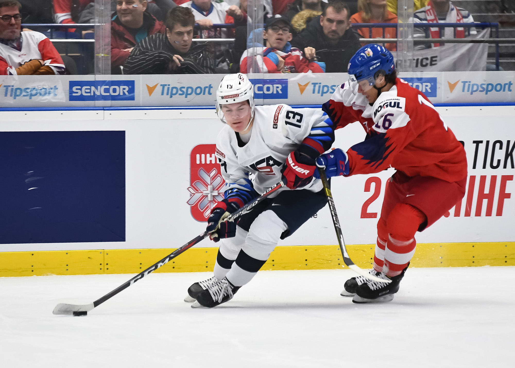 Team USA's Trevor Zegras with a scoring chance on Czech goaltender Lukas Parik.