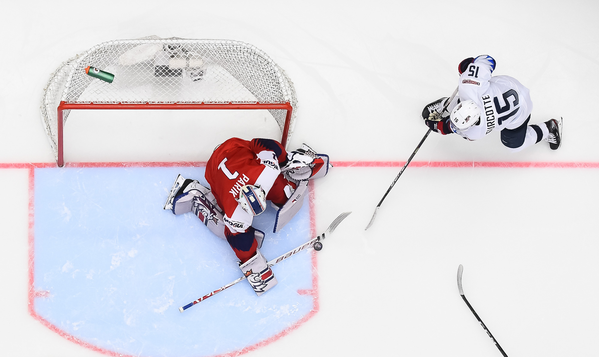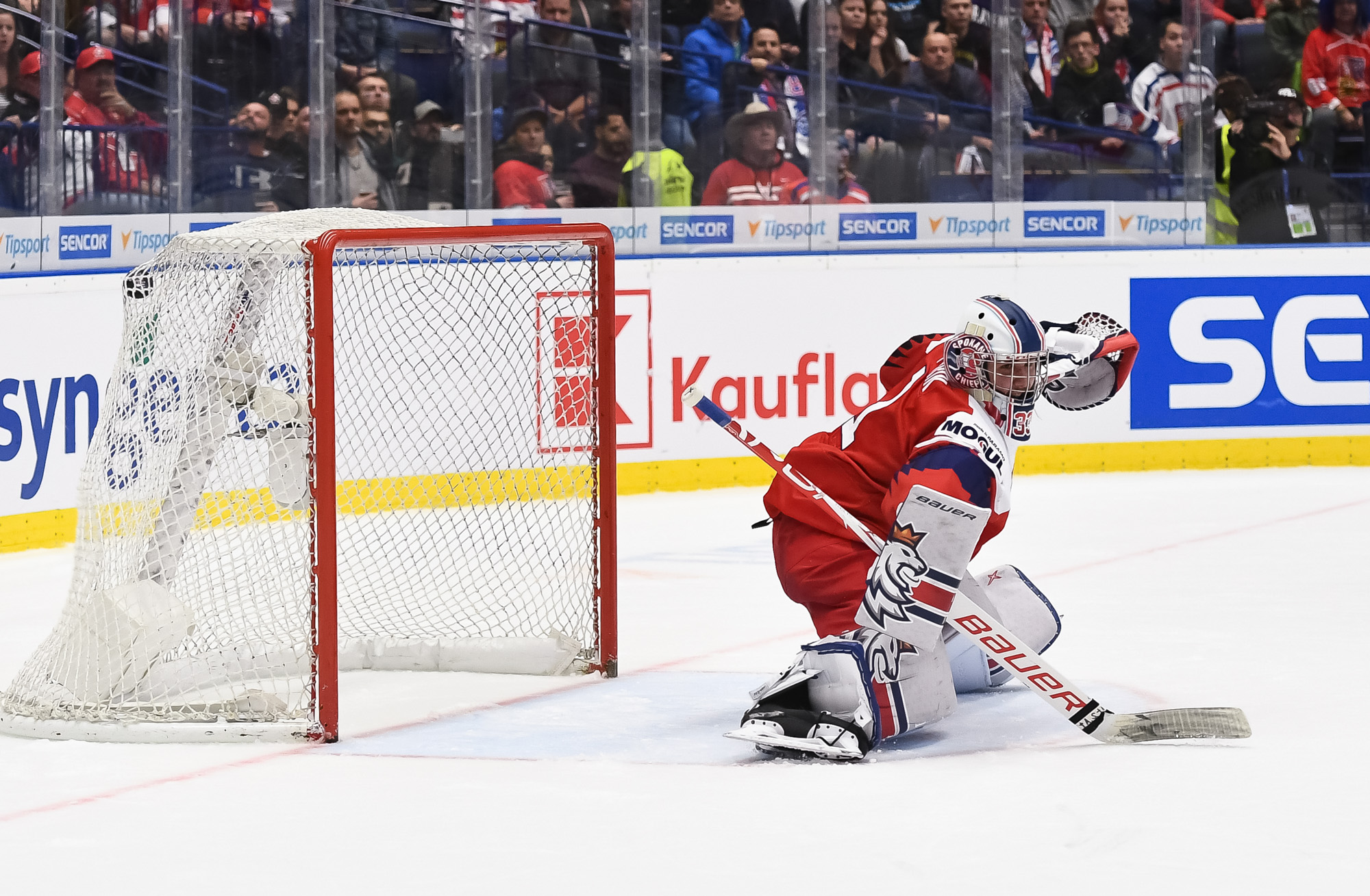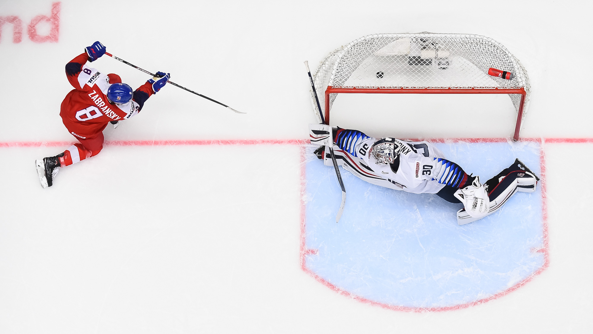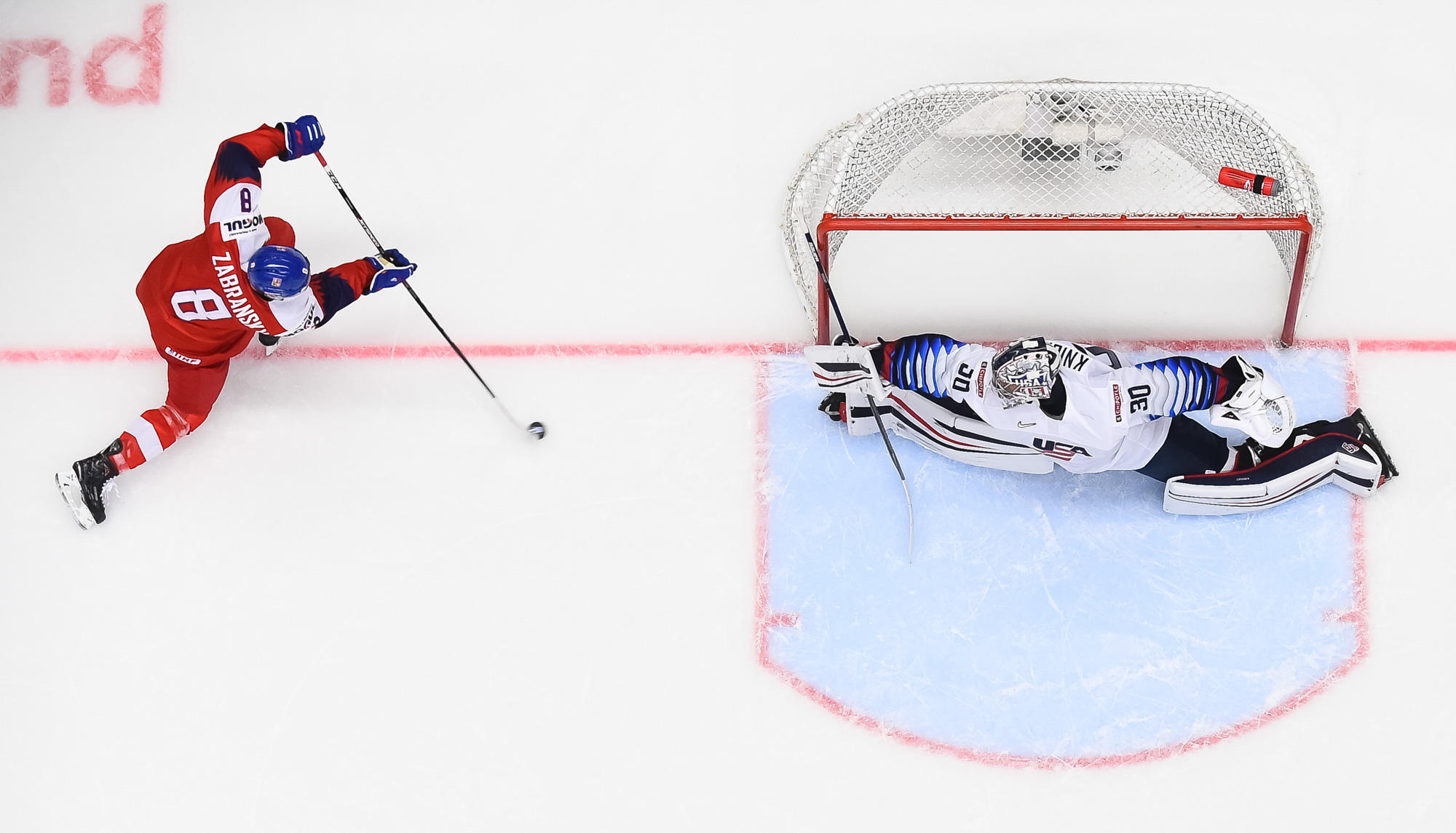 Then, near the end of the period, the Czechs took their first lead thanks to a five-on-three advantage. Karel Plasek found Zabransky to the back side of Knight’s goal, and he redirected it off the goalie’s skate and in at 18:16, sending the pro-Czech crowd into a frenzy.