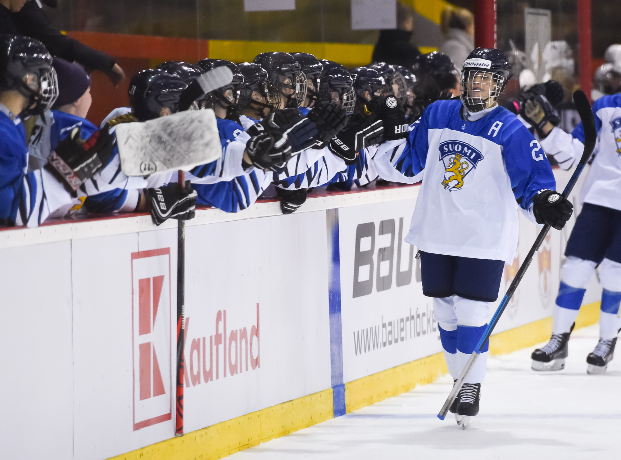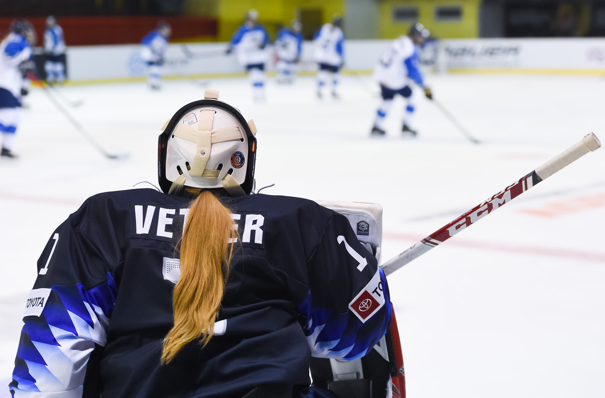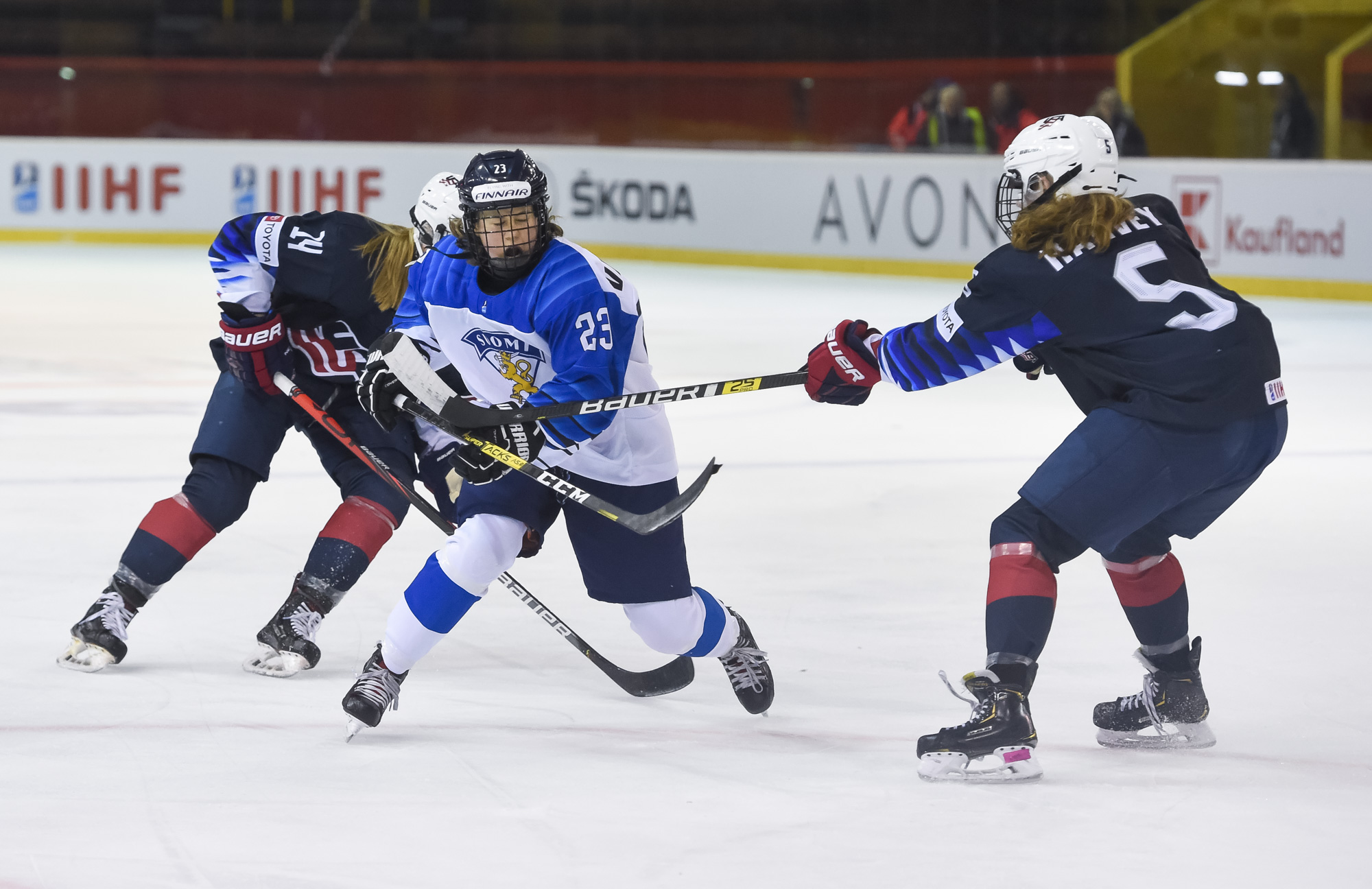 As is often the case in games between North American teams and their European counterparts at this level, a strong goaltender was crucial for the Finns in the first period. Team USA dominated the play, boasting a 15-3 advantage on the shot count. However, Aino Laitinen came up with most of the answers. The 17-year-old made her World Championship debut at last year’s tournament and was entrusted with the start here; she produced a solid show in the first period, beaten just once when the American power play broke the deadlock midway through the opening session.