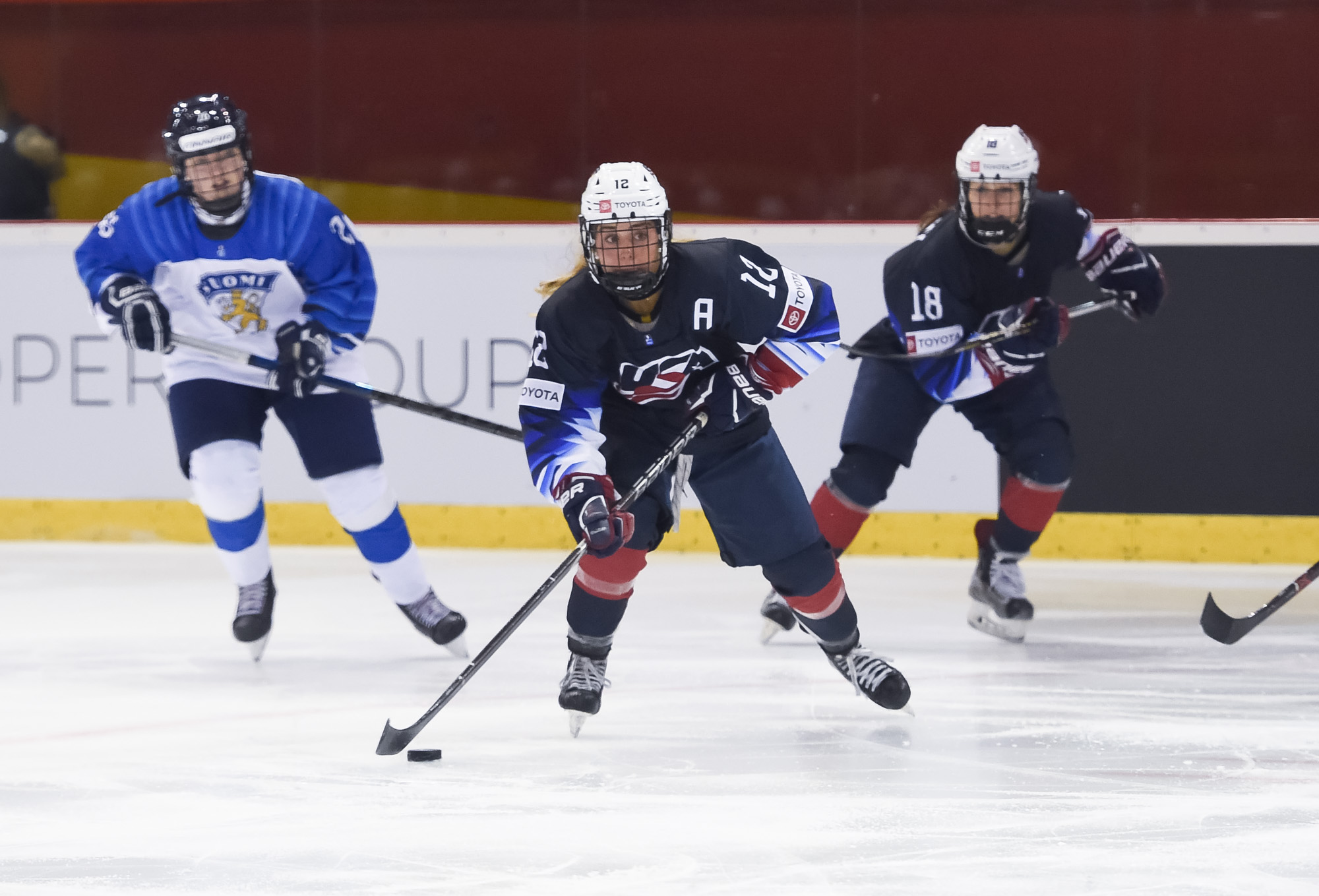 Team USA's Makenna Webster skates up ice with the puck against Finland's Sanni Rantala.