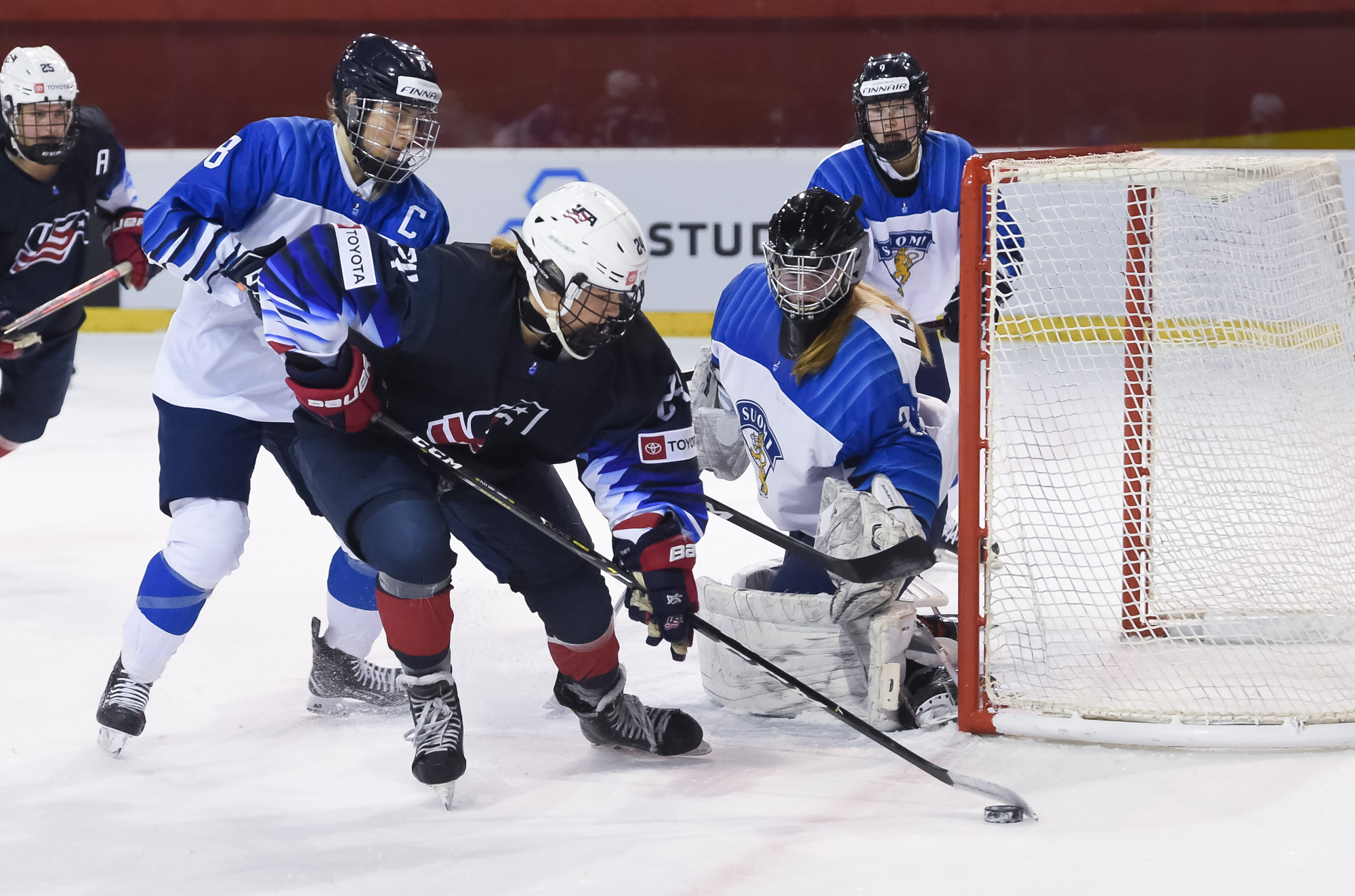 The Finns continued to make things difficult for team USA. Although Maura Crowell’s team had by far the better of the play, the Finnish defence kept things tight and Laitinen was equal to what came her way. It wasn’t until midway through the second period that the Americans regained the lead. Eden Lacey won possession in the corner behind her own net and set off up the ice. She picked out Clara Van Wieren in centre ice and the Michigan native scored on Laitinen at the second attempt.