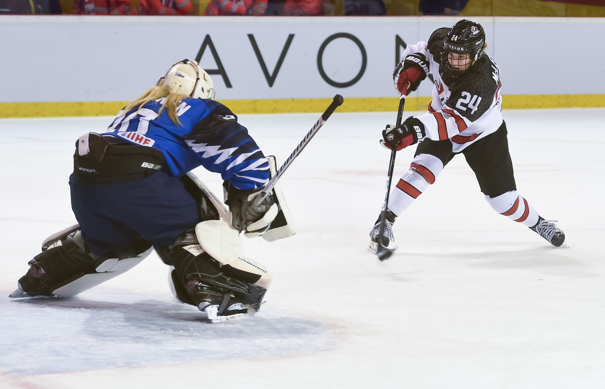 Canada's Alyssa McLeod shoots by Finnish goaltender Aino Laitinen.