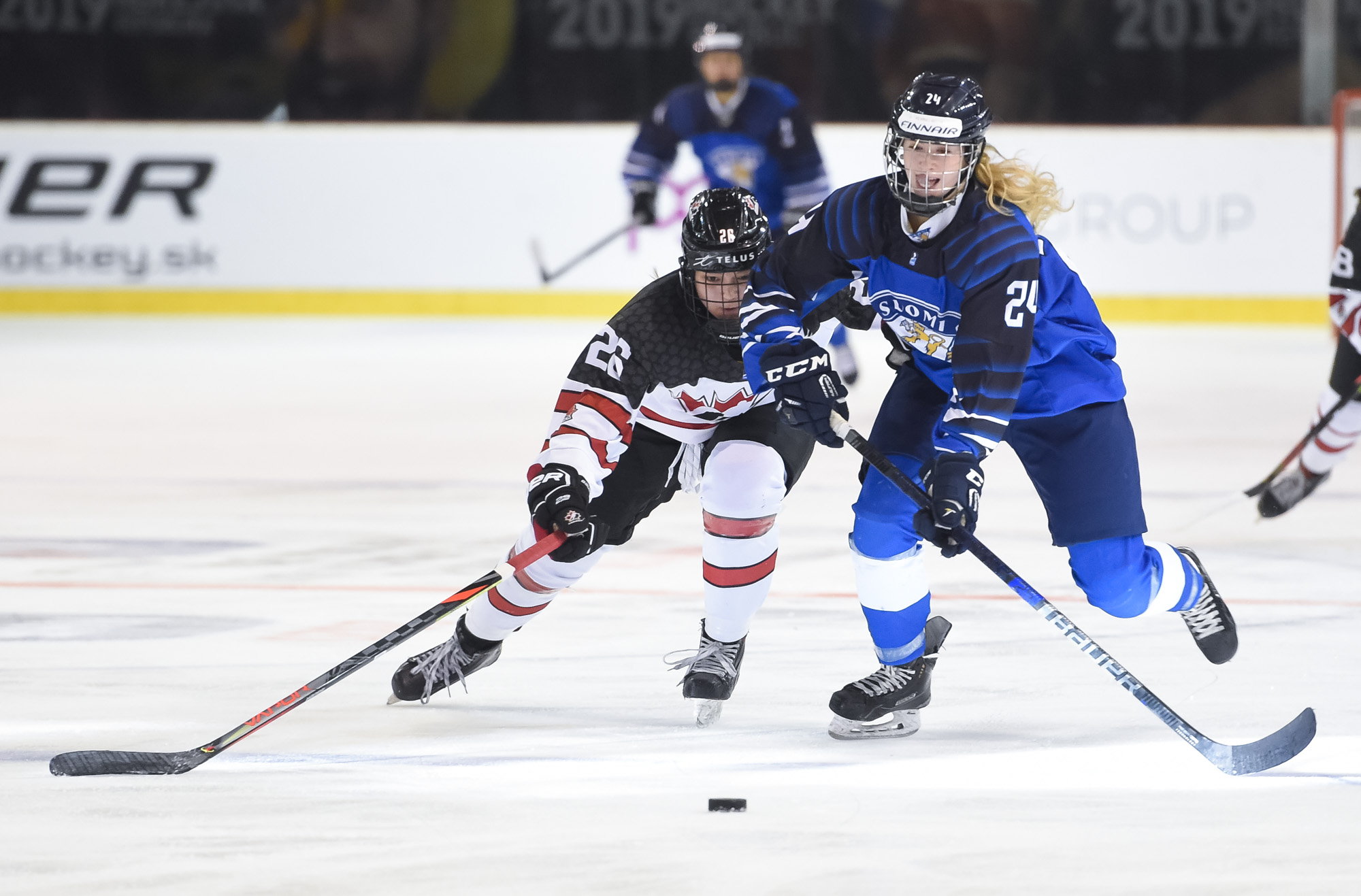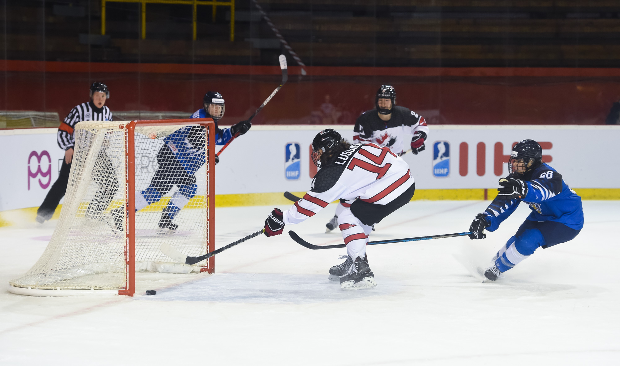 Finland pulled its goalie with over six minutes to play to try to get back in the game but Canada's Emilie Lussier scored her team's fourth and final goal into the empty net on a great cross-ice pass from Sarah Wozniewicz.