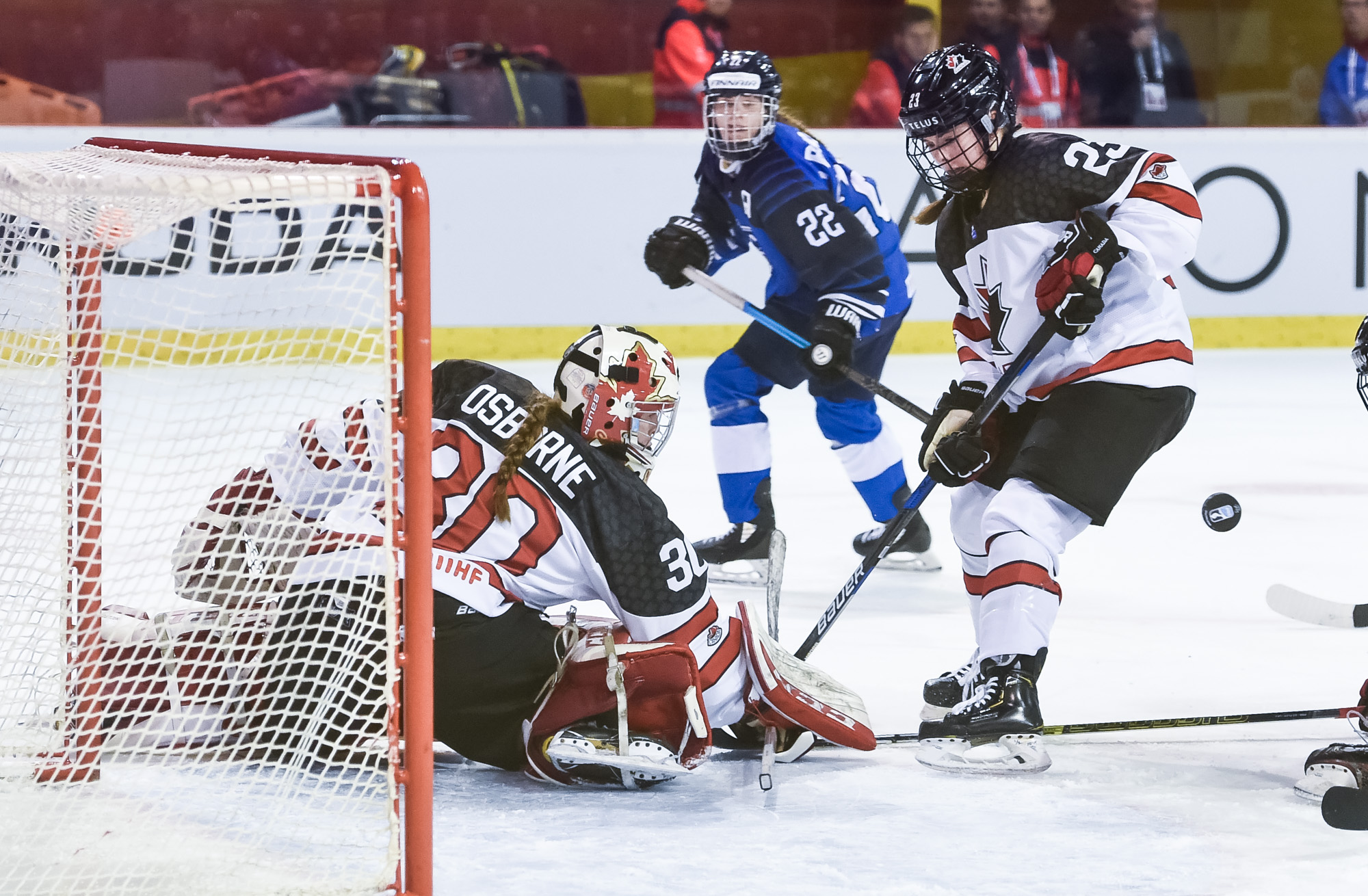 Laitinen, Finland's captain, was robbed by Osborne with just over seven minutes to play in the first when she streaked down the middle of the ice and ripped a wrist shot that seemed destined for the top corner, only to see Osborne snag the puck out of the air with her glove.