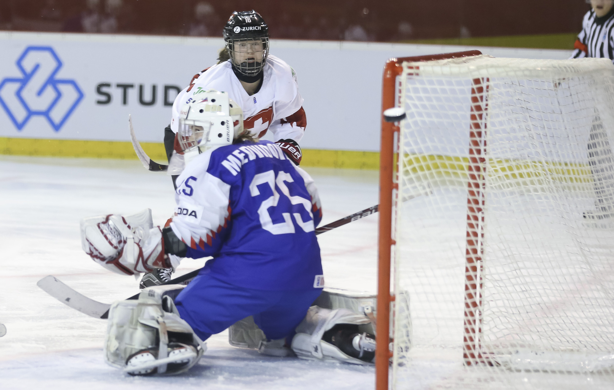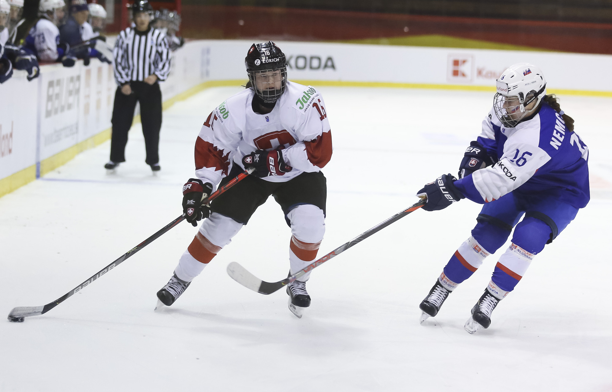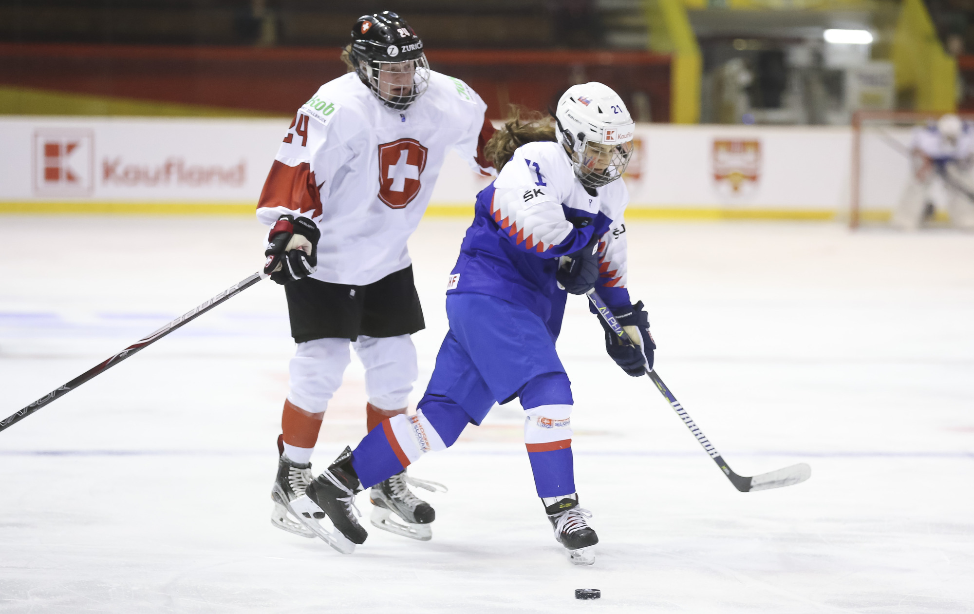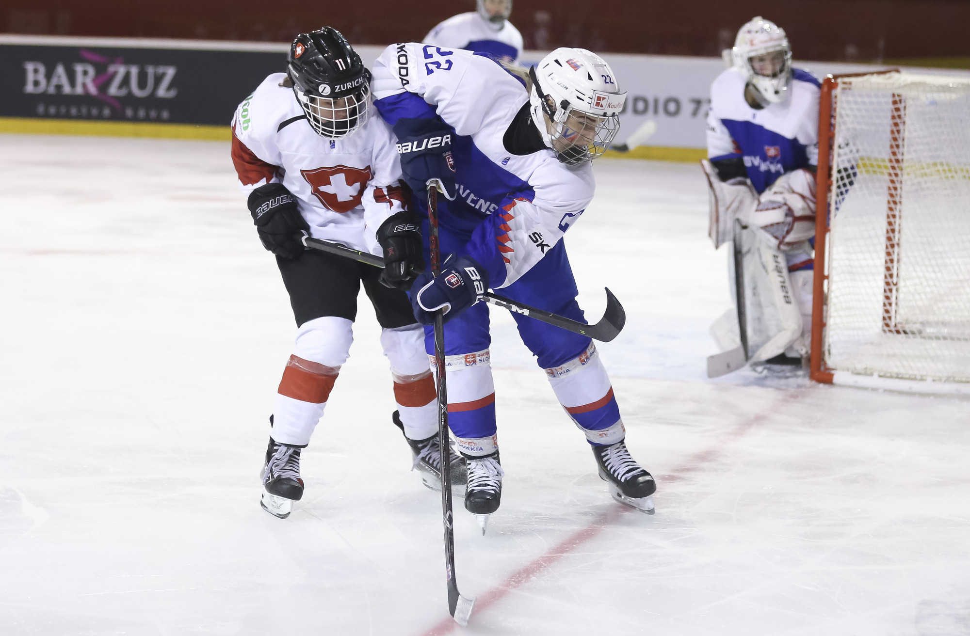 With less than five minutes to play in the second period, Switzerland's Laura Zimmermann grabbed a loose puck in her zone, chipped it by a Slovak defender and headed in on a breakaway. She took a good, hard shot at the far side but Slovak goaltender Laura Medvidova stuck her blocker out and made the save.