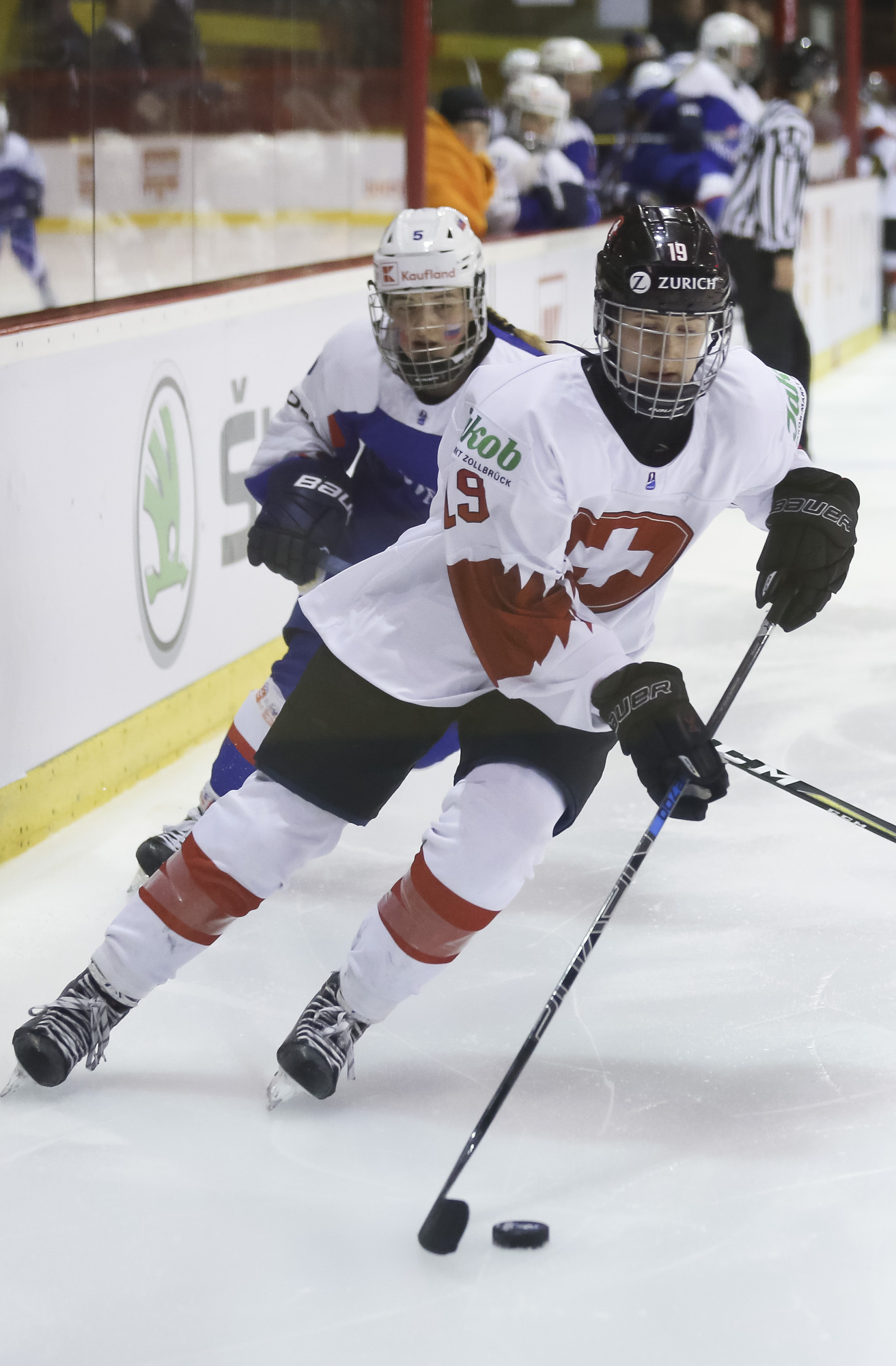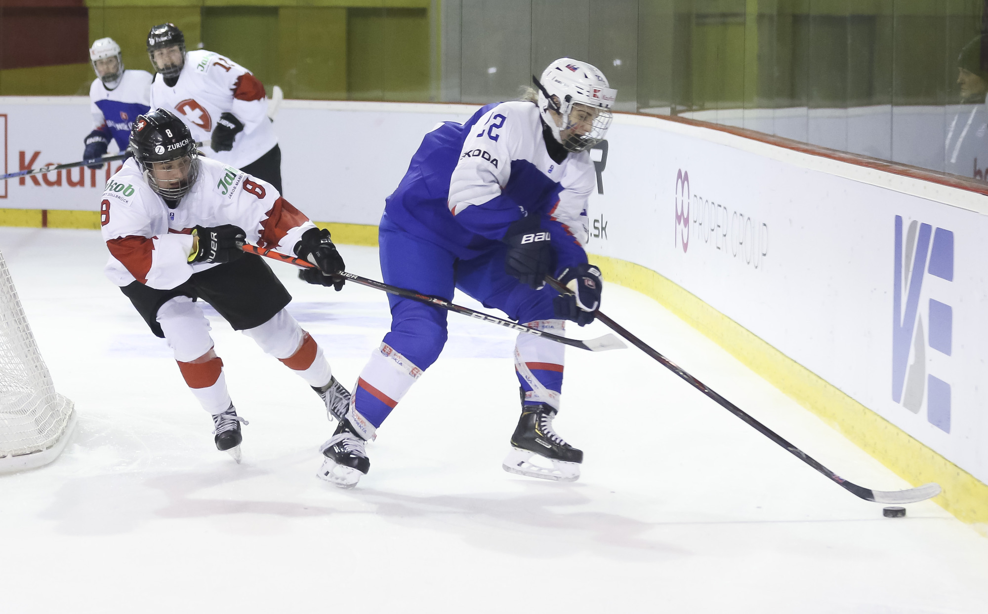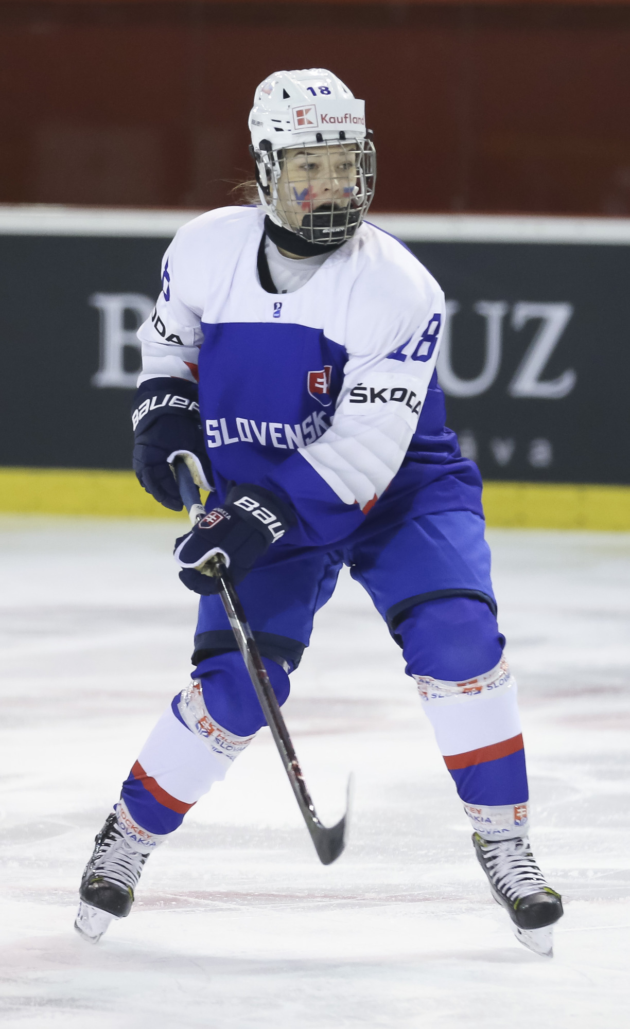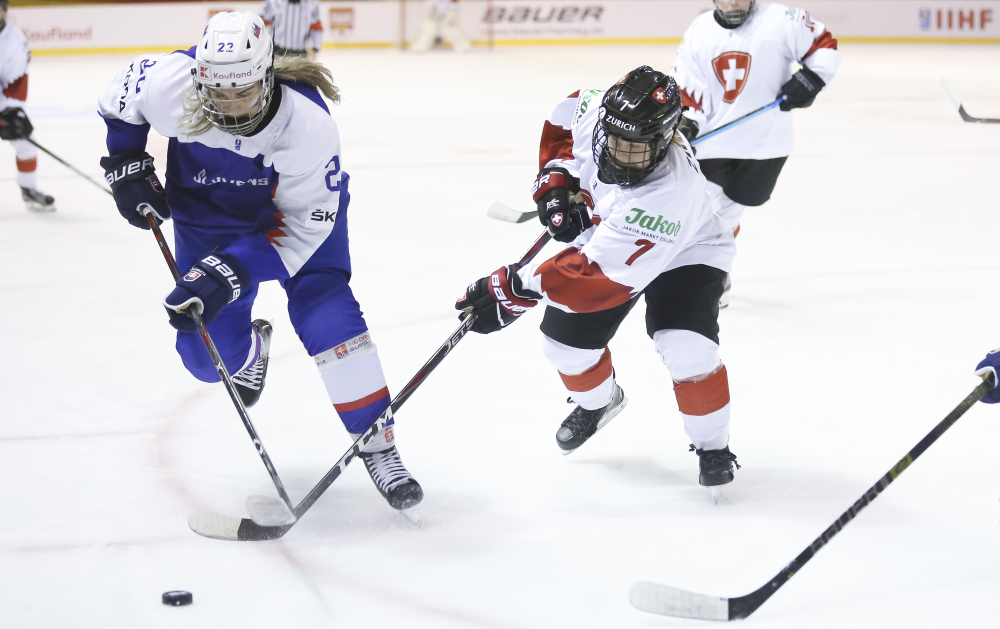With less than five minutes to play in the second period, Switzerland's Laura Zimmermann grabbed a loose puck in her zone, chipped it by a Slovak defender and headed in on a breakaway. She took a good, hard shot at the far side but Slovak goaltender Laura Medvidova stuck her blocker out and made the save.