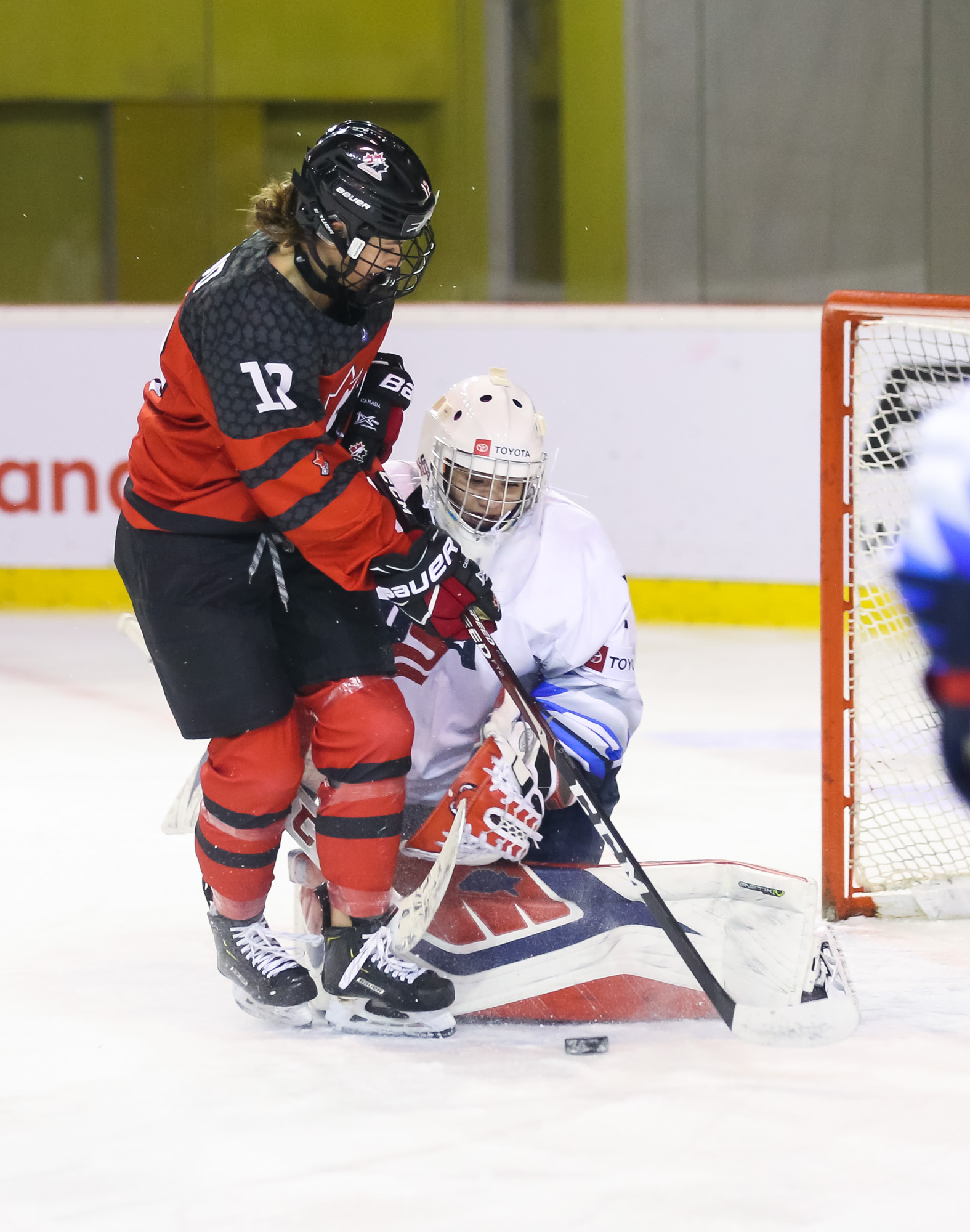 The second period started off in the same manner, with the U.S. immediately setting up shop in Canada’s zone on the power play. The constant pressure even led to the next Canadian penalty when Maddi Wheeler cross-checked her opponent into the boards, a sound heard clearly throughout the arena. The 5-on-3 only lasted shortly and Canada then killed off the rest of the penalty, which however was spent almost entirely in Canada’s zone, with constant U.S. rotation keeping the defence busy.