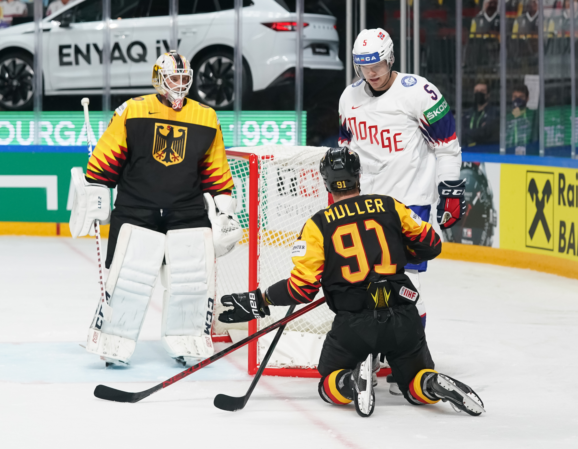 But it was too little, too late for the Norwegians. Lean Bergmann restored Germany’s four-goal lead early in the third when his left-hand wrister from the right wing beat Haukeland – stop me if you’ve heard this one before – high to the glove side.