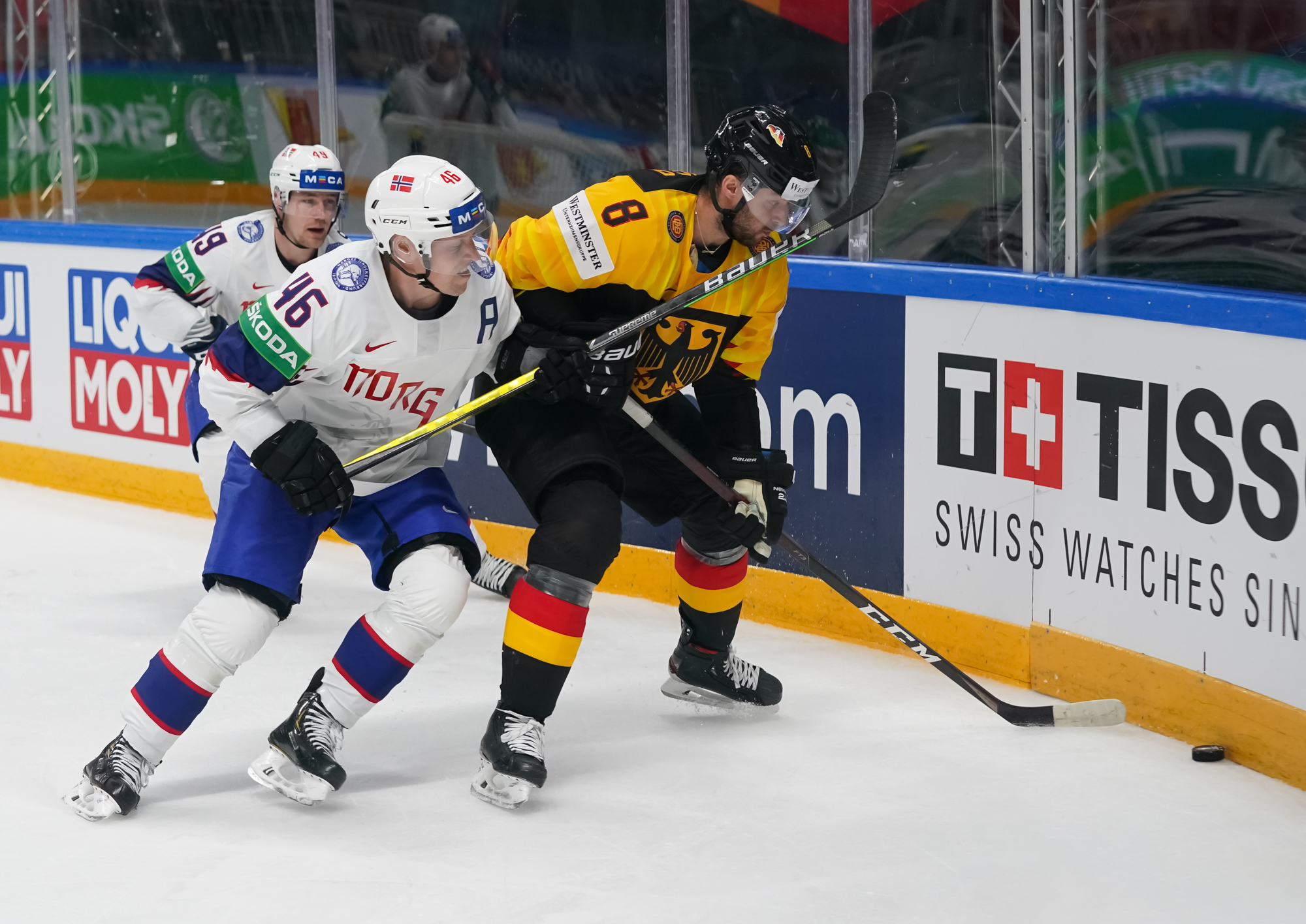 Throughout the first period, Norway ground down the Germans and turned the game into a defensive stalemate. The Germans quickly learned that if they were going to win this game, they’d have to roll up their sleeves and do the spadework. It paid off with 15.3 seconds left in the opening frame when they created a ton of traffic in front of Henrik Haukeland, and then Moritz Muller floated a shot from the point that Matthias Plachta deflected out of mid-air and just inside the post on the glove side.