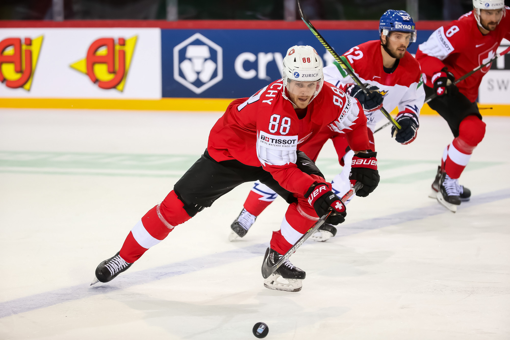The Czechs had their best chance of the second period early on a Swiss power play when Dominik Kubalik broke in alone, but Genoni stayed with him on the deke and made the save. The Swiss went ahead 2-1 at 4:14 with another power-play goal, this thanks to a sensational cross-ice pass from Nico Hischier to Meier. Meier ripped a one-timer over Hrubec’s glove.