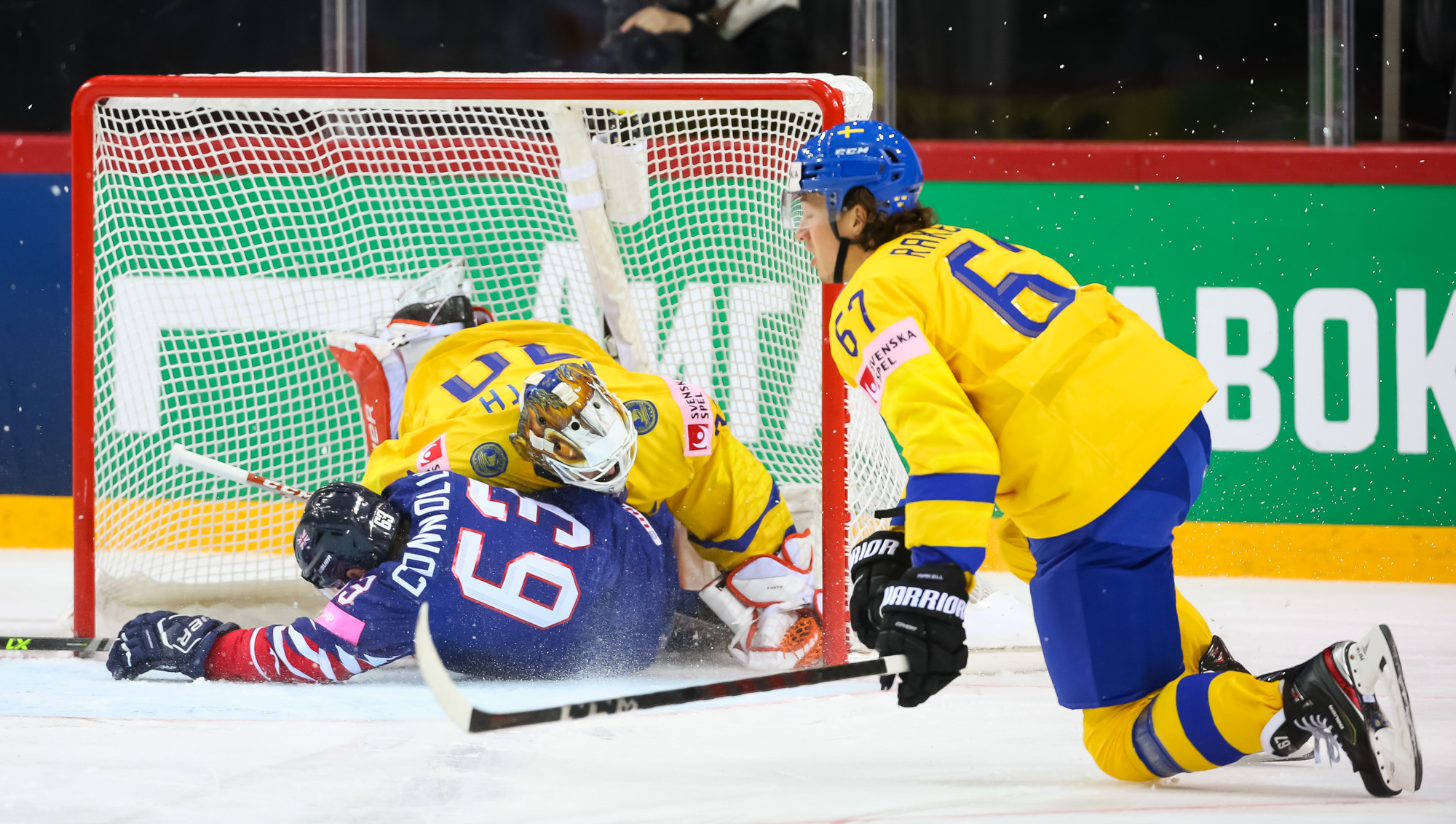 In this instance, the review showed that Connolly was knocked to the ice by his opponent and slid towards the Swedish goal. The officials decided that he could not halt his movement towards the goaltender and could not prevent the collision, therefore the collision was not caused by the attacker but was due to a foul by the Swedish defenceman and thus, the goal was good.